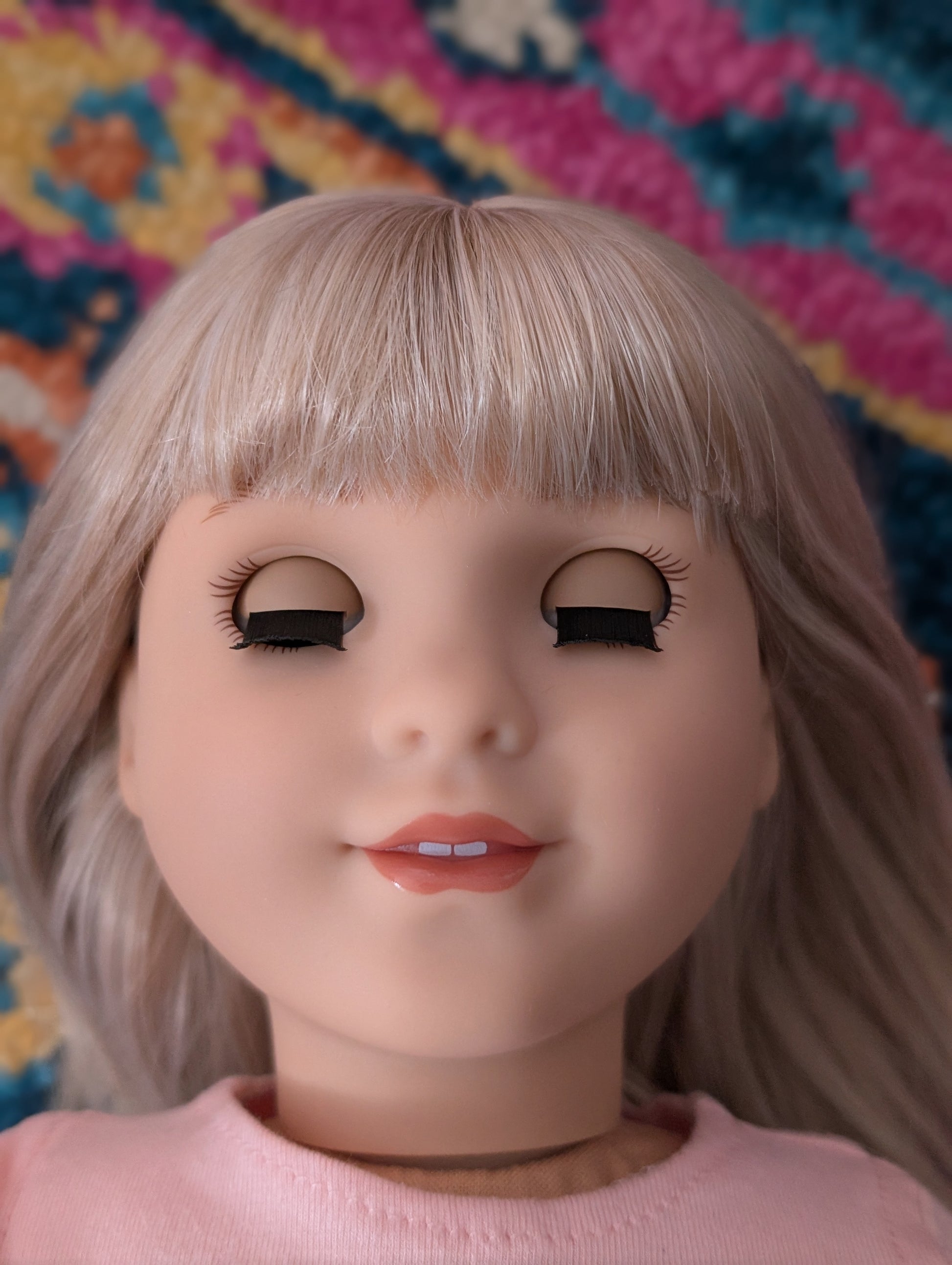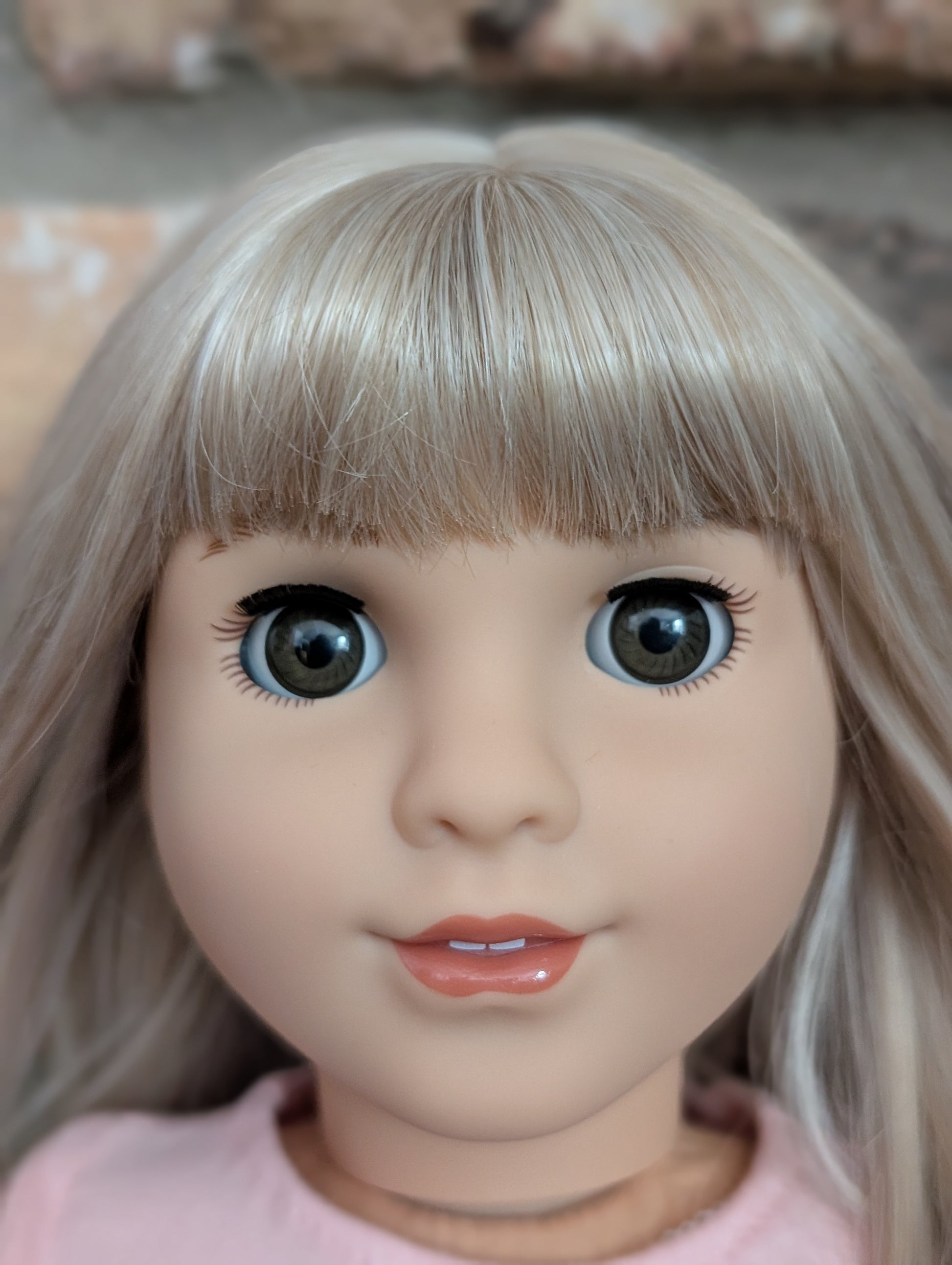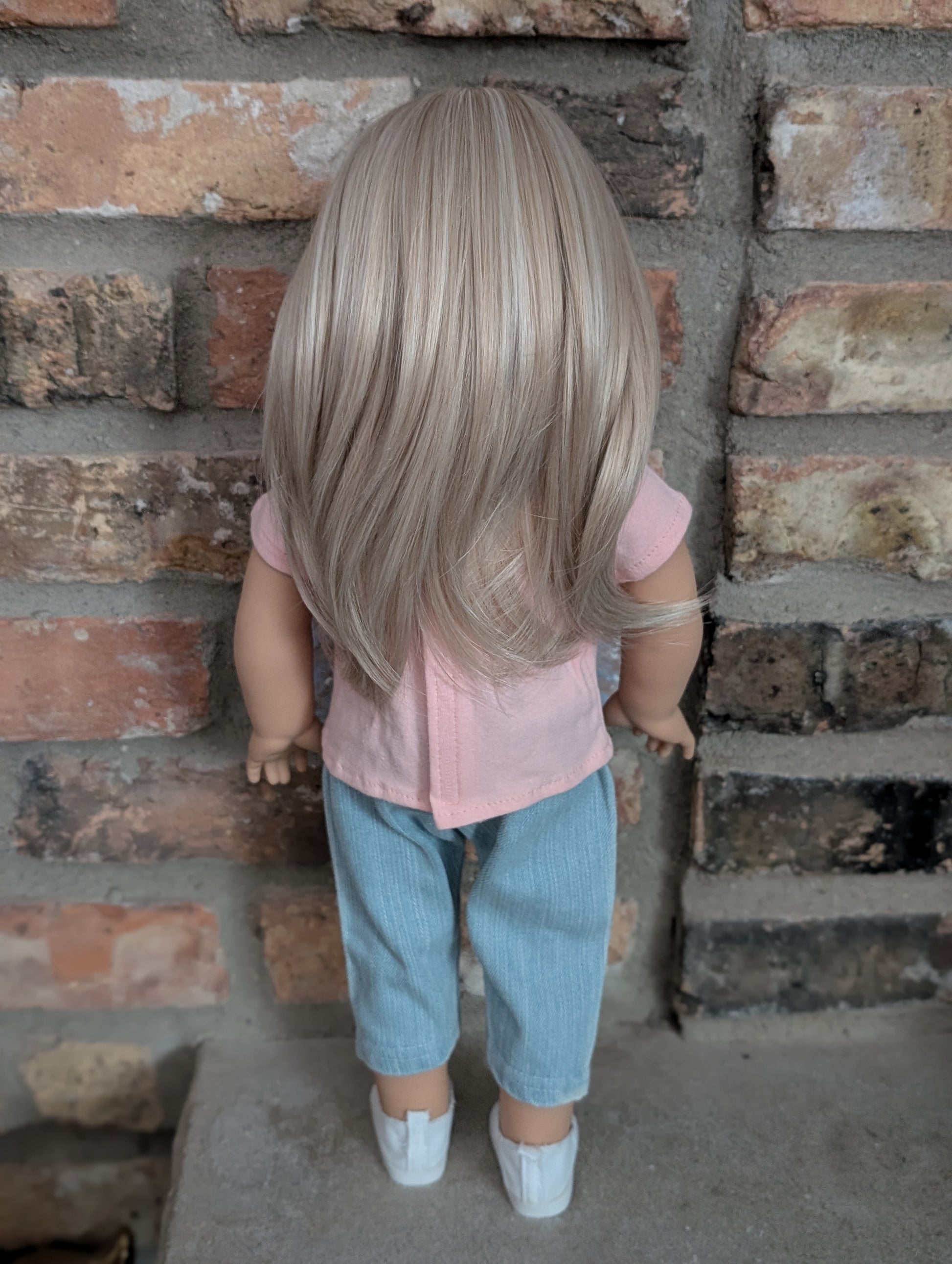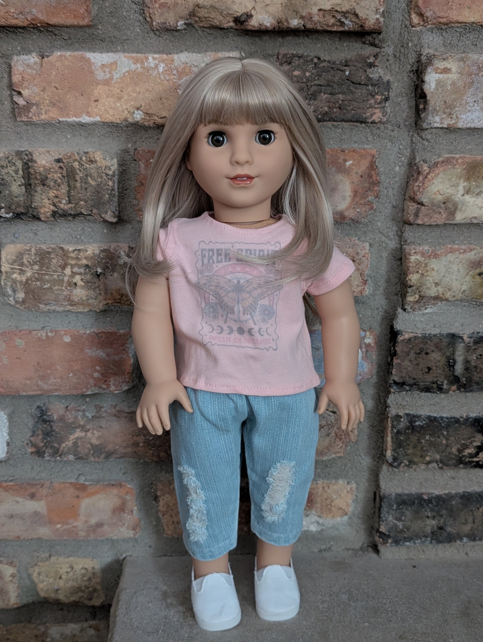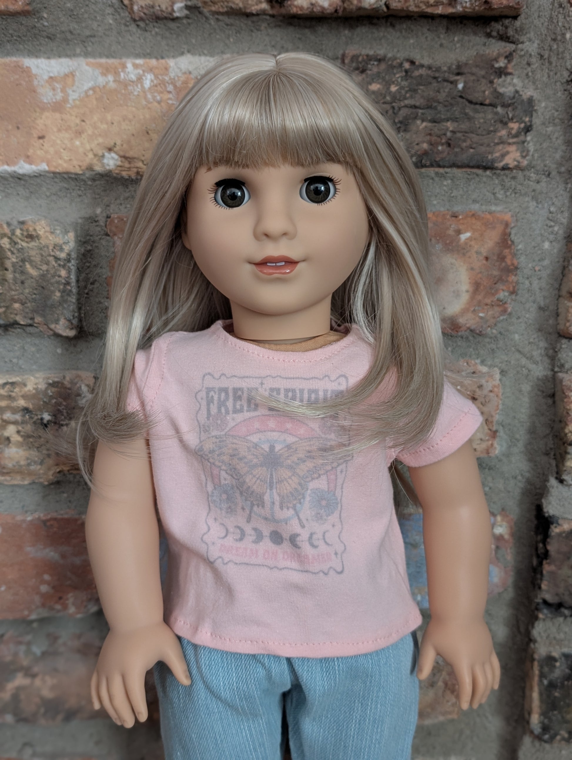 This one of a kind OOAK custom American Girl doll was created with a brand new doll, a blonde wig, and amber eyes. She has lip gloss that was hand painted and sealed. She may have some minor shine marks from handling. She comes with the outfit pictured.