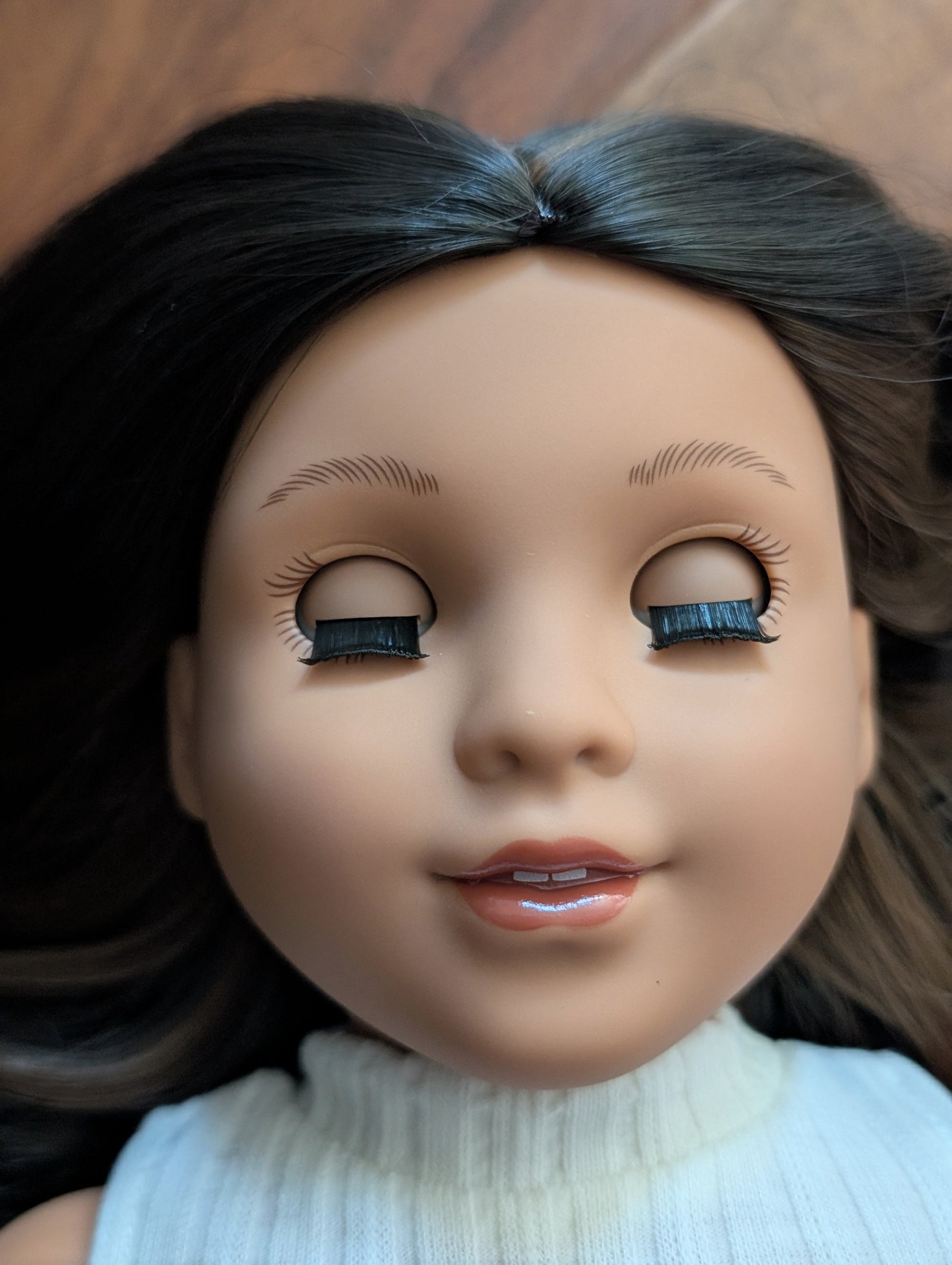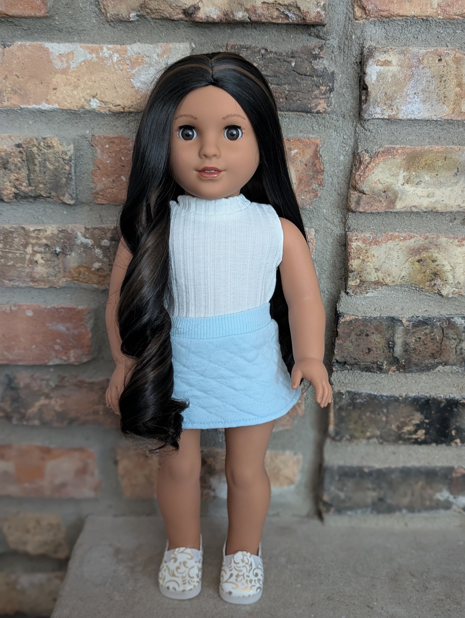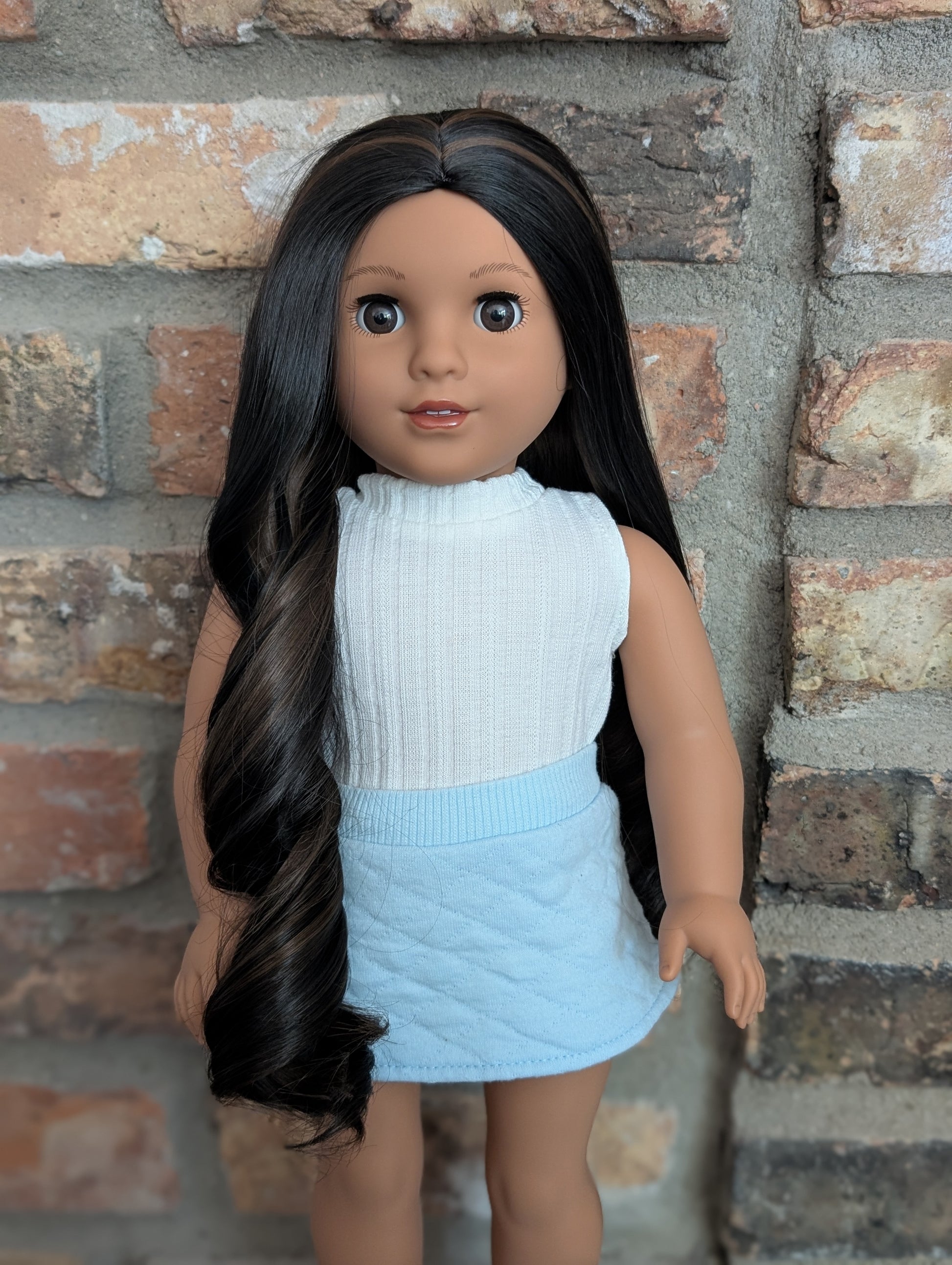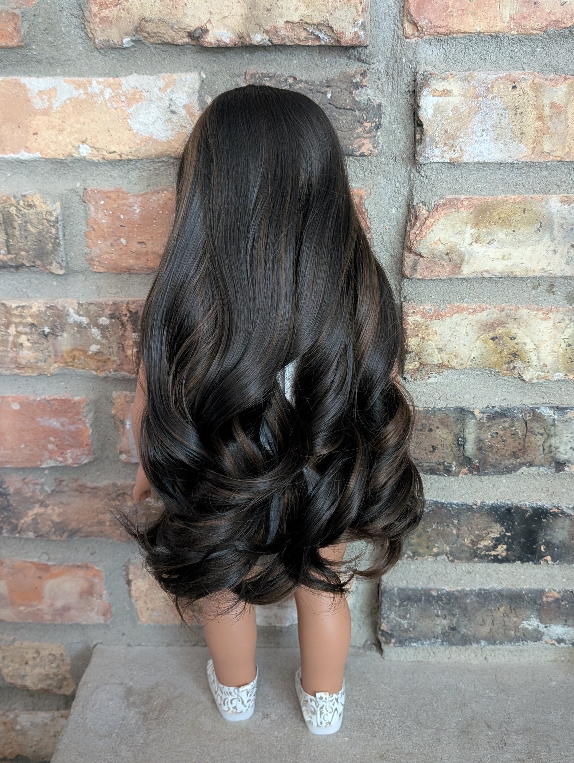 This one of a kind OOAK custom American Girl doll was created with a brand new doll, a black with brown highlights wig, and brown eyes. She has lip gloss that was hand painted and sealed. She may have some minor shine marks from handling. She comes with the outfit pictured.