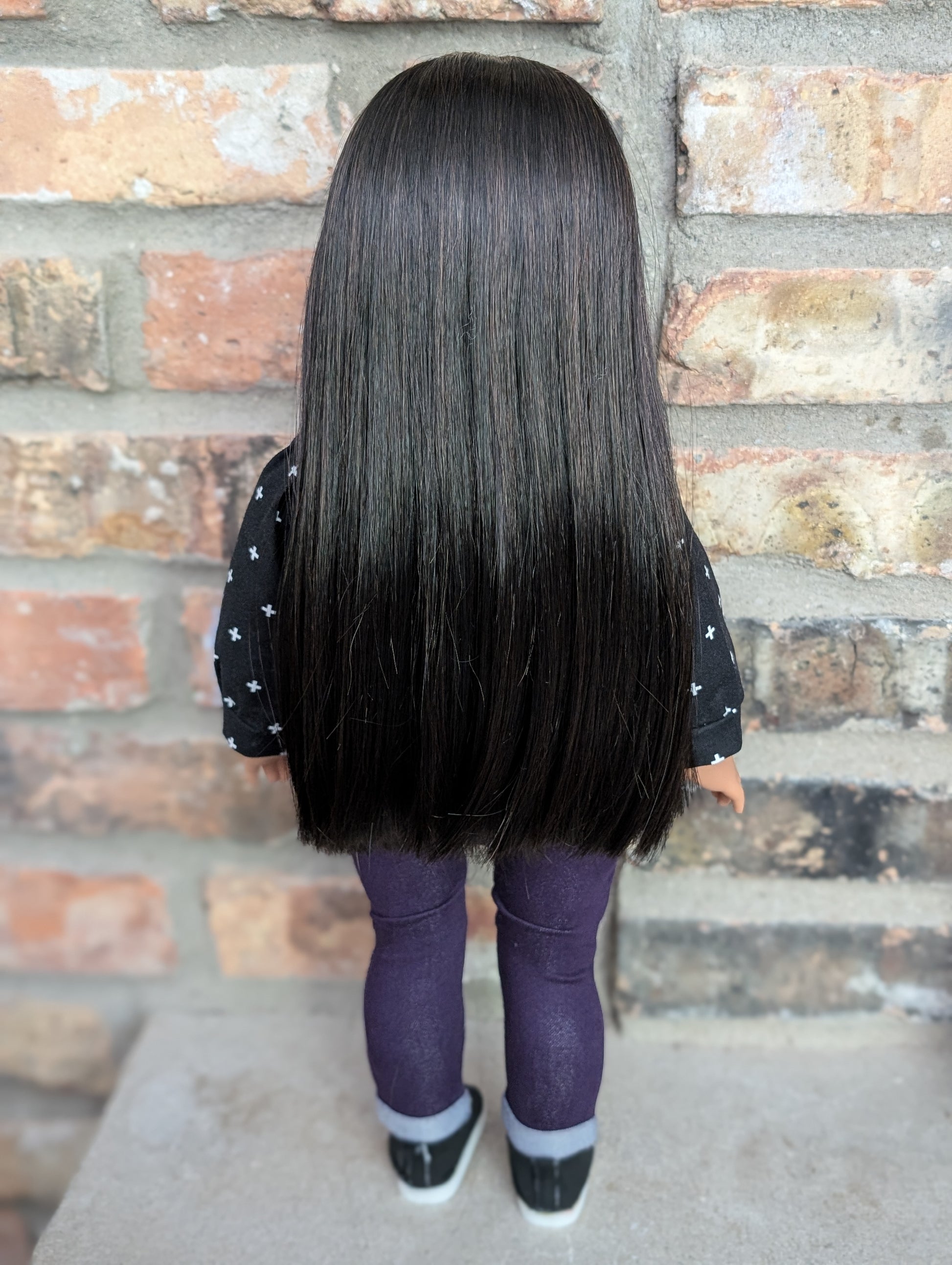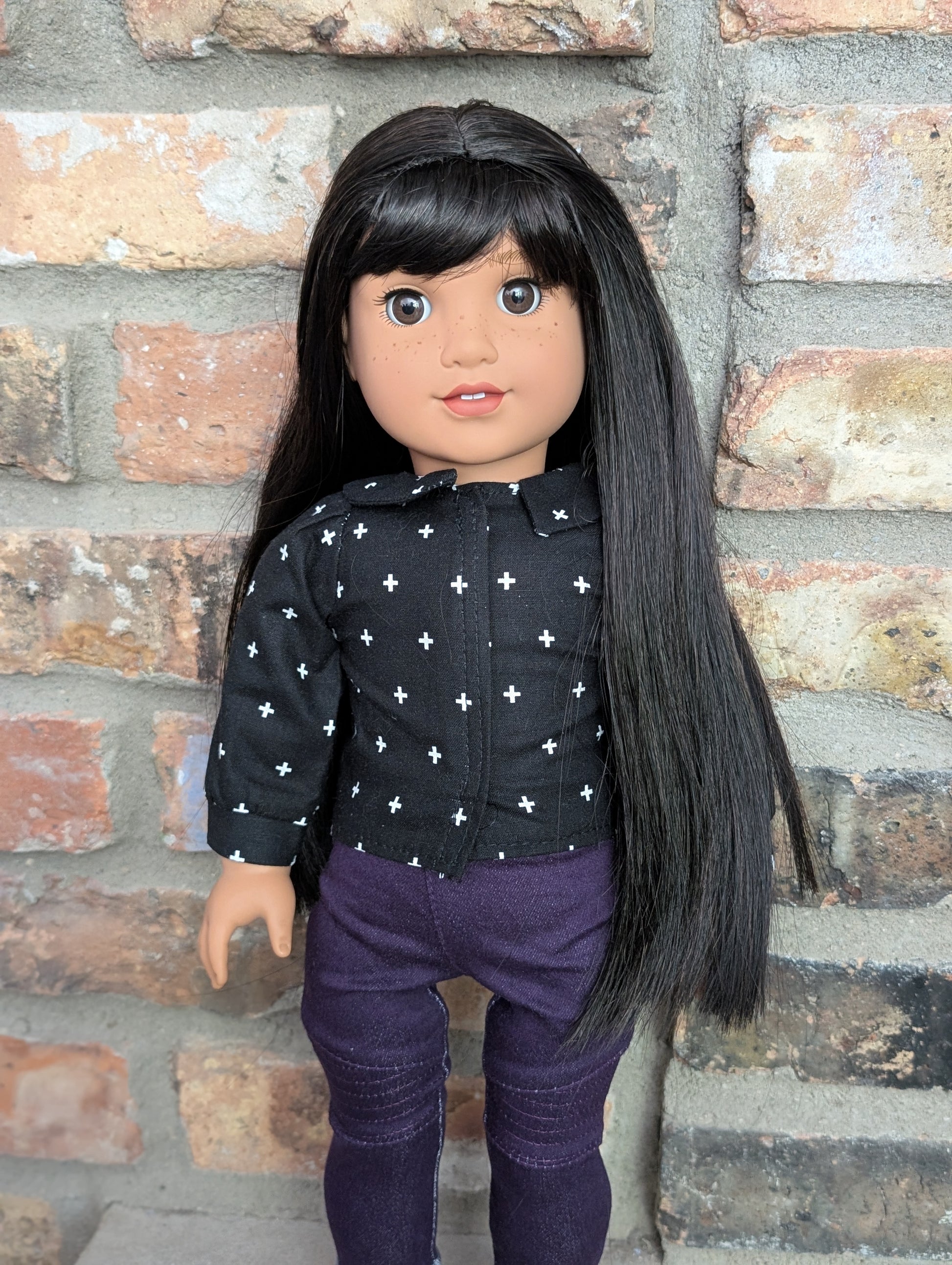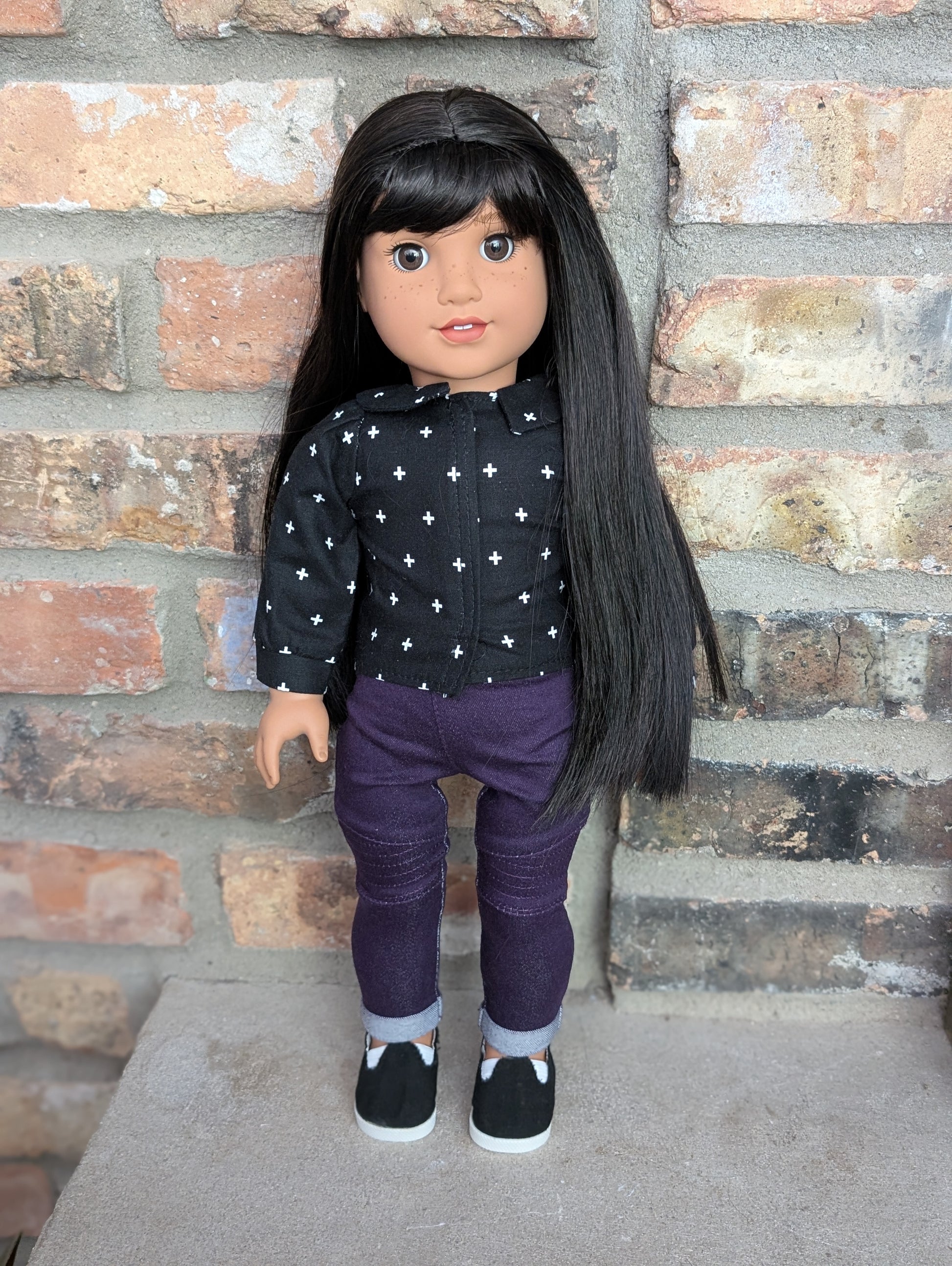 This one of a kind OOAK custom American Girl doll was created with a brand new doll, a black wig, and brown eyes. She has freckles that were hand painted and sealed. She may have some minor shine marks from handling. She comes with the outfit pictured.