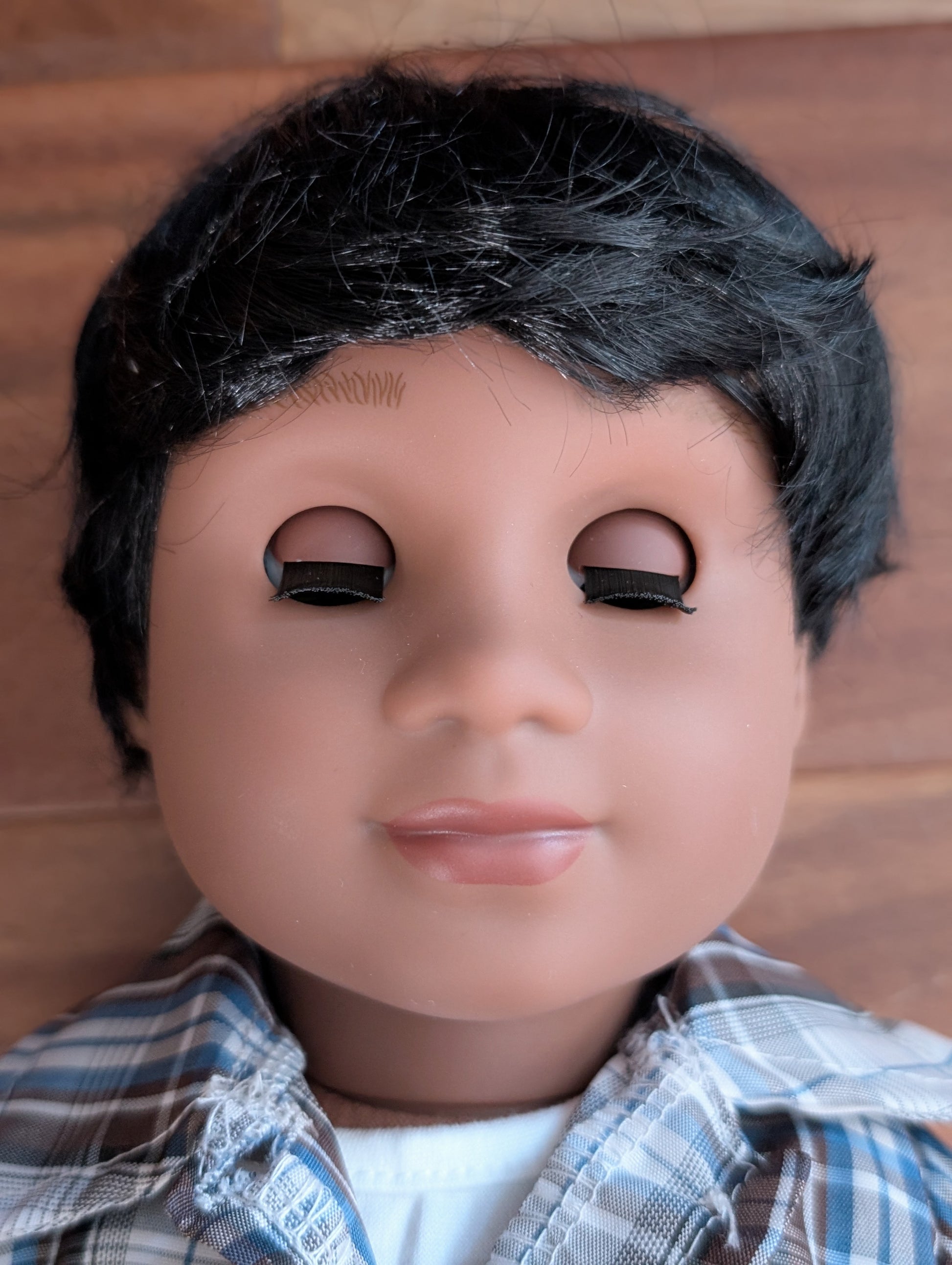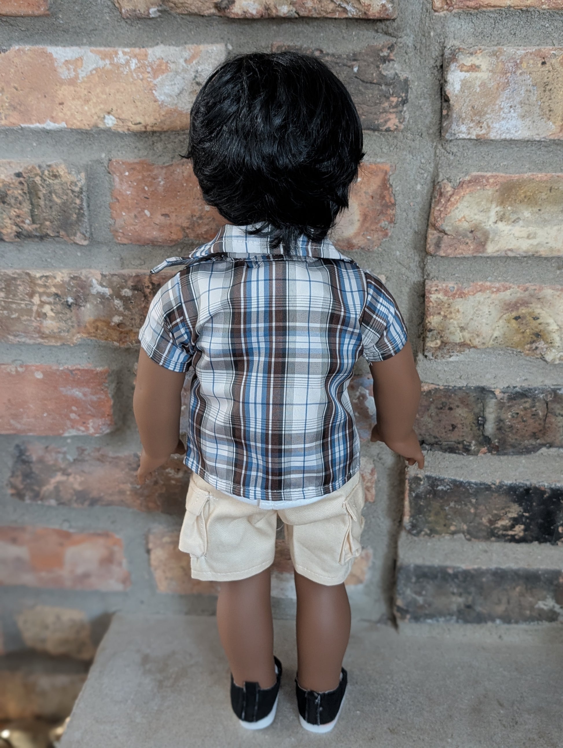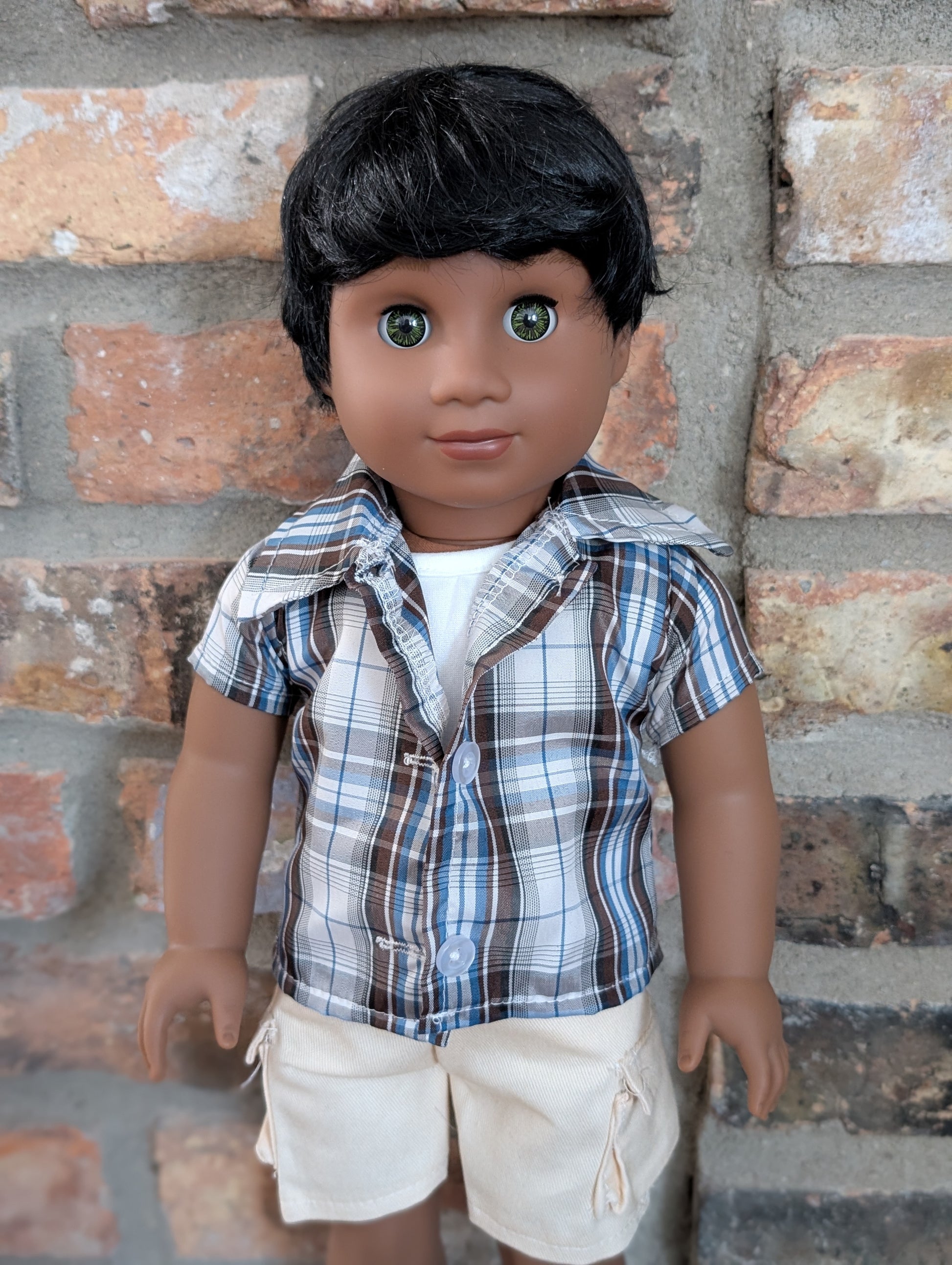 This one of a kind OOAK custom boy American Girl doll was created with a brand new doll, a black wig, and hazel eyes. He may have some minor shine marks from handling. He comes with the outfit pictured.