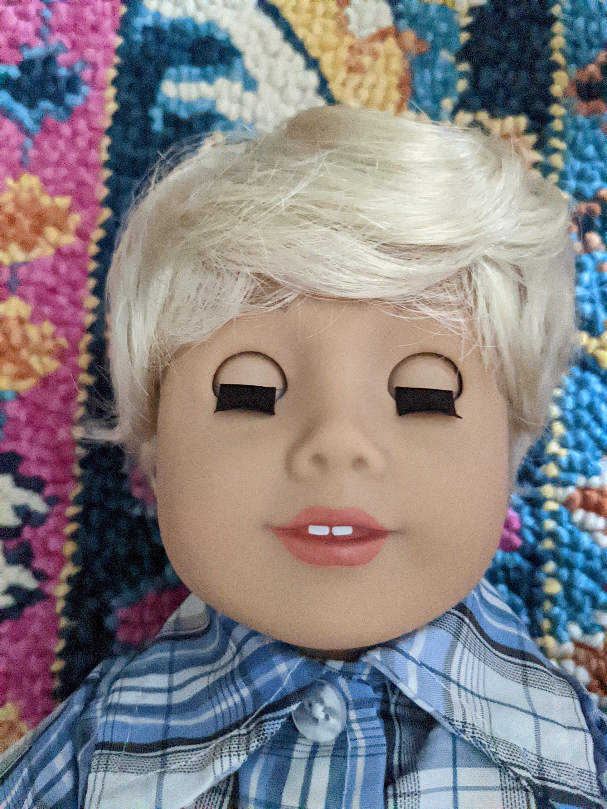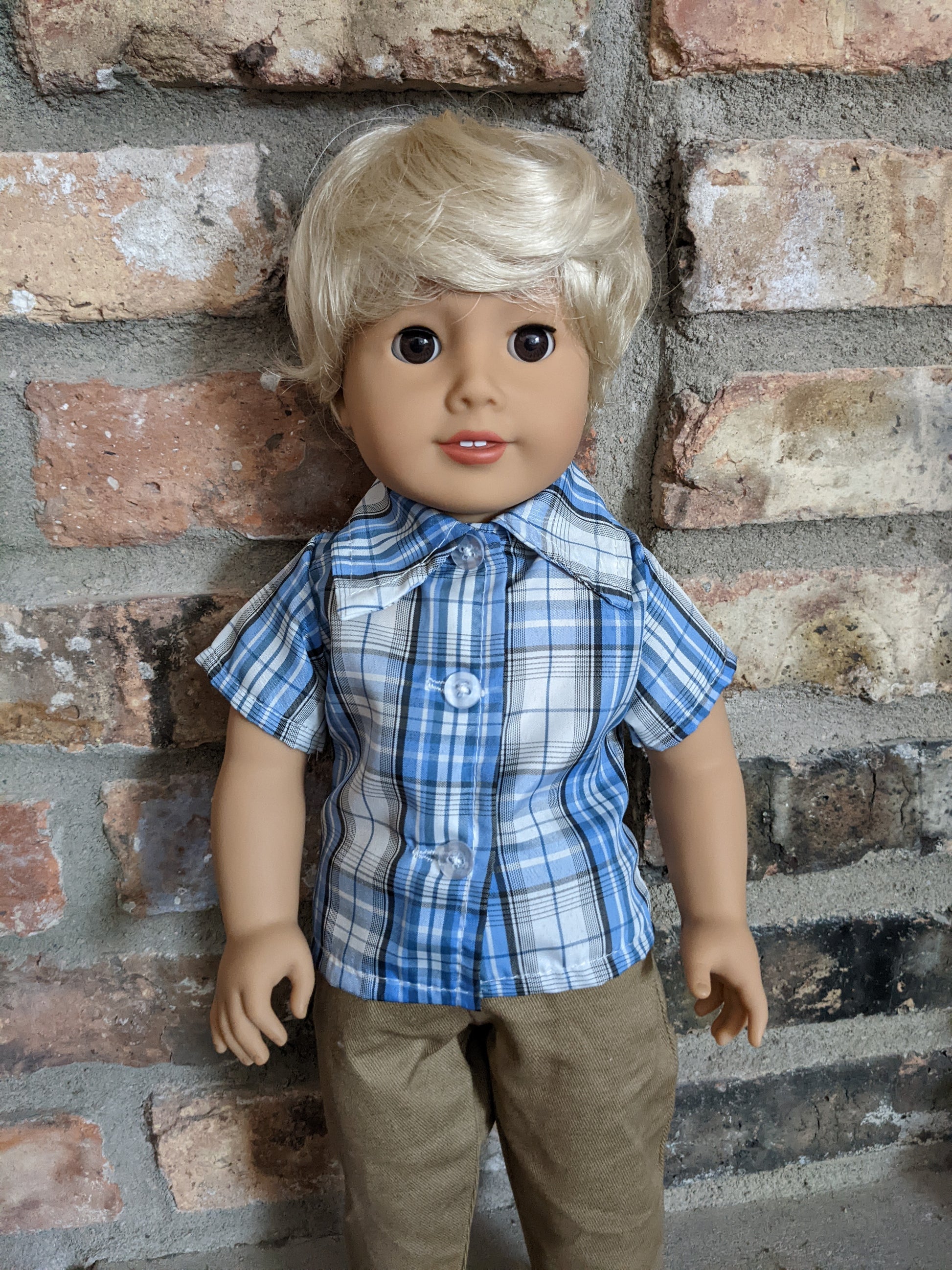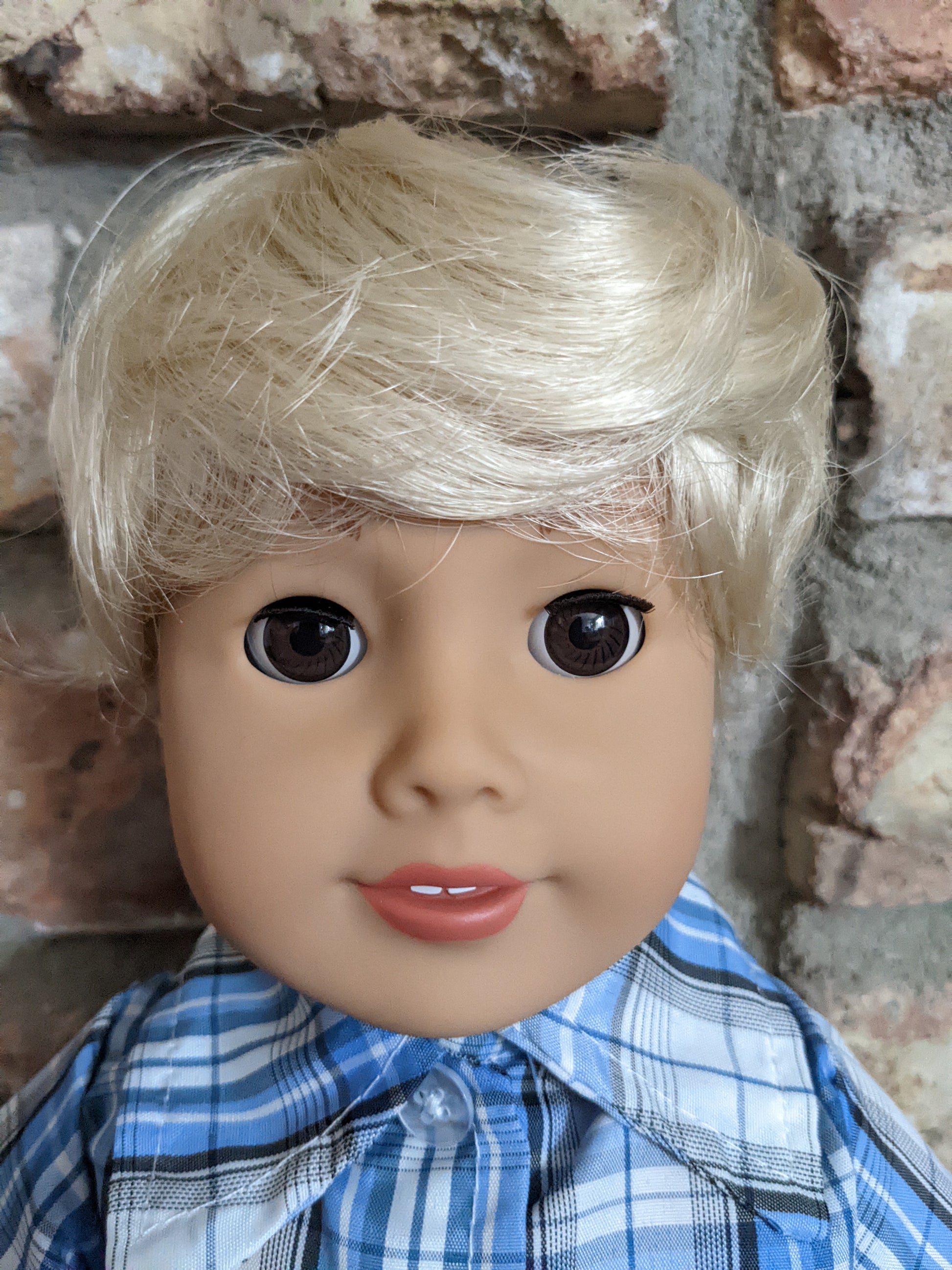 This one of a kind OOAK custom American Girl doll was created with a new Tenney doll, a brand new pale blonde wig, and brown eyes. He may have some minor shine marks from handling and he has a tiny x on his bum. He comes with the outfit pictured. If you would like the wig left unattached, please leave a note in the "Order Special Instructions" box upon checkout. Otherwise I will attach the wig using a heavy duty permanent adhesive for a strong hold.