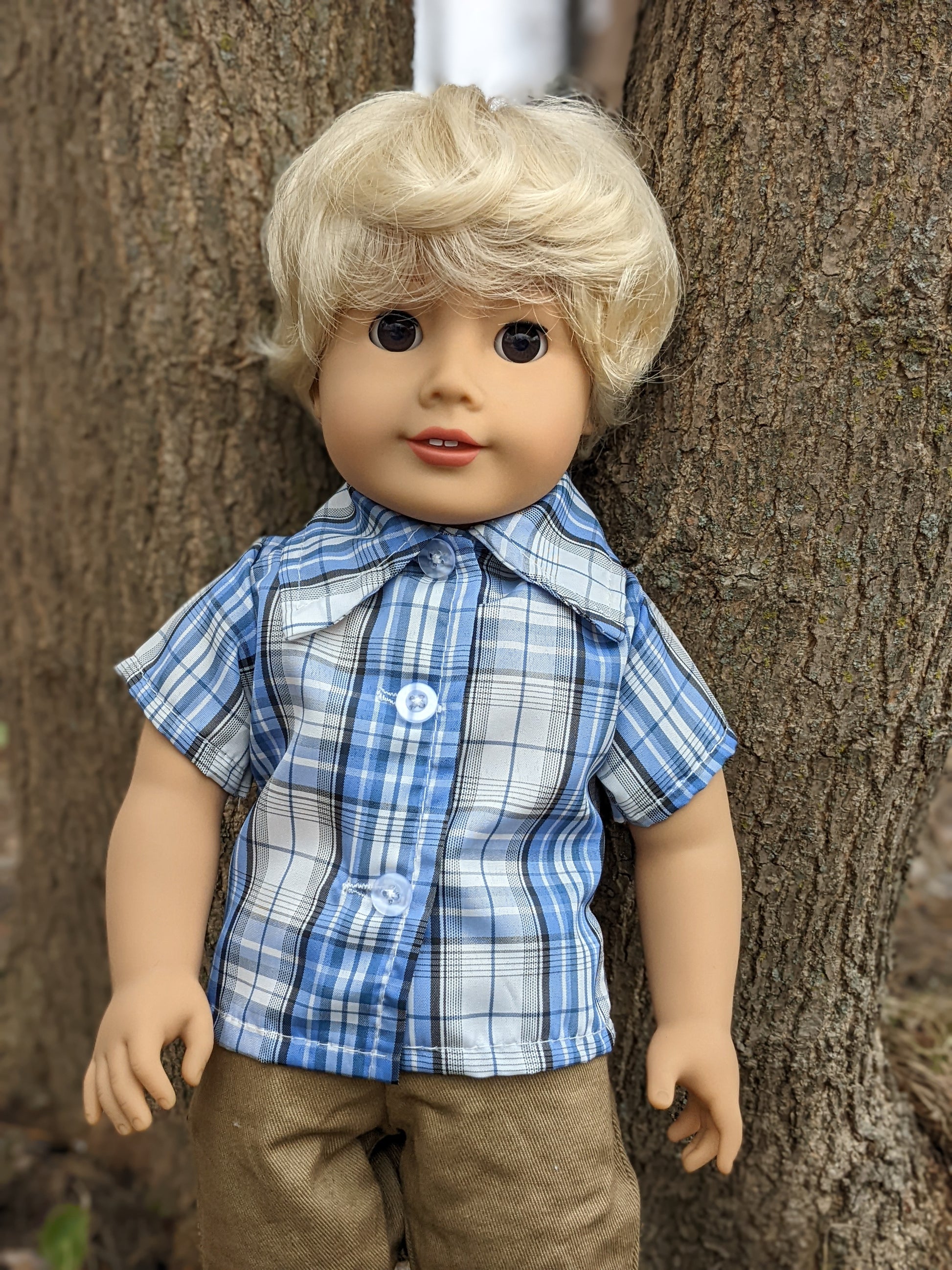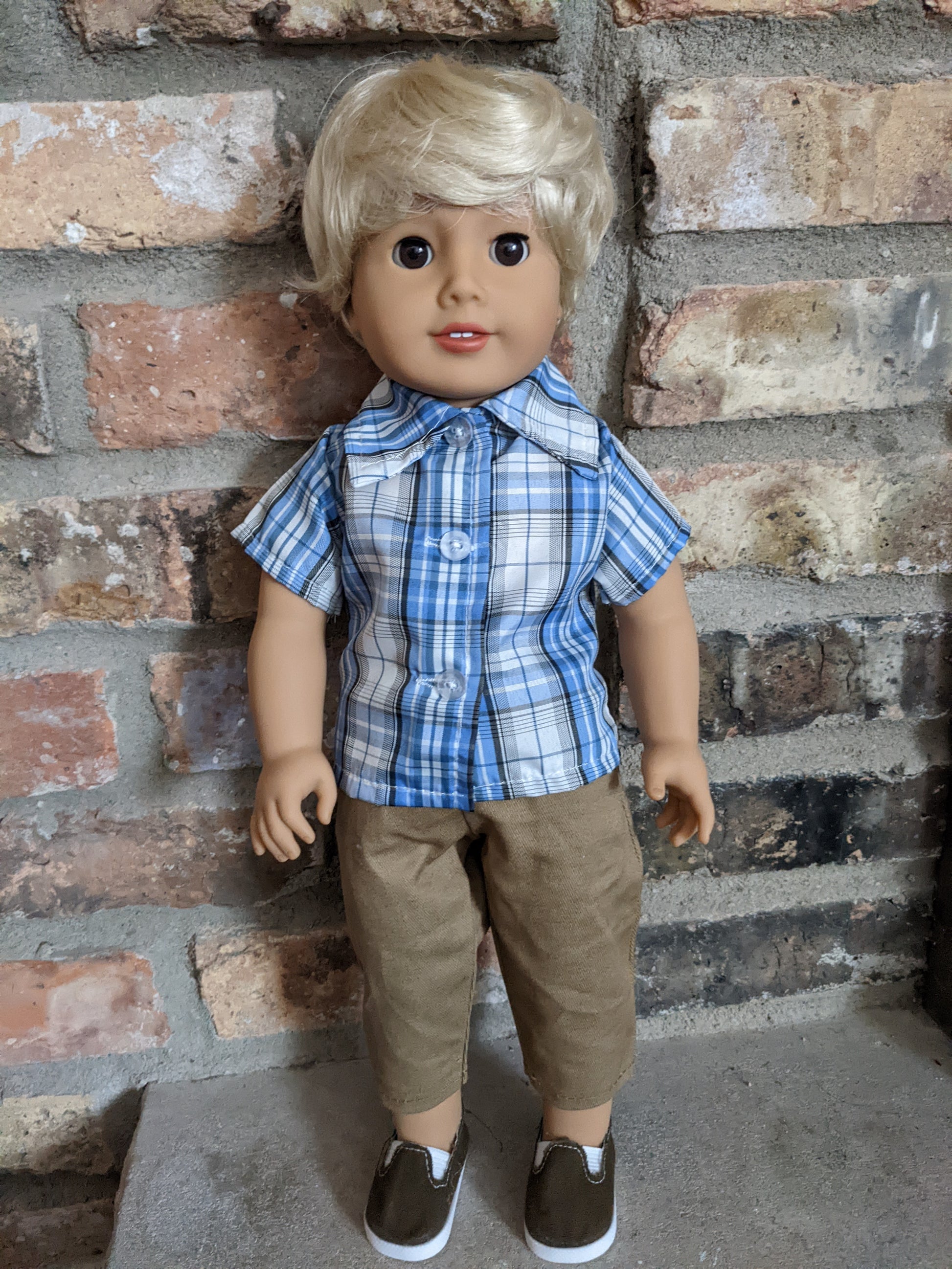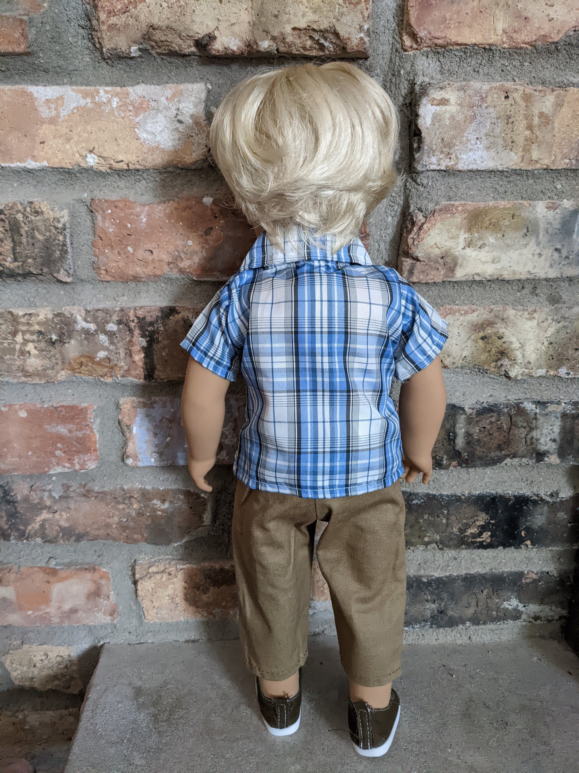 This one of a kind OOAK custom American Girl doll was created with a new Tenney doll, a brand new pale blonde wig, and brown eyes. He may have some minor shine marks from handling and he has a tiny x on his bum. He comes with the outfit pictured. If you would like the wig left unattached, please leave a note in the "Order Special Instructions" box upon checkout. Otherwise I will attach the wig using a heavy duty permanent adhesive for a strong hold.