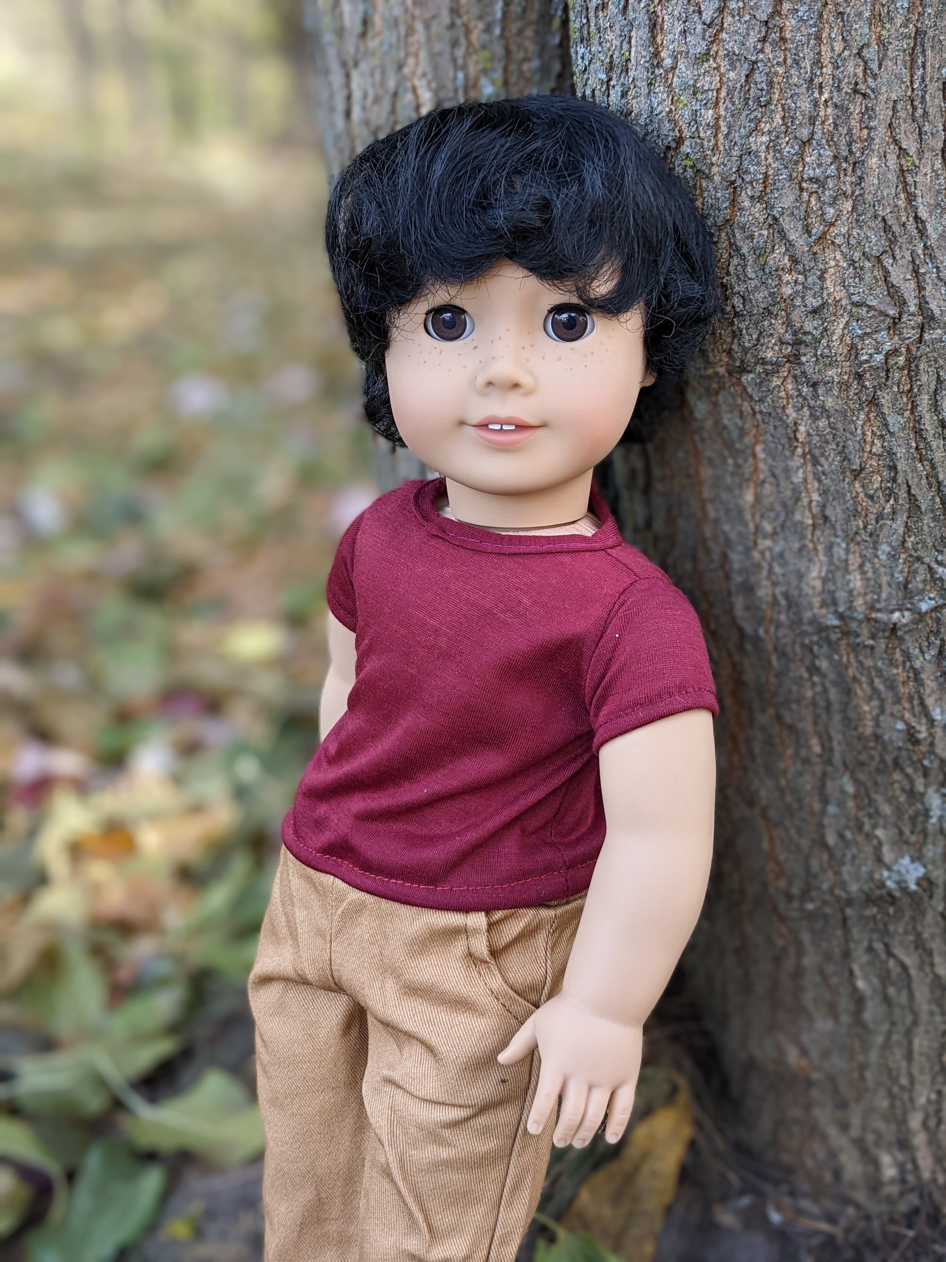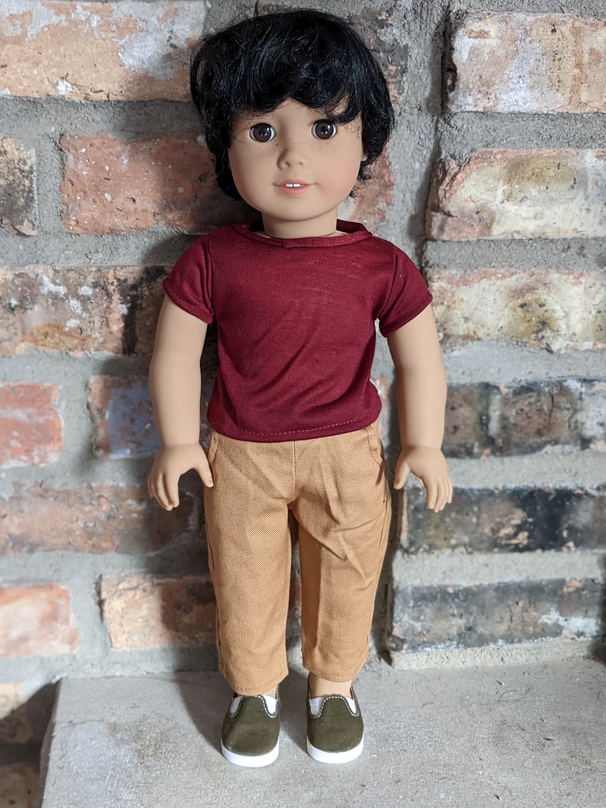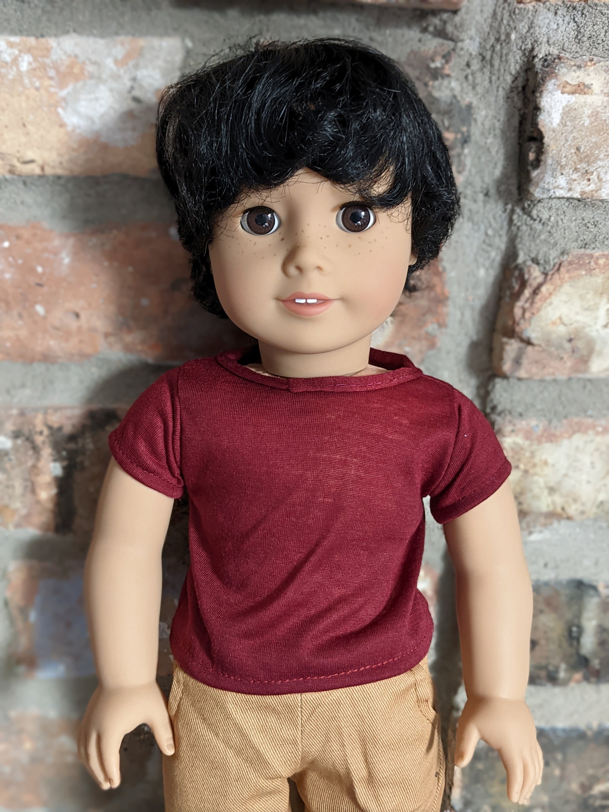 This one of a kind OOAK custom American Girl doll was created with a brand new Truly Me doll, a dark brown wig, and brown eyes. He has freckles that were hand-painted and sealed. He may have some minor shine marks from handling. He comes with the outfit pictured.