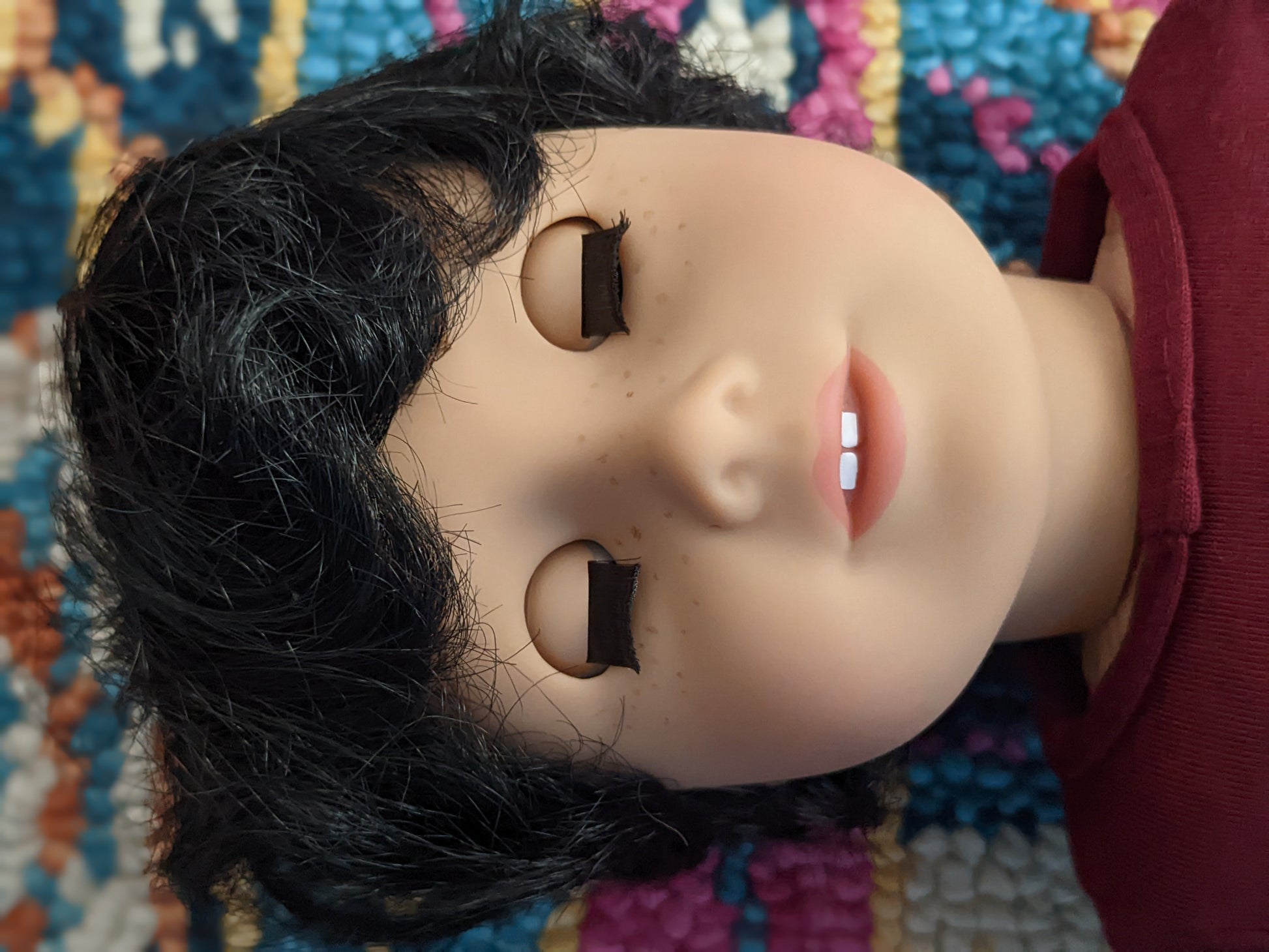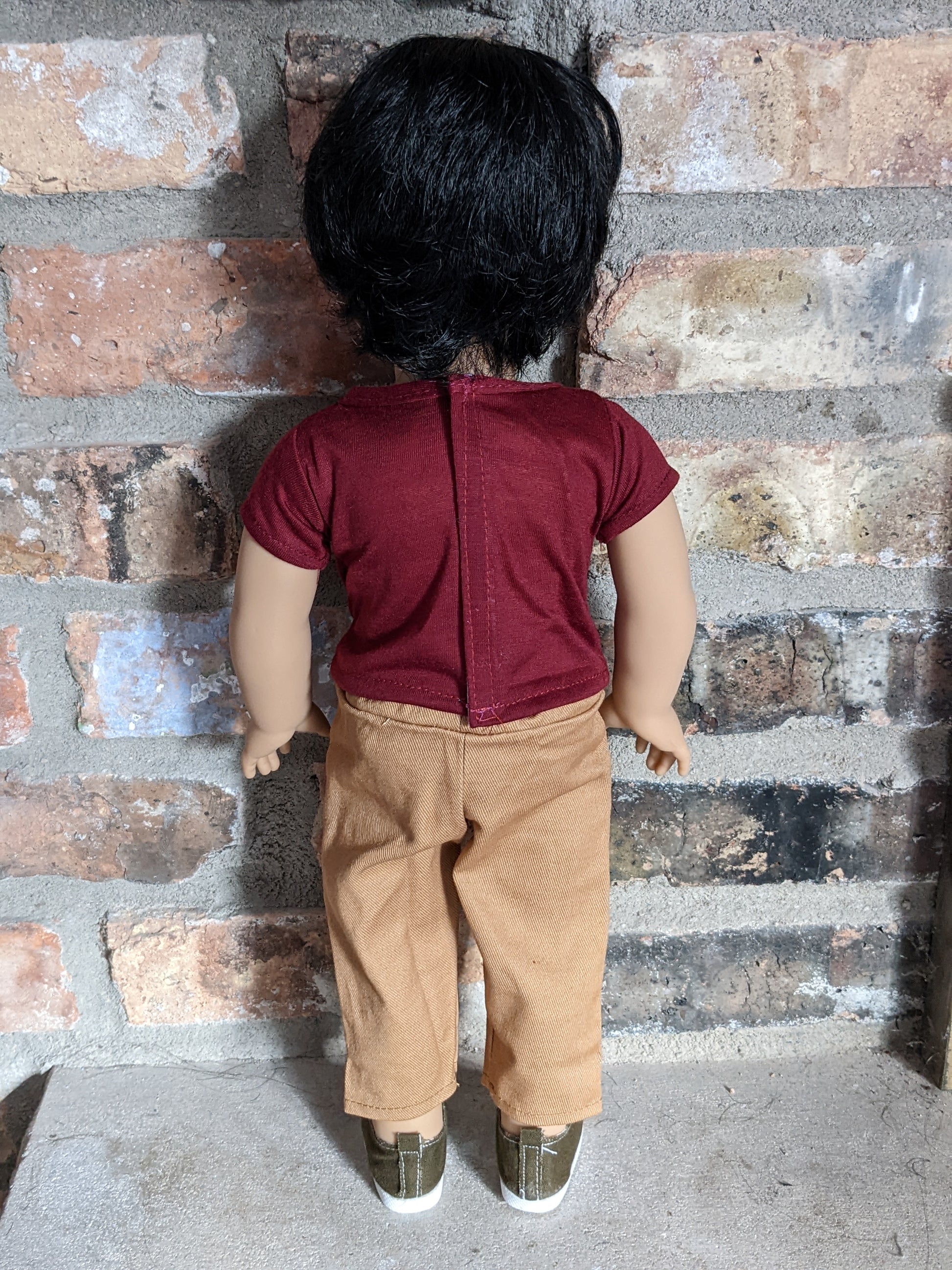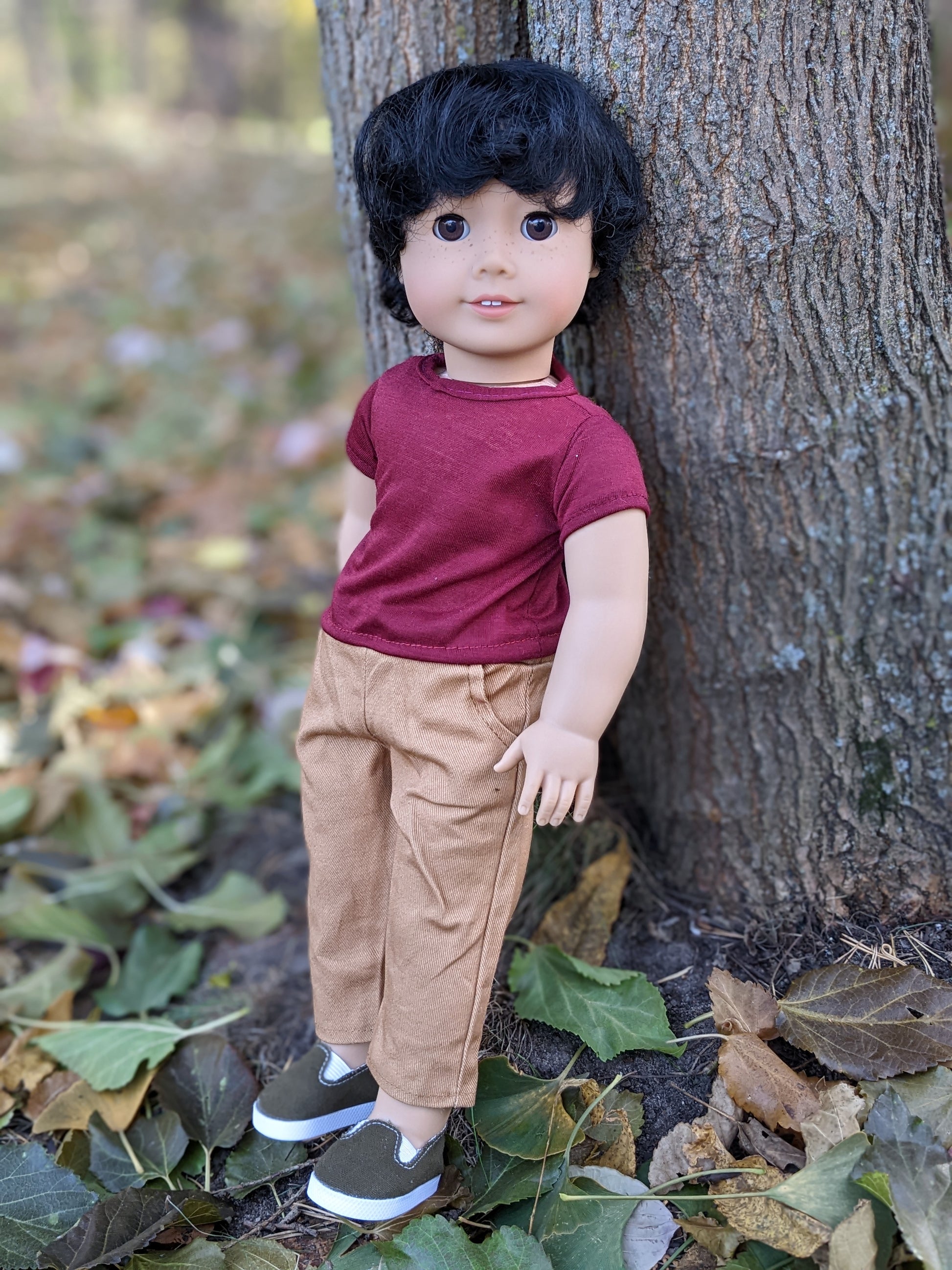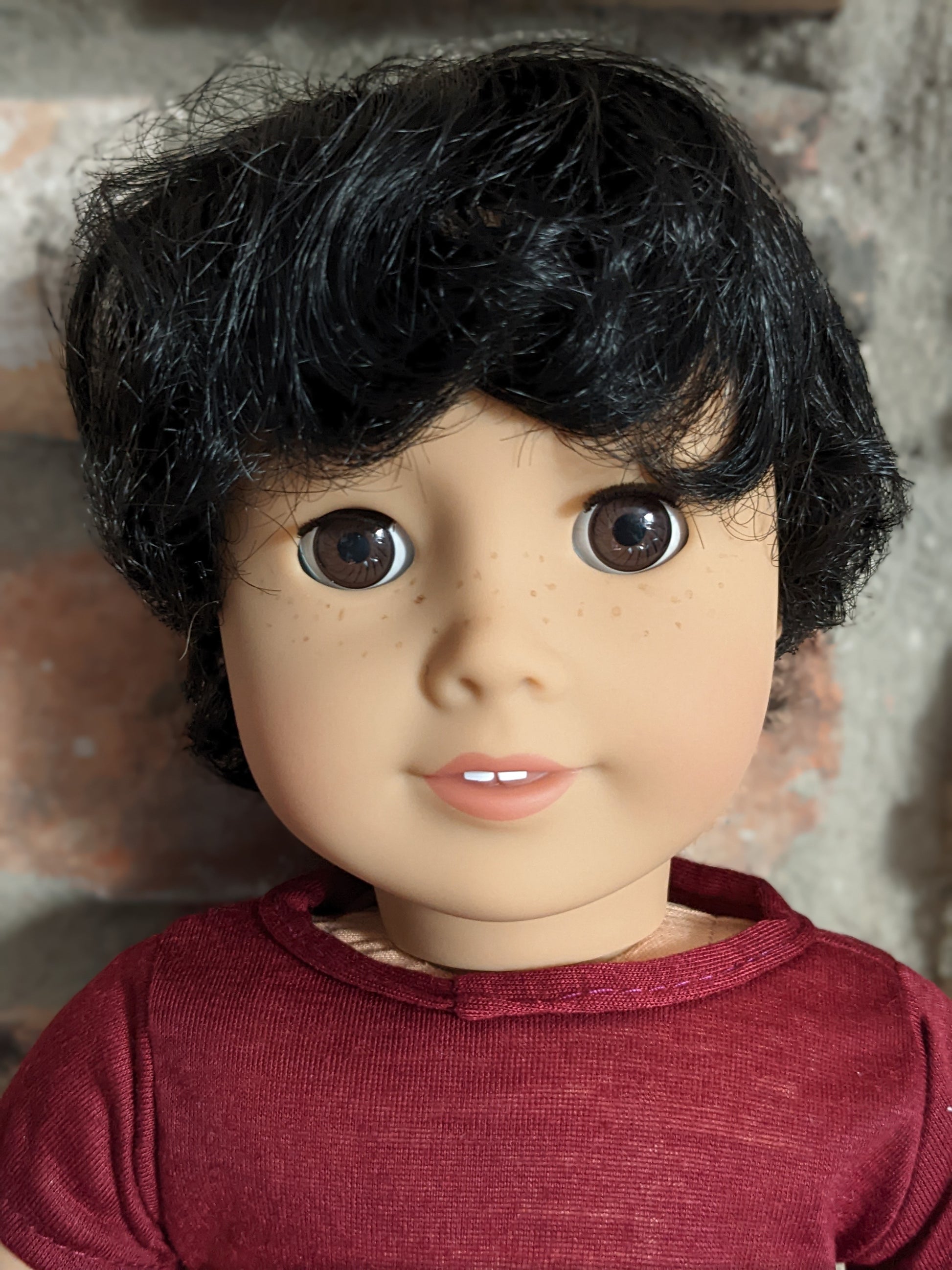 This one of a kind OOAK custom American Girl doll was created with a brand new Truly Me doll, a dark brown wig, and brown eyes. He has freckles that were hand-painted and sealed. He may have some minor shine marks from handling. He comes with the outfit pictured.