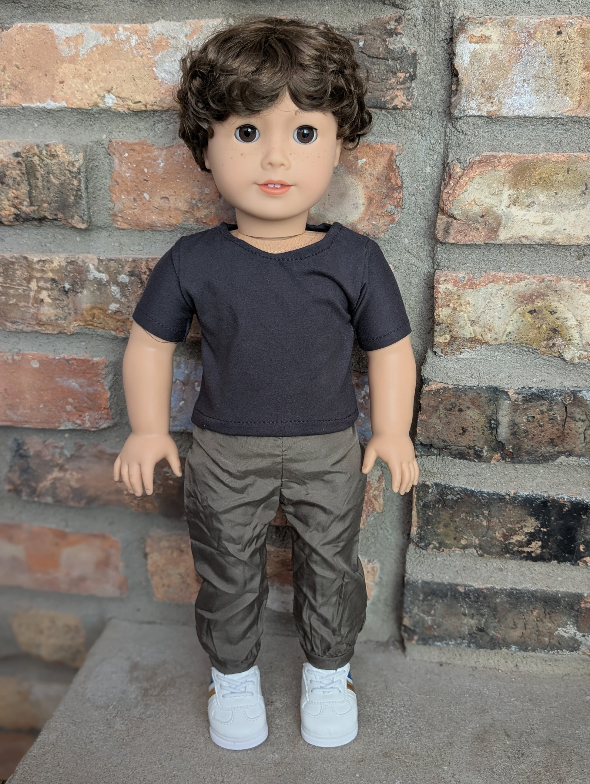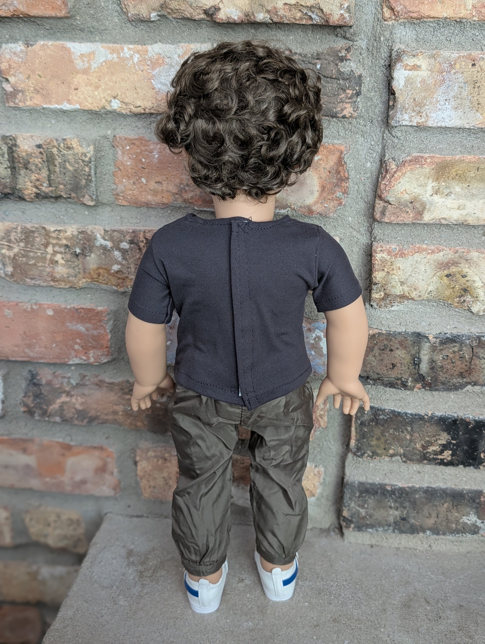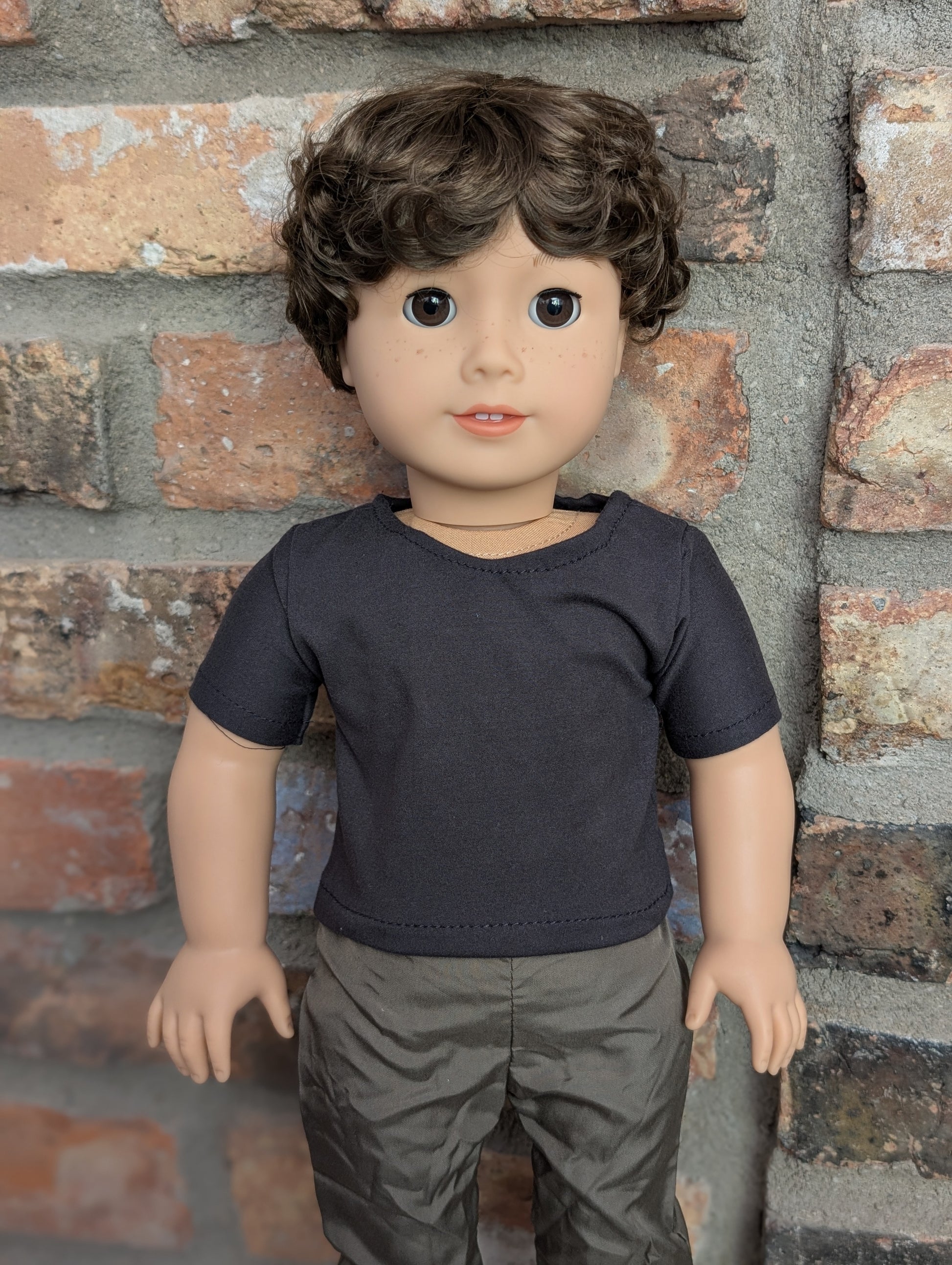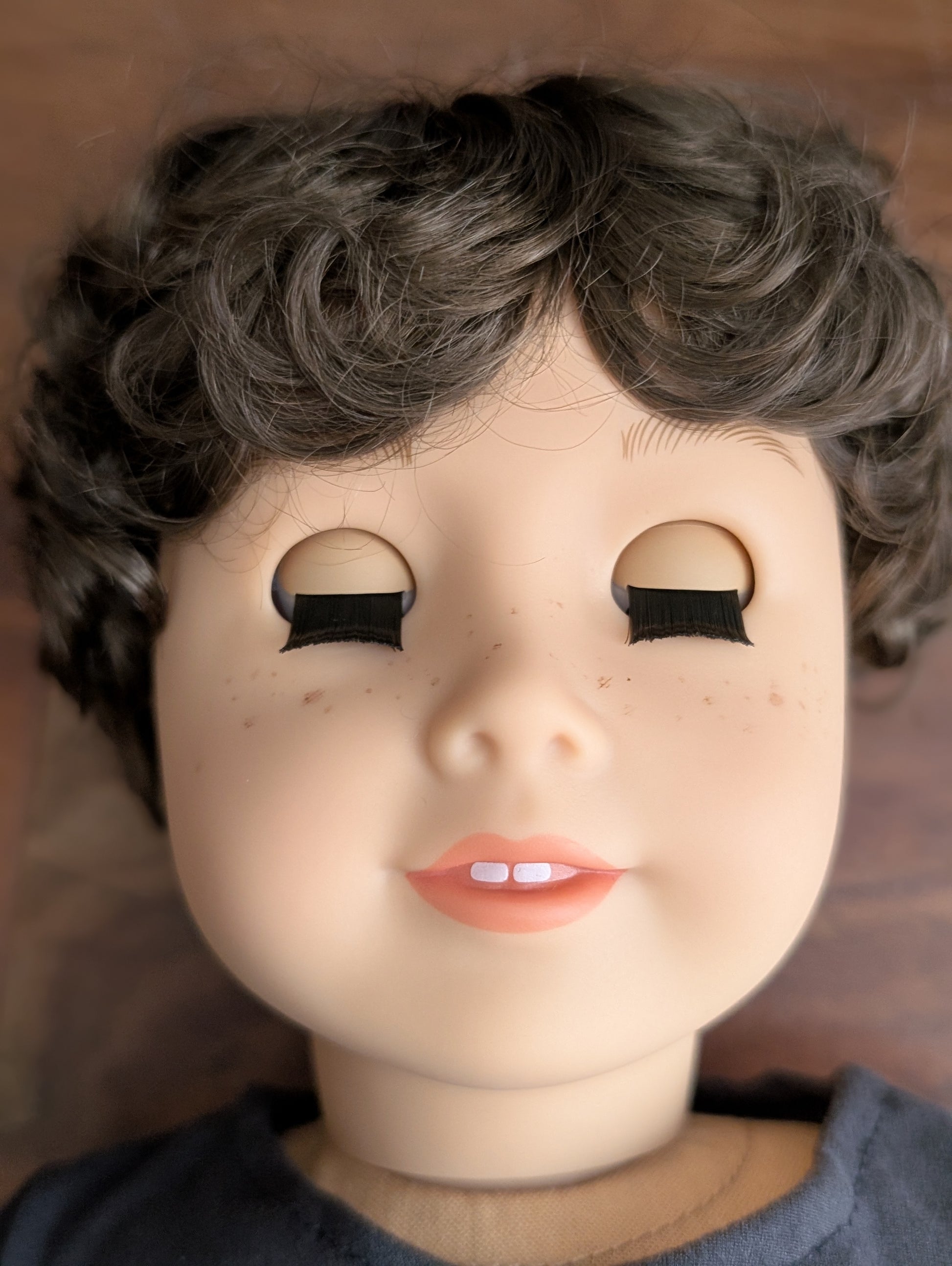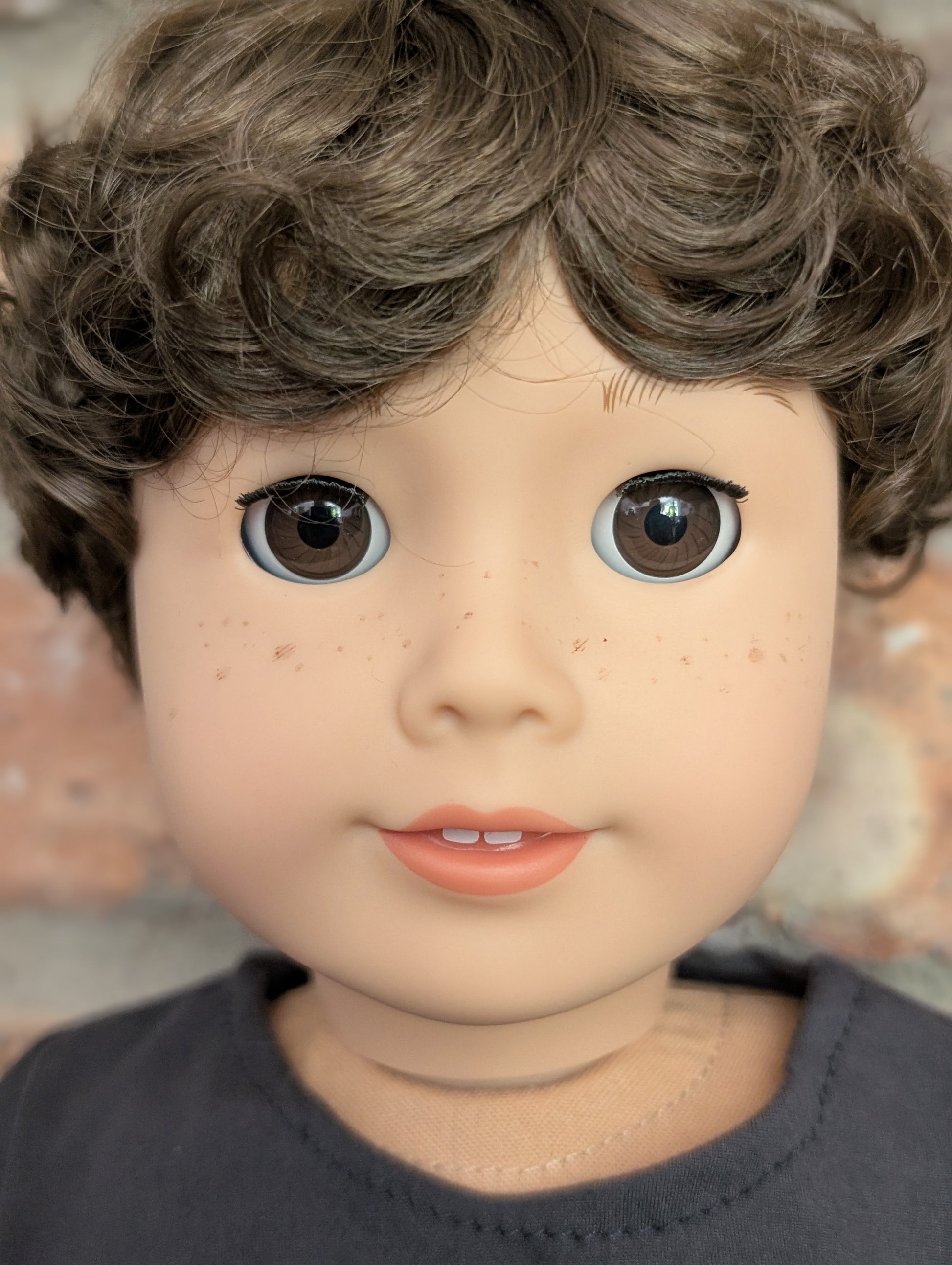 This one of a kind OOAK custom boy American Girl doll was created with a brand new doll, a brown wig, and brown eyes. He has freckles that were hand painted and sealed. He may have some minor shine marks from handling. He comes with the outfit pictured.