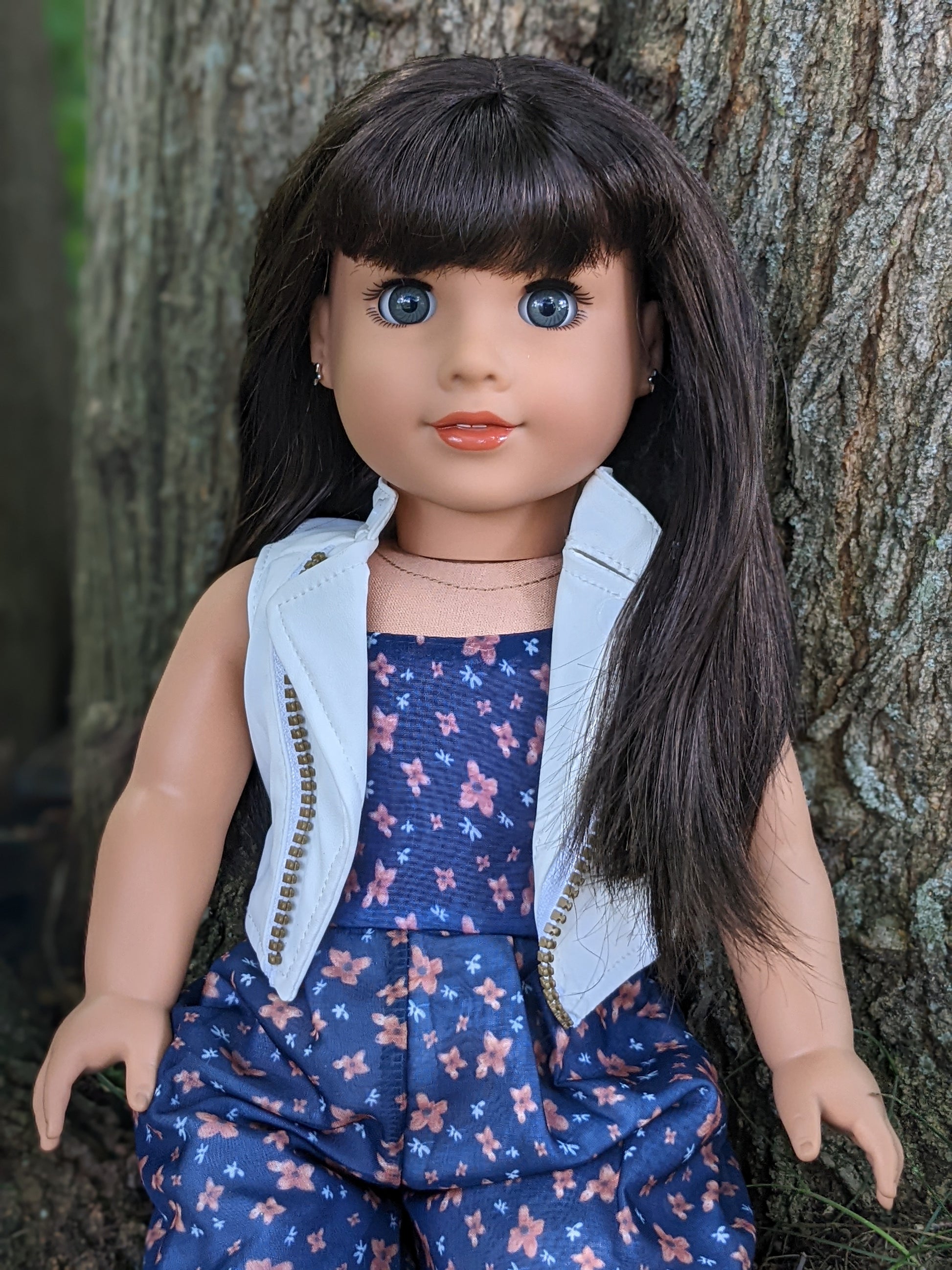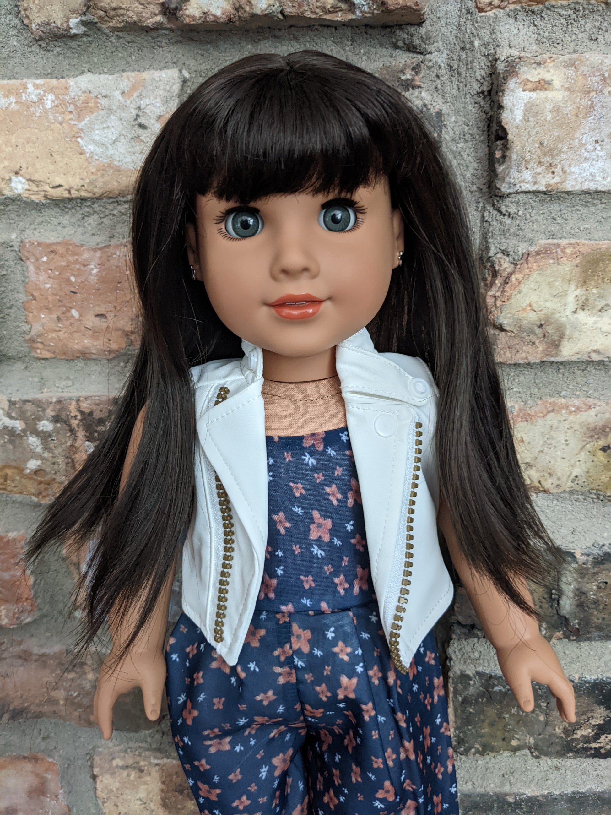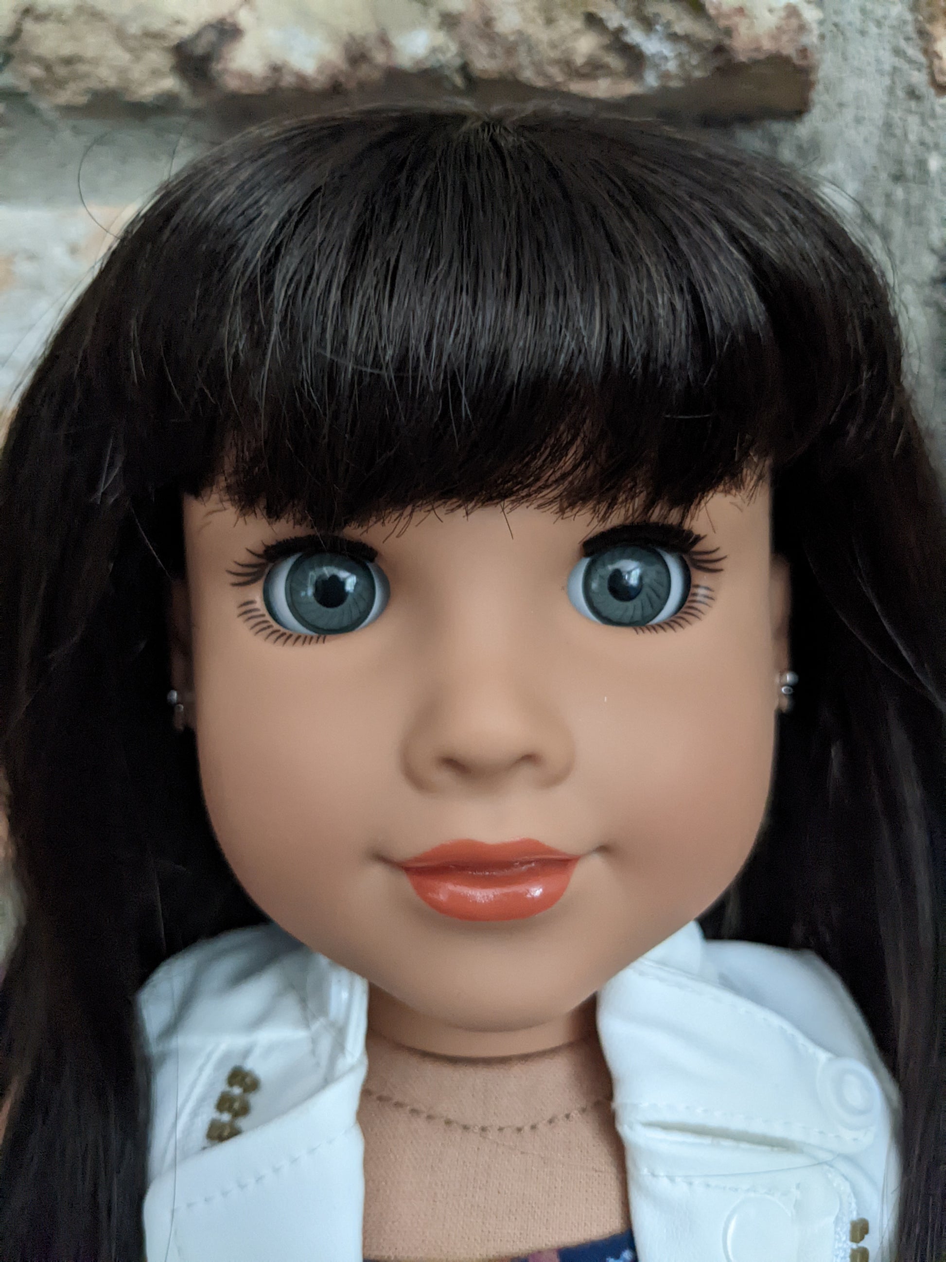 This one of a kind OOAK custom American Girl doll was created with a brand new Maritza doll, a dark brown wig with bangs from a new TM doll, and grey eyes. She has lip gloss that was hand painted and sealed. Her ears are pierced with AG earrings. She may have some minor shine marks from handling. She comes with the outfit pictured.
