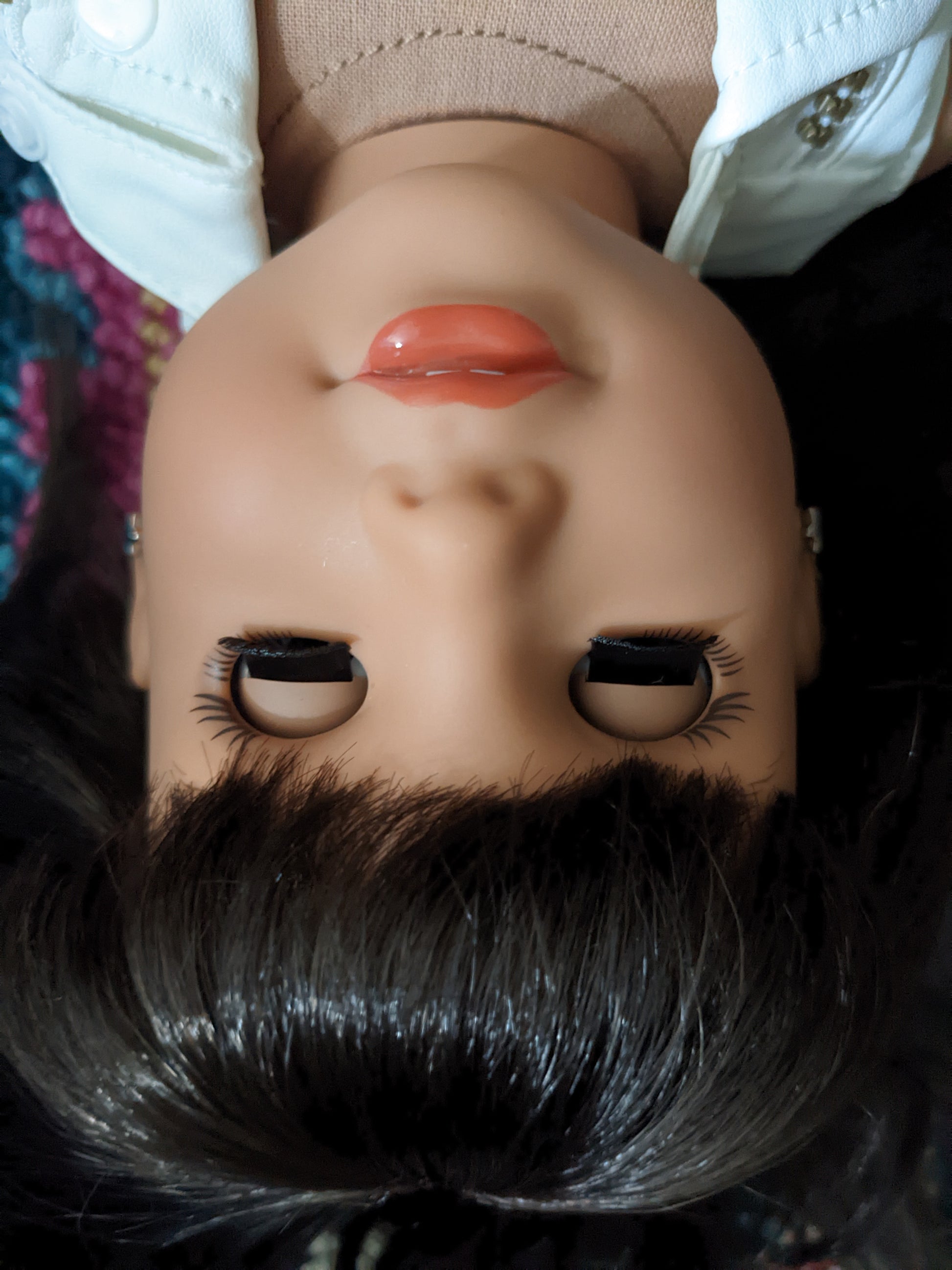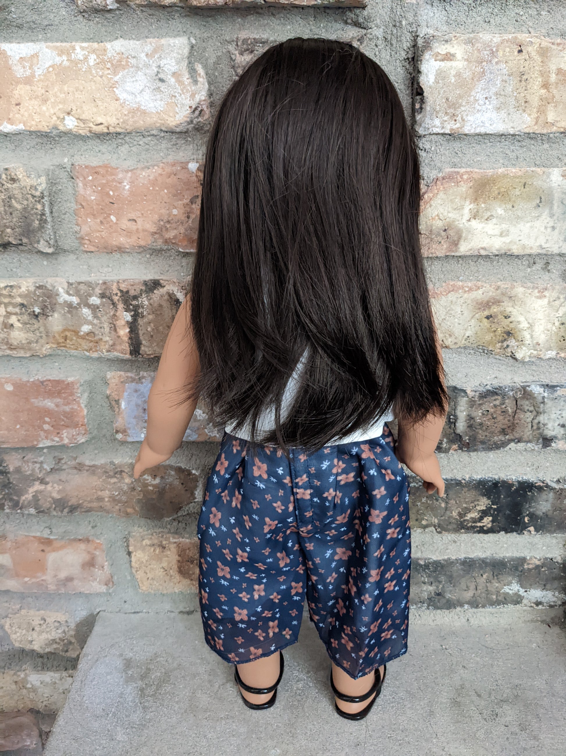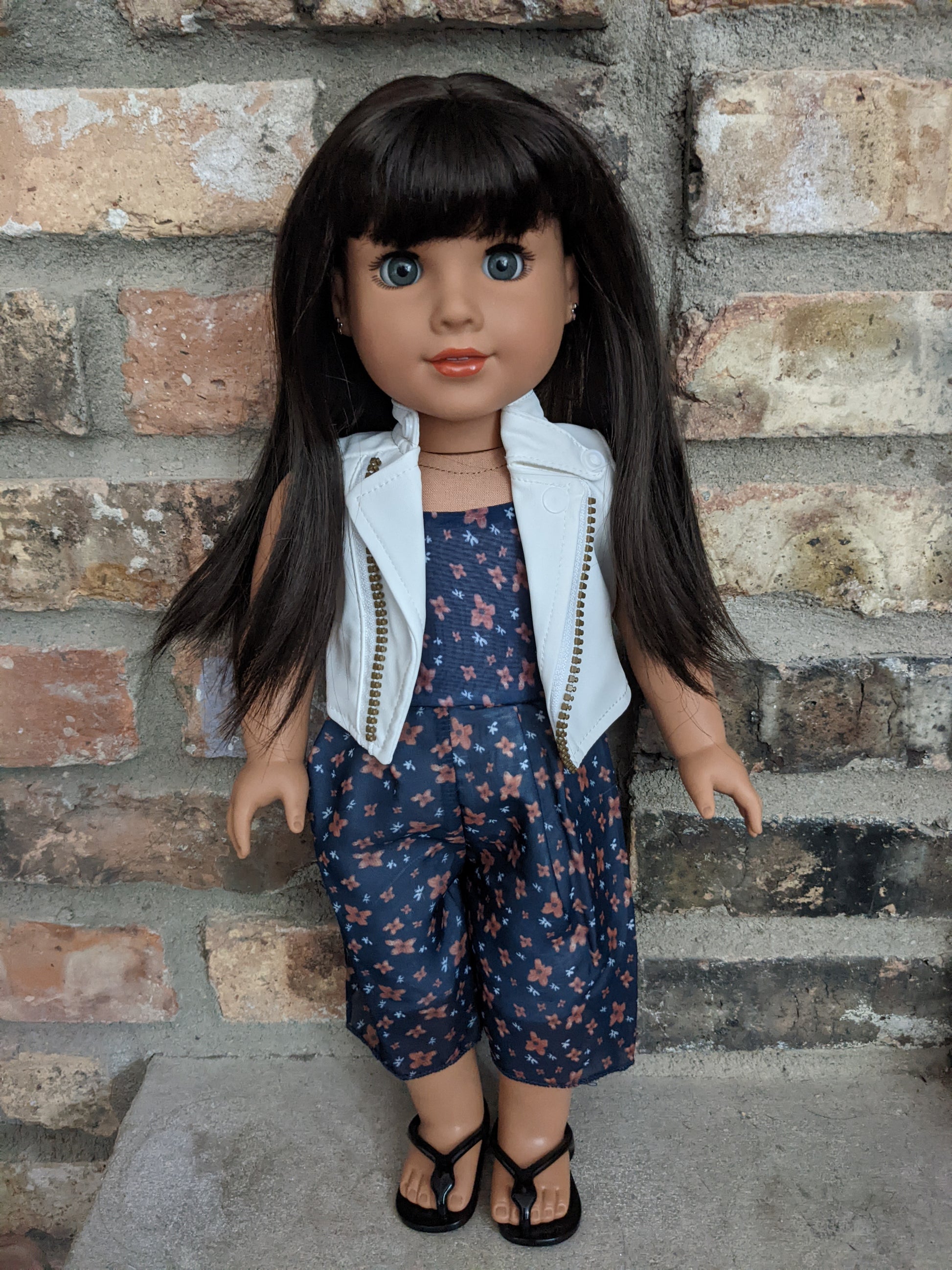This one of a kind OOAK custom American Girl doll was created with a brand new Maritza doll, a dark brown wig with bangs from a new TM doll, and grey eyes. She has lip gloss that was hand painted and sealed. Her ears are pierced with AG earrings. She may have some minor shine marks from handling. She comes with the outfit pictured.