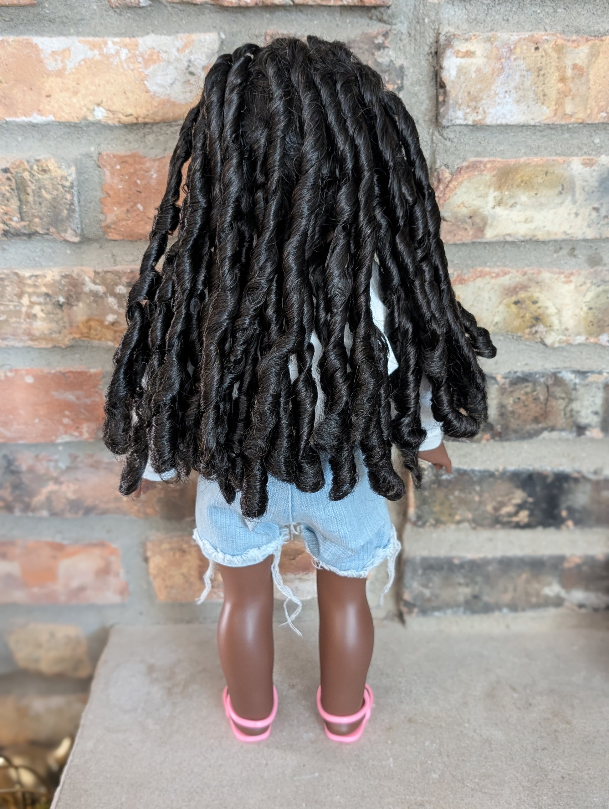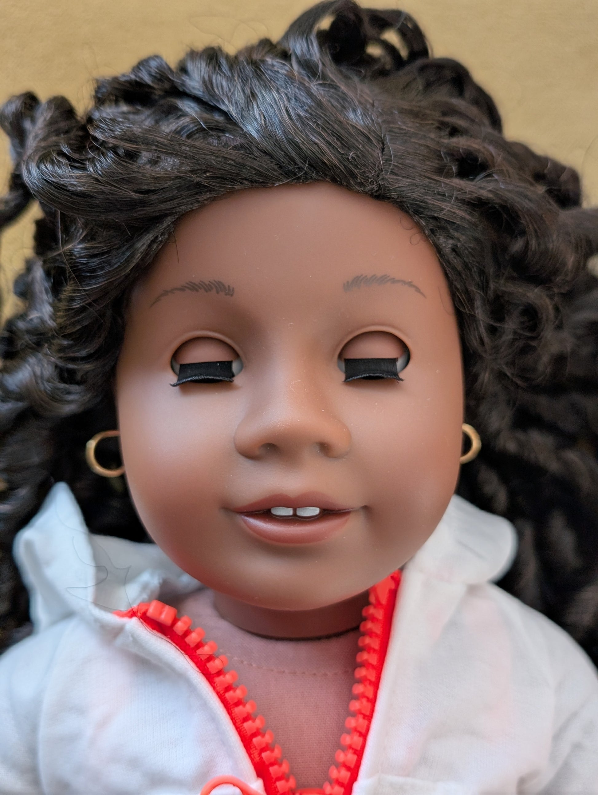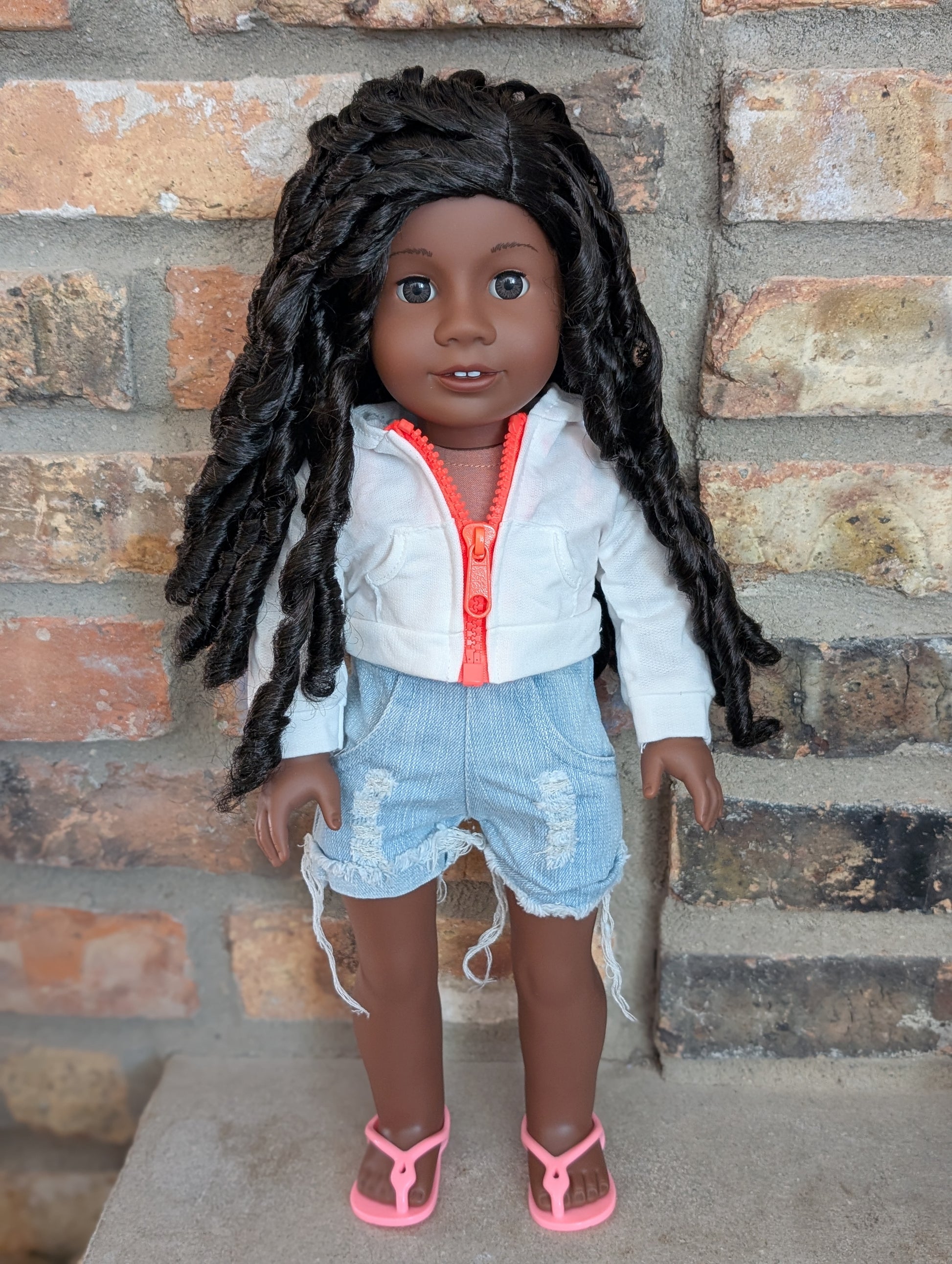 This one of a kind OOAK custom American Girl doll was created with a brand new doll, a black wig, and brown eyes. She may have some minor shine marks from handling. She comes with the outfit pictured. She has non-removable gold hoop earrings.