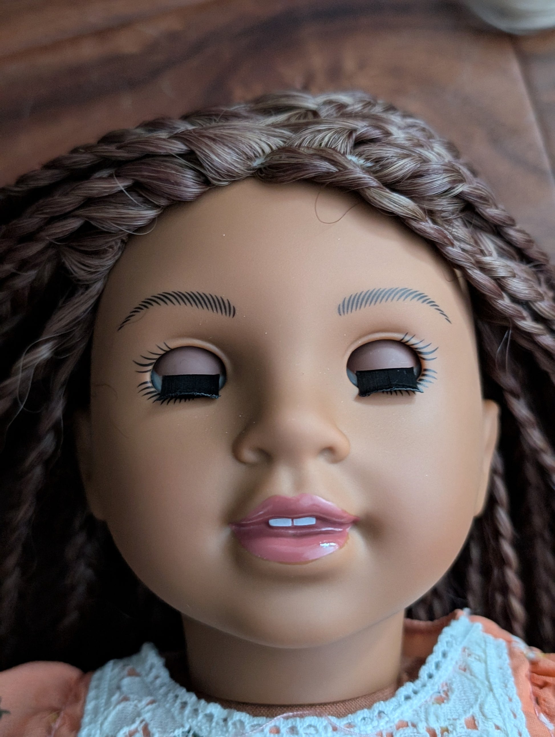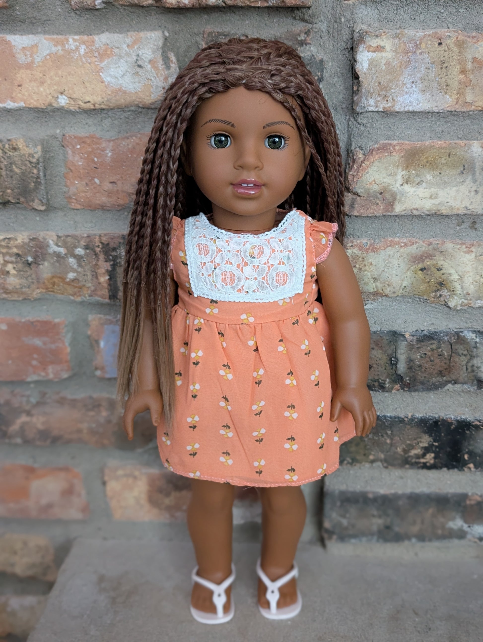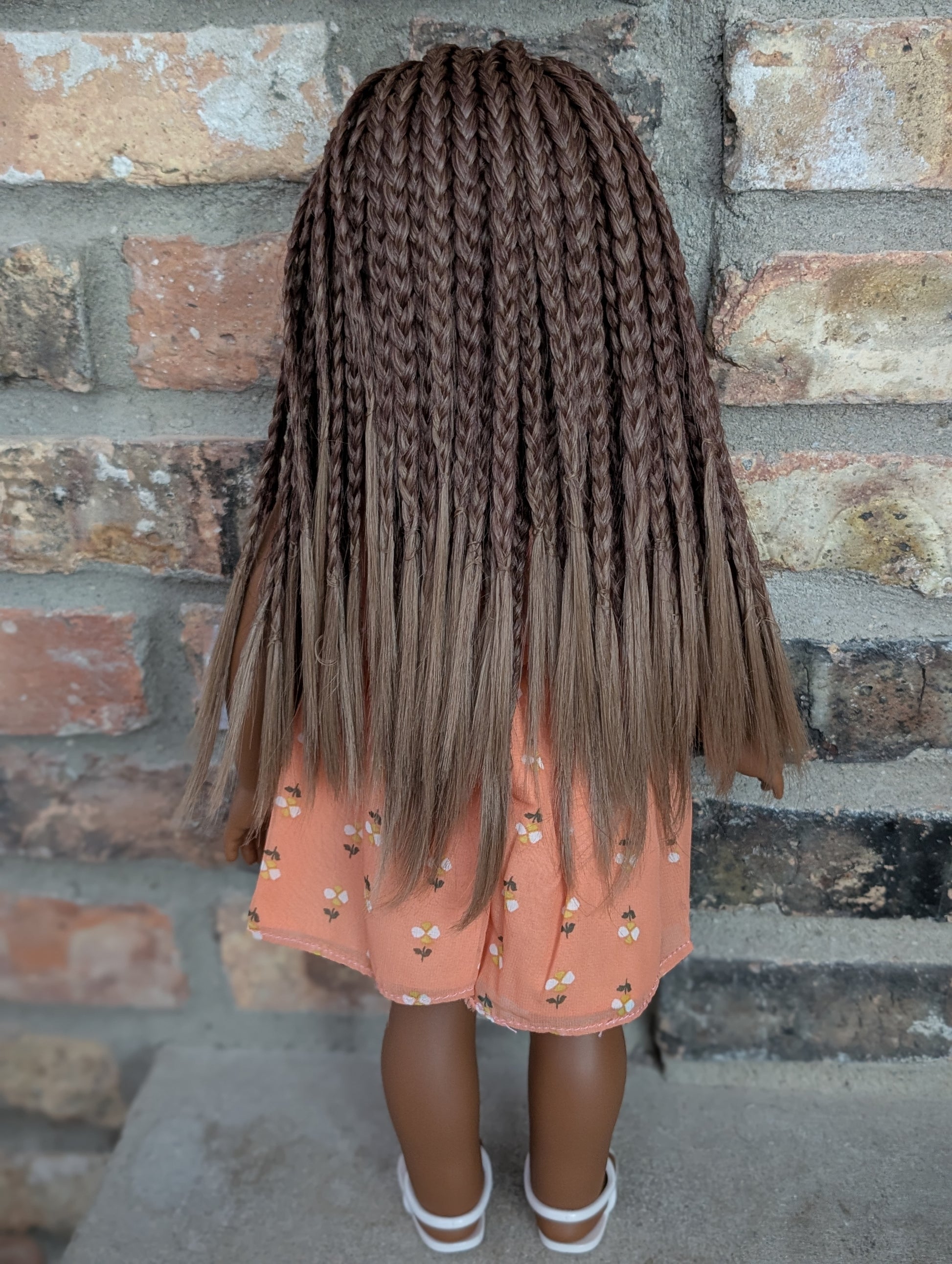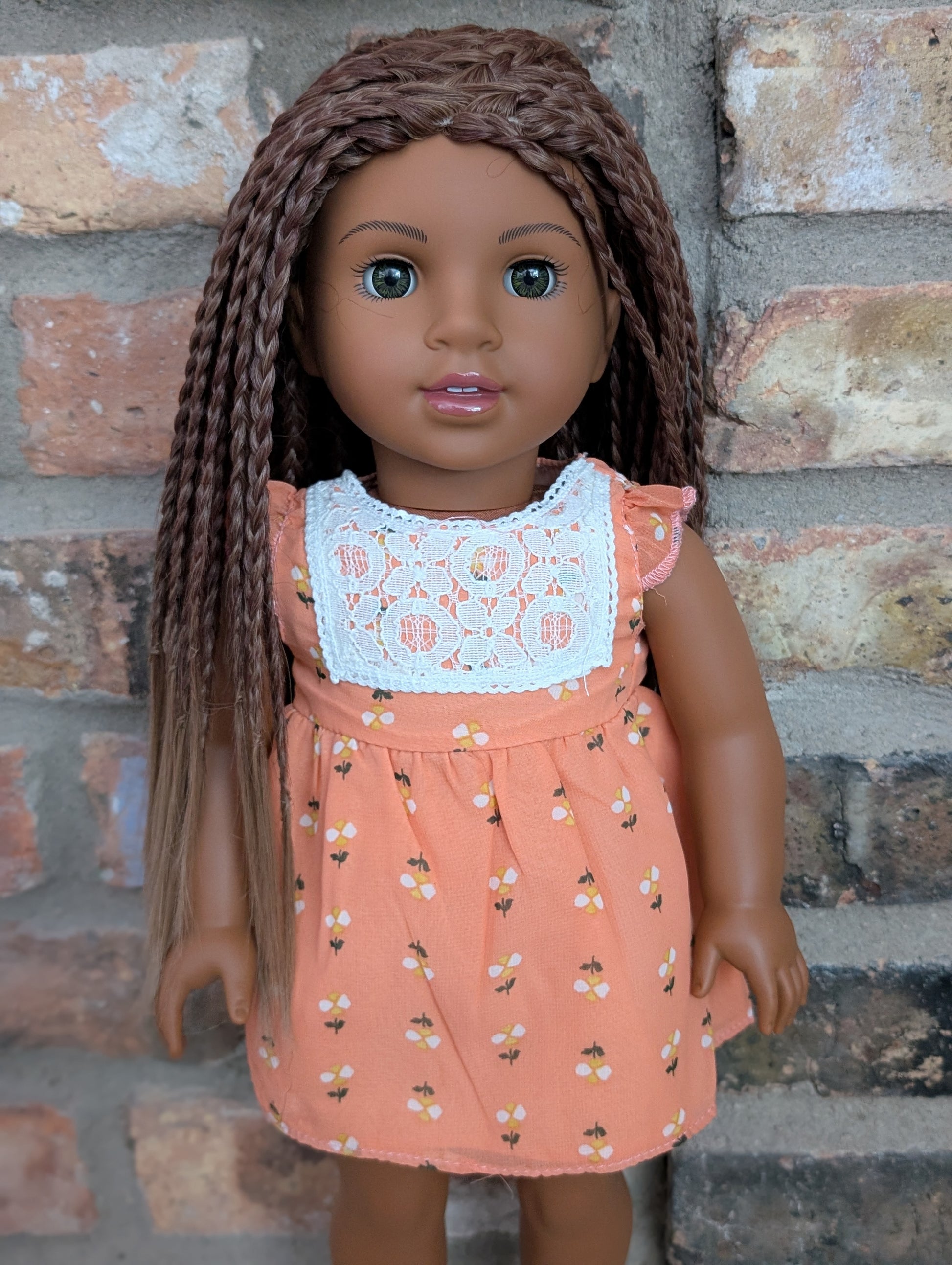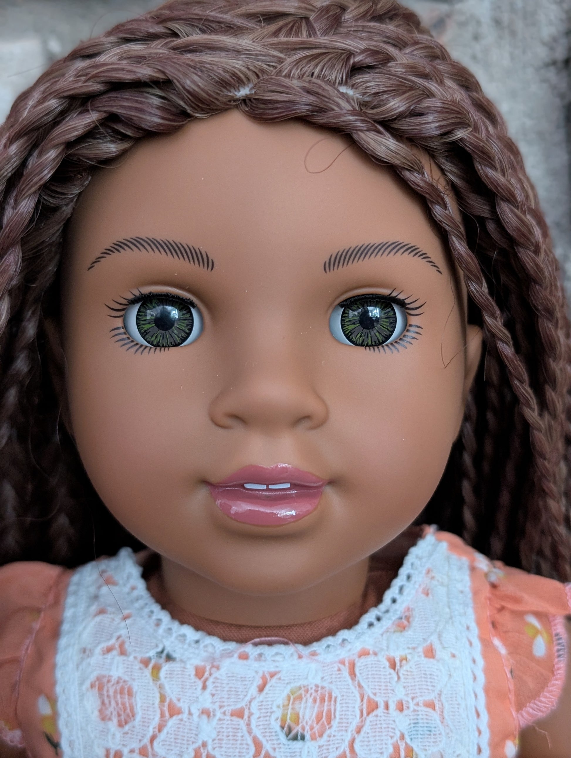 This one of a kind OOAK custom American Girl doll was created with a brand new Tiana doll, a brown wig, and hazel eyes. She has lip gloss that was hand painted and sealed. She may have some minor shine marks from handling. She comes with the outfit pictured.