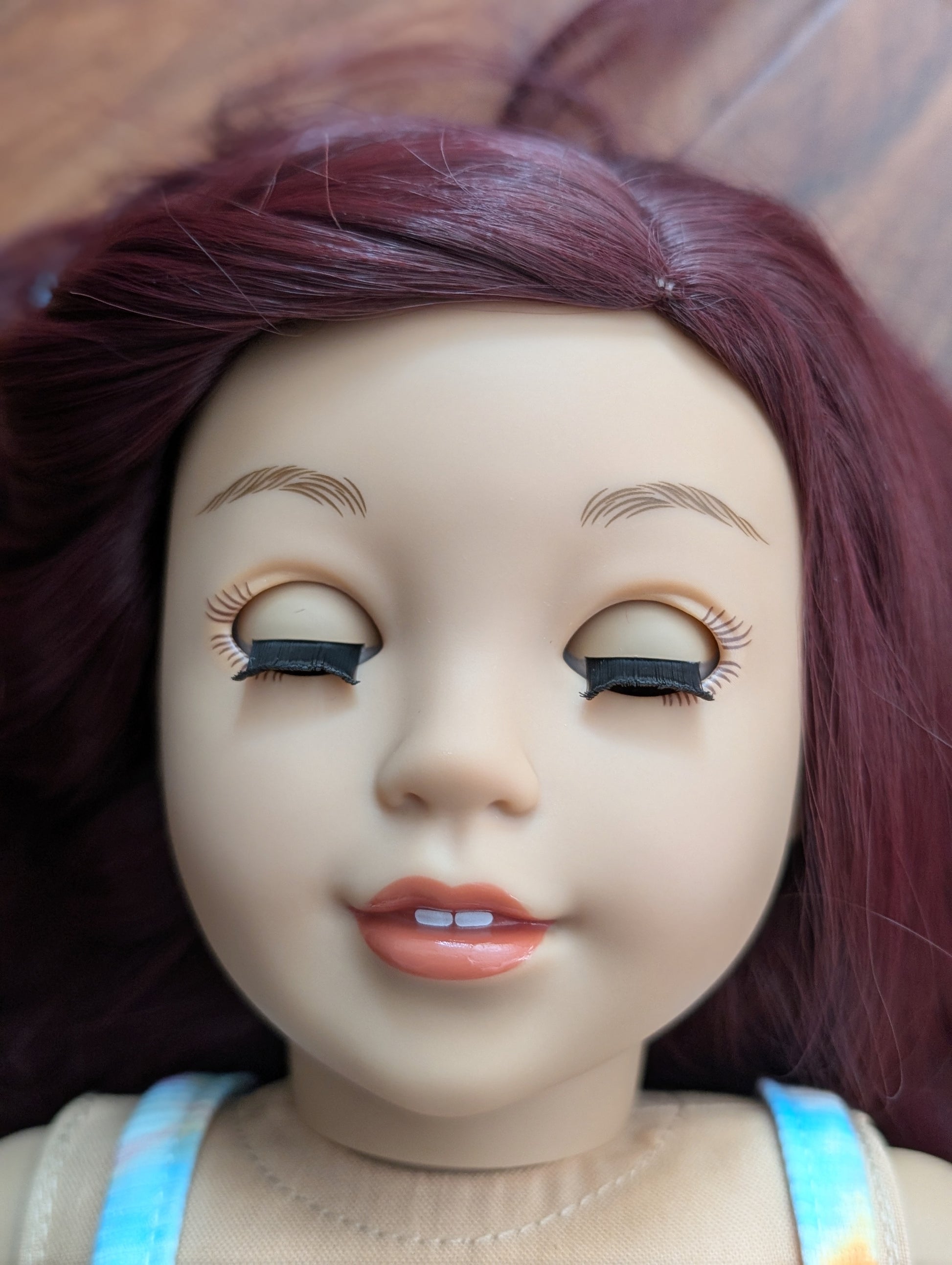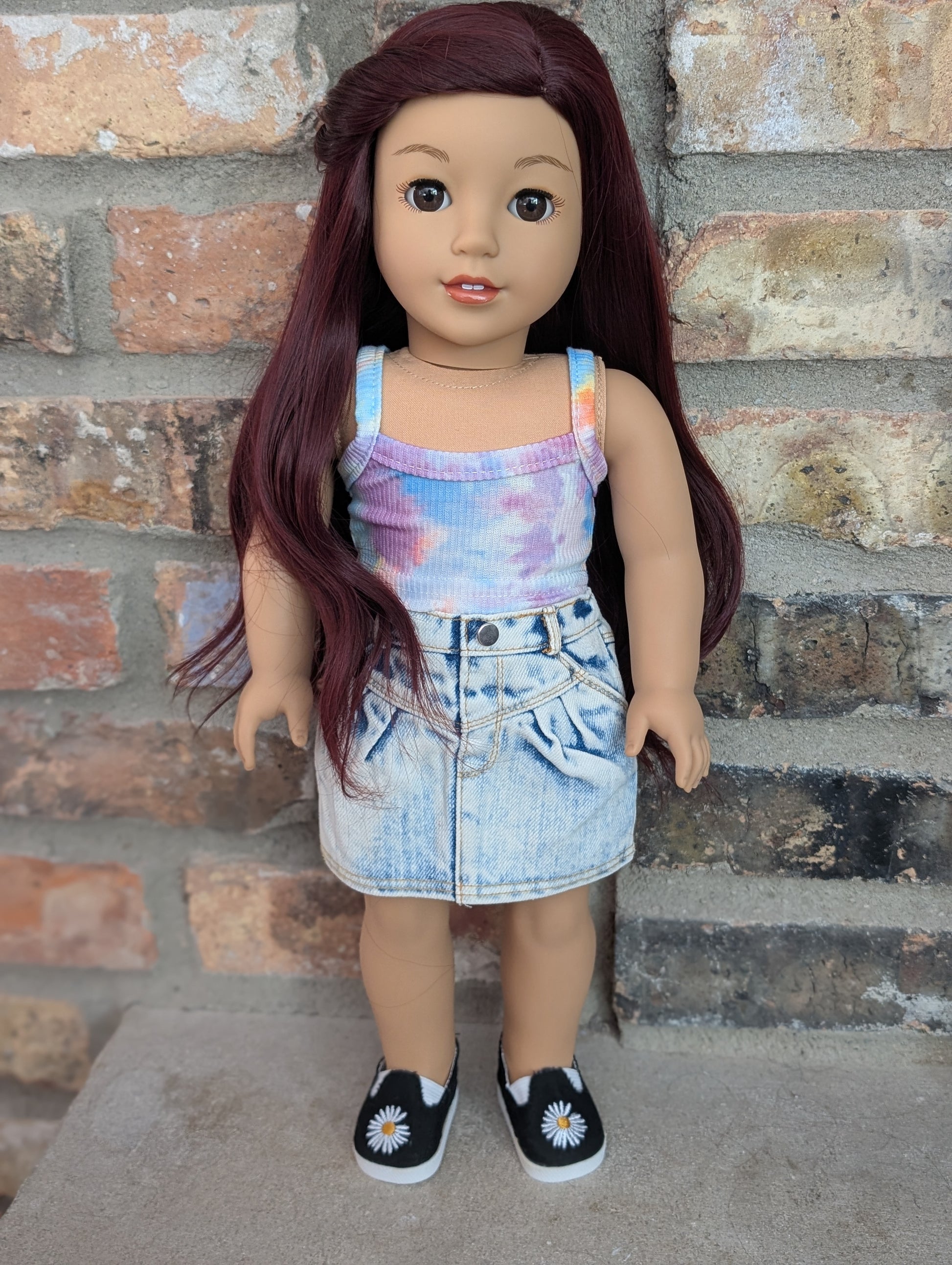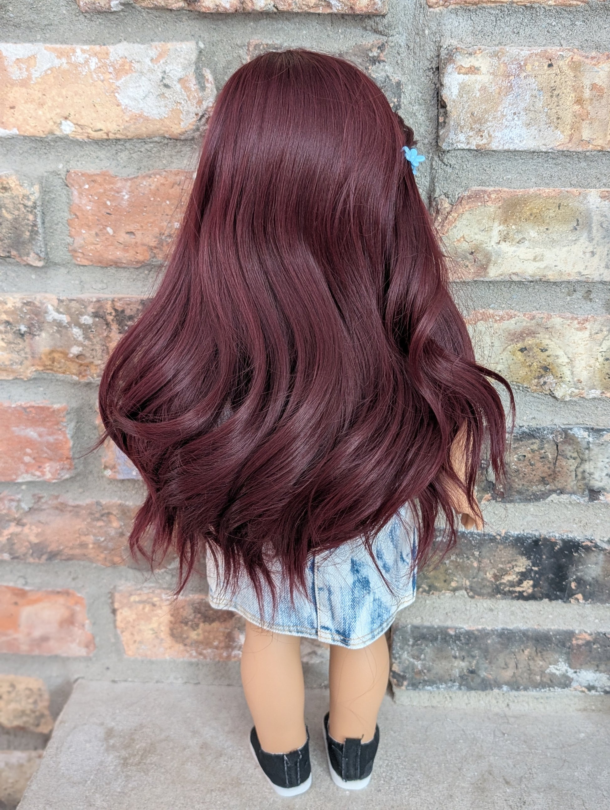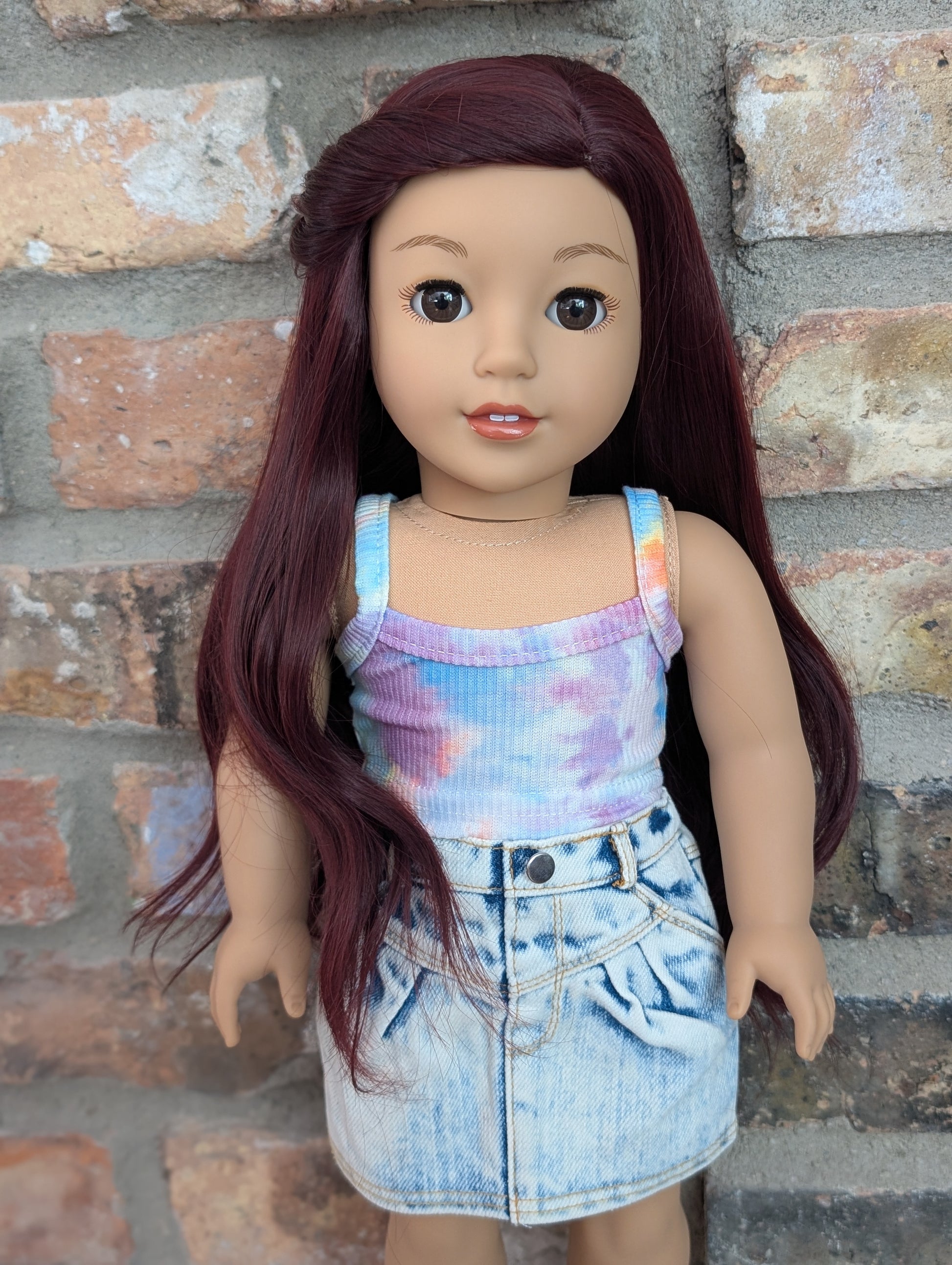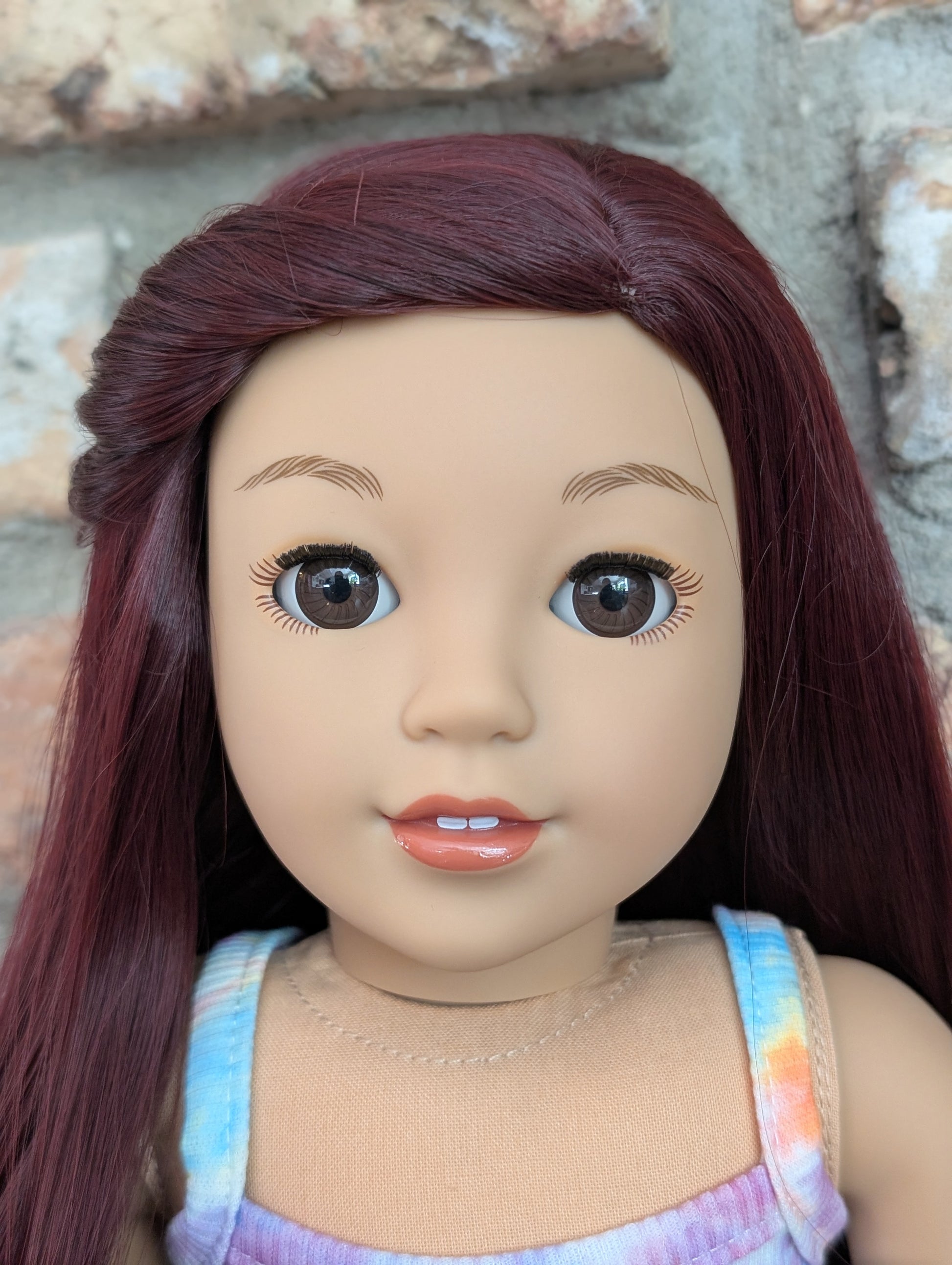 This one of a kind OOAK custom American Girl doll was created with a brand new doll, a burgundy wig, and brown eyes. She has lip gloss that was hand painted and sealed. She may have some minor shine marks from handling. She comes with the outfit pictured.
