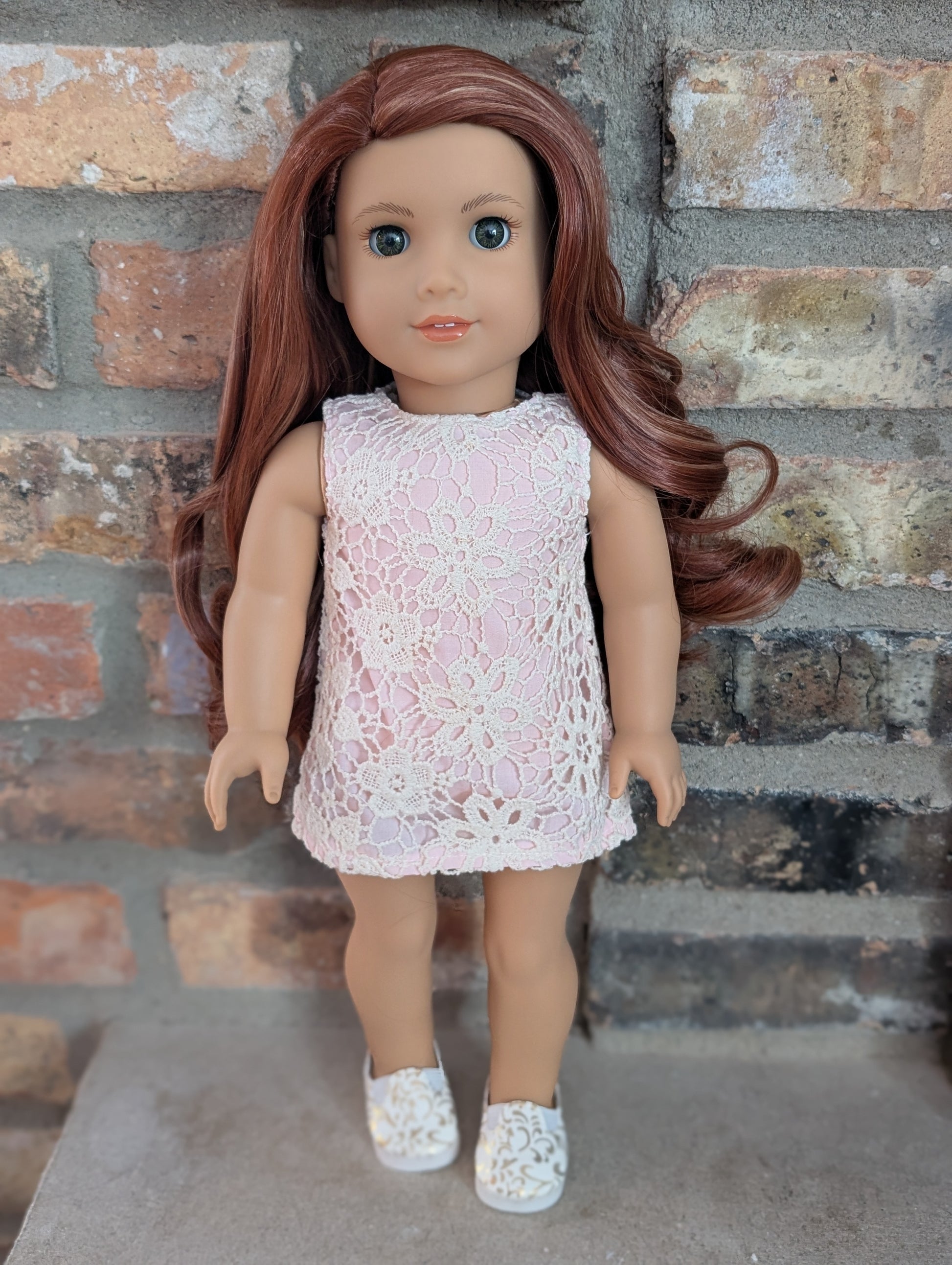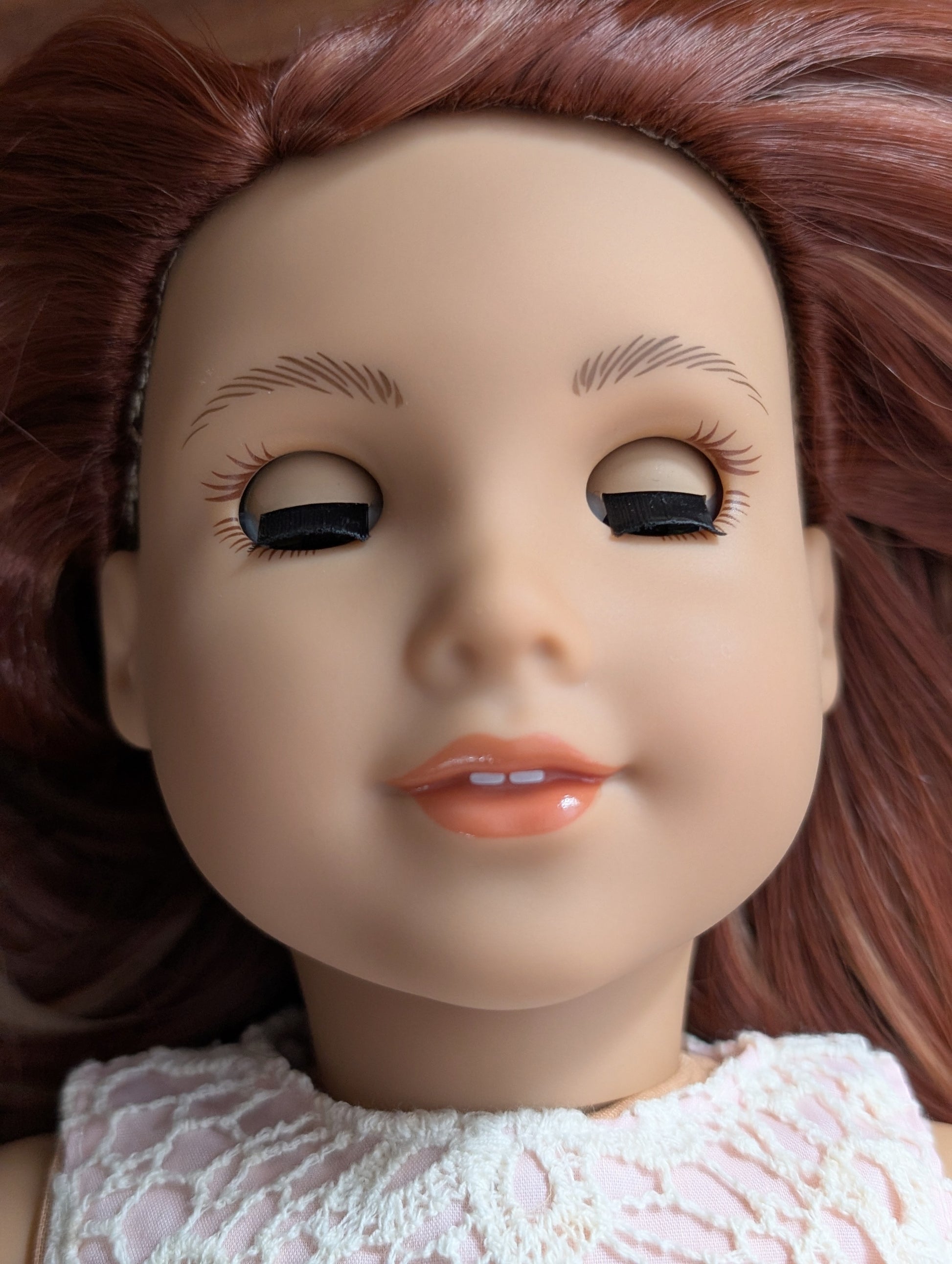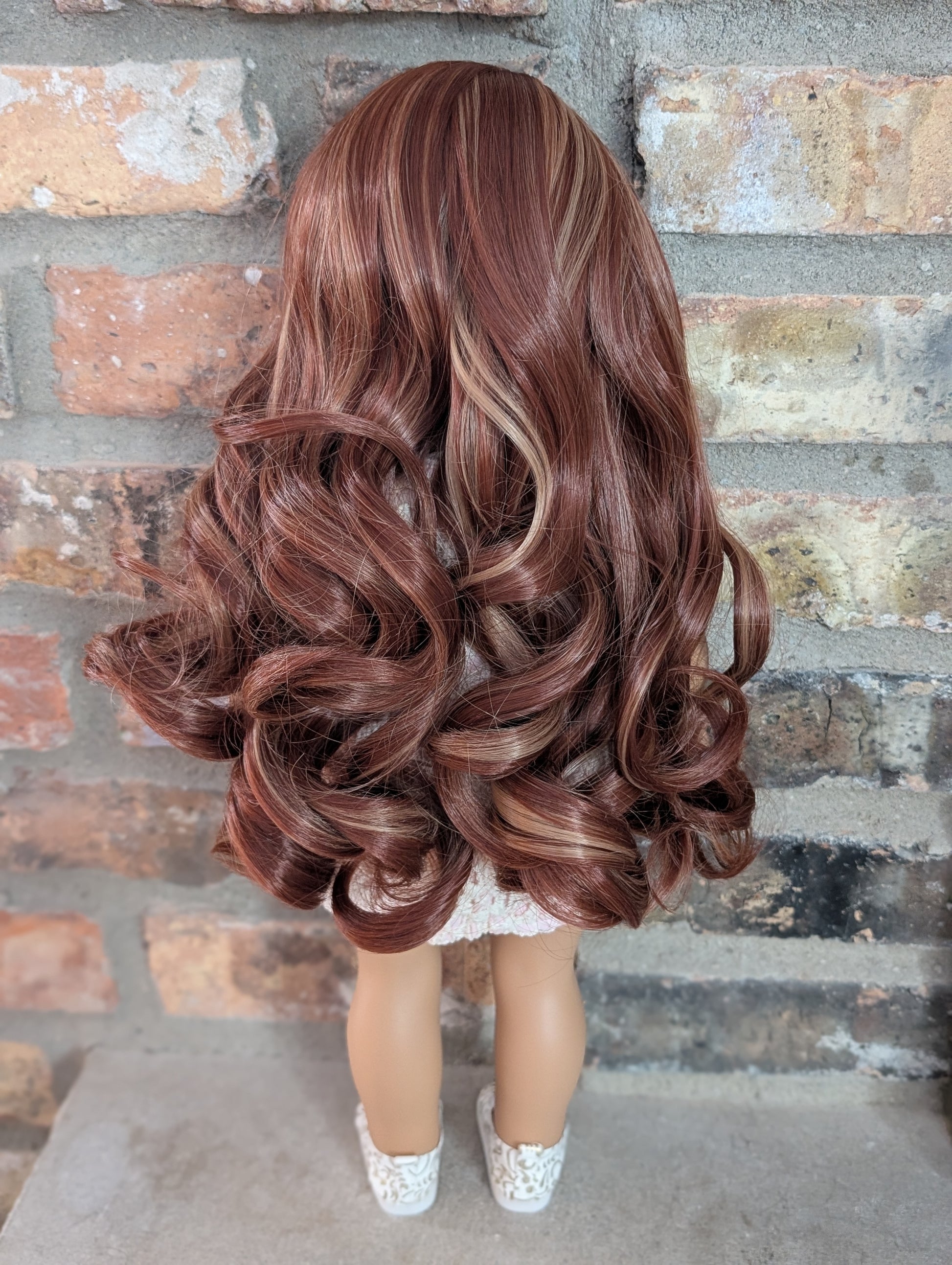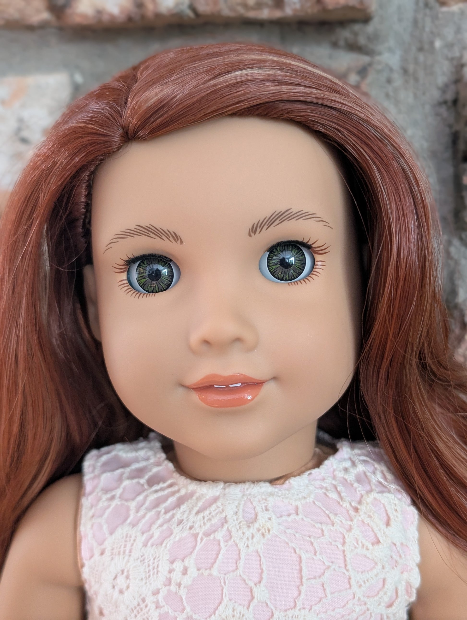 This one of a kind OOAK custom American Girl doll was created with a brand new doll, a red wig, and hazel eyes. She has lip gloss that was hand painted and sealed. She may have some minor shine marks from handling. She comes with the outfit pictured.