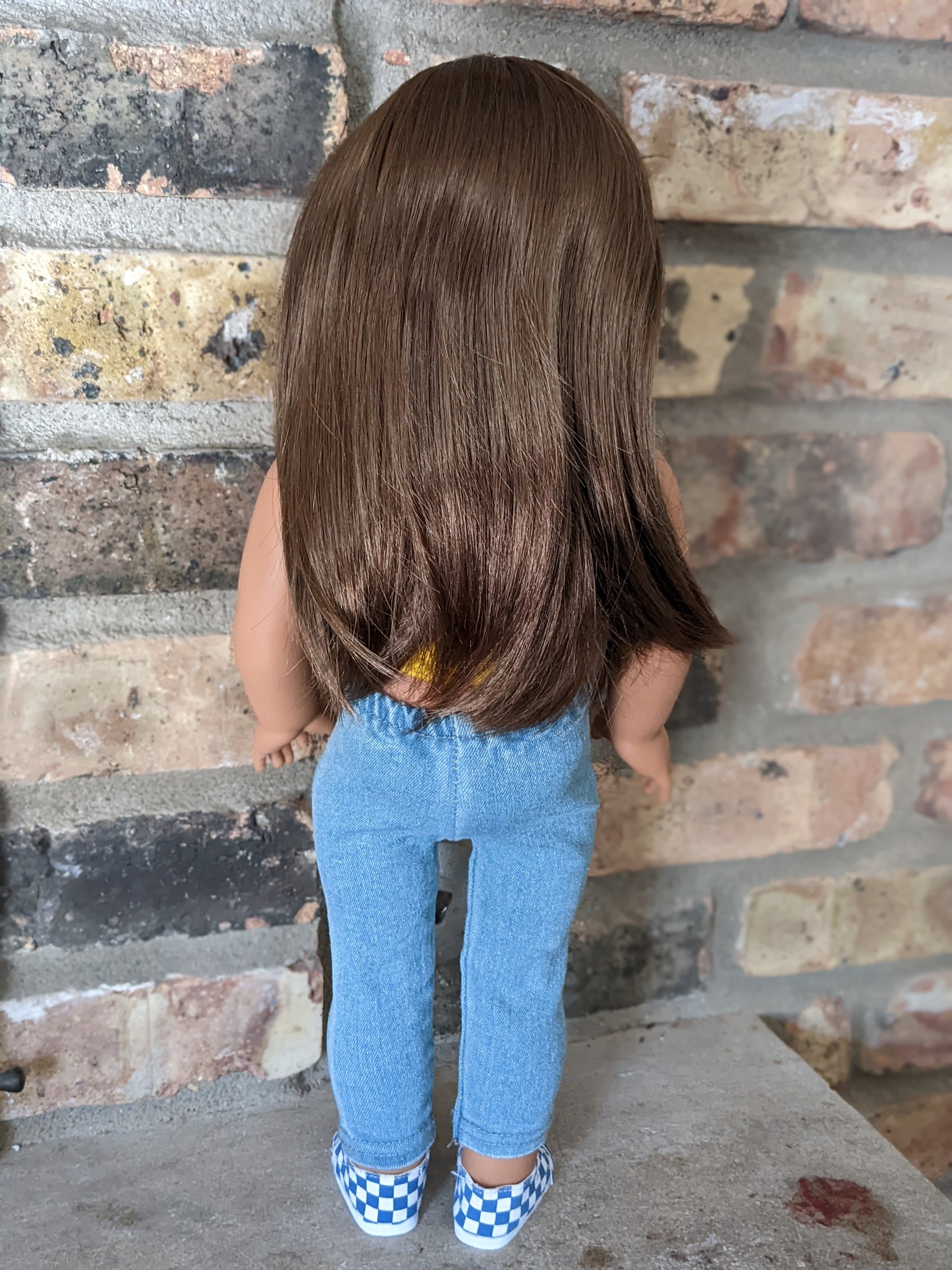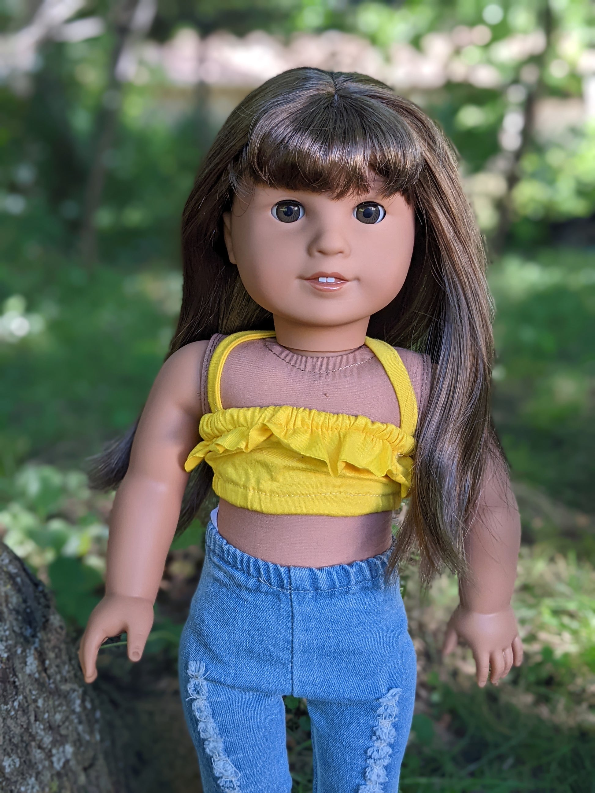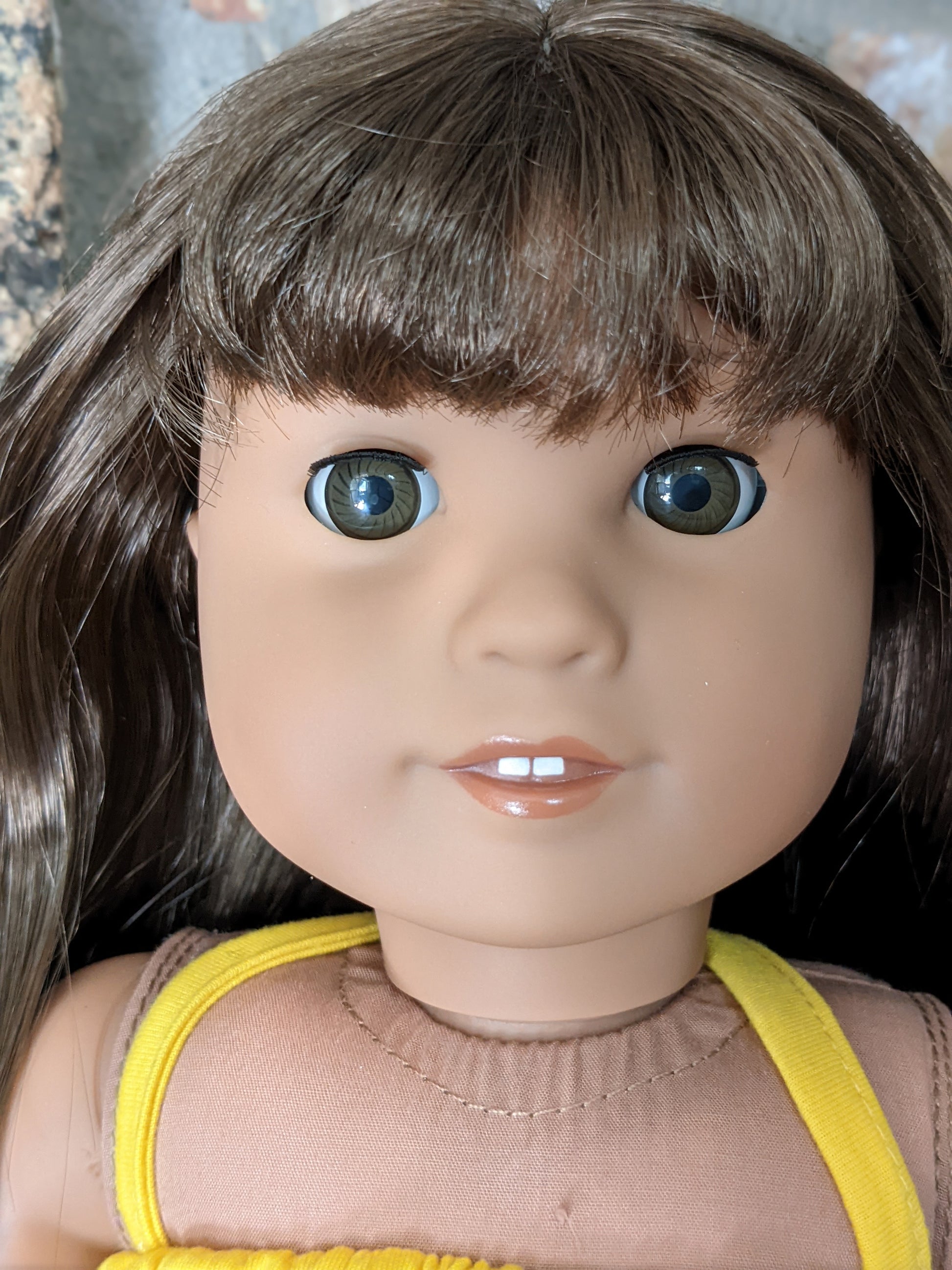 This one of a kind OOAK custom American Girl doll was created with a brand new Truly Me doll, a brown wig from a new TM doll, and amber eyes. She has lip gloss that was hand painted and sealed. She may have some minor shine marks from handling. She comes with the outfit pictured. She has the microfiber cloth body.