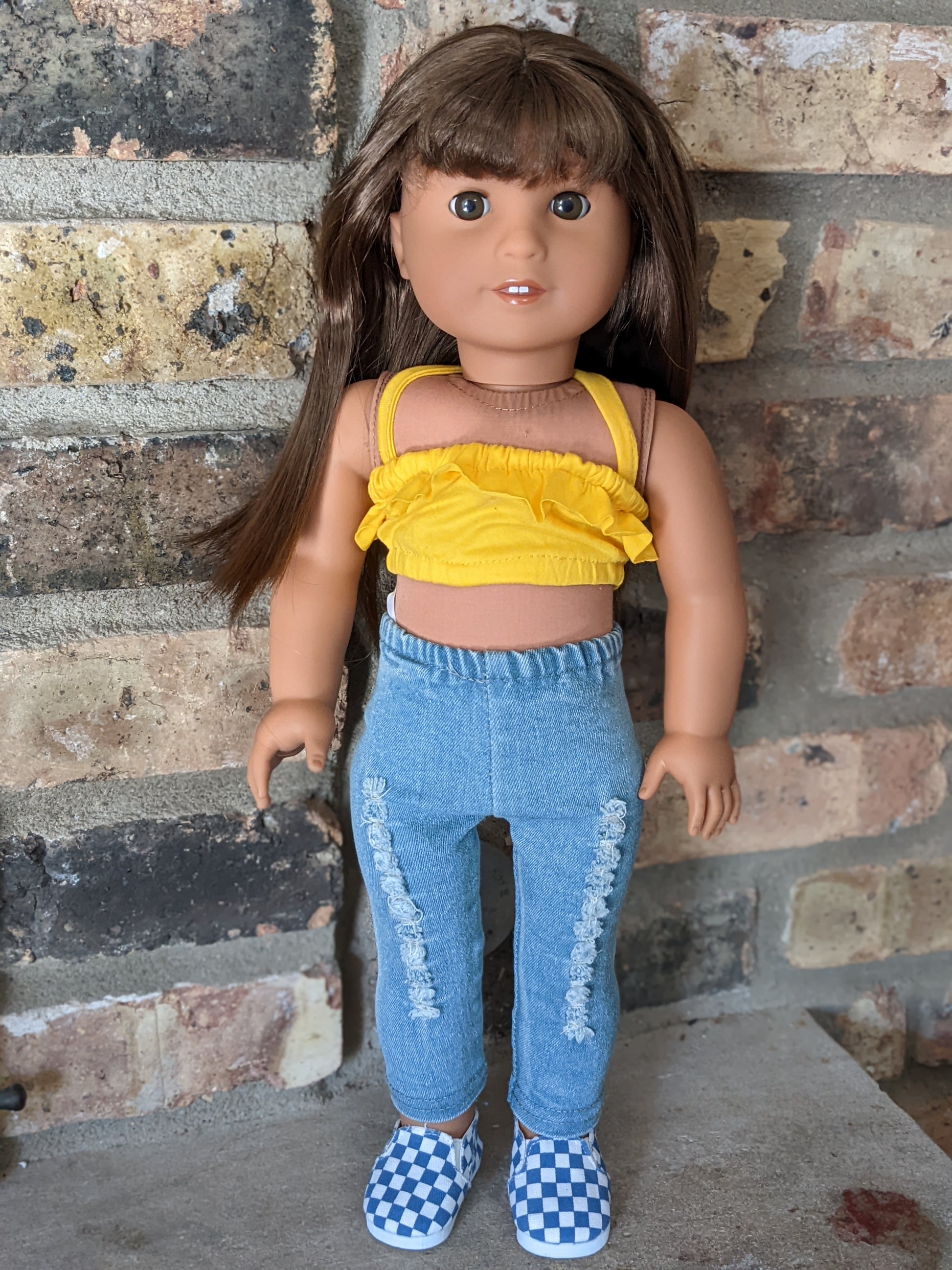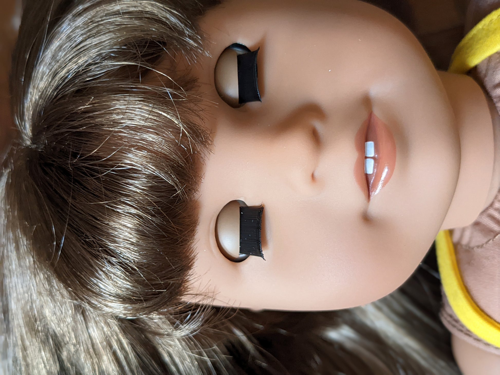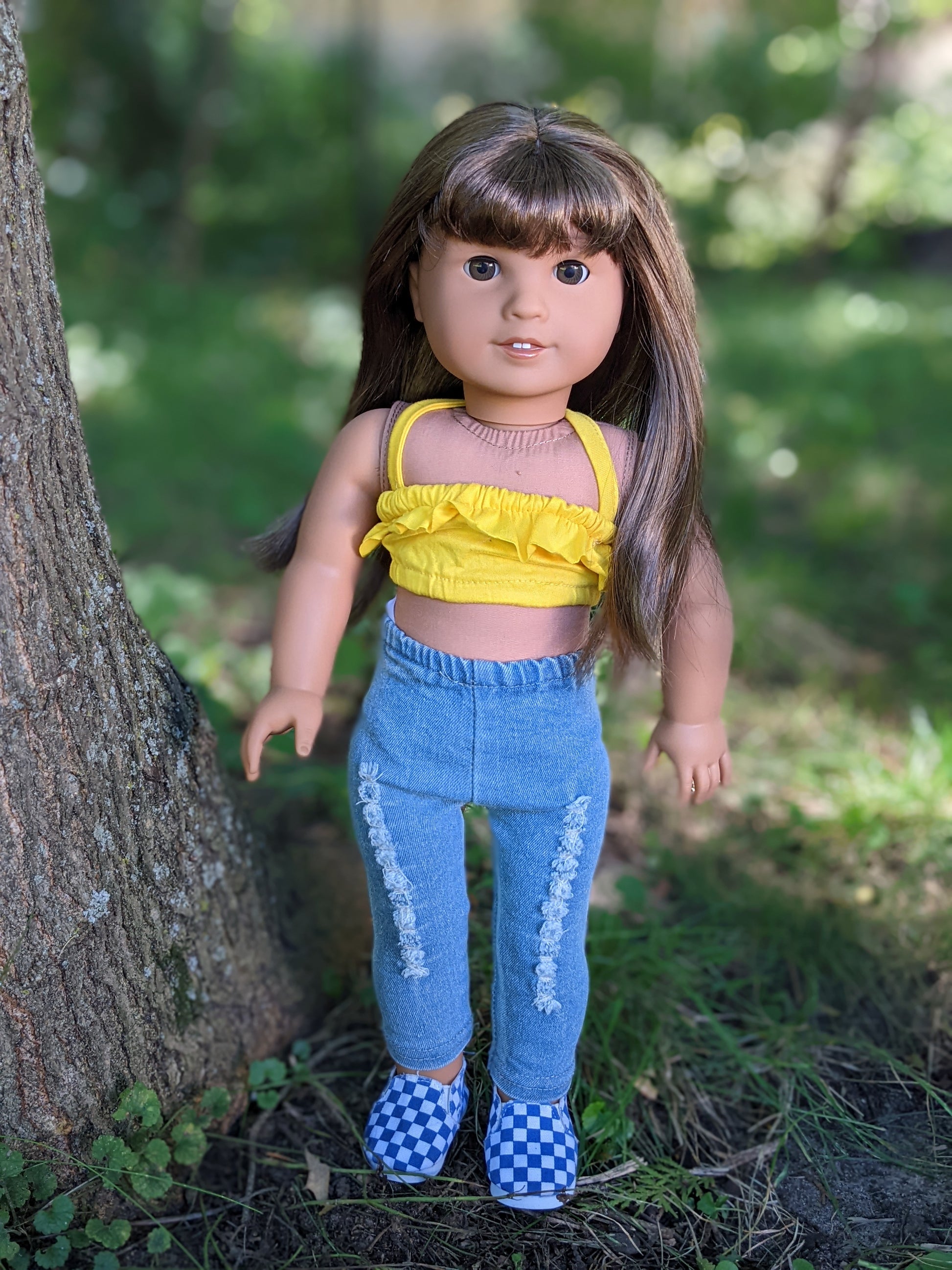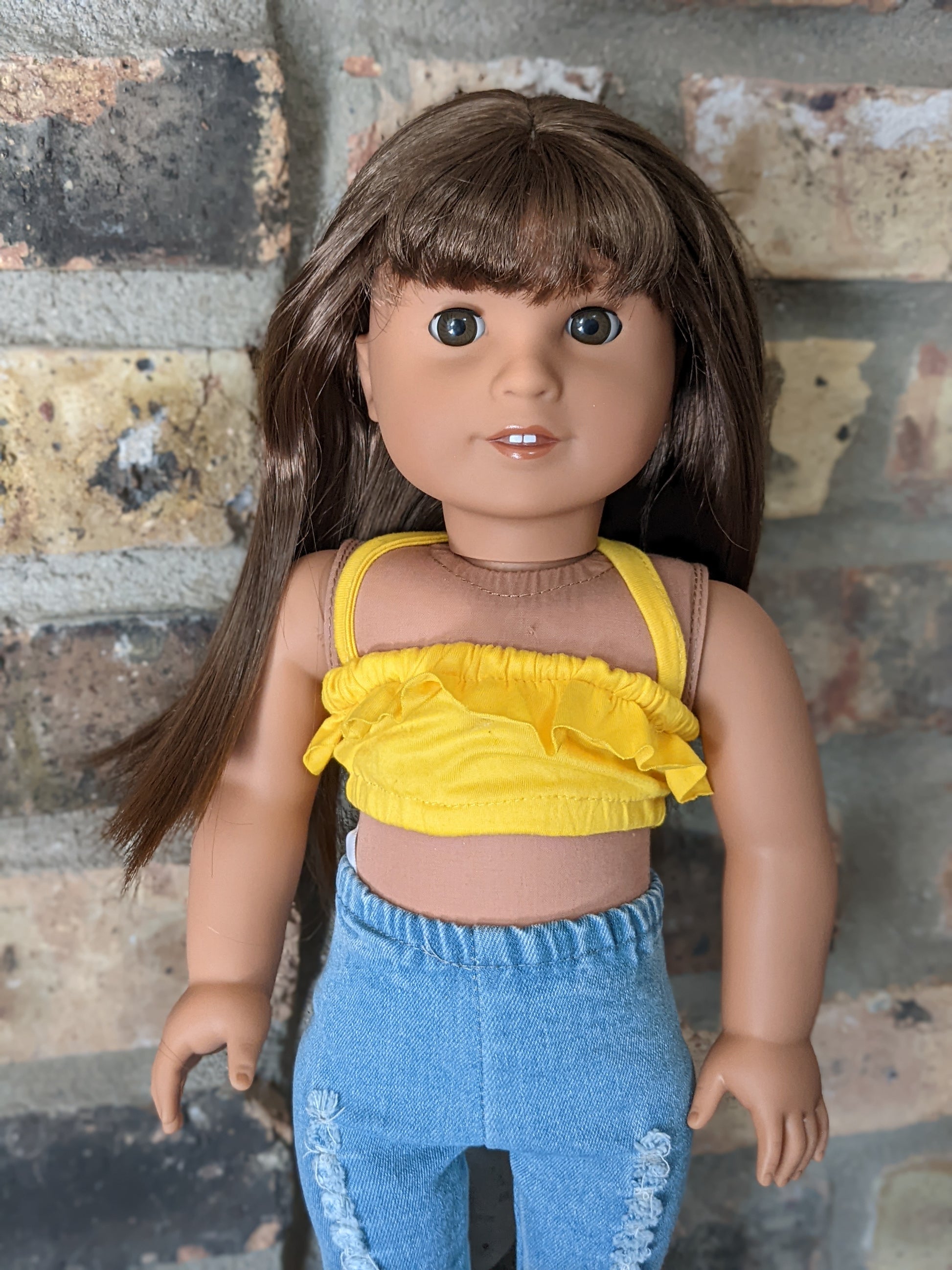This one of a kind OOAK custom American Girl doll was created with a brand new Truly Me doll, a brown wig from a new TM doll, and amber eyes. She has lip gloss that was hand painted and sealed. She may have some minor shine marks from handling. She comes with the outfit pictured. She has the microfiber cloth body.