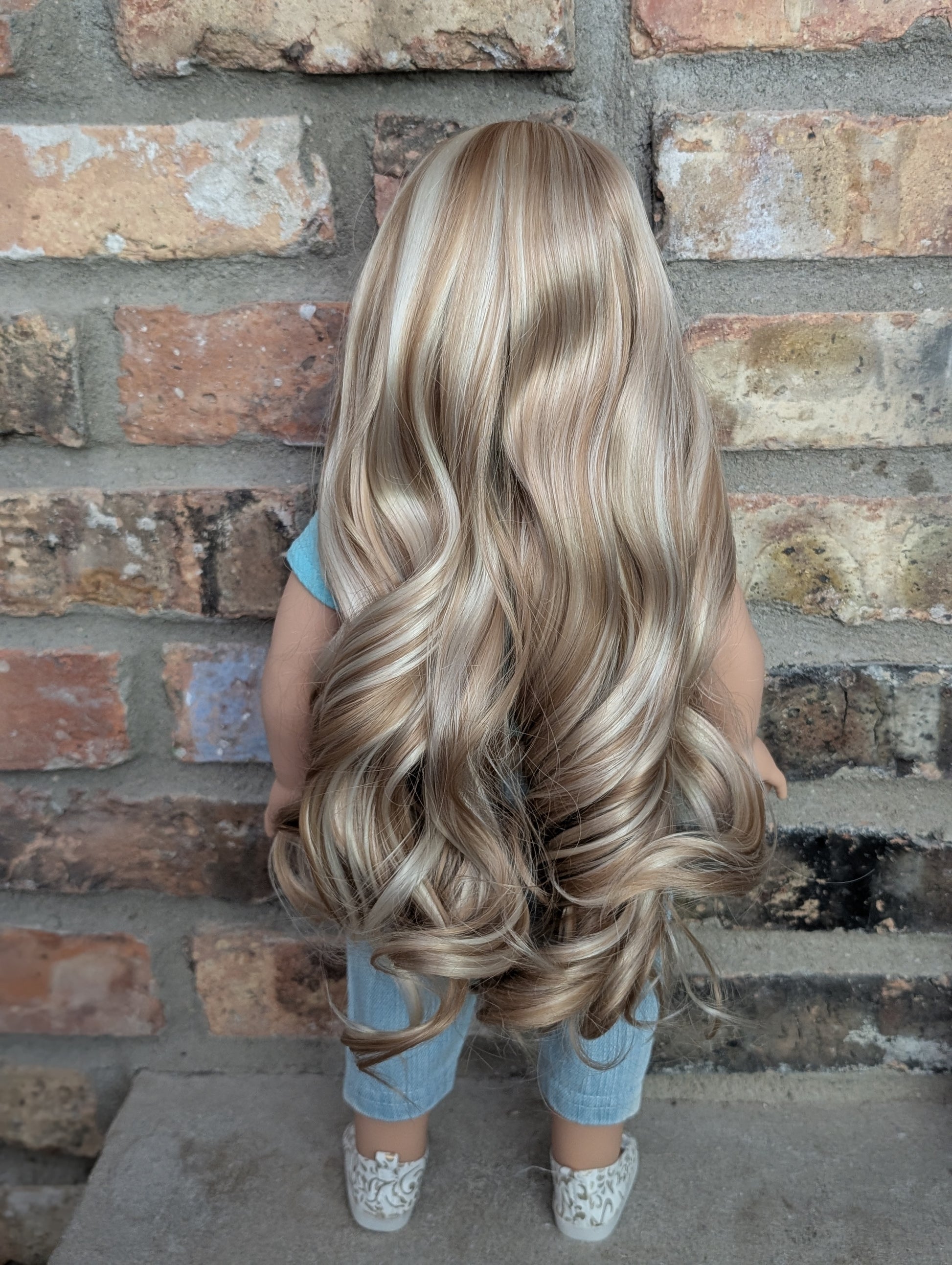 This one of a kind OOAK custom American Girl doll was created with a brand new doll, a blonde wig, and amber eyes. She has lip gloss and freckles that were hand painted and sealed. She may have some minor shine marks from handling. She comes with the outfit pictured.