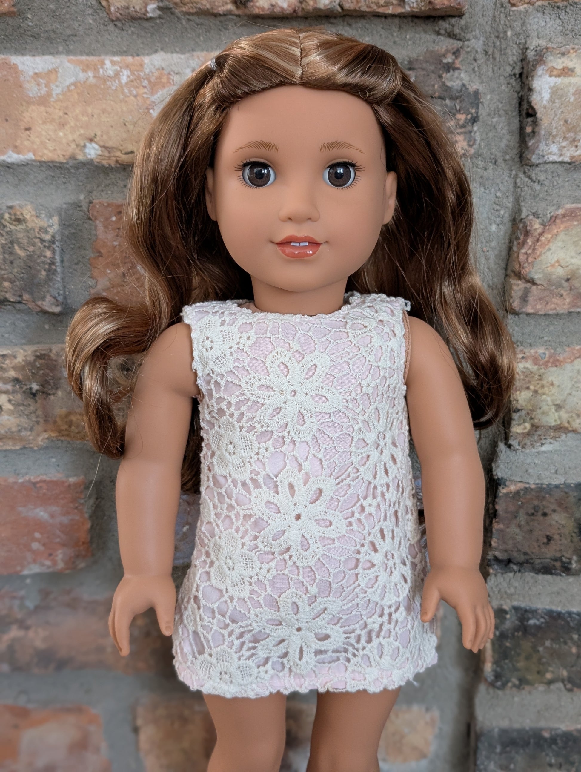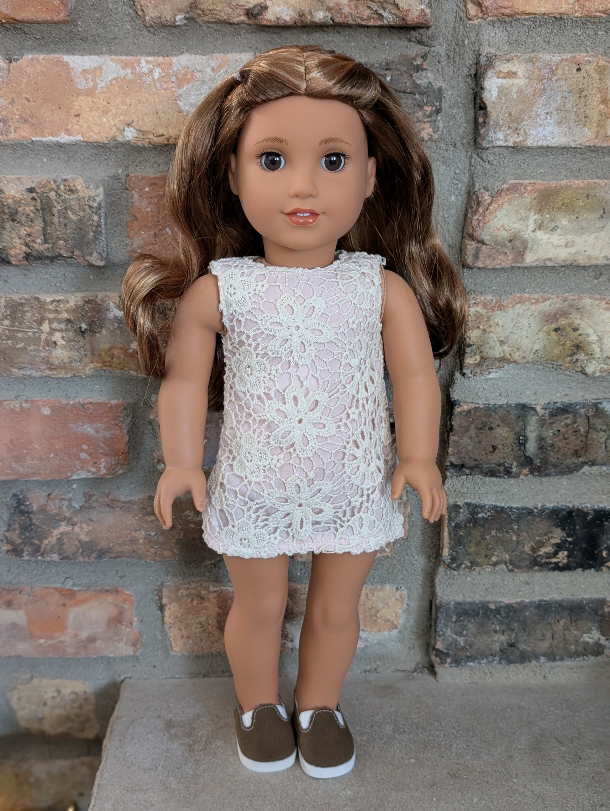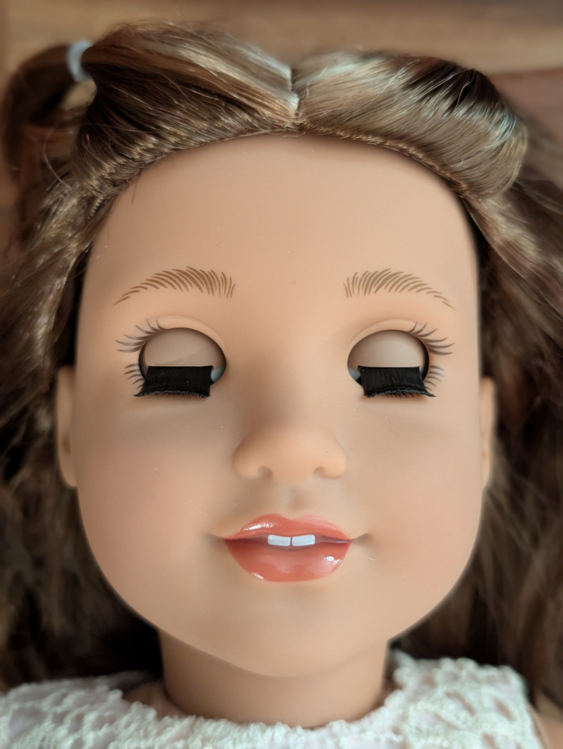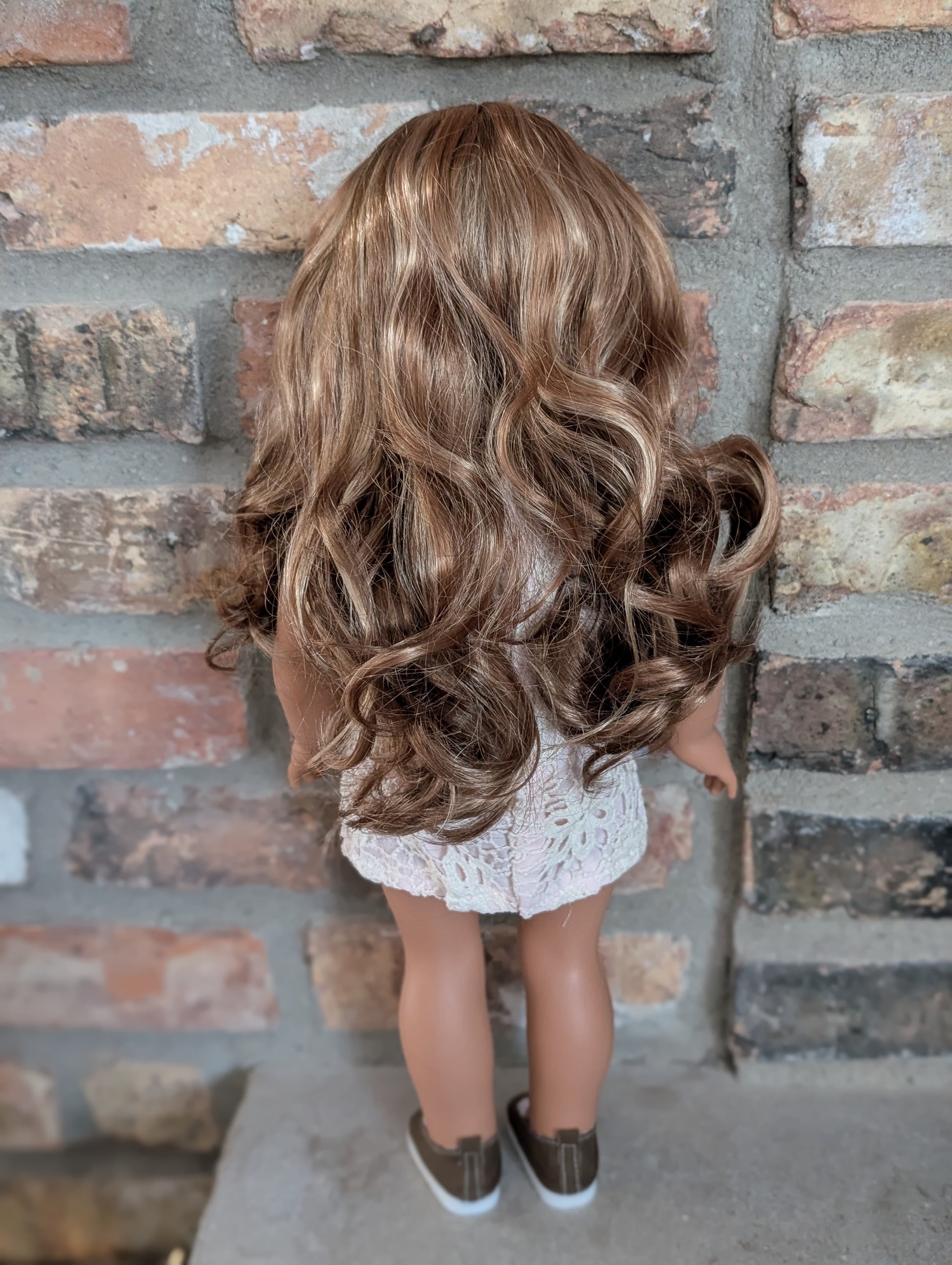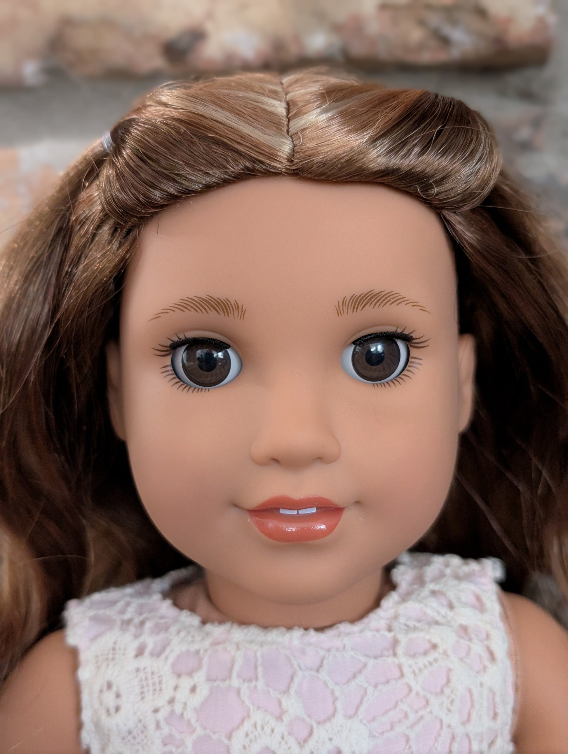 This one of a kind OOAK custom American Girl doll was created with a brand new doll, a brown wig, and brown eyes. She has lip gloss that was hand painted and sealed. She may have some minor shine marks from handling. She comes with the outfit pictured.