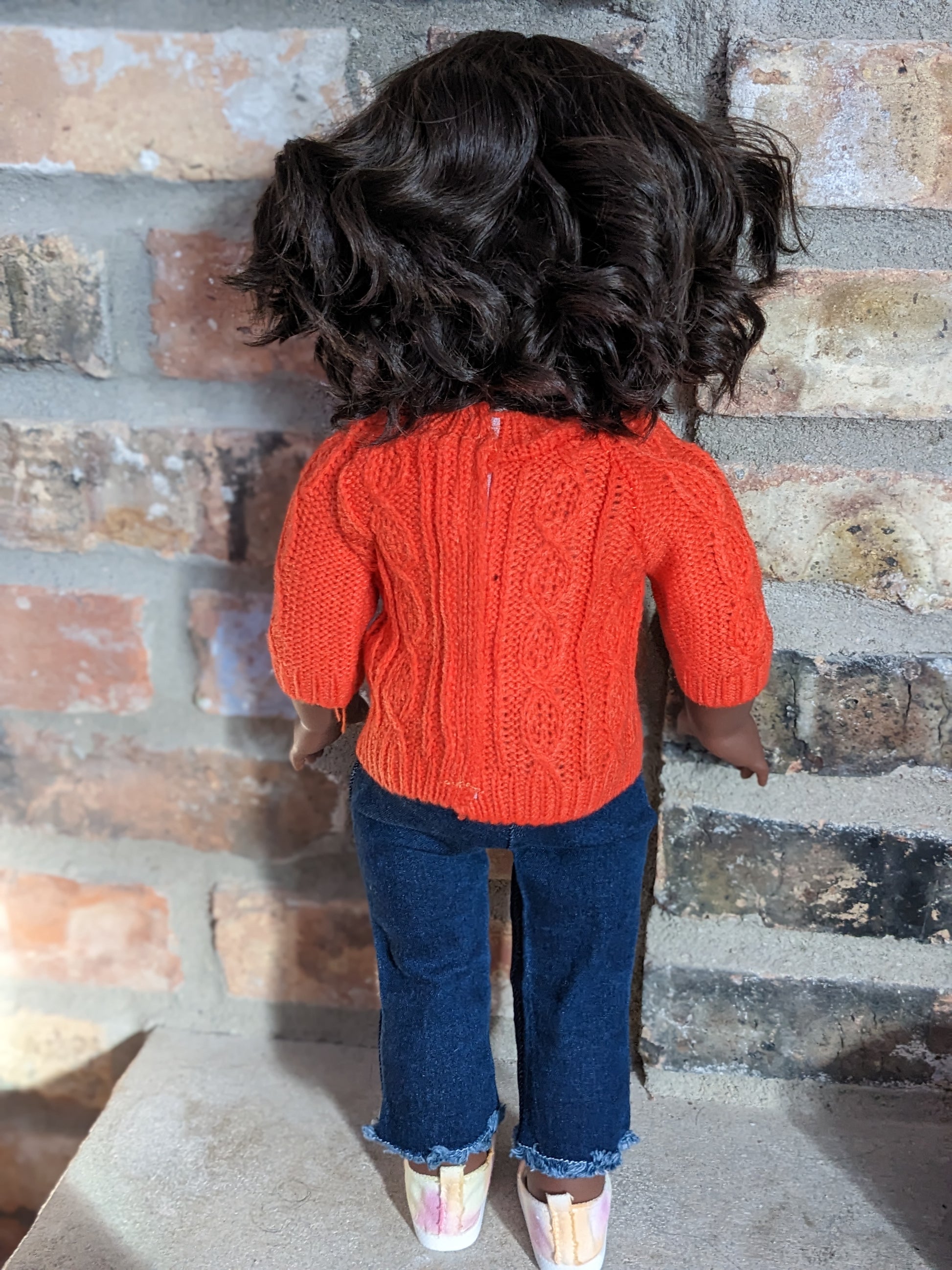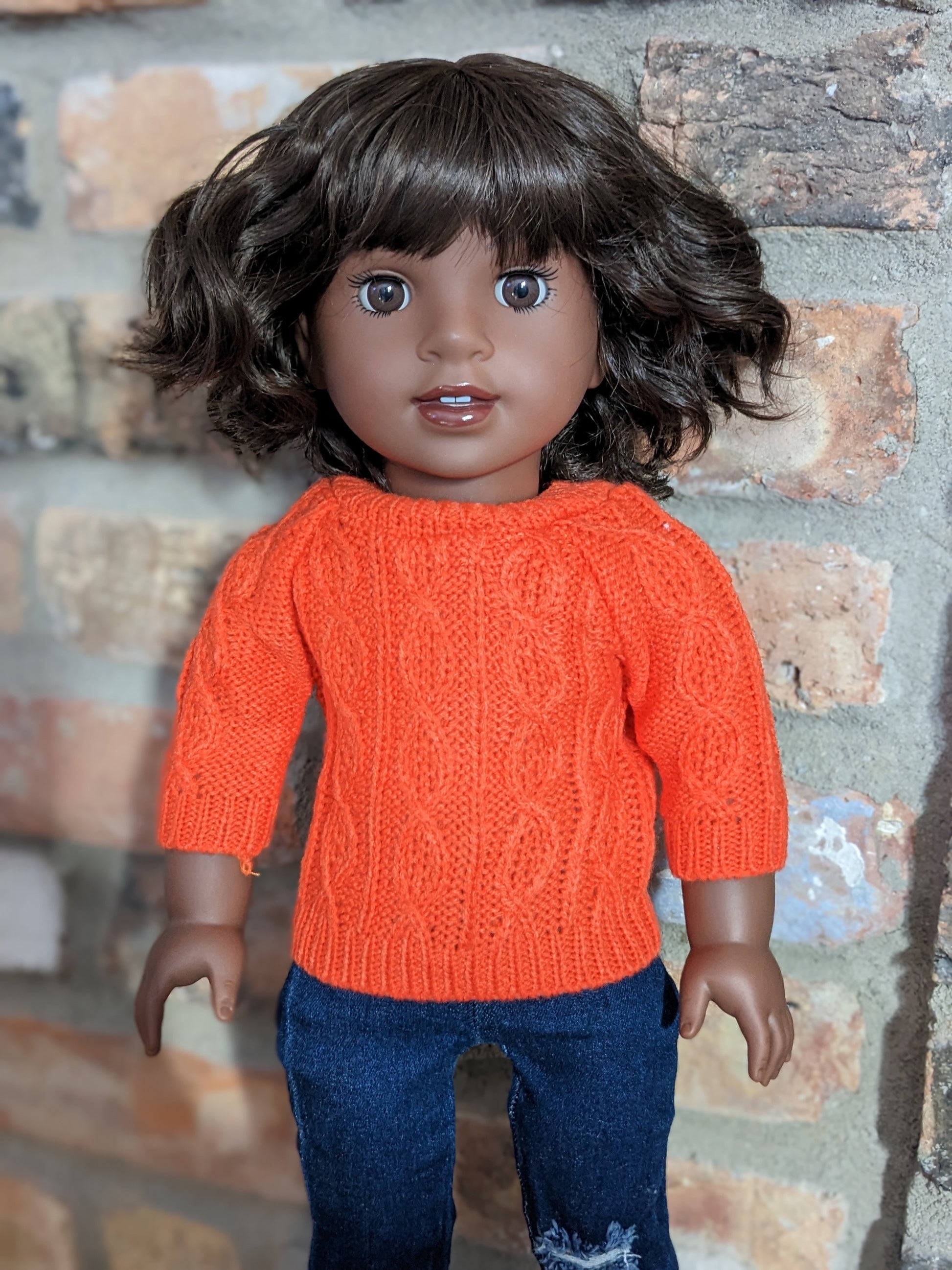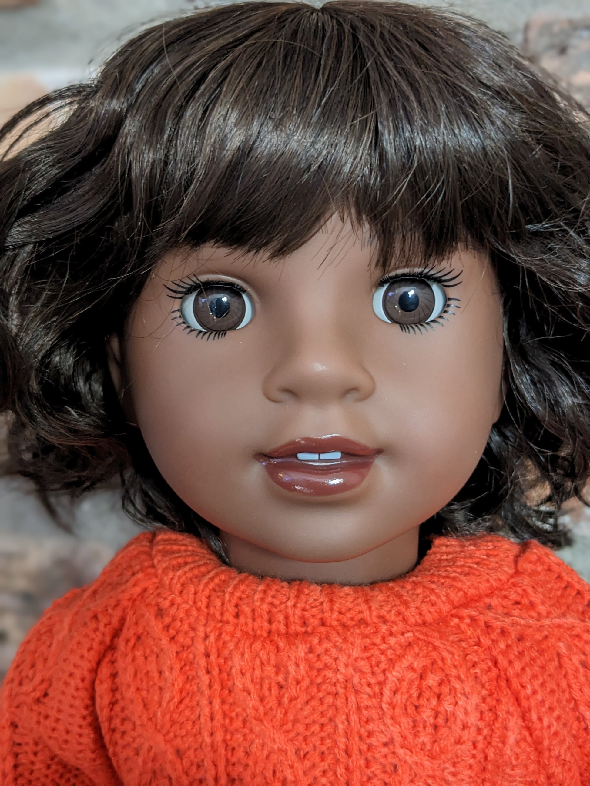 This one of a kind OOAK custom American Girl doll was created with a new doll, a dark brown wig, and brown pinwheel eyes. She has lip gloss that was hand painted and sealed. She may have some minor shine marks from handling. She comes with the outfit pictured.