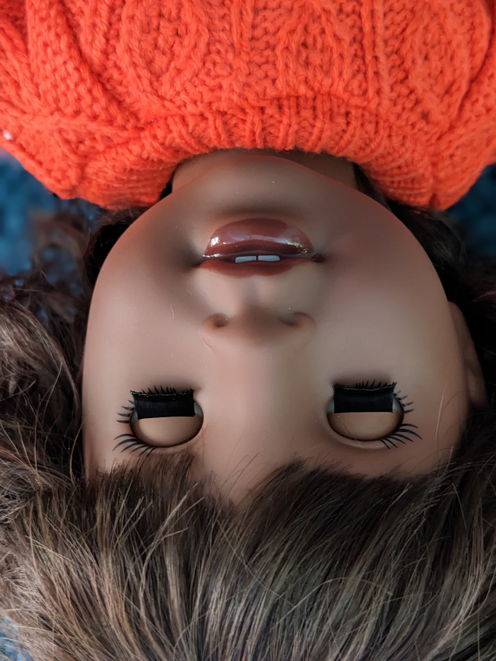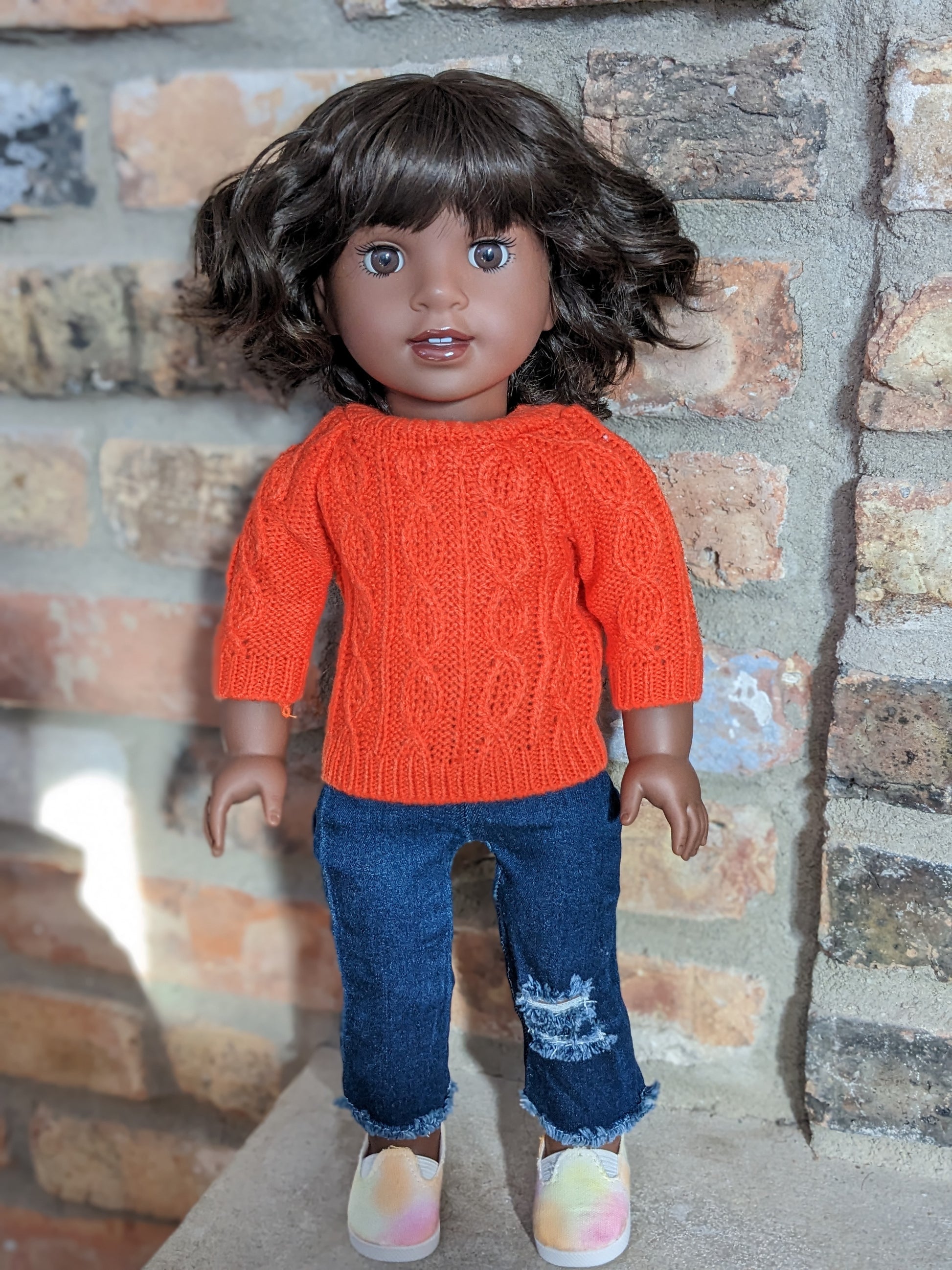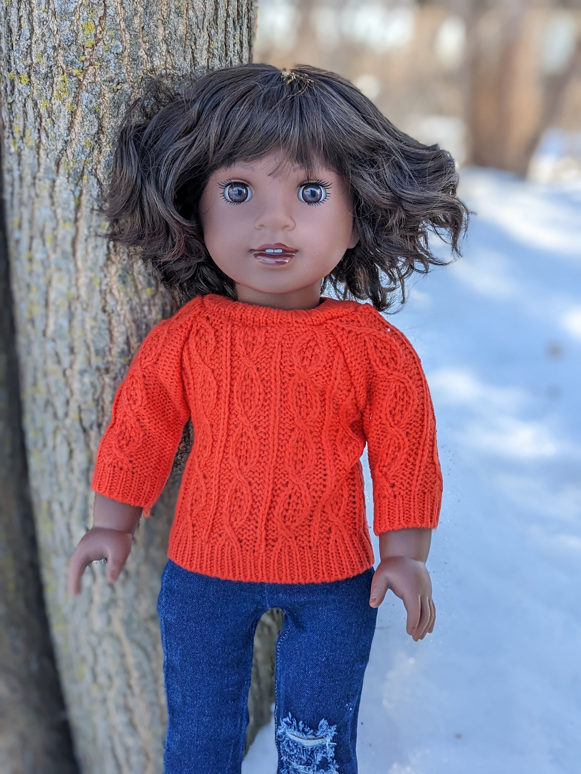 This one of a kind OOAK custom American Girl doll was created with a new doll, a dark brown wig, and brown pinwheel eyes. She has lip gloss that was hand painted and sealed. She may have some minor shine marks from handling. She comes with the outfit pictured.
