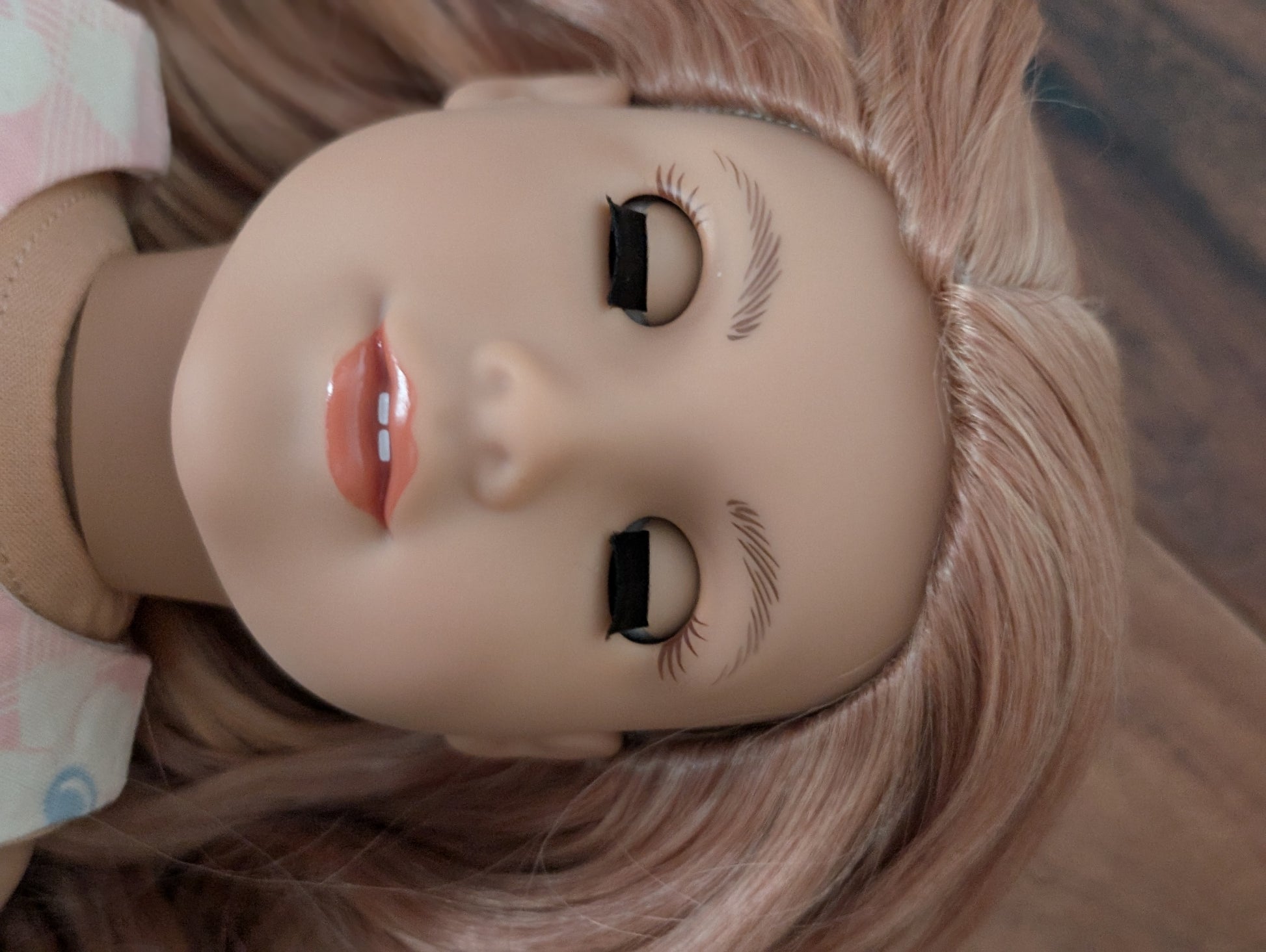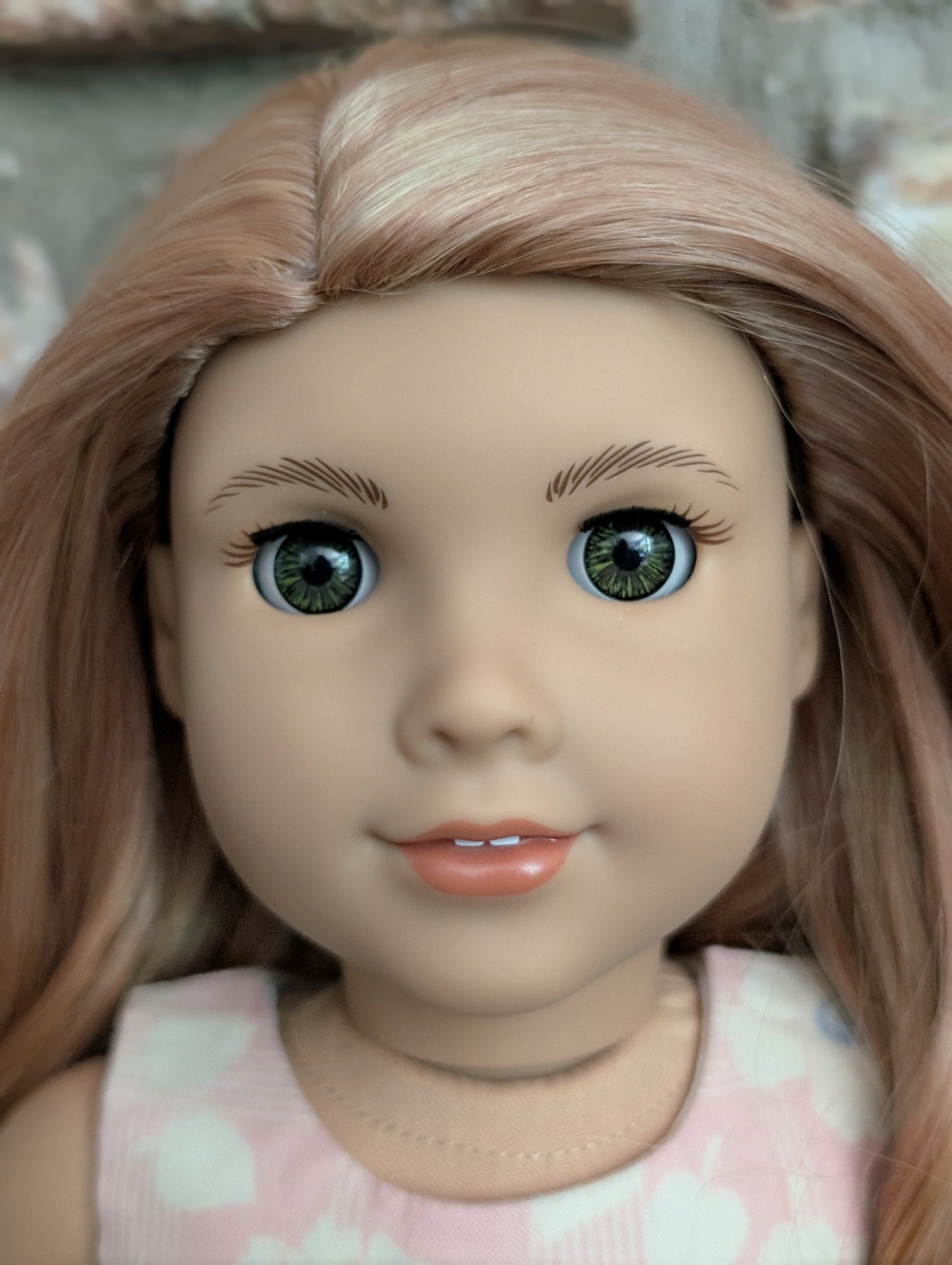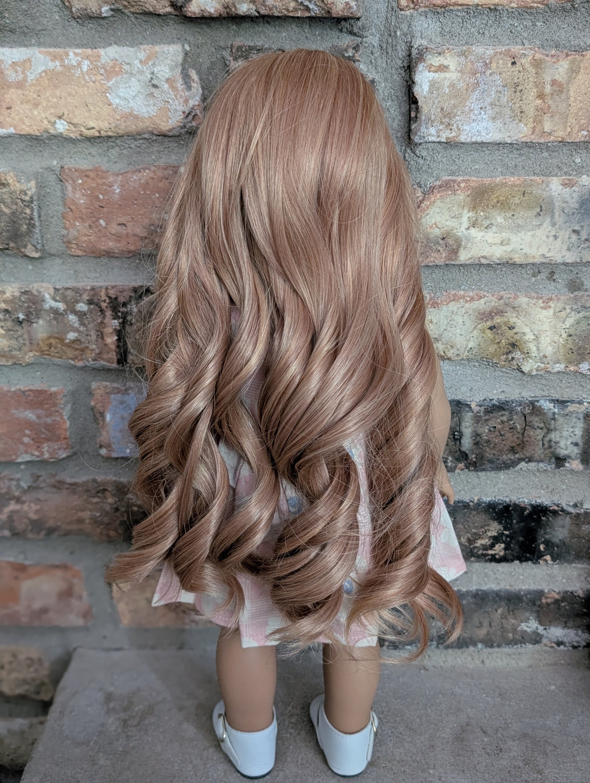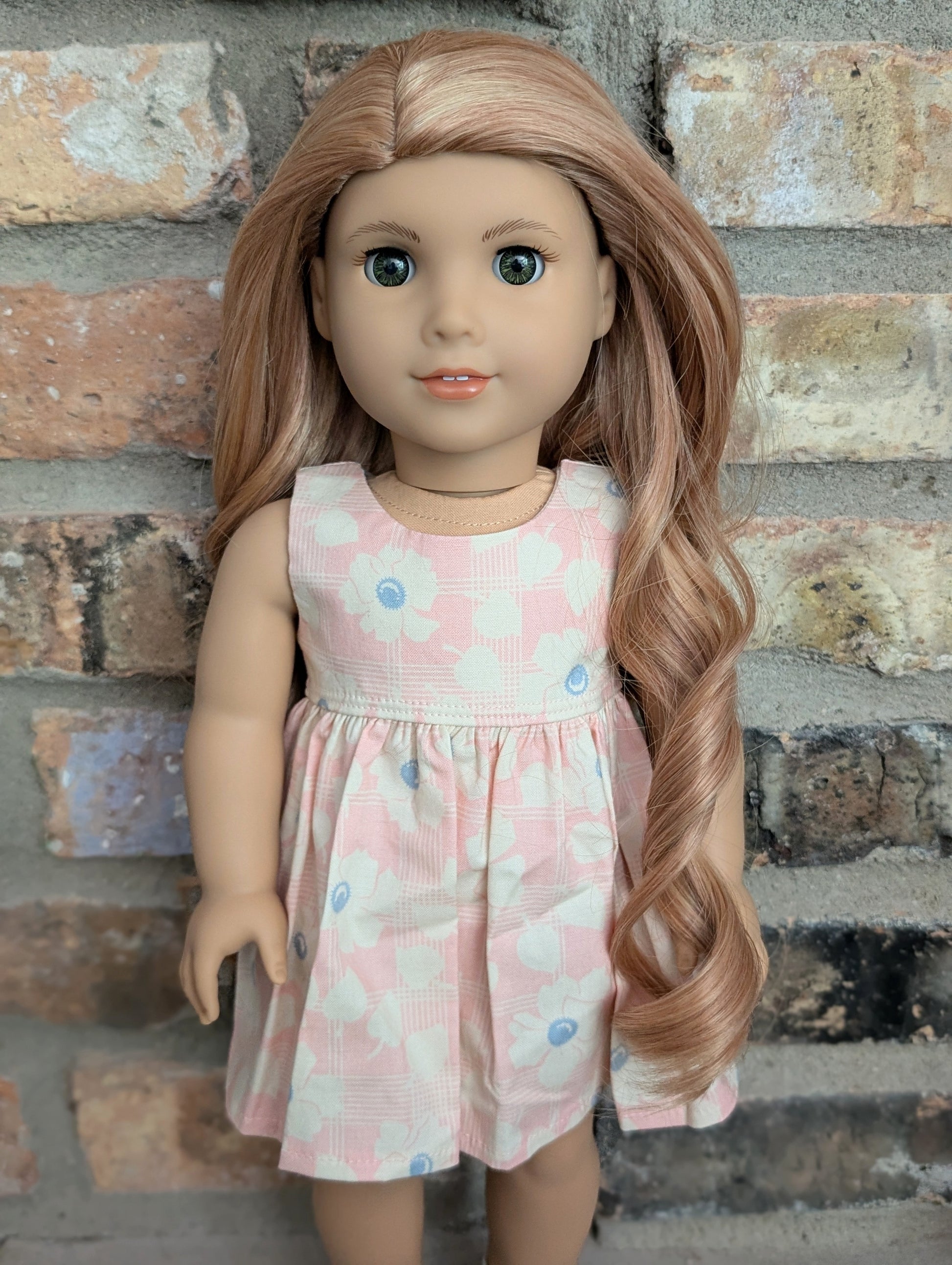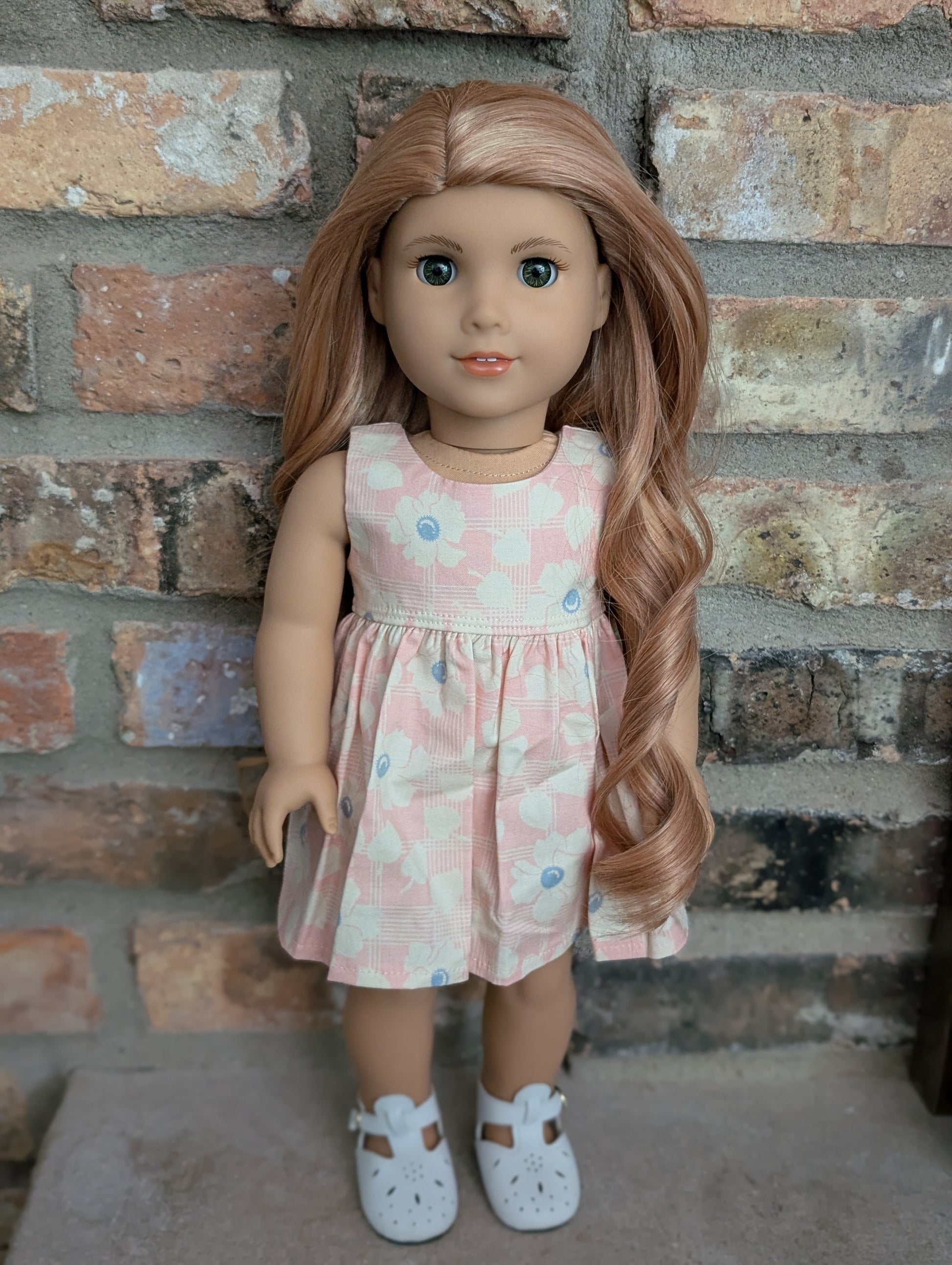This one of a kind OOAK custom American Girl doll was created with a brand new doll, a light red wig, and hazel eyes. She has lip gloss that was hand painted and sealed. She may have some minor shine marks from handling. She comes with the outfit pictured.