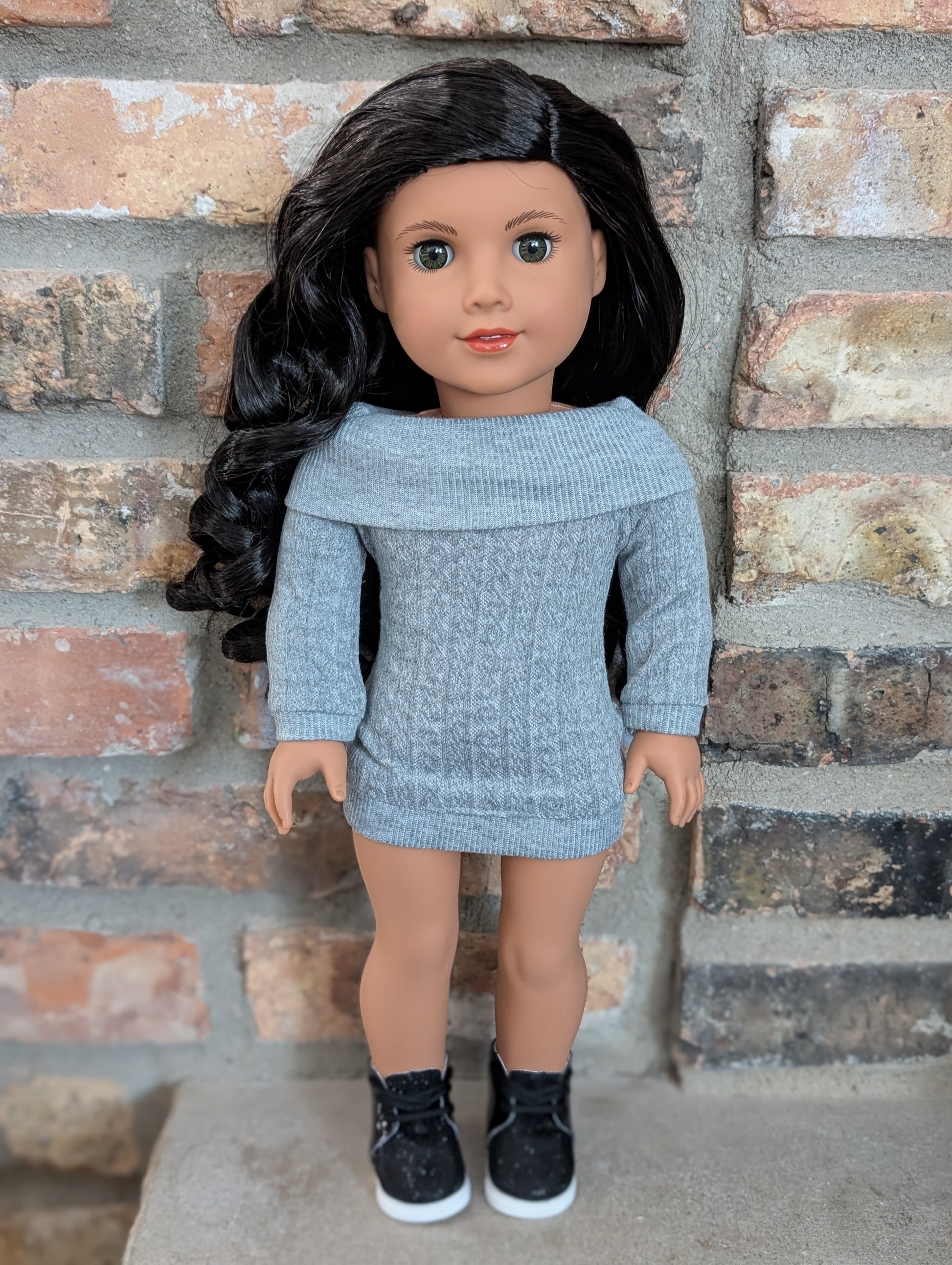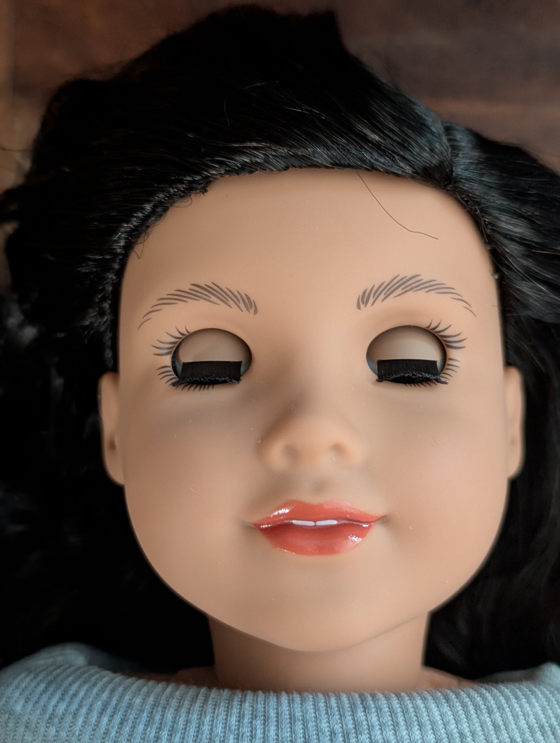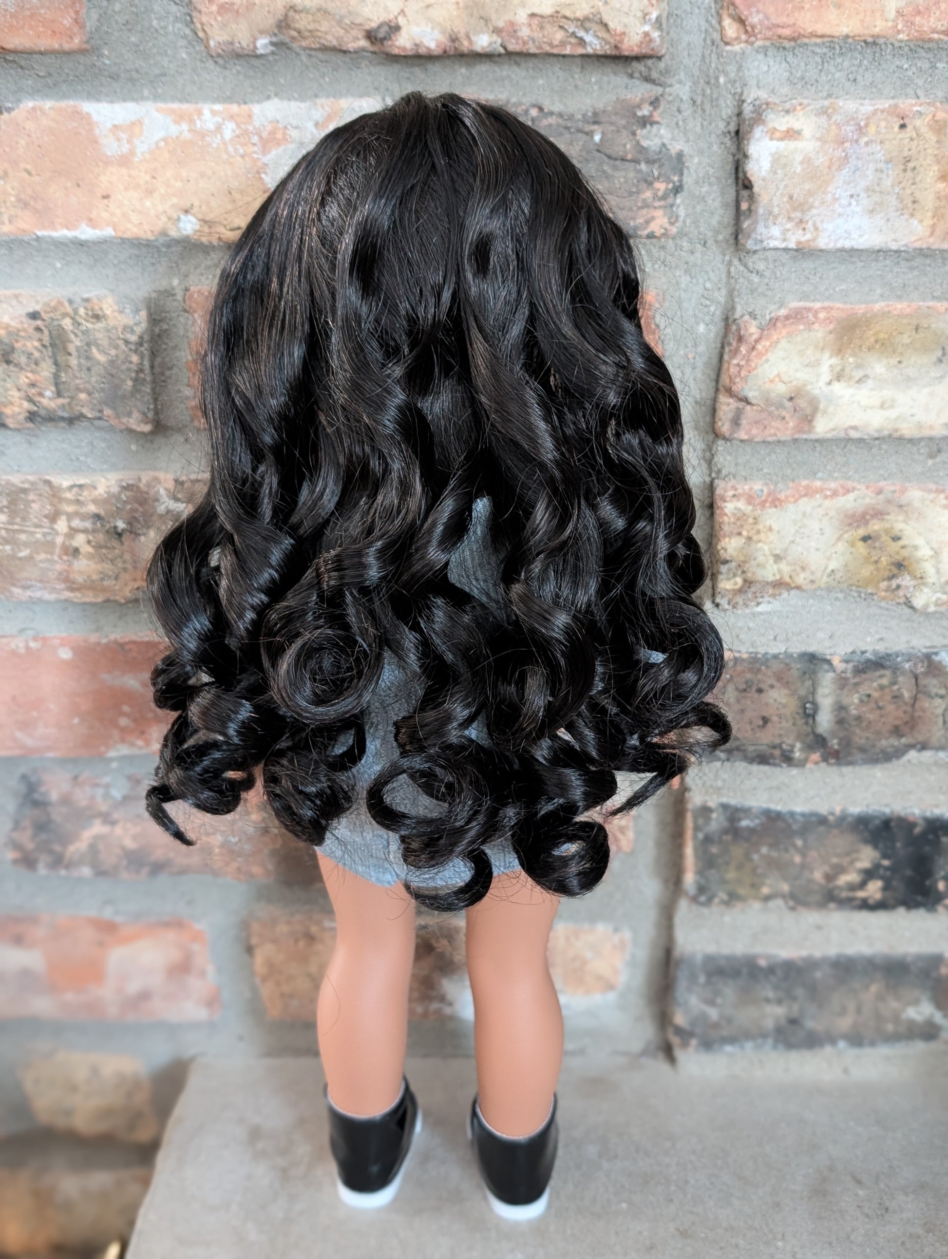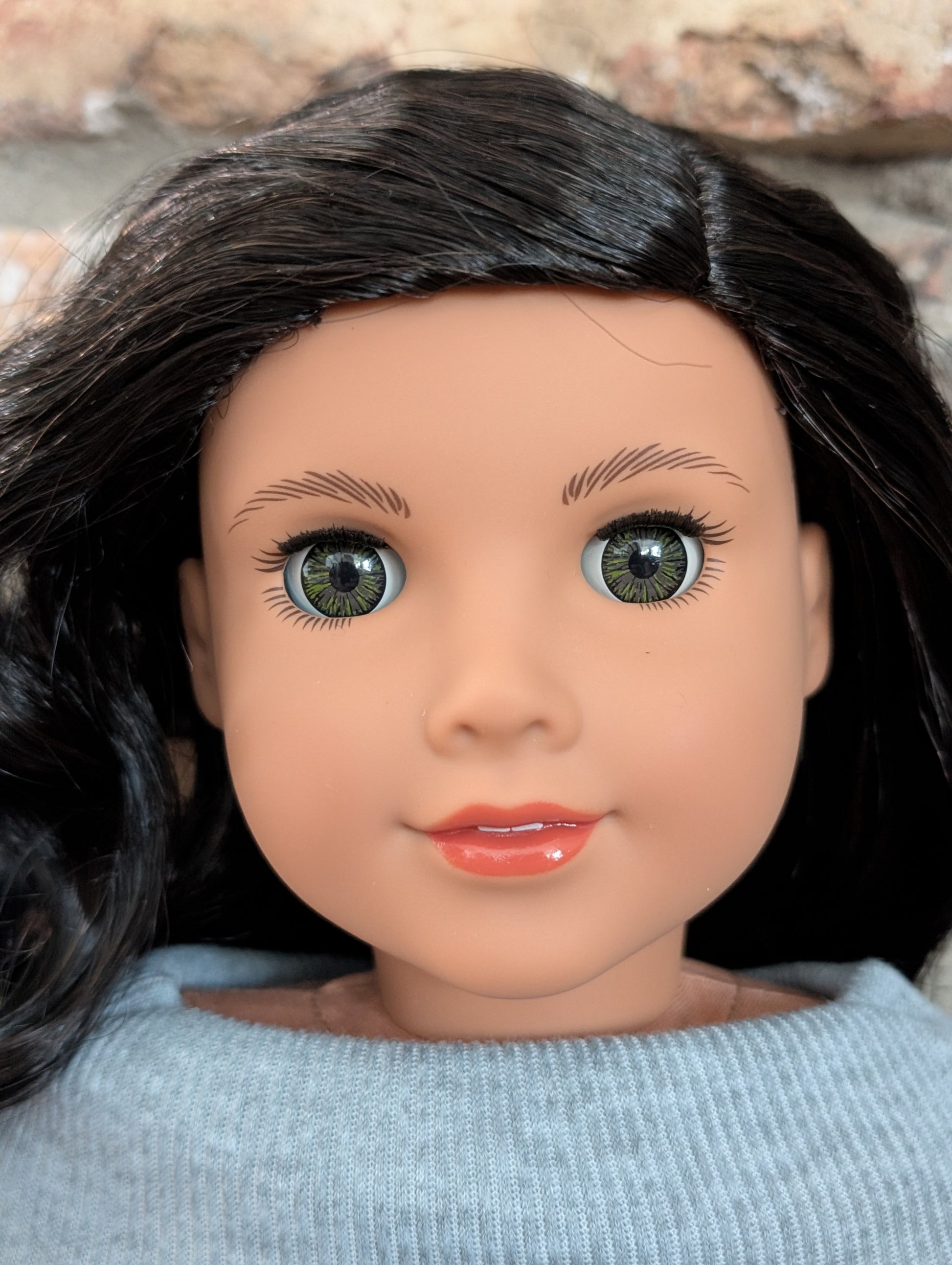 This one of a kind OOAK custom American Girl doll was created with a brand new doll, a black wig, and hazel eyes. She has lip gloss that was hand painted and sealed. She may have some minor shine marks from handling. She comes with the outfit pictured.