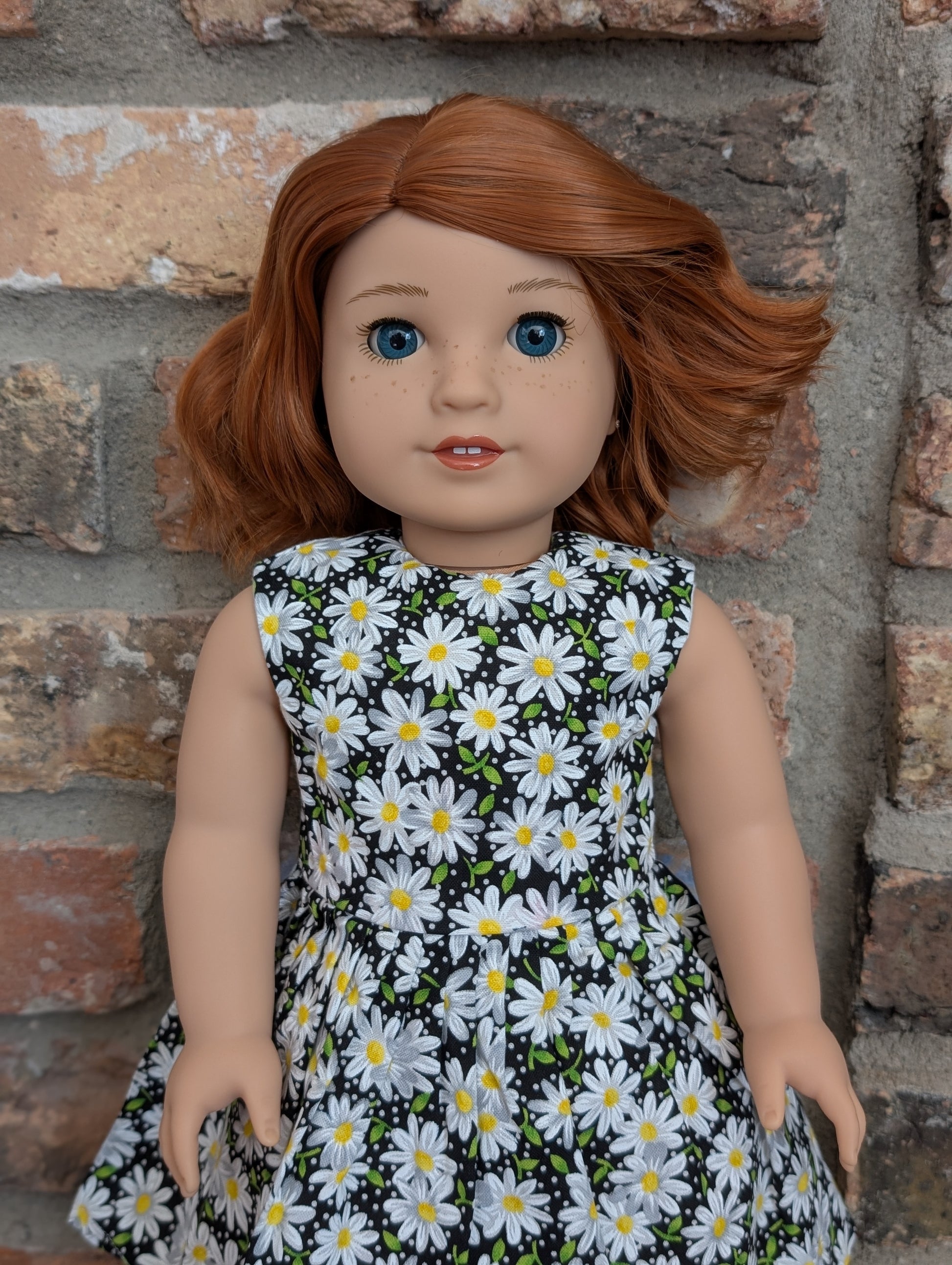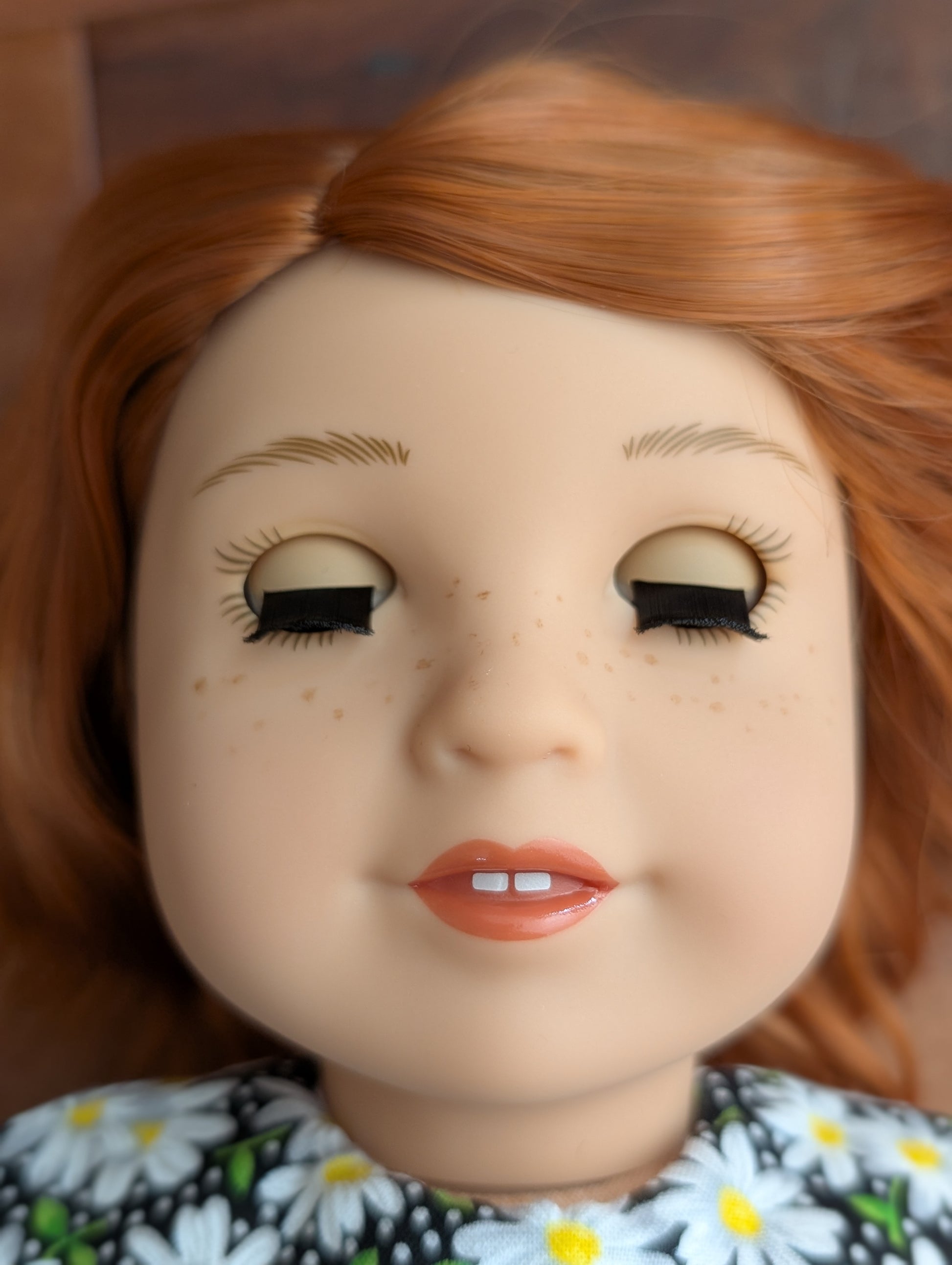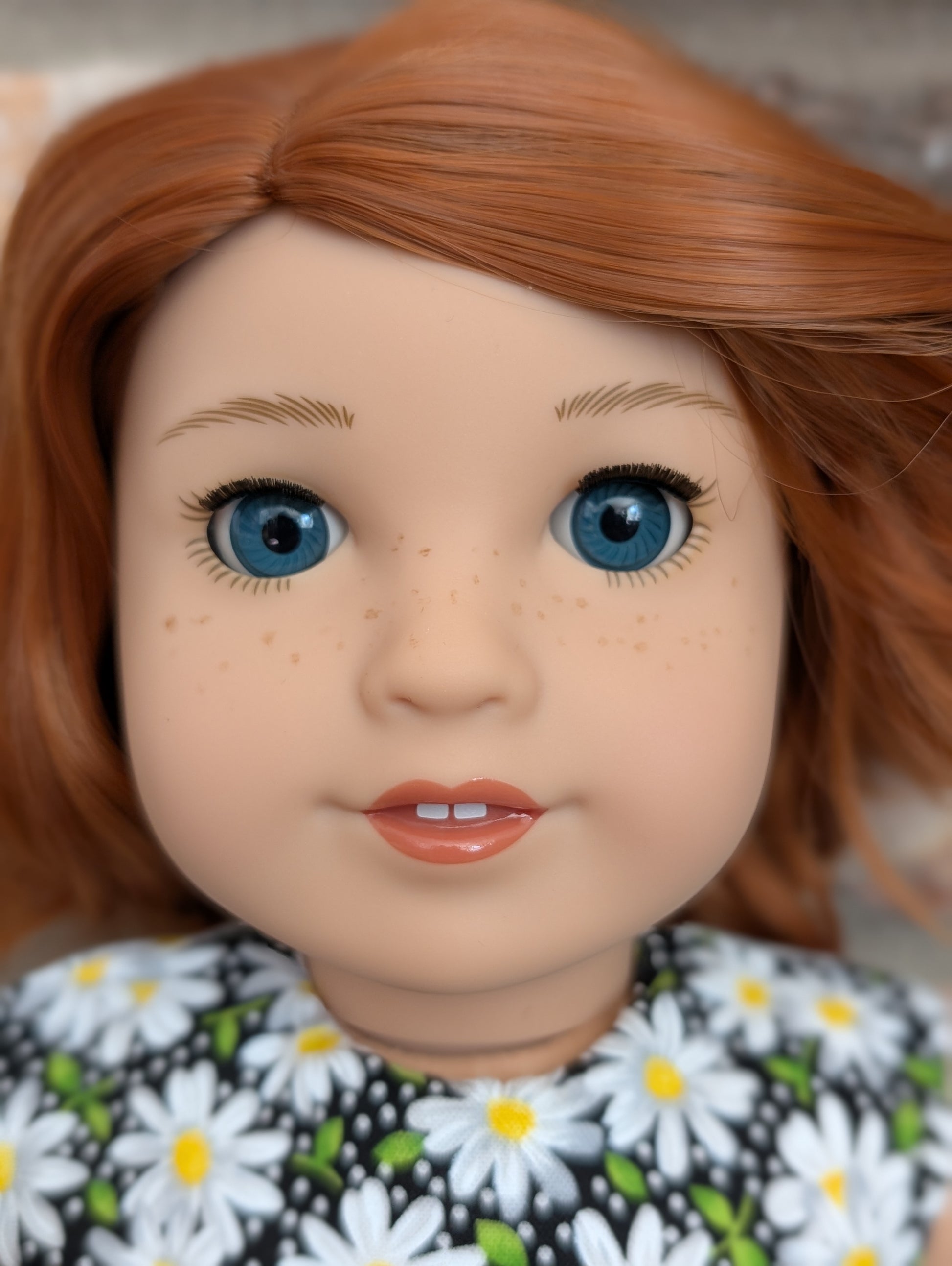 This one of a kind OOAK custom American Girl doll was created with a brand new doll, a red wig, and blue eyes. She has lip gloss and freckles that were hand painted and sealed. She may have some minor shine marks from handling. She comes with the outfit pictured. Her ears are pierced with normal earrings and the tiny diamond look studs are included.