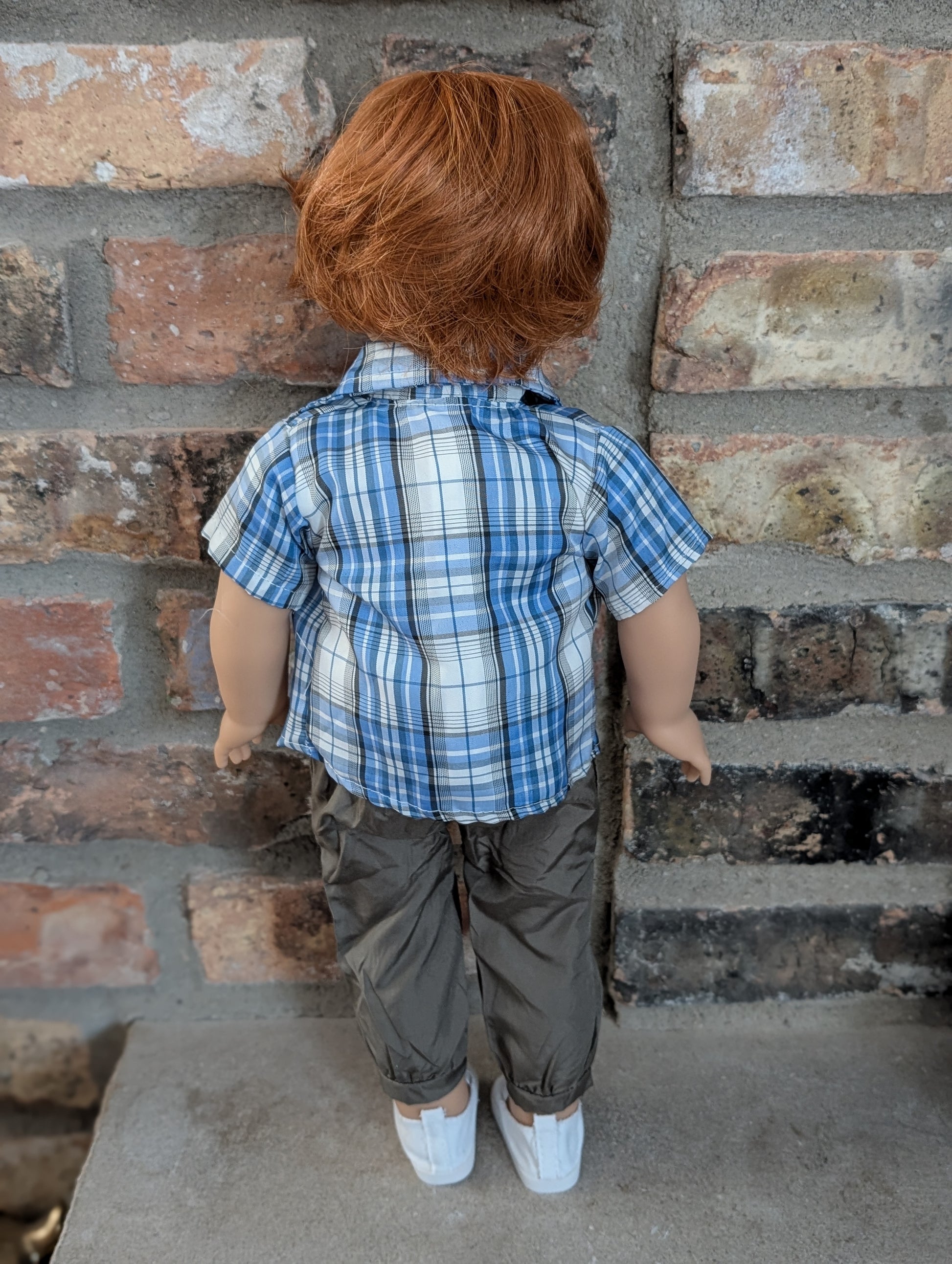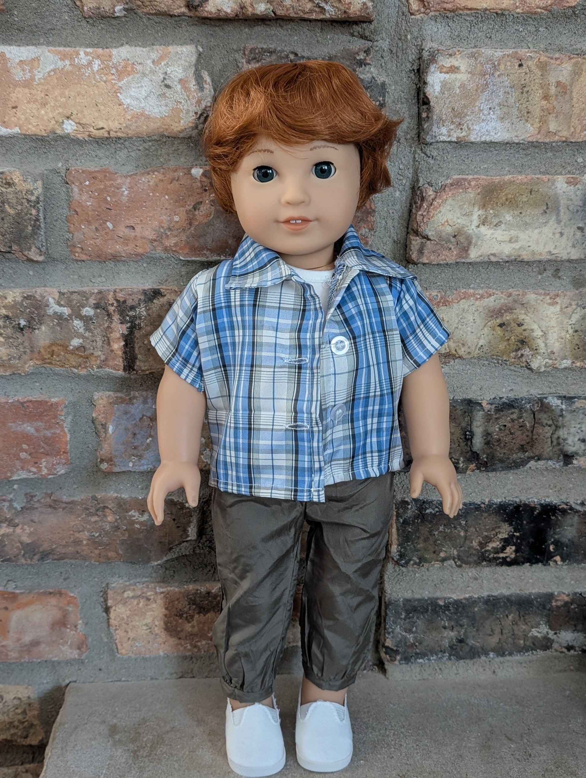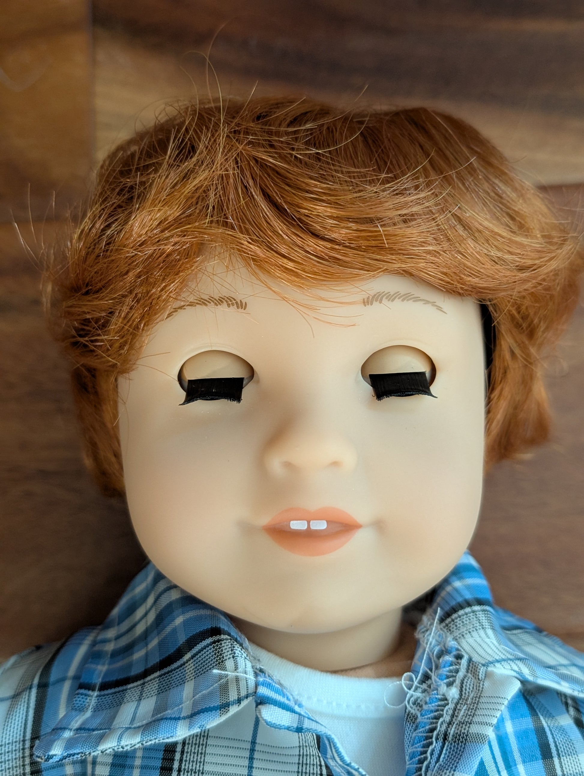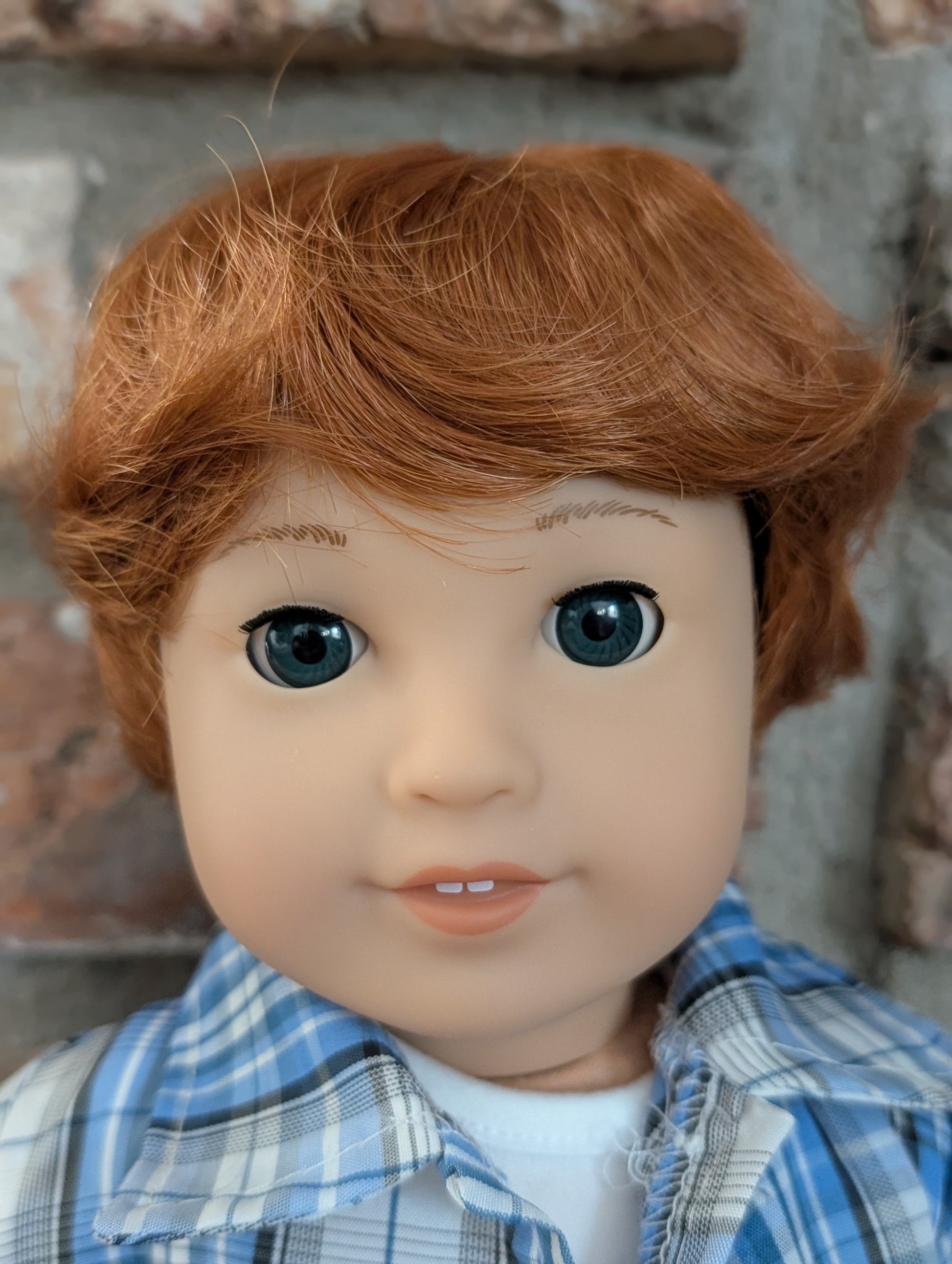 This one of a kind OOAK custom boy American Girl doll was created with a brand new doll, a red, and dark blue eyes. He may have some minor shine marks from handling. He comes with the outfit pictured.