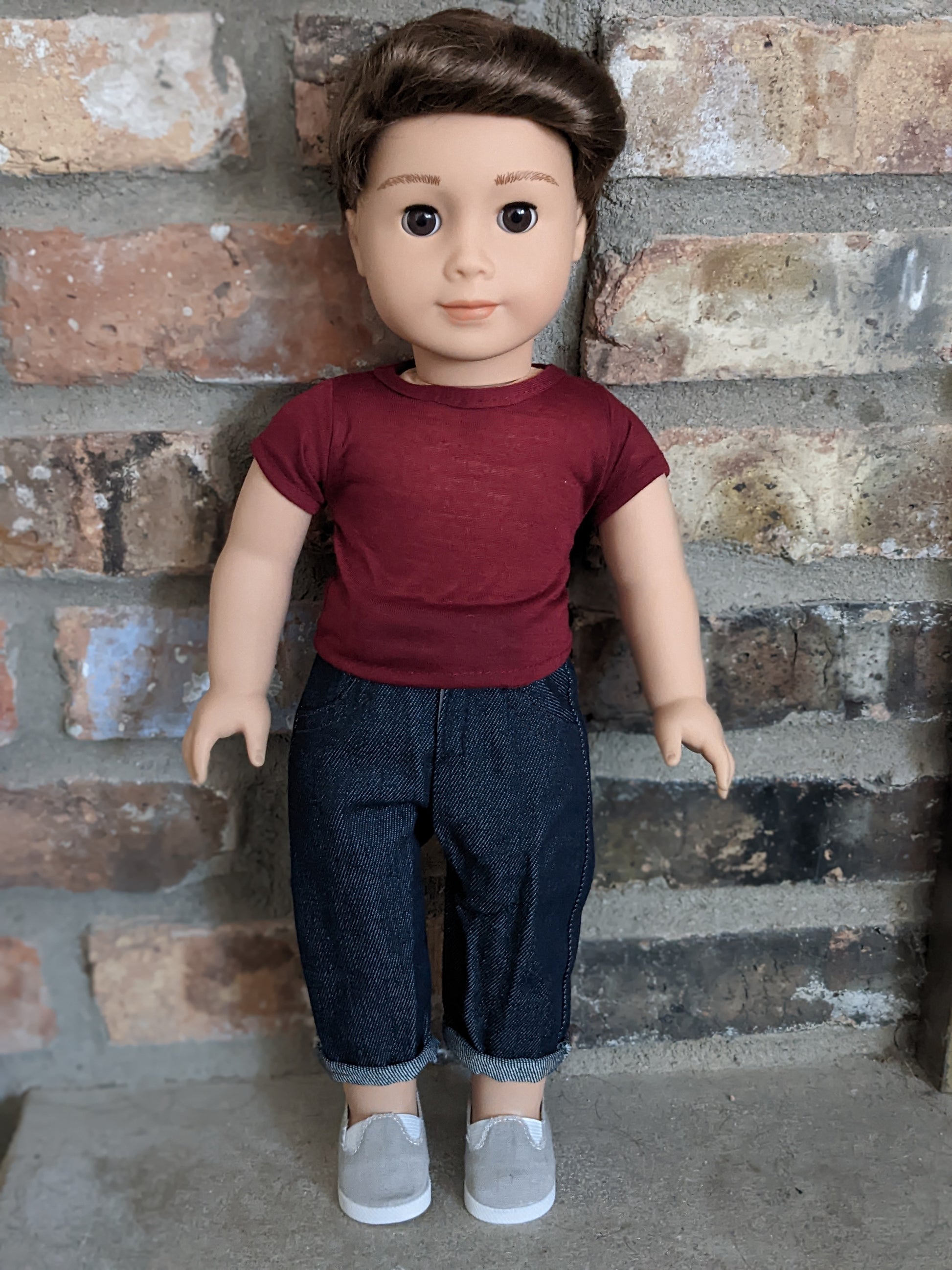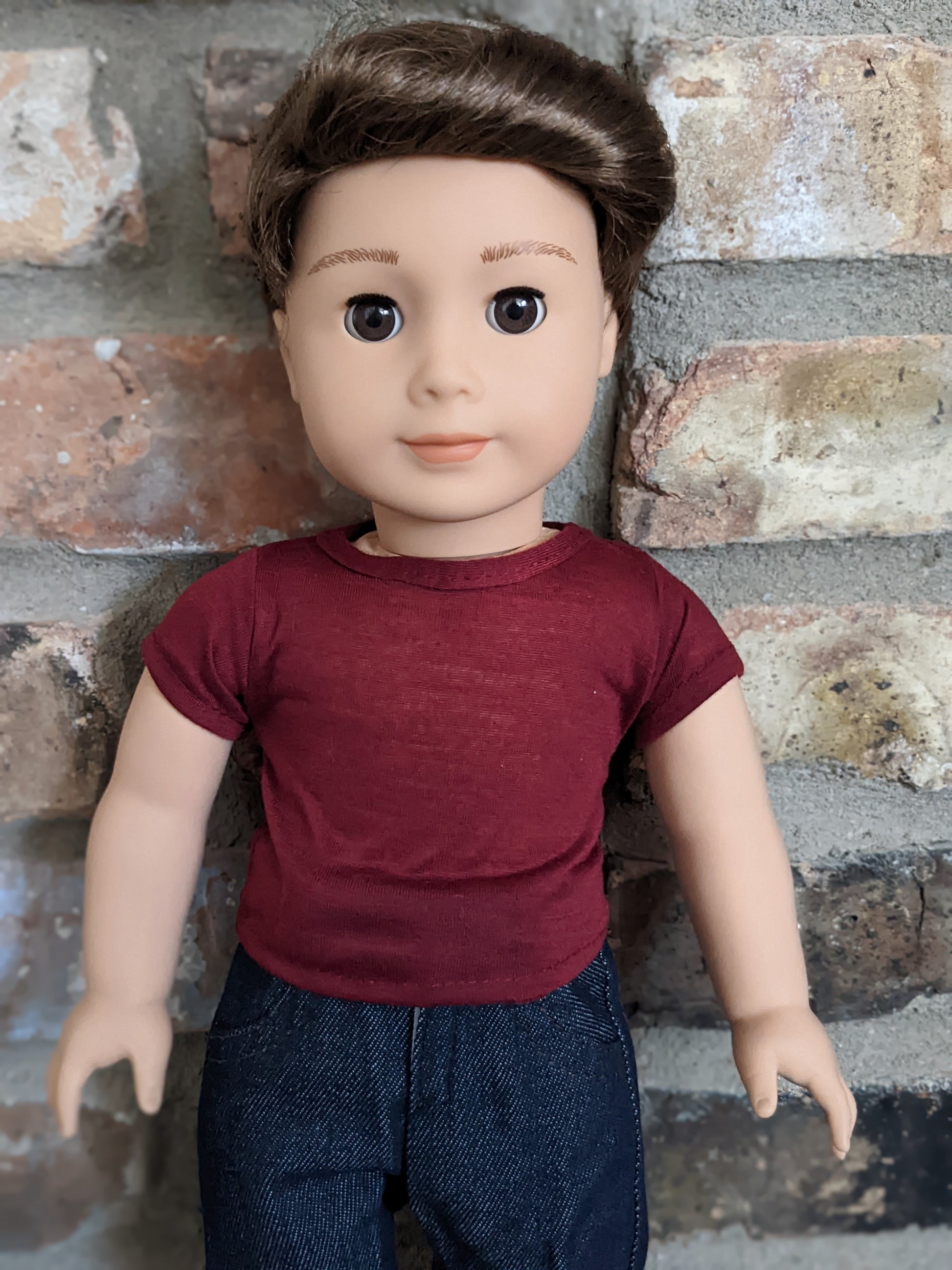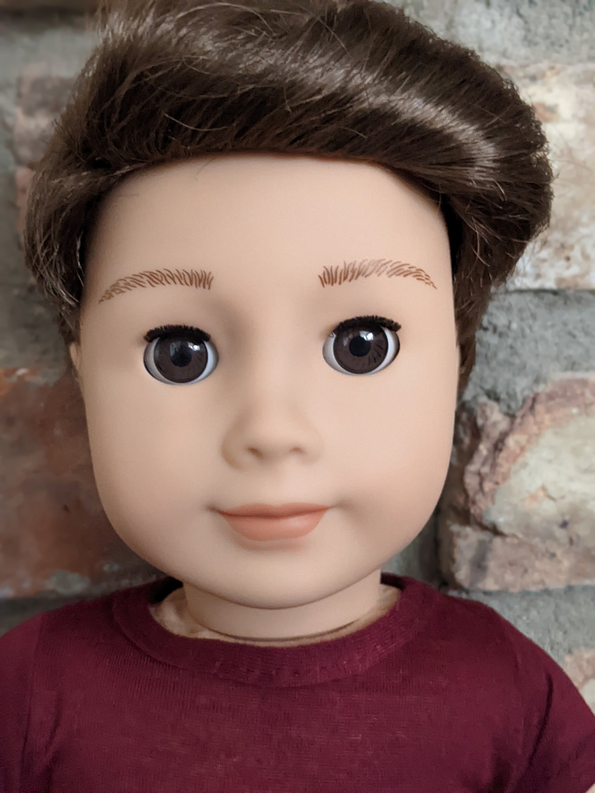 This one of a kind OOAK custom American Girl doll was created with a brand new Truly Me 104 doll, a brown wig from a new Logan doll, and brown eyes. He may have some minor shine marks from handling. He comes with the outfit pictured.