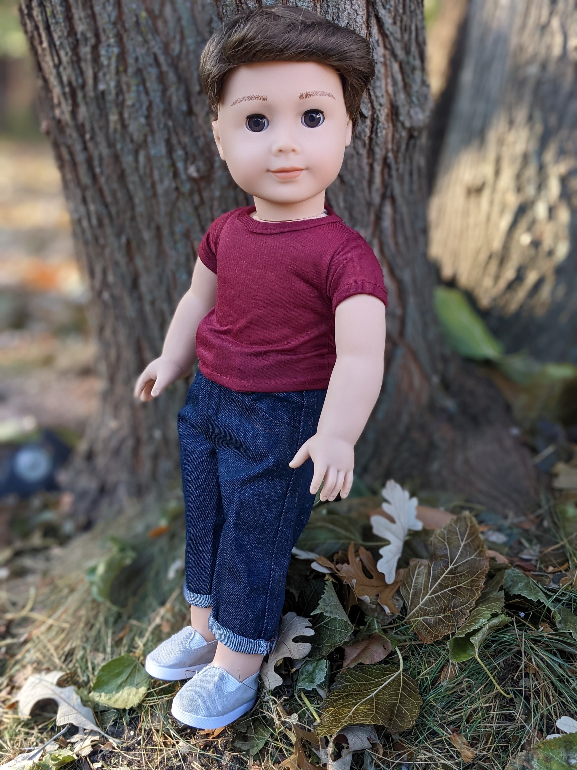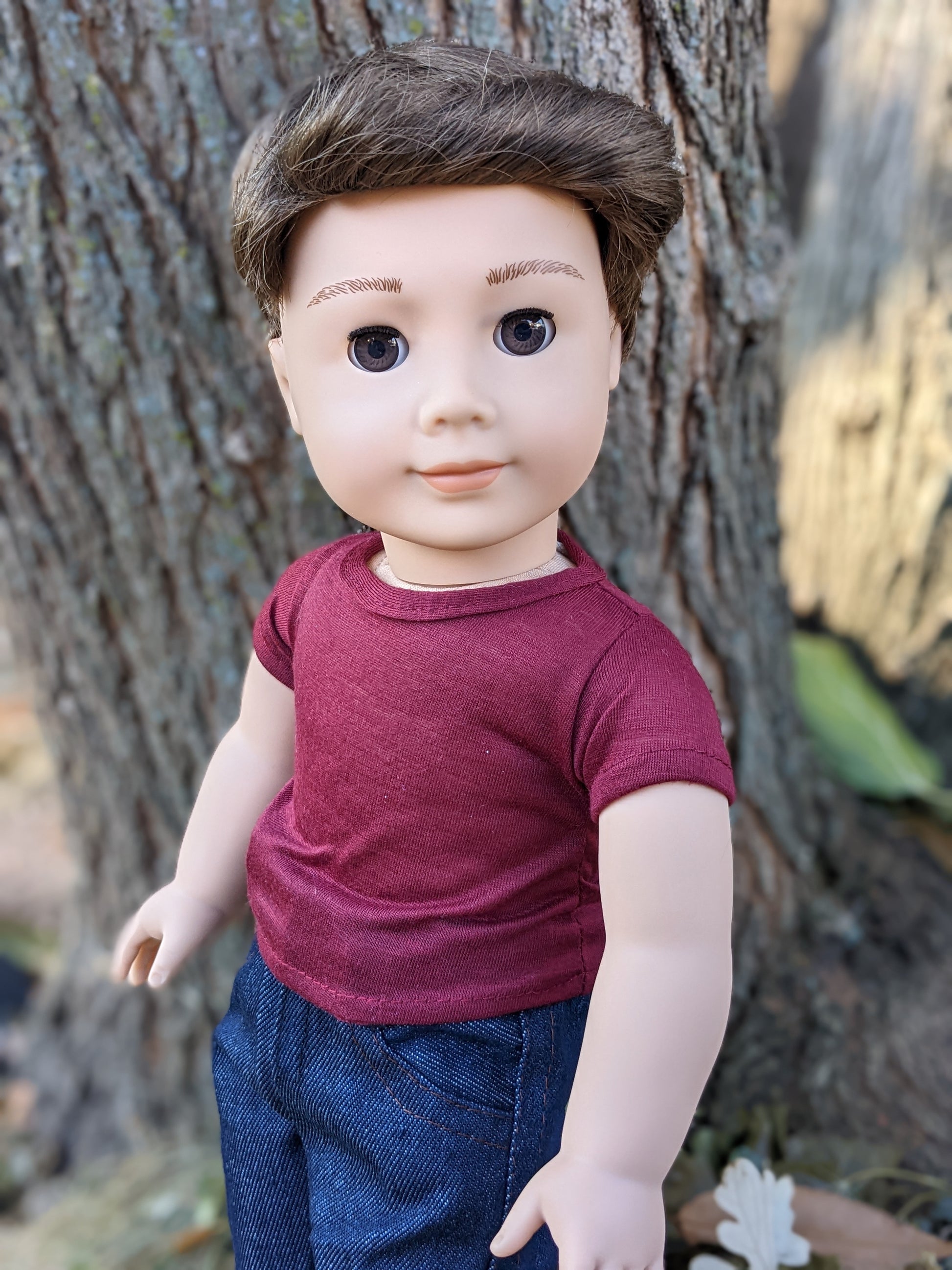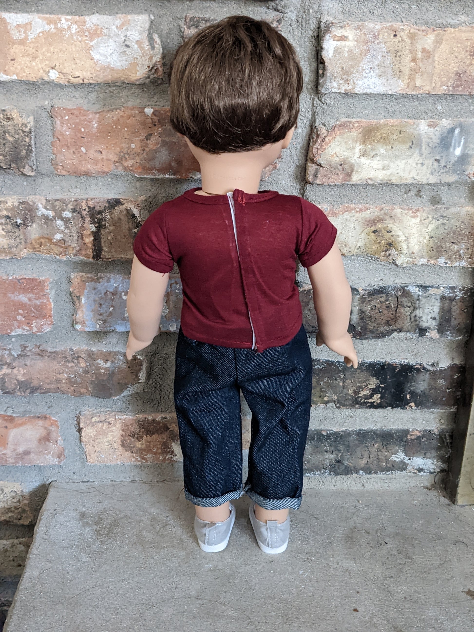 This one of a kind OOAK custom American Girl doll was created with a brand new Truly Me 104 doll, a brown wig from a new Logan doll, and brown eyes. He may have some minor shine marks from handling. He comes with the outfit pictured.