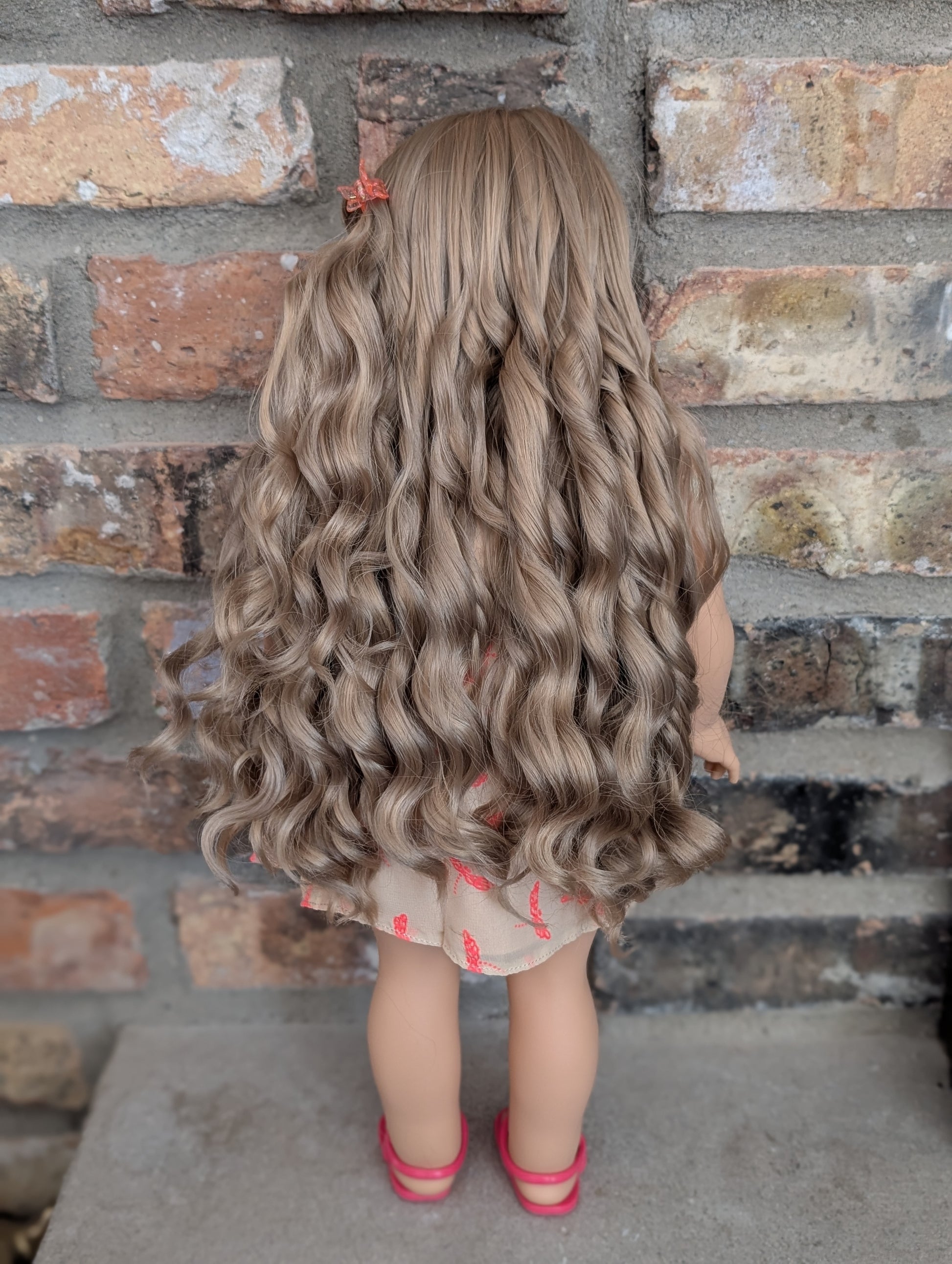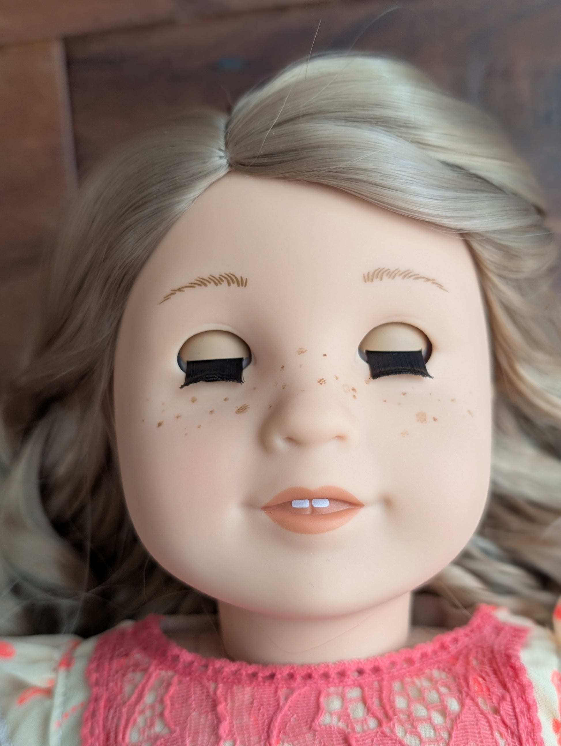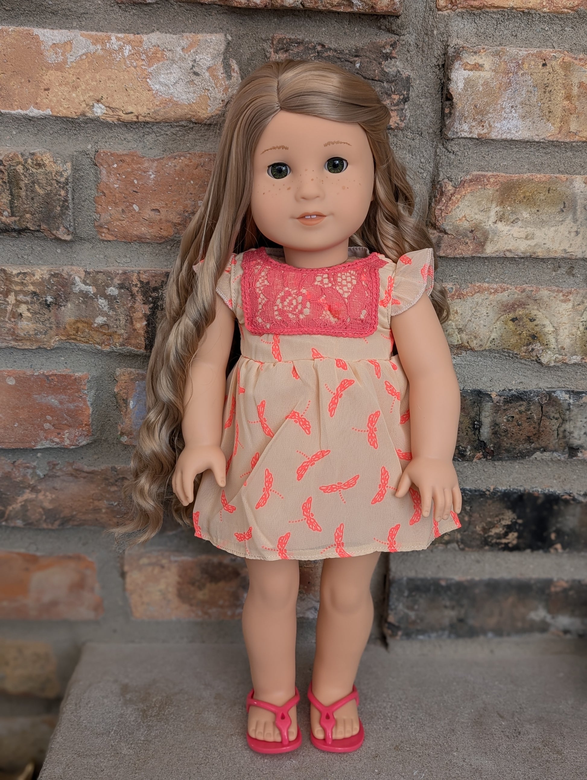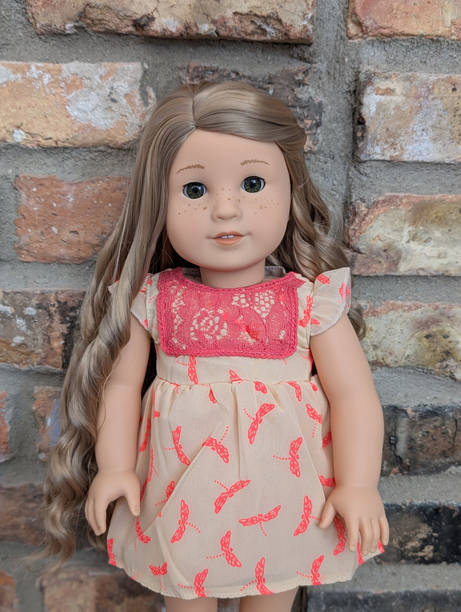 This one of a kind OOAK custom American Girl doll was created with a brand new doll, a blonde wig, and hazel eyes. She has freckles that were hand painted and sealed. She may have some minor shine marks from handling. She comes with the outfit pictured.