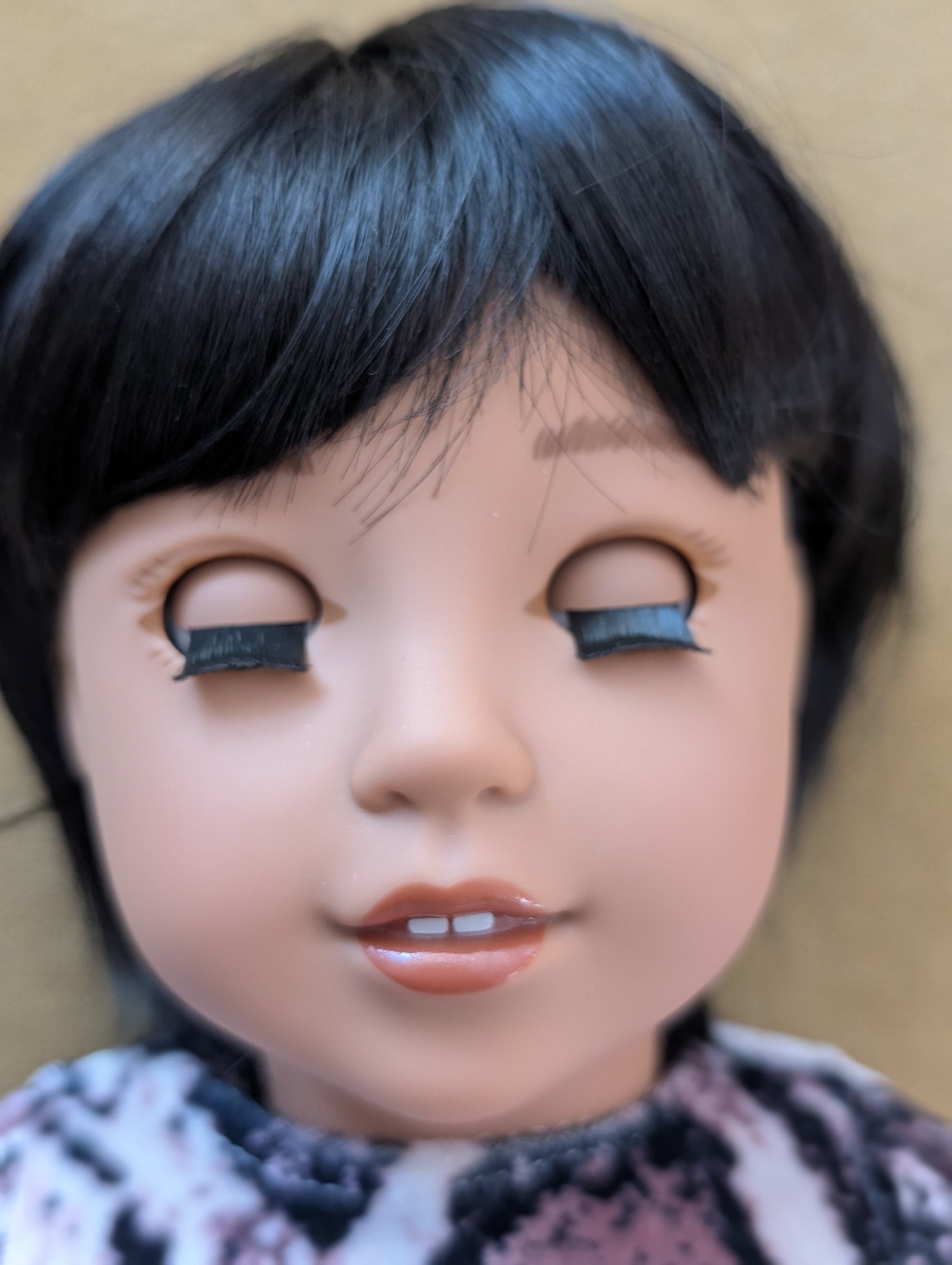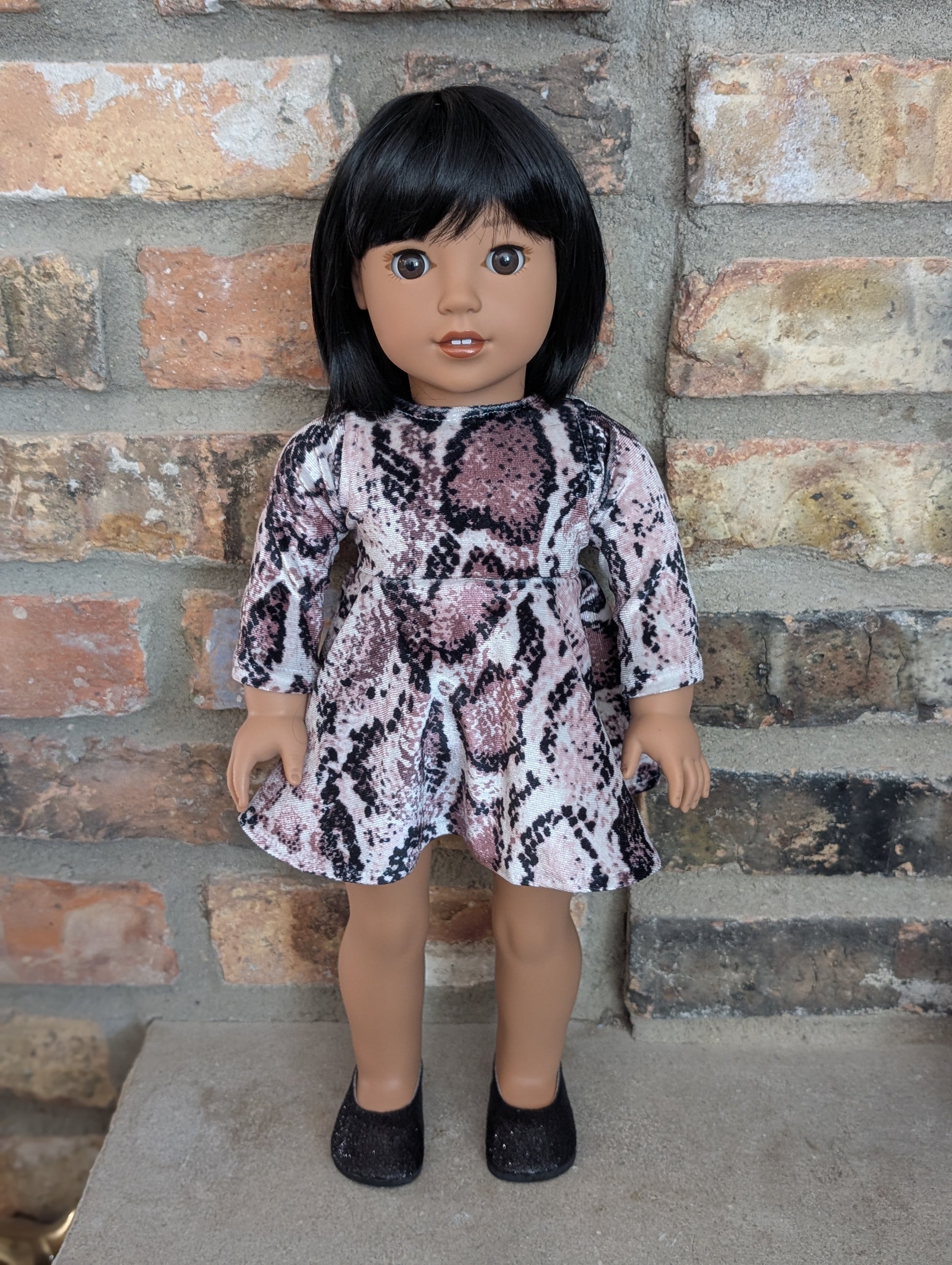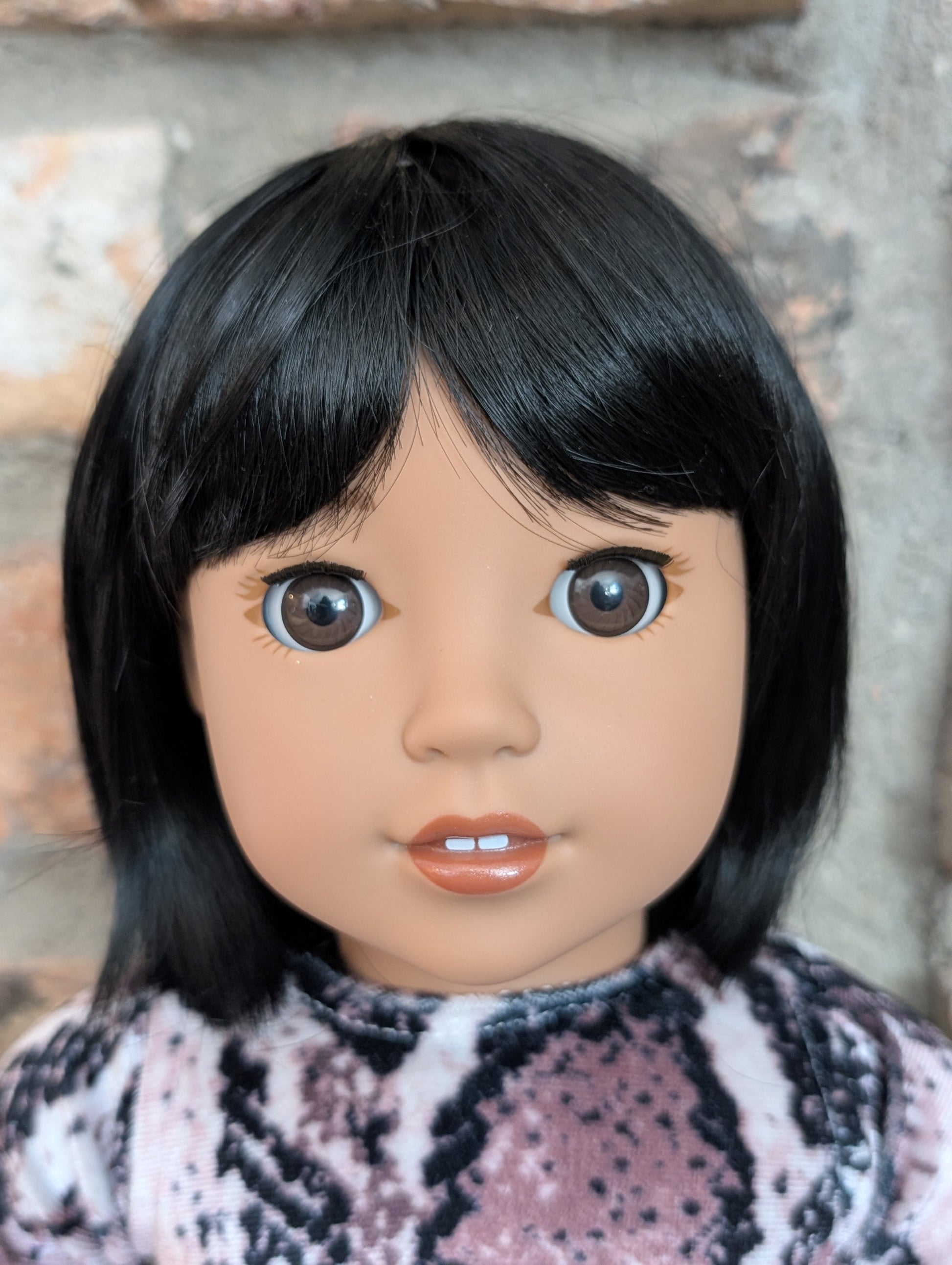 This one of a kind OOAK custom American Girl doll was created with a brand new doll, a black wig, and brown eyes. She has lip gloss that was hand painted and sealed. She may have some minor shine marks from handling. She comes with the outfit pictured. This wig has a tan wig cap is designed without hair covering the edge of the wig cap. If you pull her hair back, the wig cap may show.