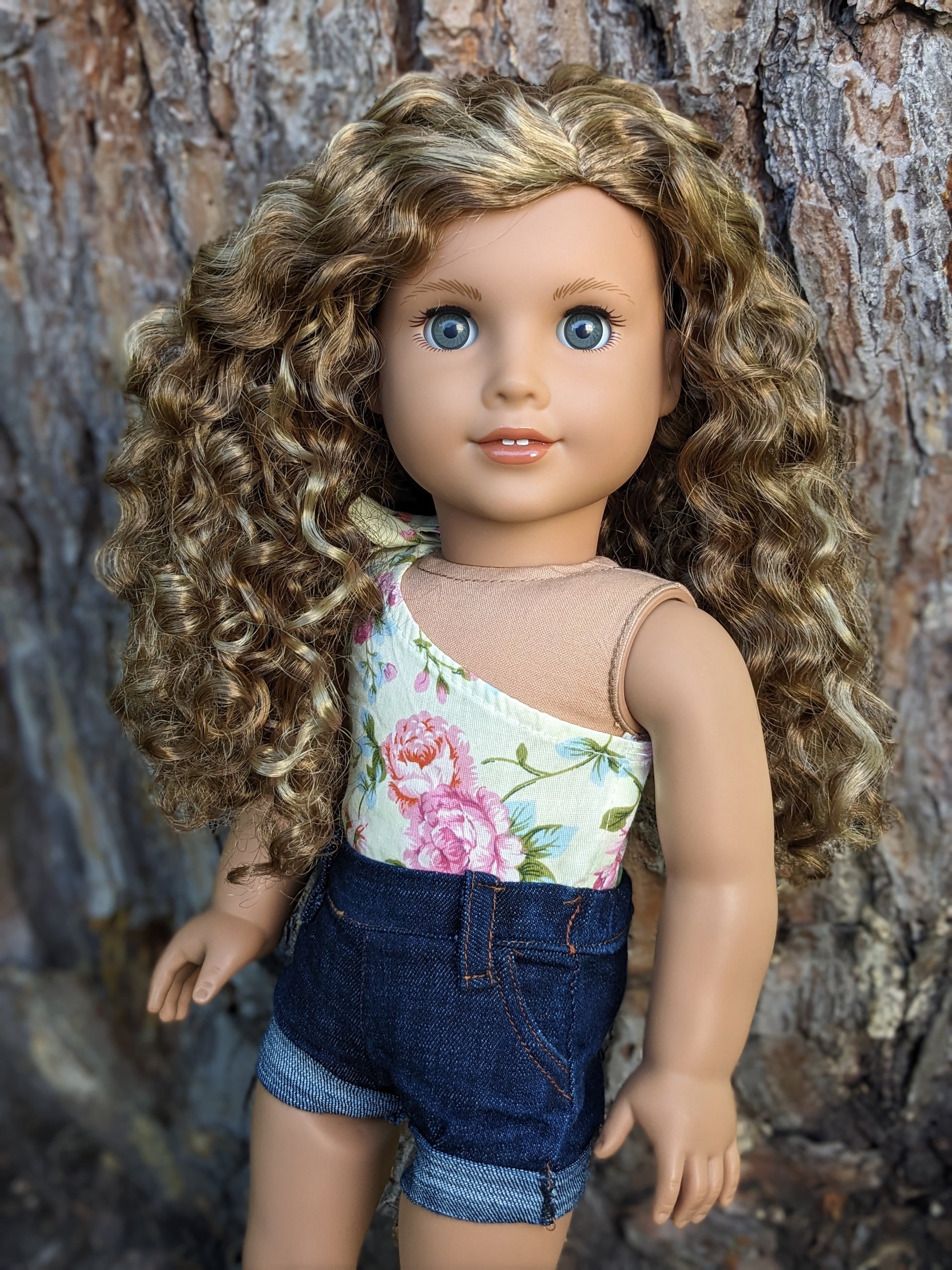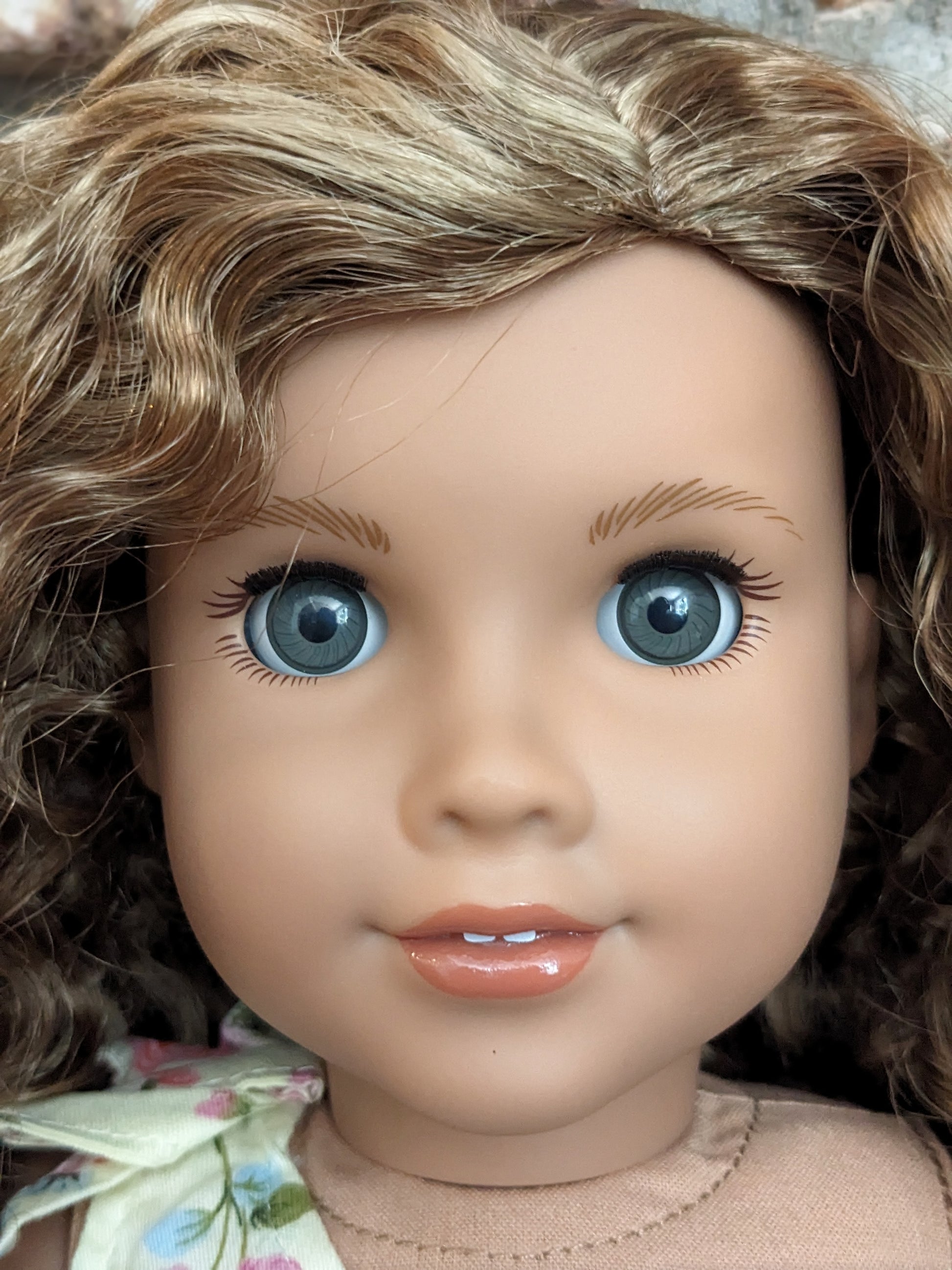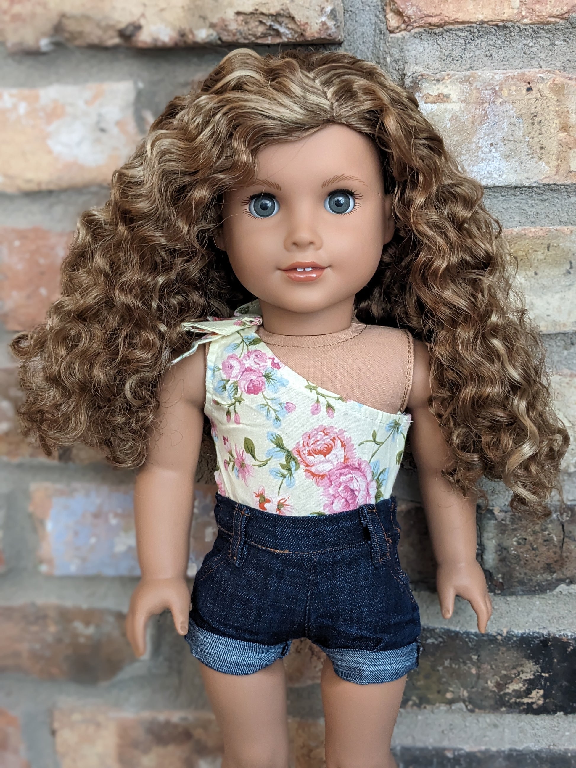 This one of a kind OOAK custom American Girl doll was created with a new doll, a caramel brown wig, and grey eyes. She has lip gloss that was hand painted and sealed. She may have some minor shine marks from handling. She comes with the outfit pictured.