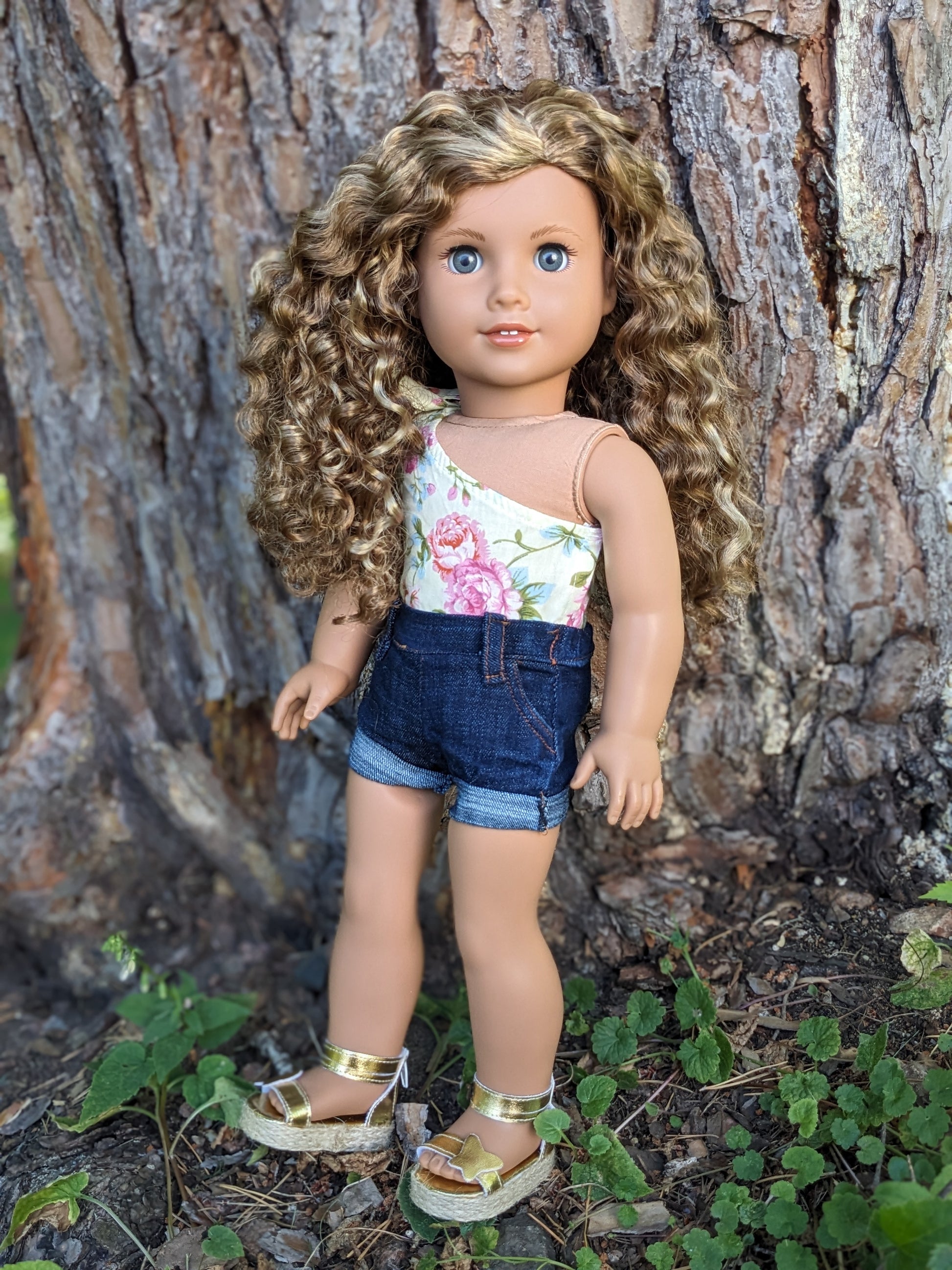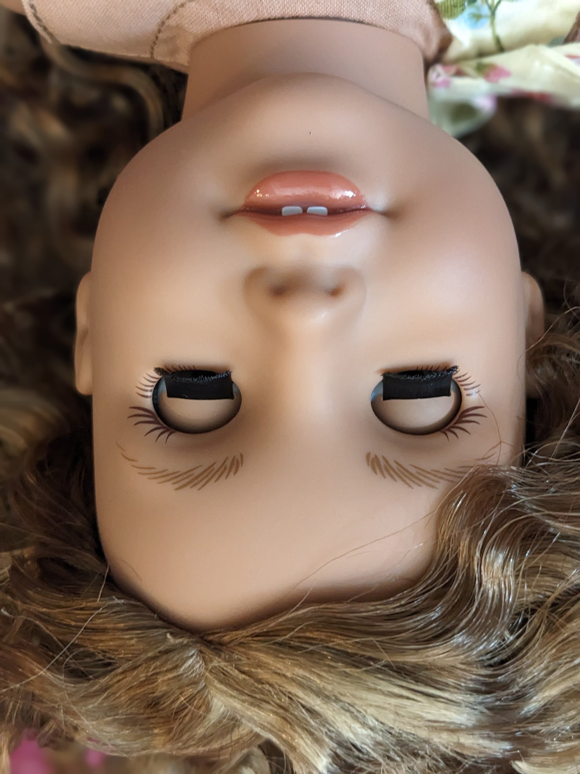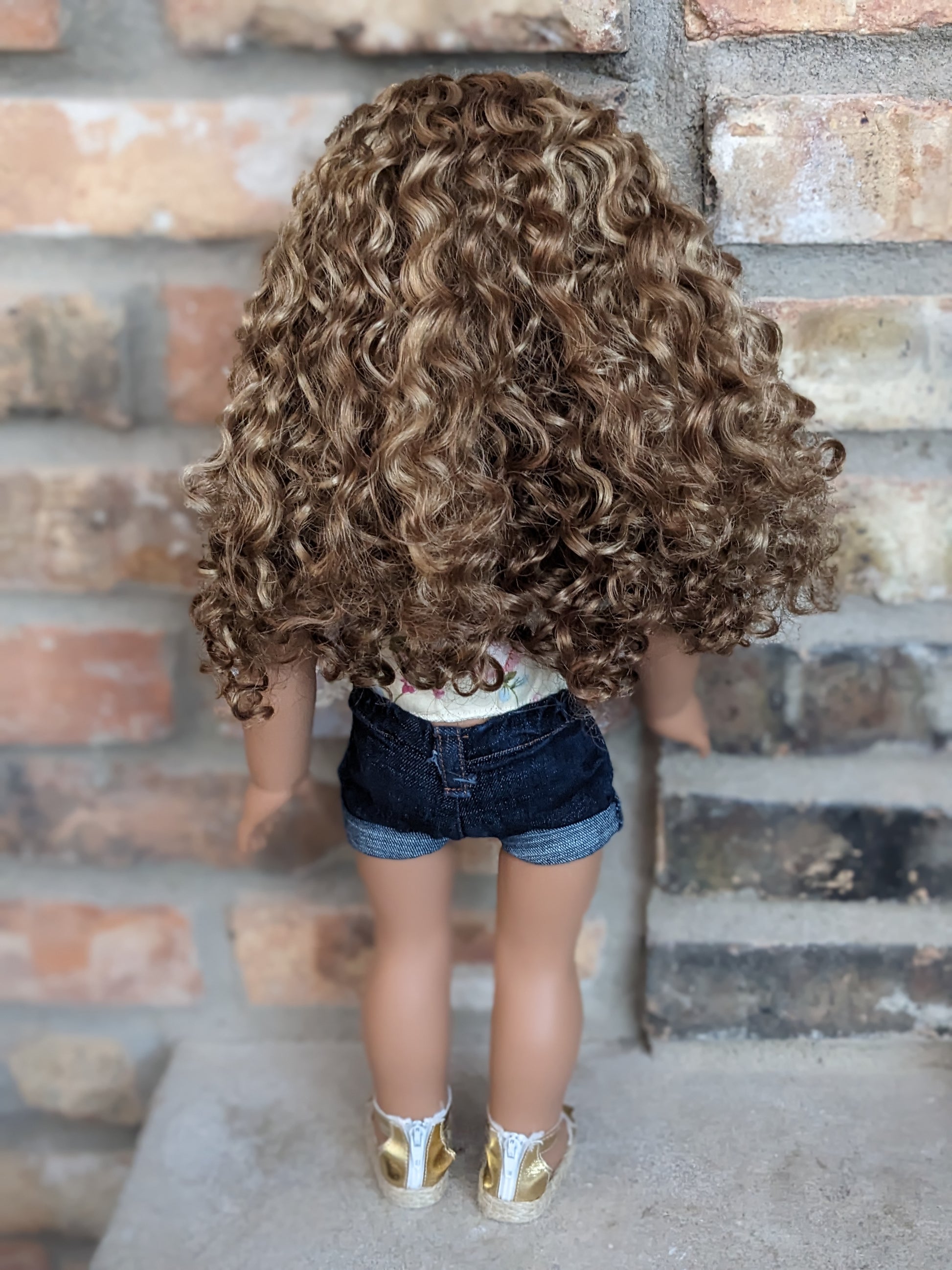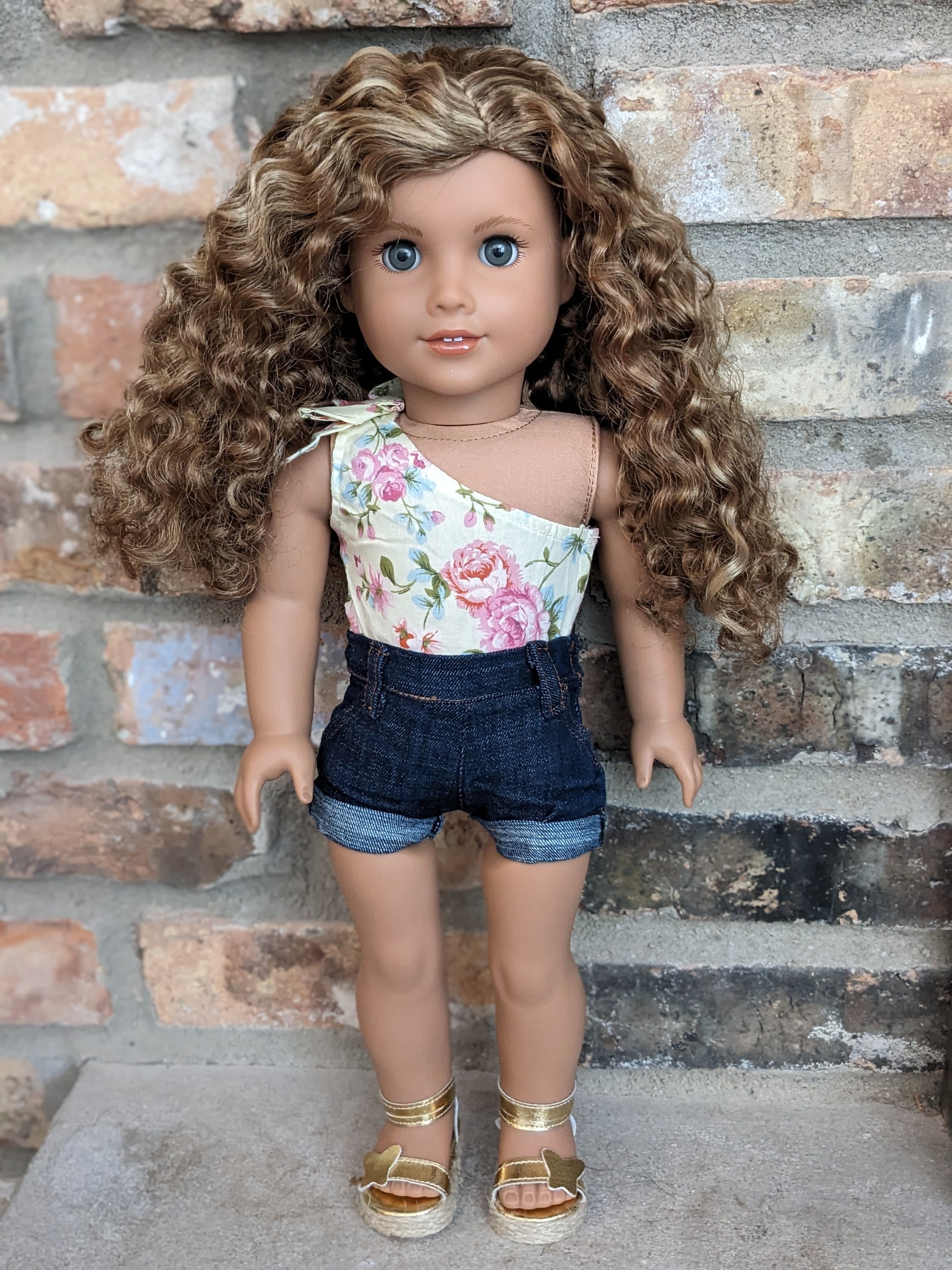 This one of a kind OOAK custom American Girl doll was created with a new doll, a caramel brown wig, and grey eyes. She has lip gloss that was hand painted and sealed. She may have some minor shine marks from handling. She comes with the outfit pictured.