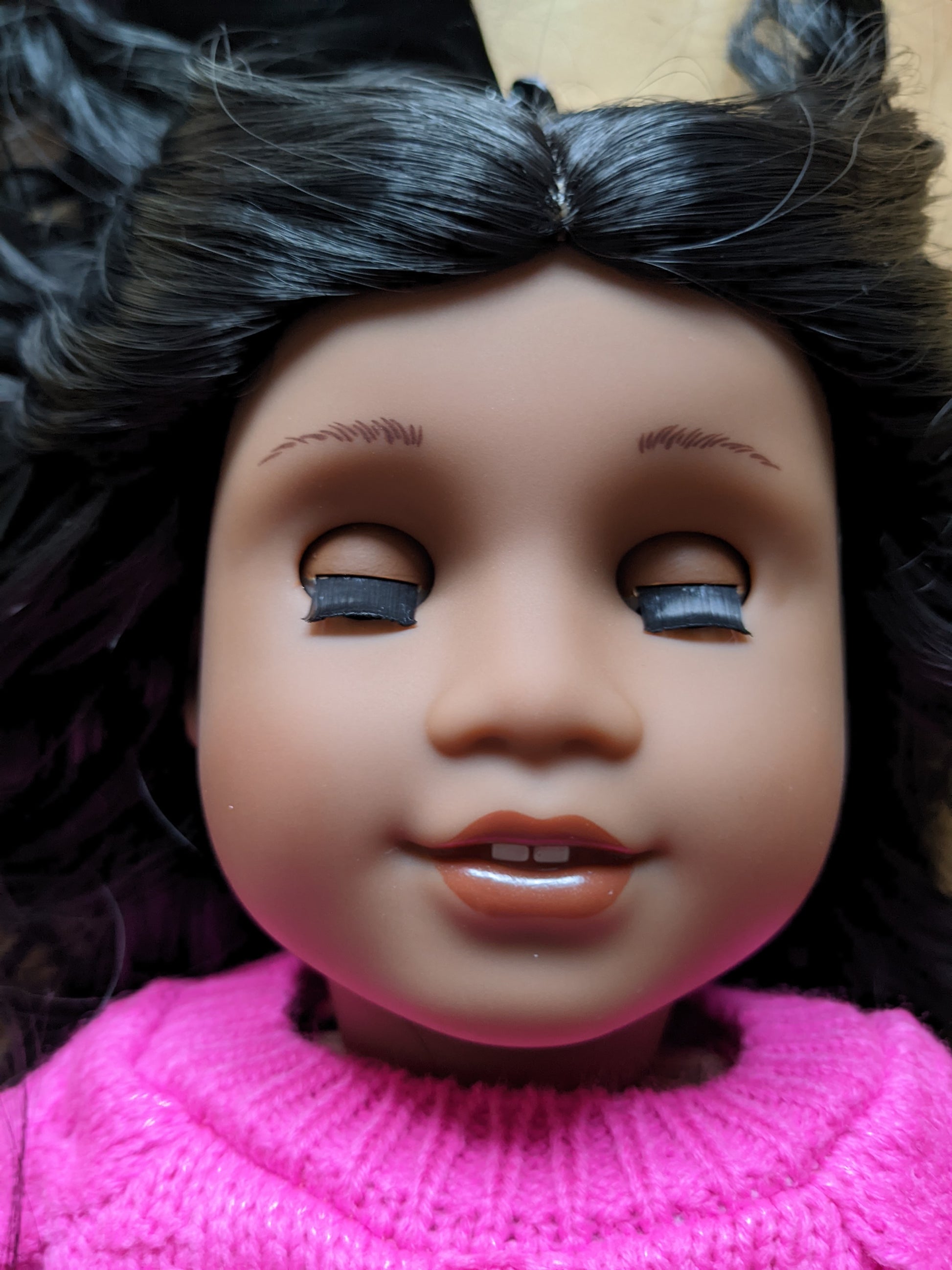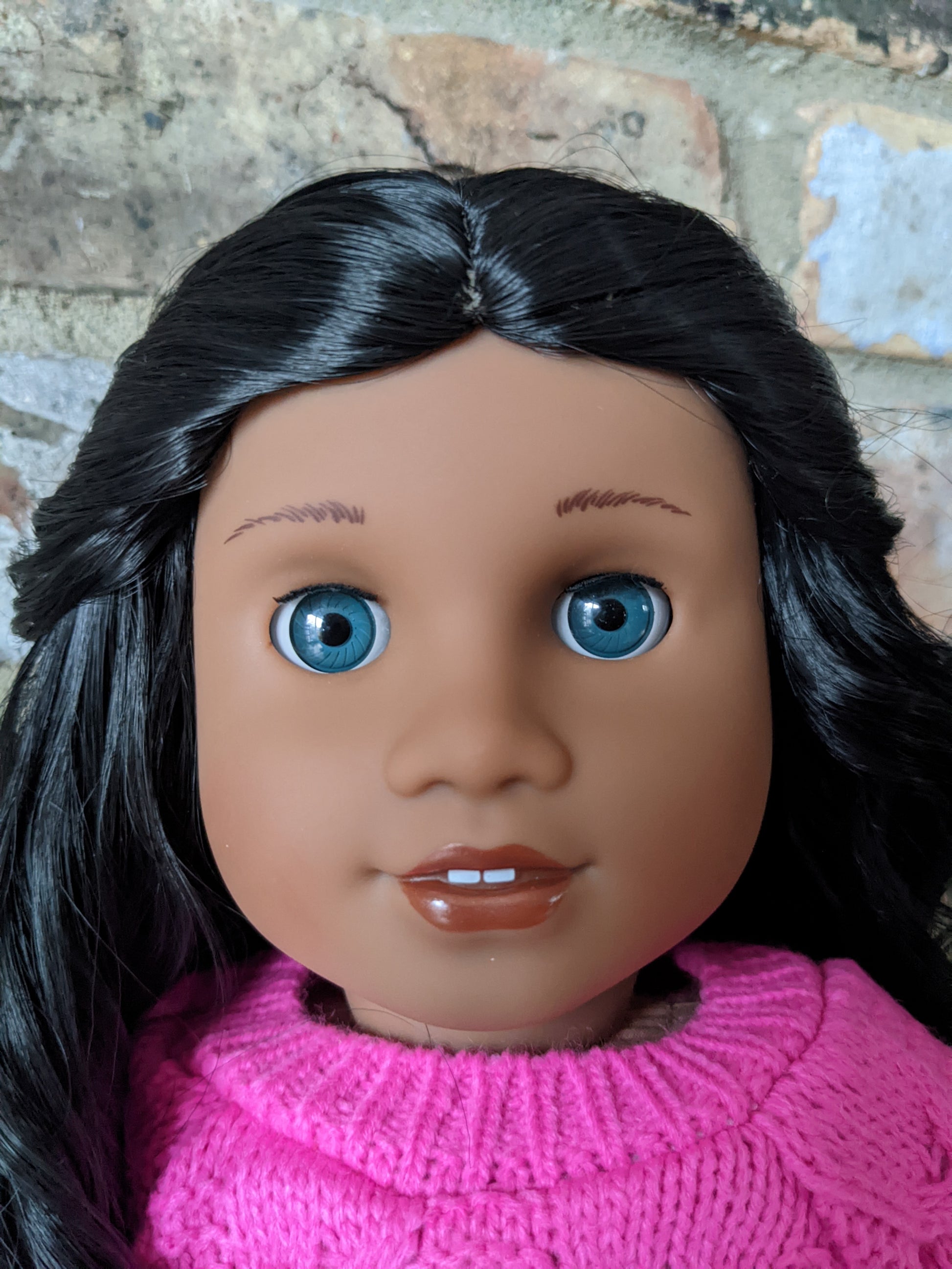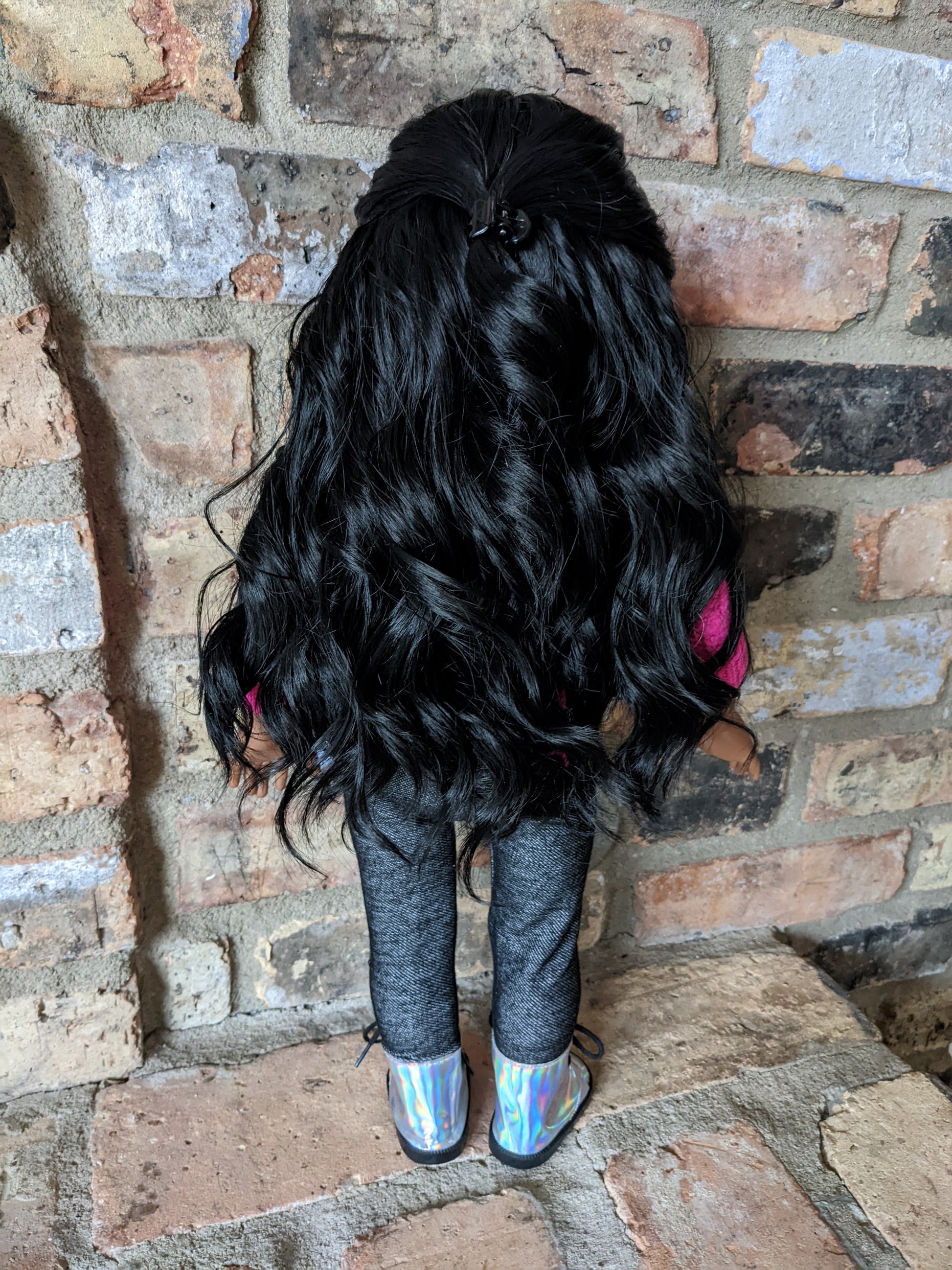 This one of a kind OOAK custom American Girl doll was created with a new Gabriela doll, dark blue eyes from a Kit doll, and a black curly wig. She has custom lip gloss painted and sealed. She may have some minor shine marks from handling and a tiny x on her bum. She comes with the outfit pictured. If you would like me to leave the wig unattached, please let me know by leaving a note in the "Order Special Instructions" box upon checkout. Otherwise I will attach the wig with a heavy duty permanent adhesive.