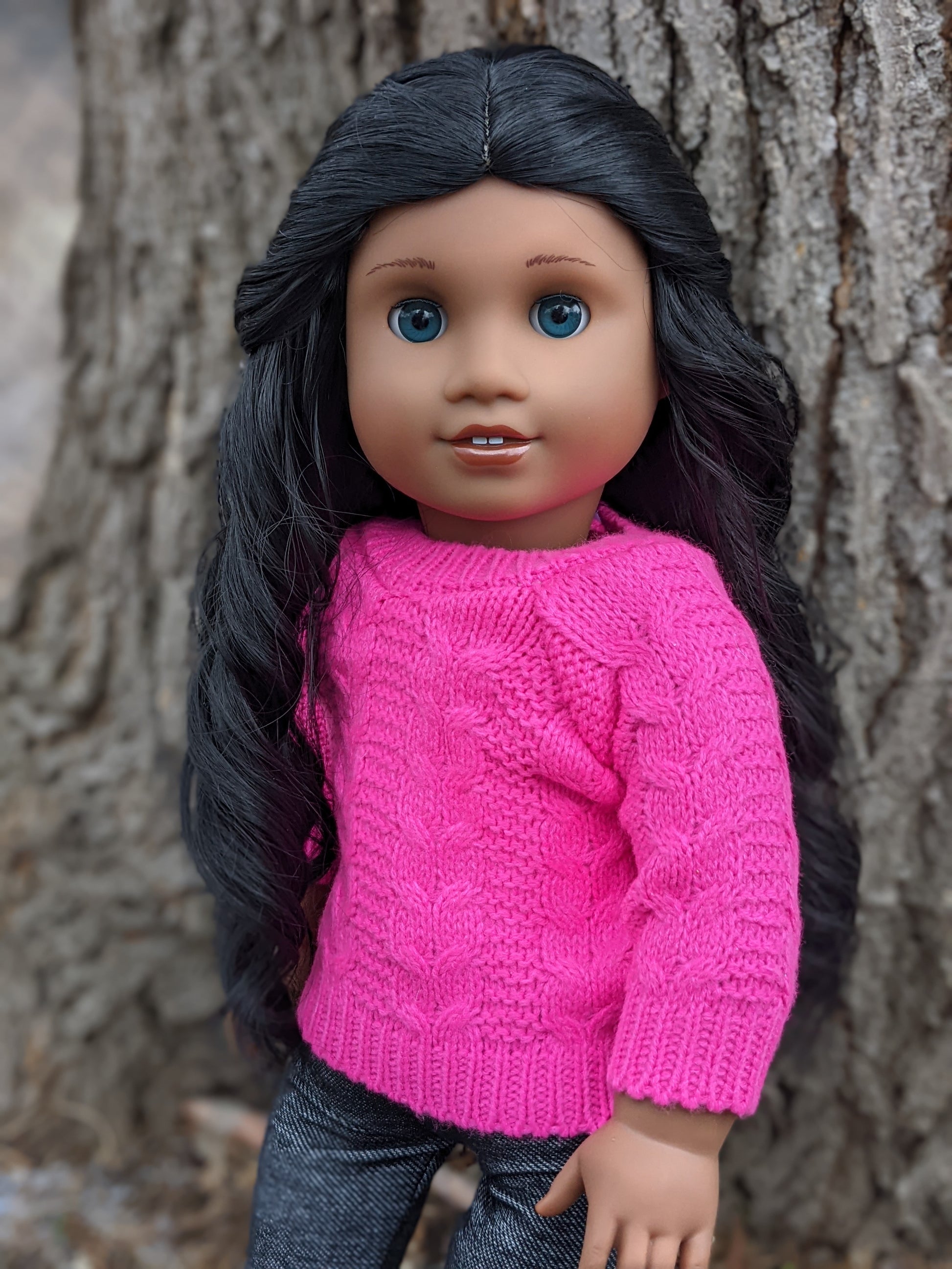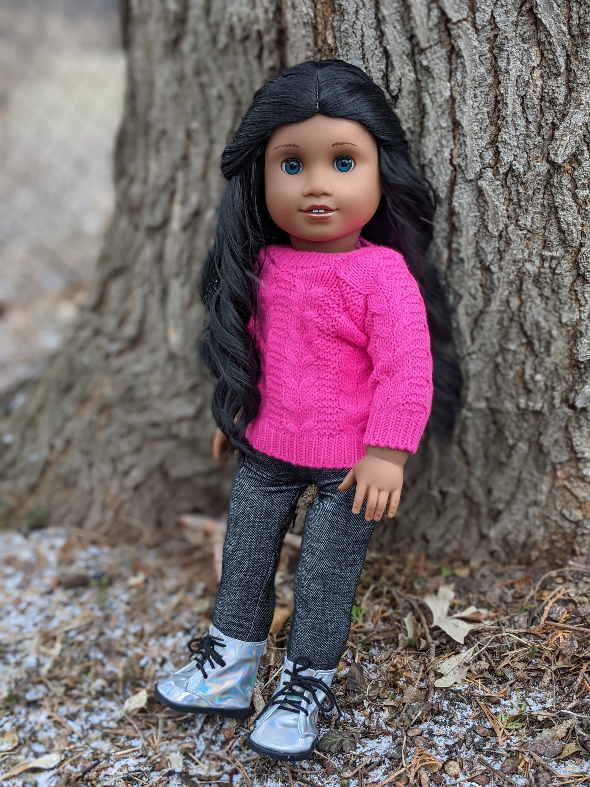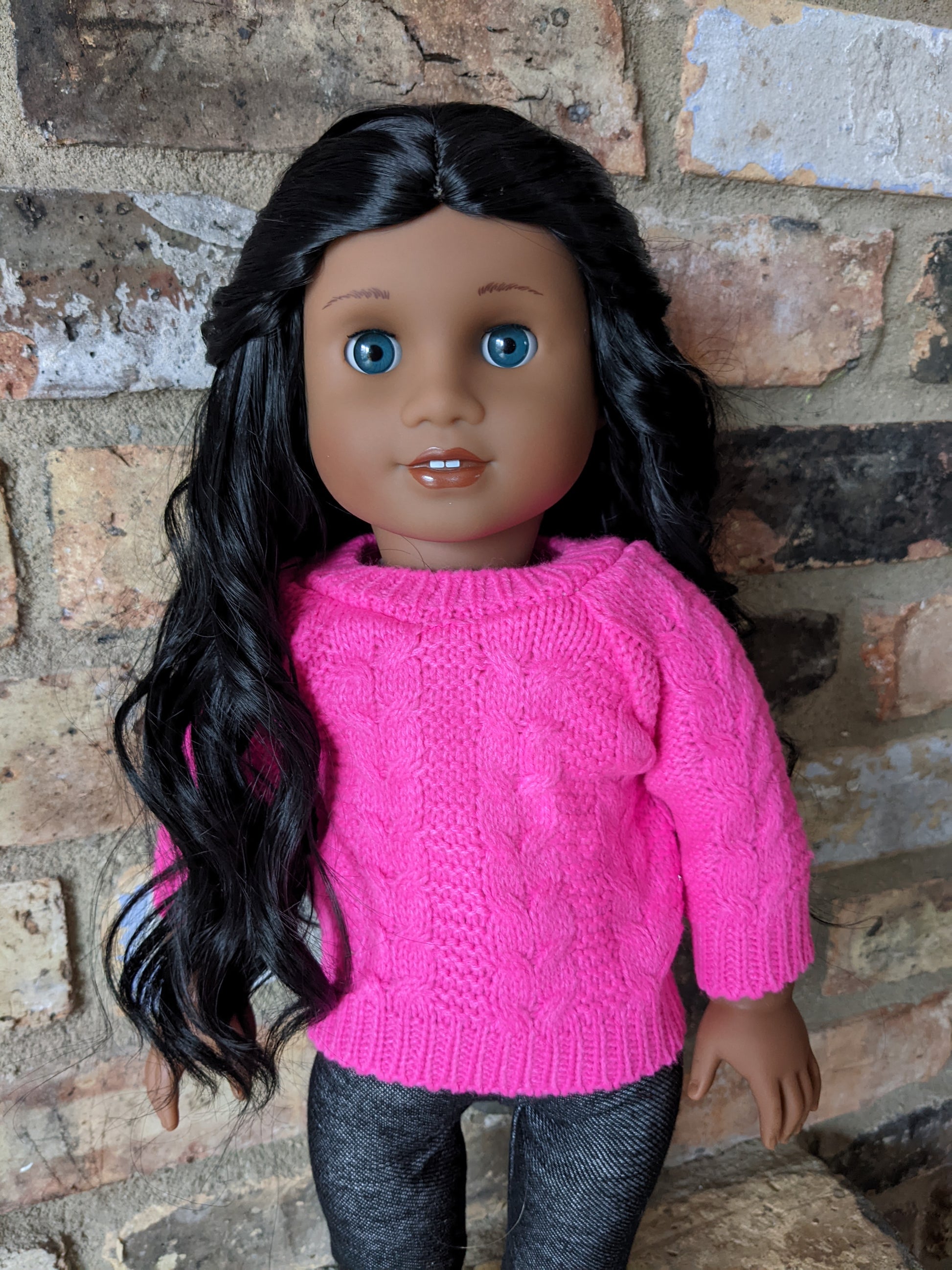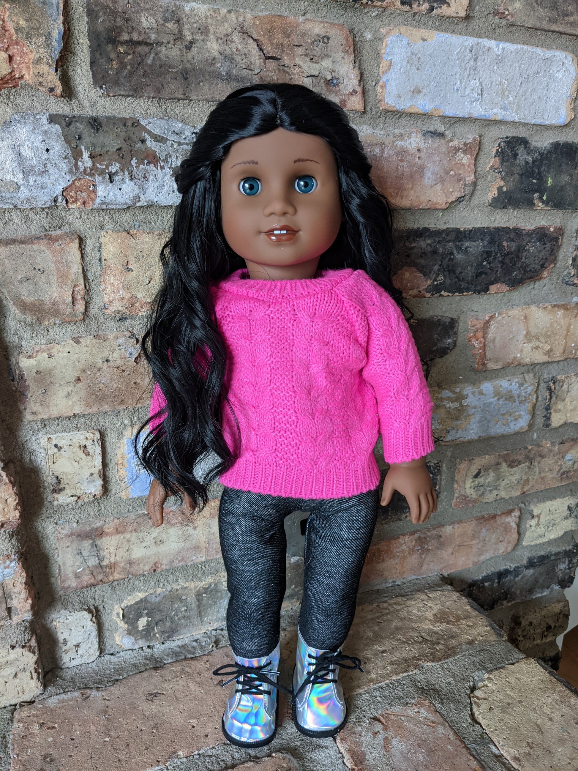 This one of a kind OOAK custom American Girl doll was created with a new Gabriela doll, dark blue eyes from a Kit doll, and a black curly wig. She has custom lip gloss painted and sealed. She may have some minor shine marks from handling and a tiny x on her bum. She comes with the outfit pictured. If you would like me to leave the wig unattached, please let me know by leaving a note in the "Order Special Instructions" box upon checkout. Otherwise I will attach the wig with a heavy duty permanent adhesive.
