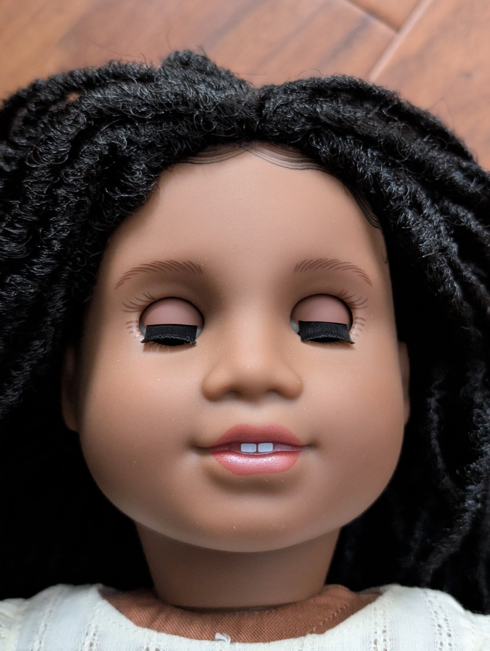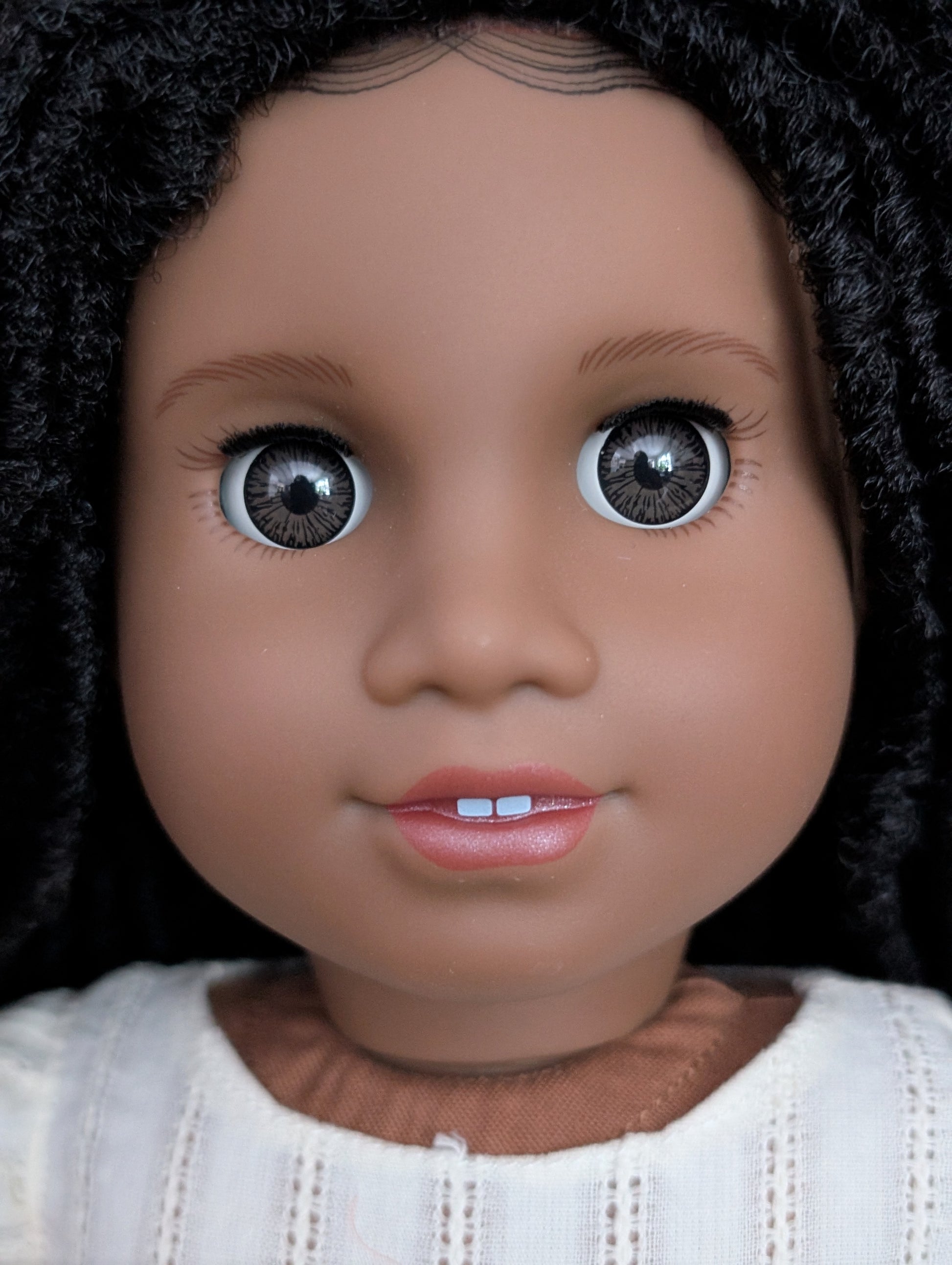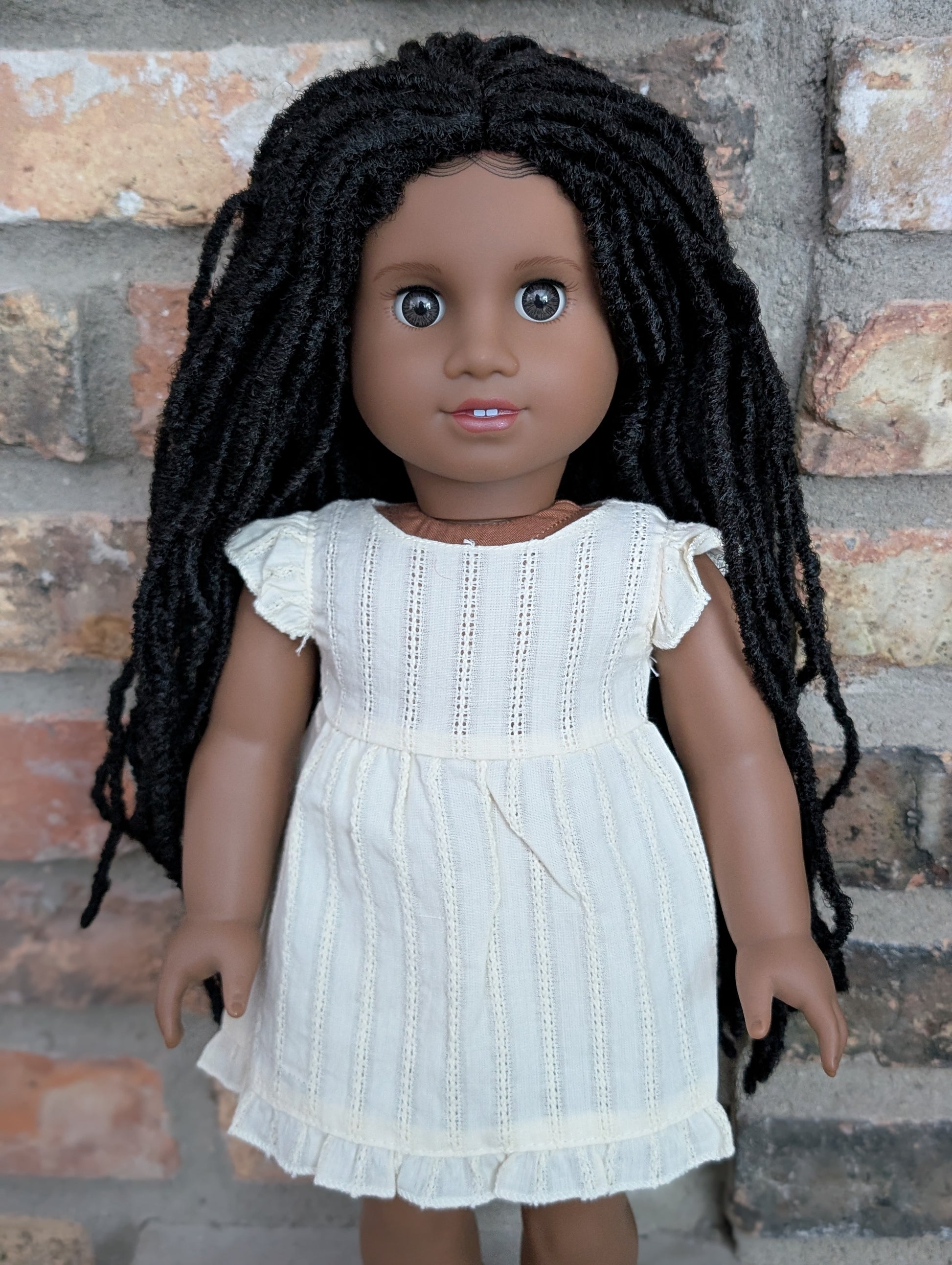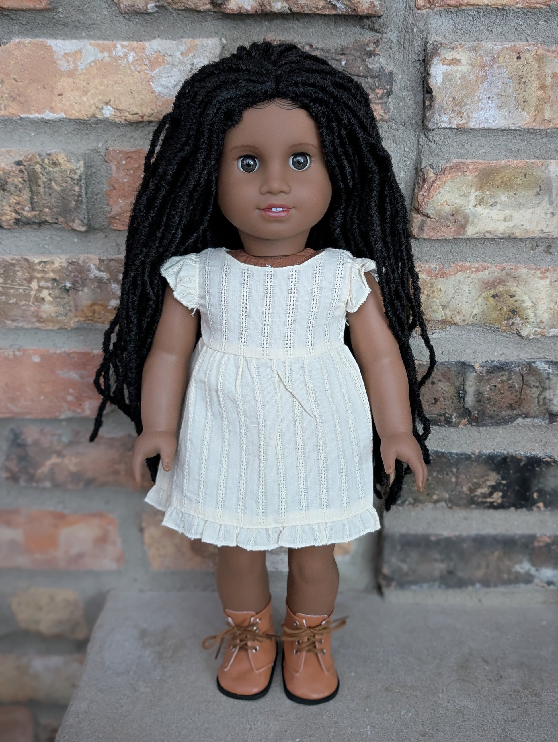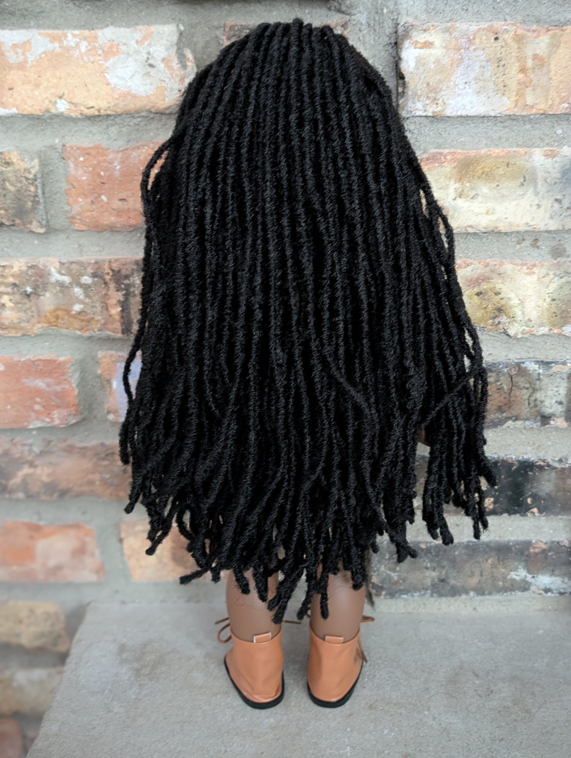 This one of a kind OOAK custom American Girl doll was created with a brand new doll, a black locs wig, and dark brown decal eyes from a Claudie doll. She may have some minor shine marks from handling. She comes with the outfit pictured.