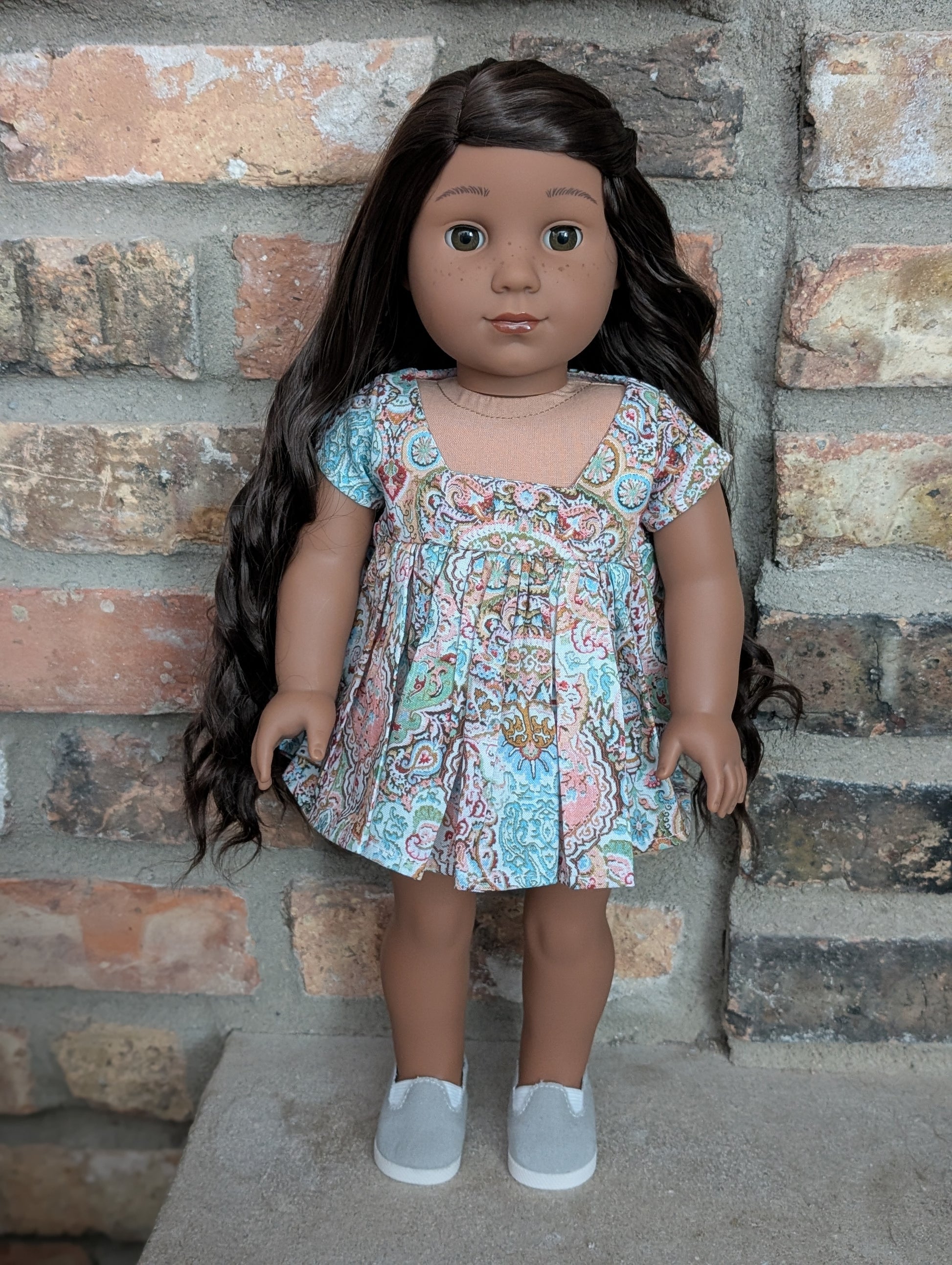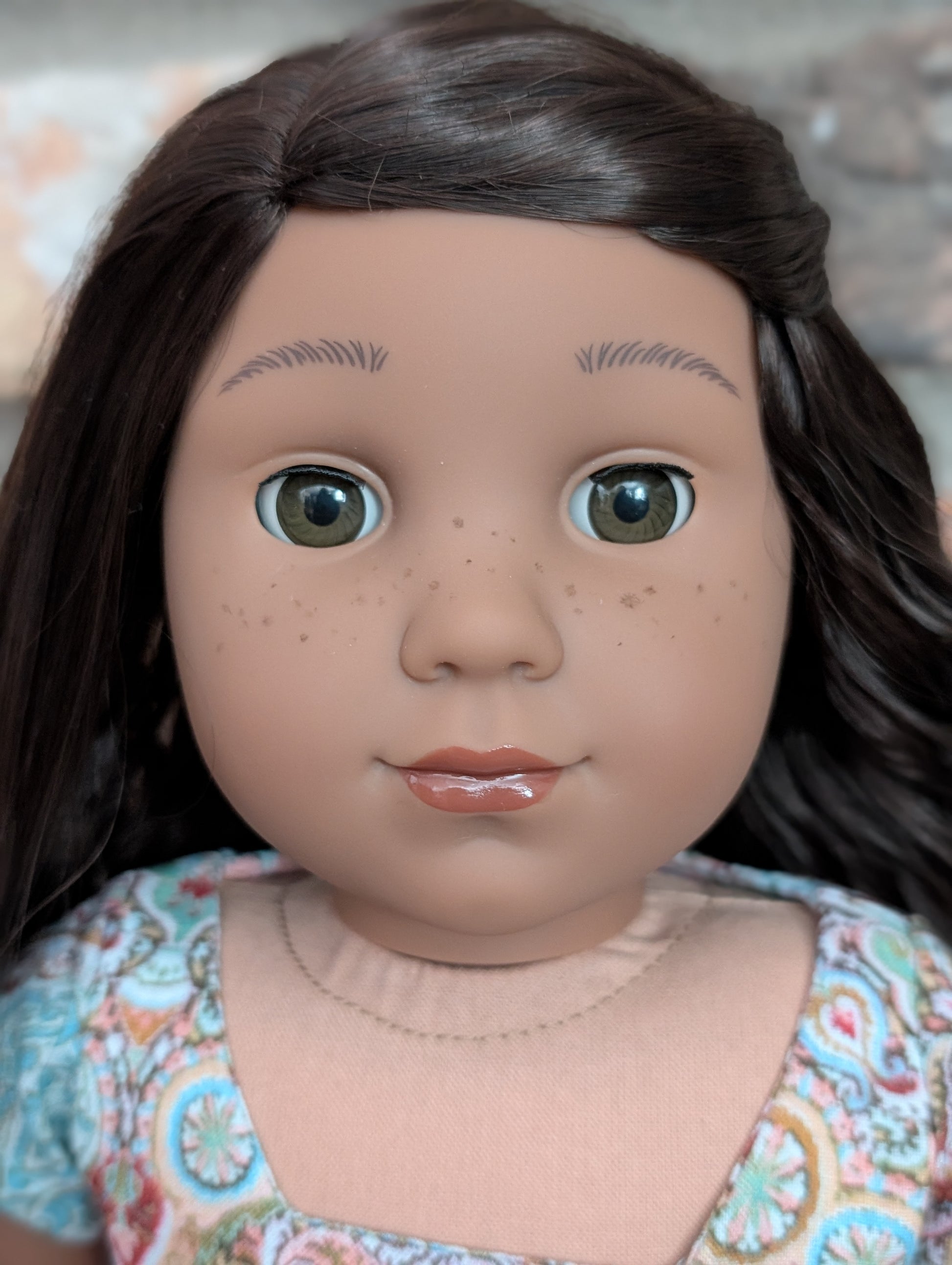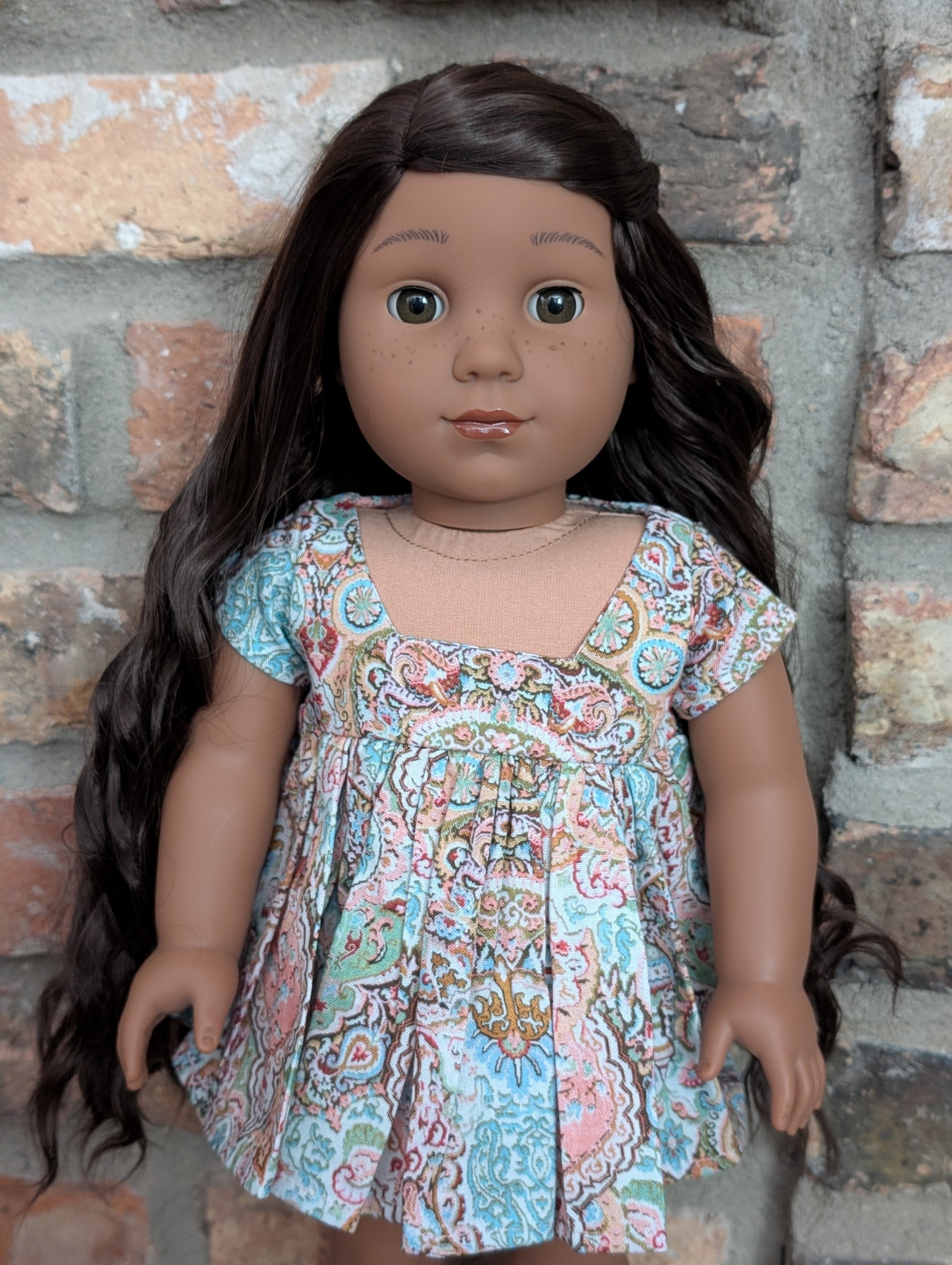 This one of a kind OOAK custom American Girl doll was created with a brand new Kaya doll, a brown wig, and amber eyes. She has lip gloss and freckles that were hand painted and sealed. She may have some minor shine marks from handling. She comes with the outfit pictured.