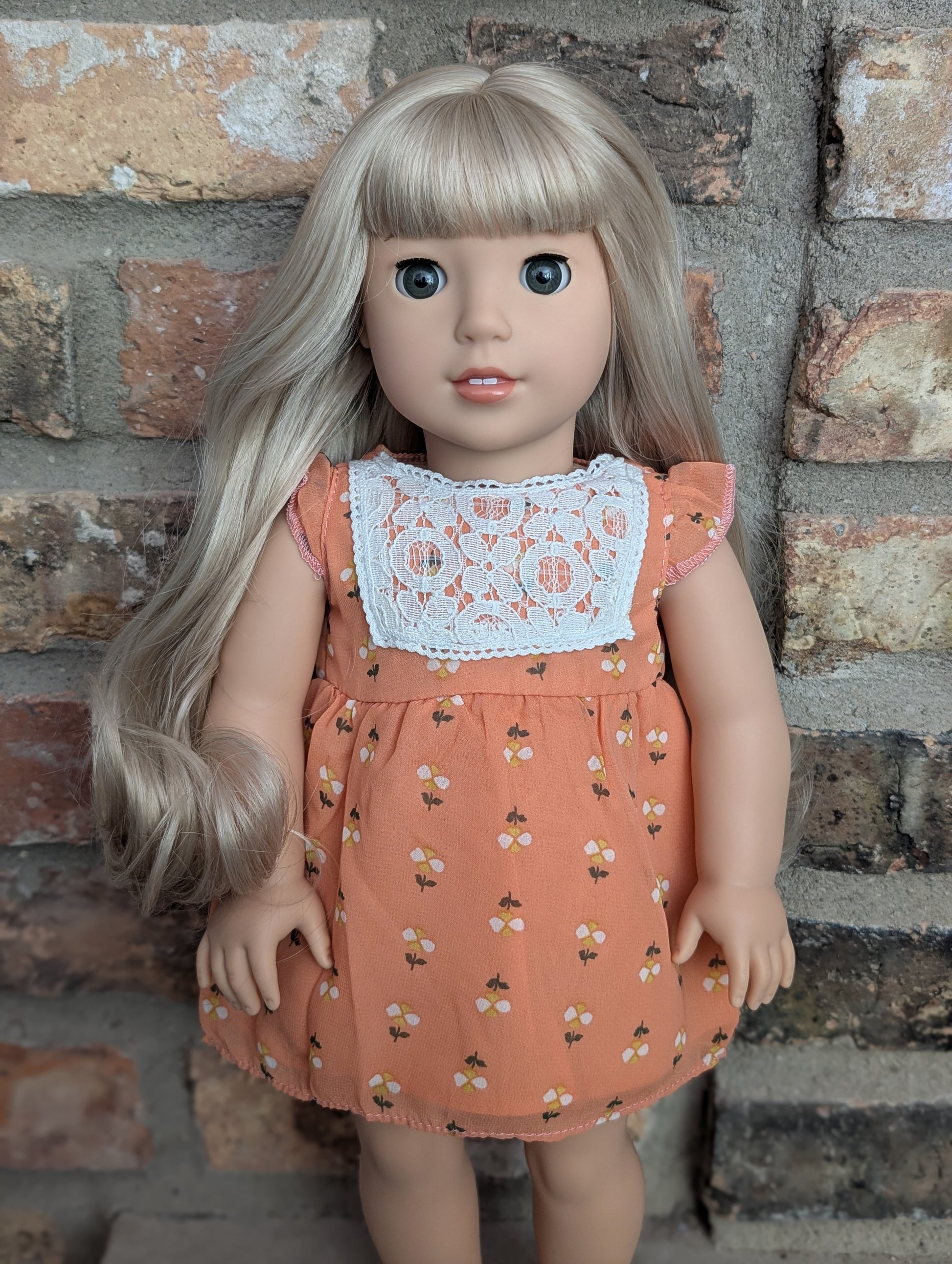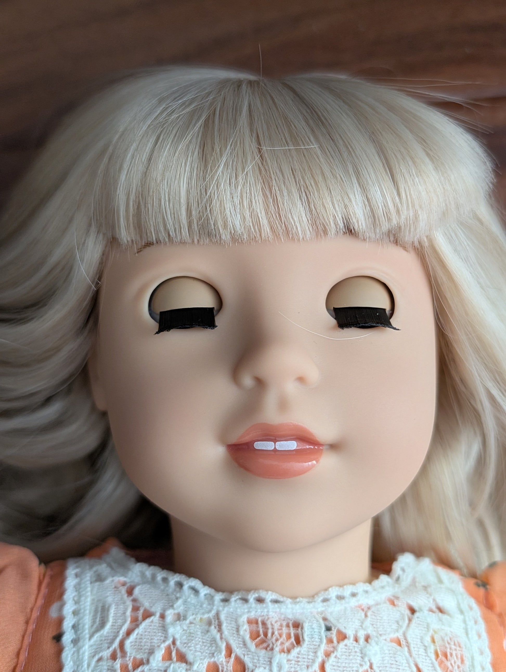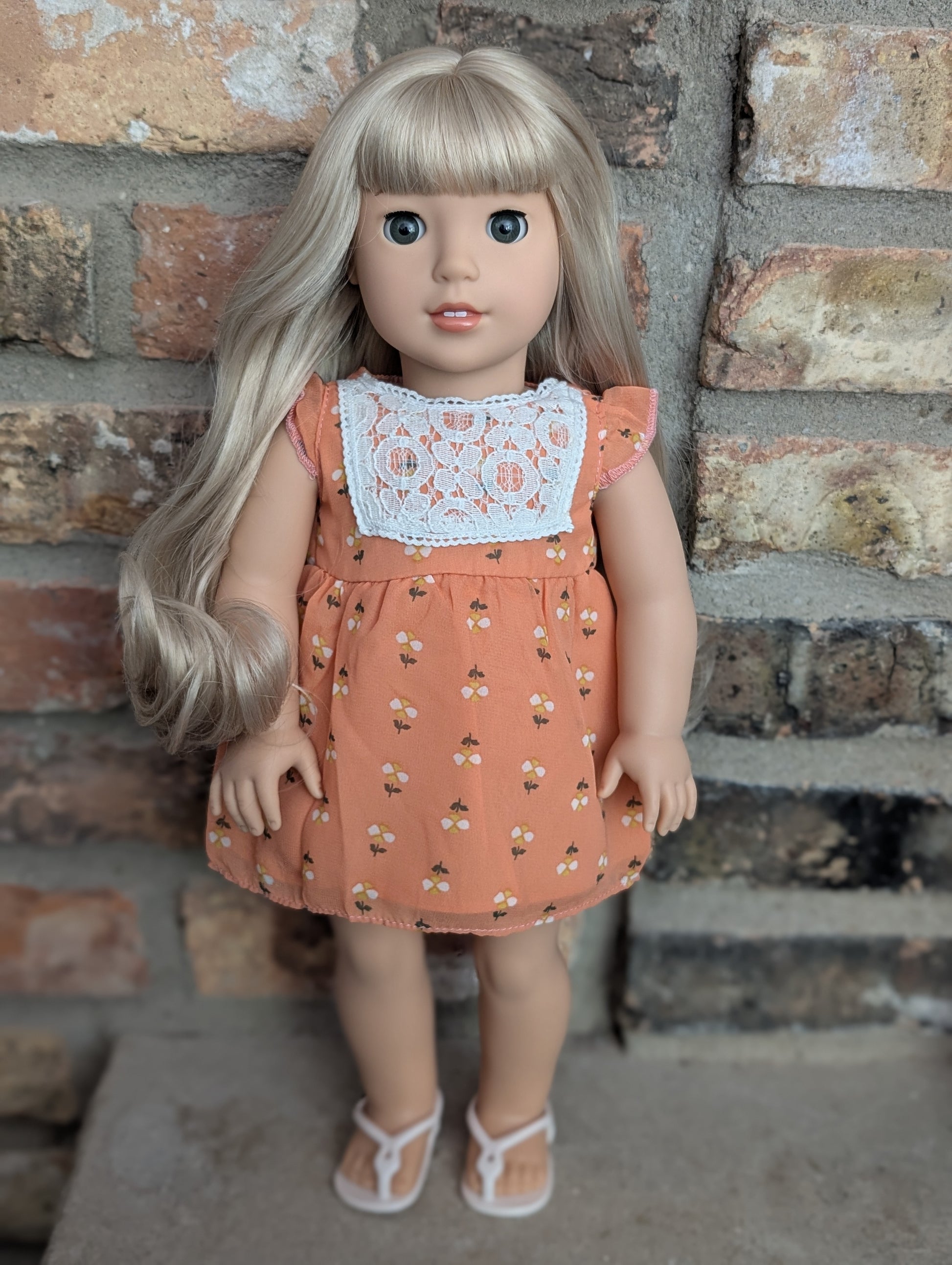 This one of a kind OOAK custom American Girl doll was created with a brand new doll, a blonde wig, and grey eyes. She has lip gloss that was hand painted and sealed. She may have some minor shine marks from handling. She comes with the outfit pictured.