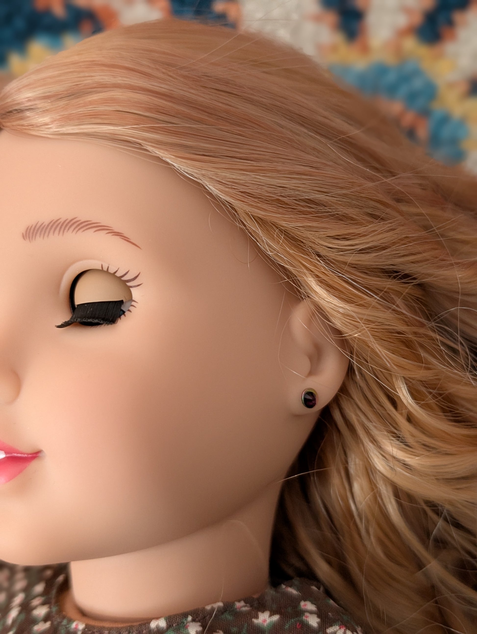 This one of a kind OOAK custom American Girl doll was created with a brand new Belle doll, a light red wig, and blue eyes. She may have some minor shine marks from handling. She comes with the outfit pictured. Her ears are pierced with American Girl doll sized earrings.