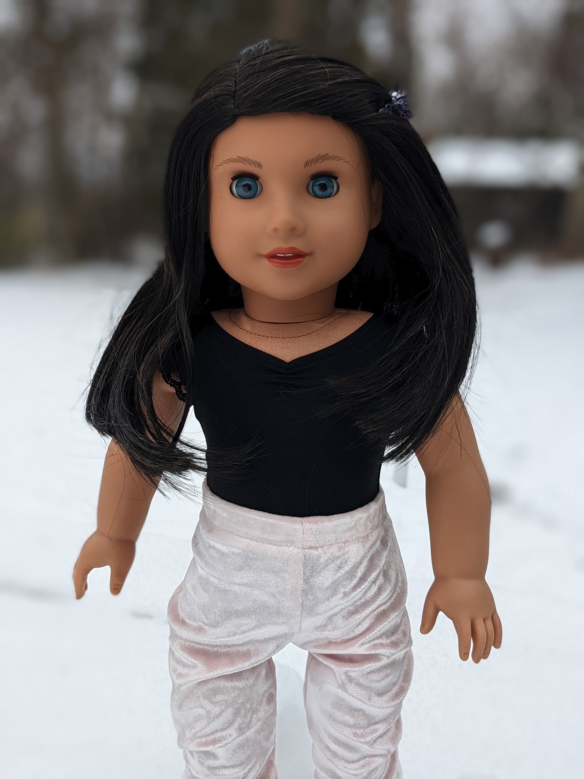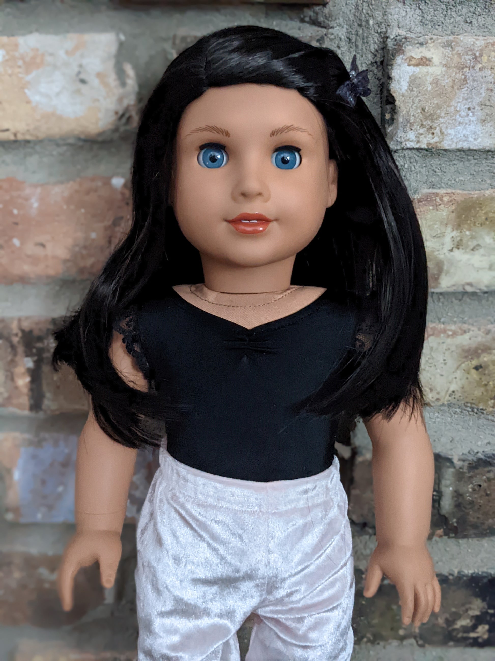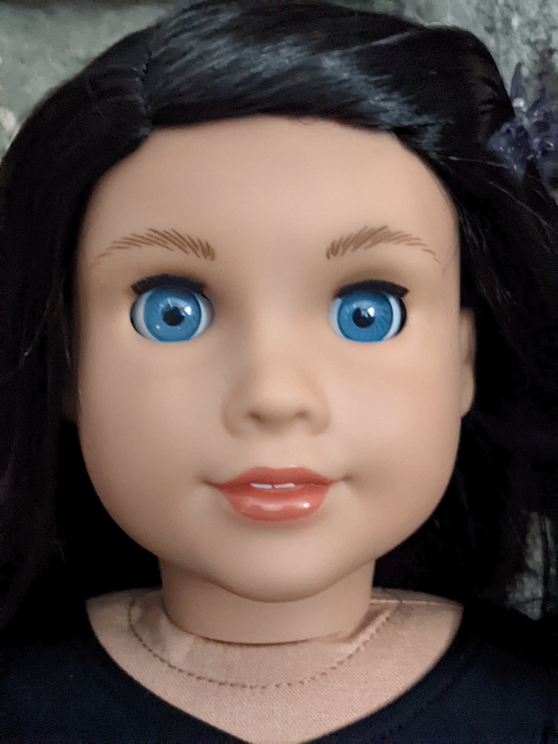 This one of a kind OOAK custom American Girl doll was created with a brand new Maritza doll, a black wig from a new TM doll, and blue eyes. She has lip gloss that was hand painted and sealed. She may have some minor shine marks from handling. She comes with the outfit pictured. Her painted on eyelashes have been removed.