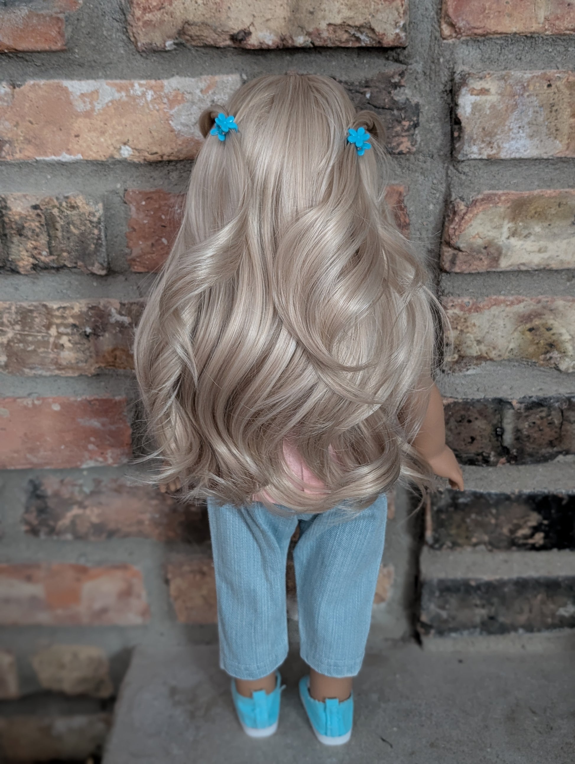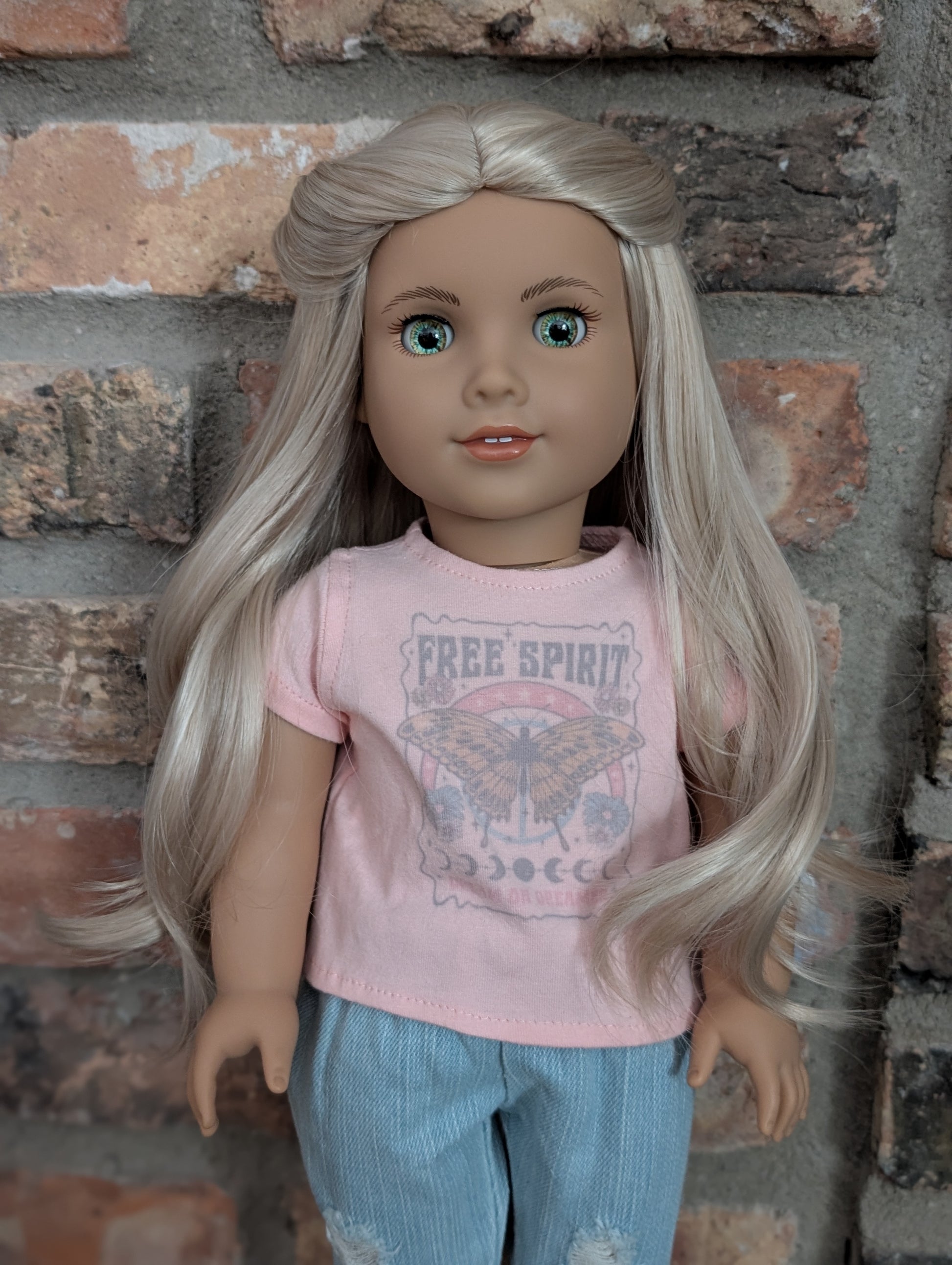 This one of a kind OOAK custom American Girl doll was created with a brand new doll, a blonde wig, and green eyes from Etsy. She has lip gloss that was hand painted and sealed. She may have some minor shine marks from handling. She comes with the outfit pictured.