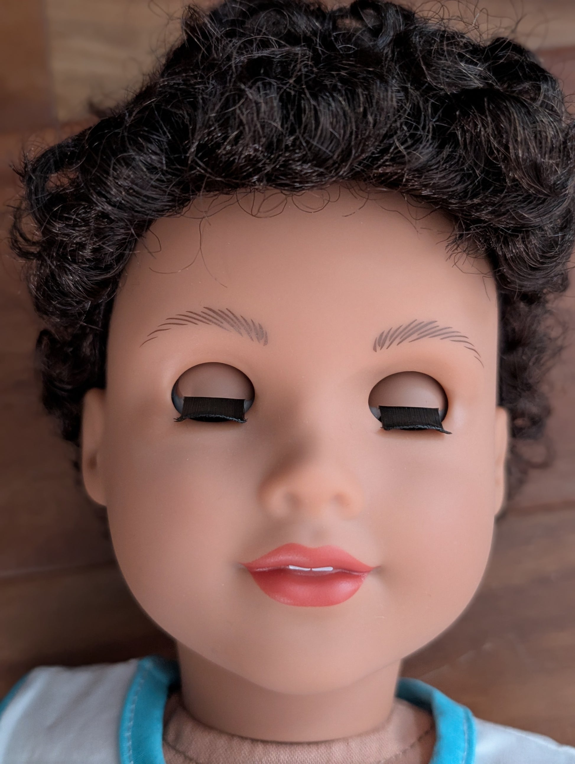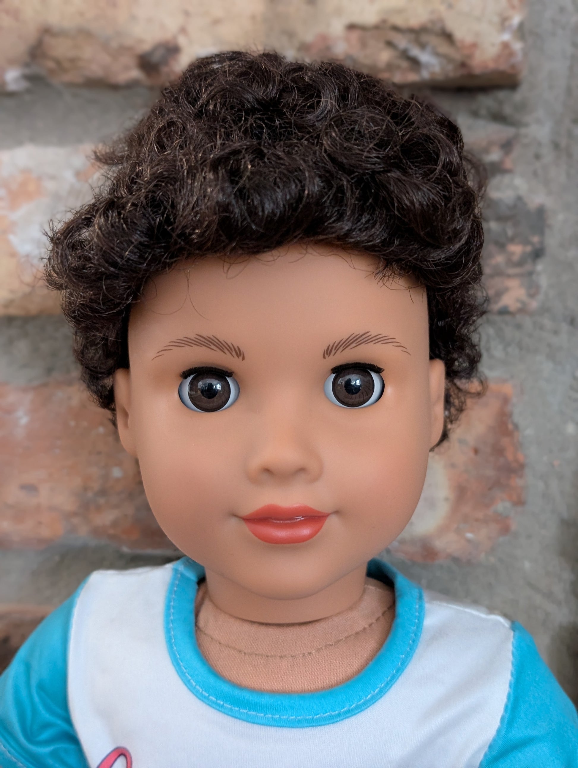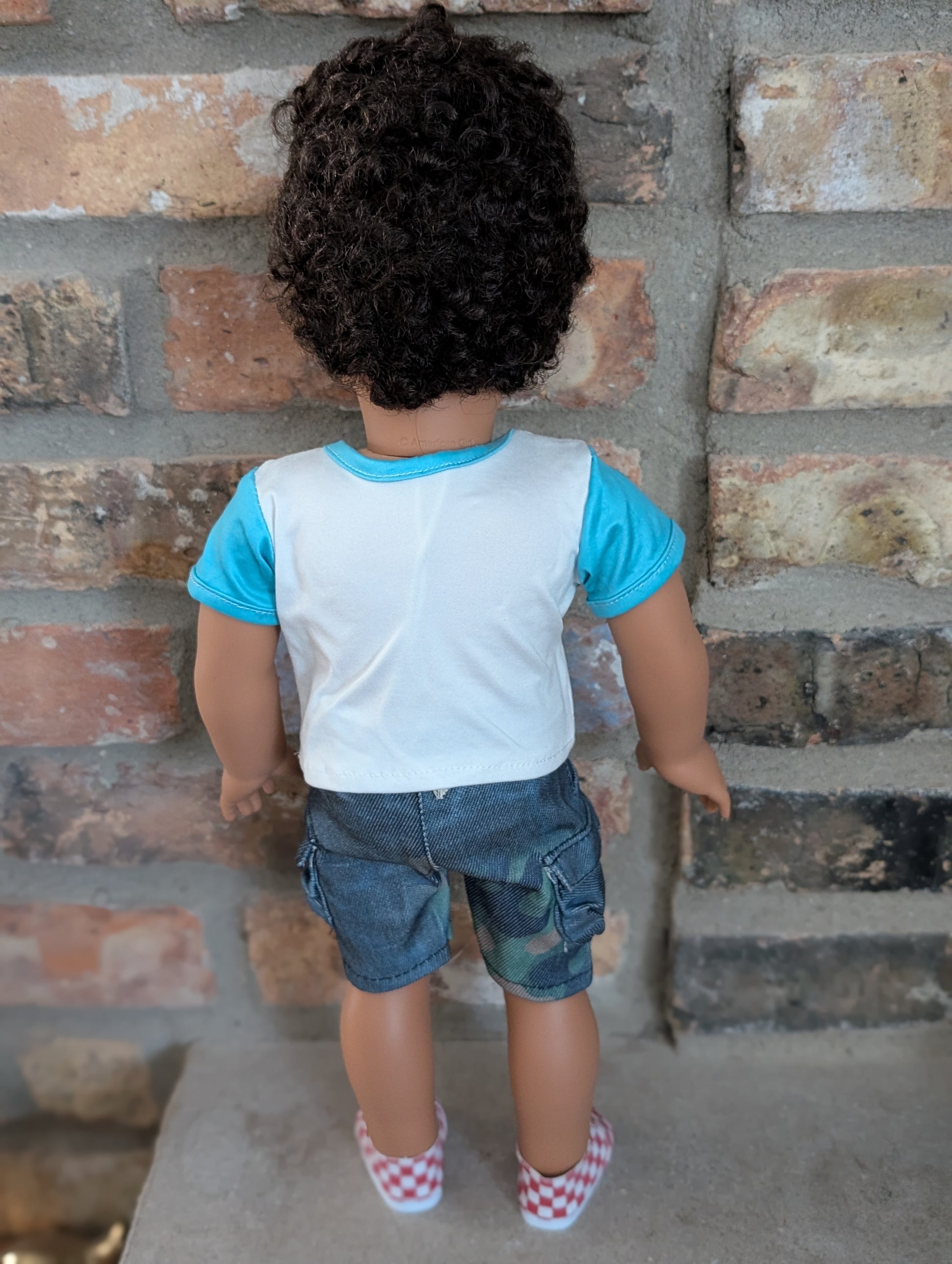 This one of a kind OOAK custom boy American Girl doll was created with a brand new doll, a brown, and brown eyes. He may have some minor shine marks from handling. He comes with the outfit pictured.