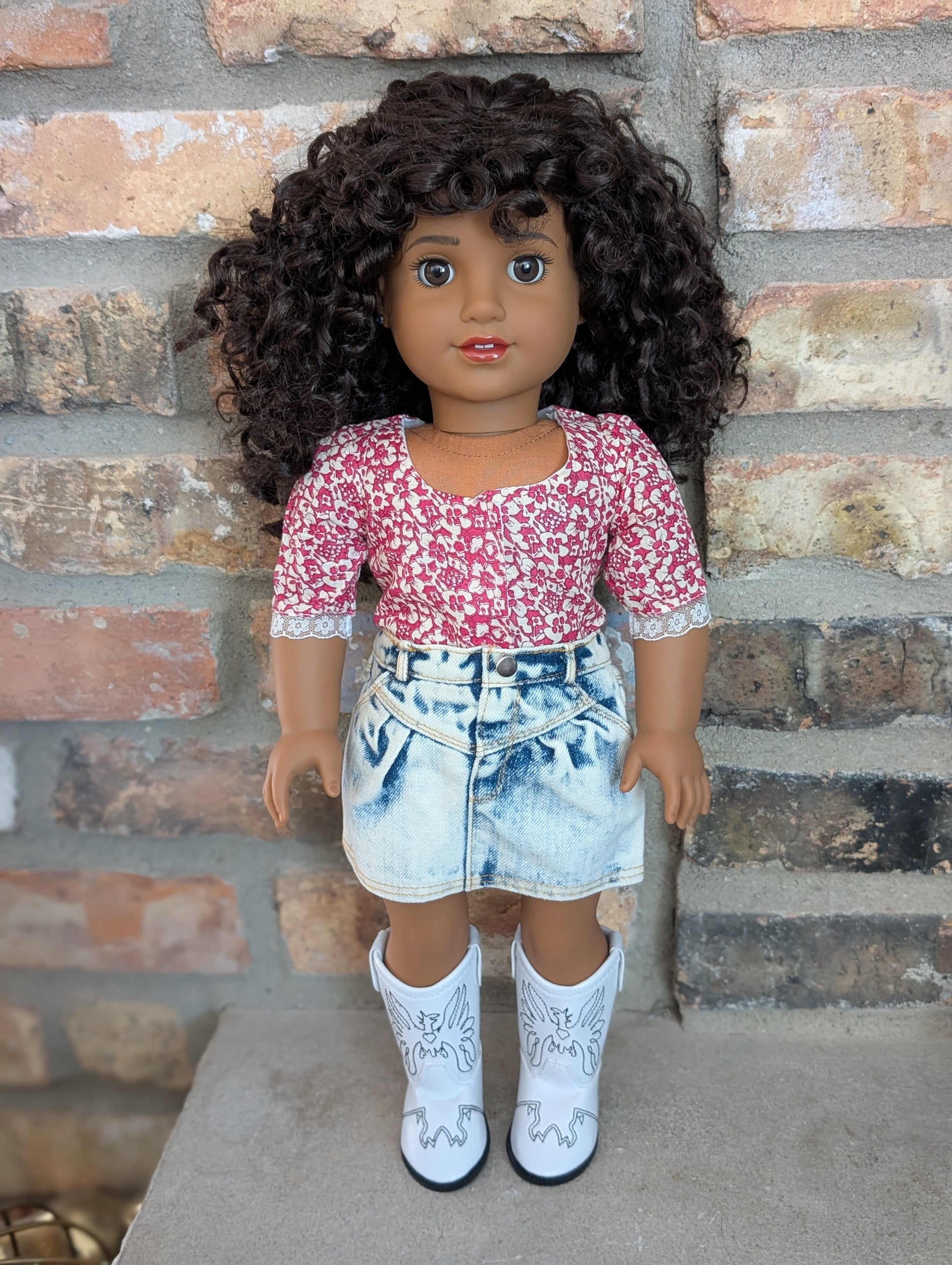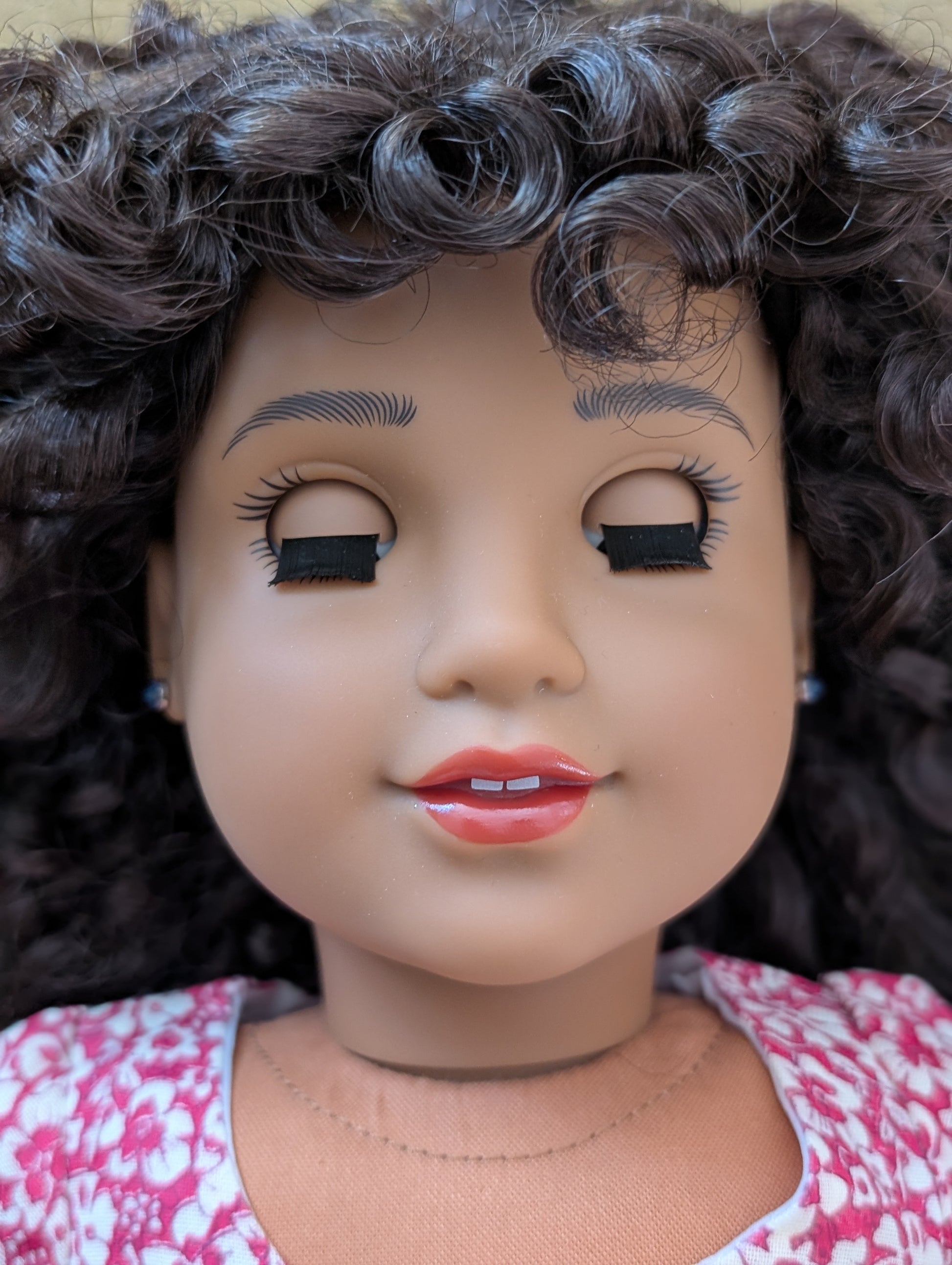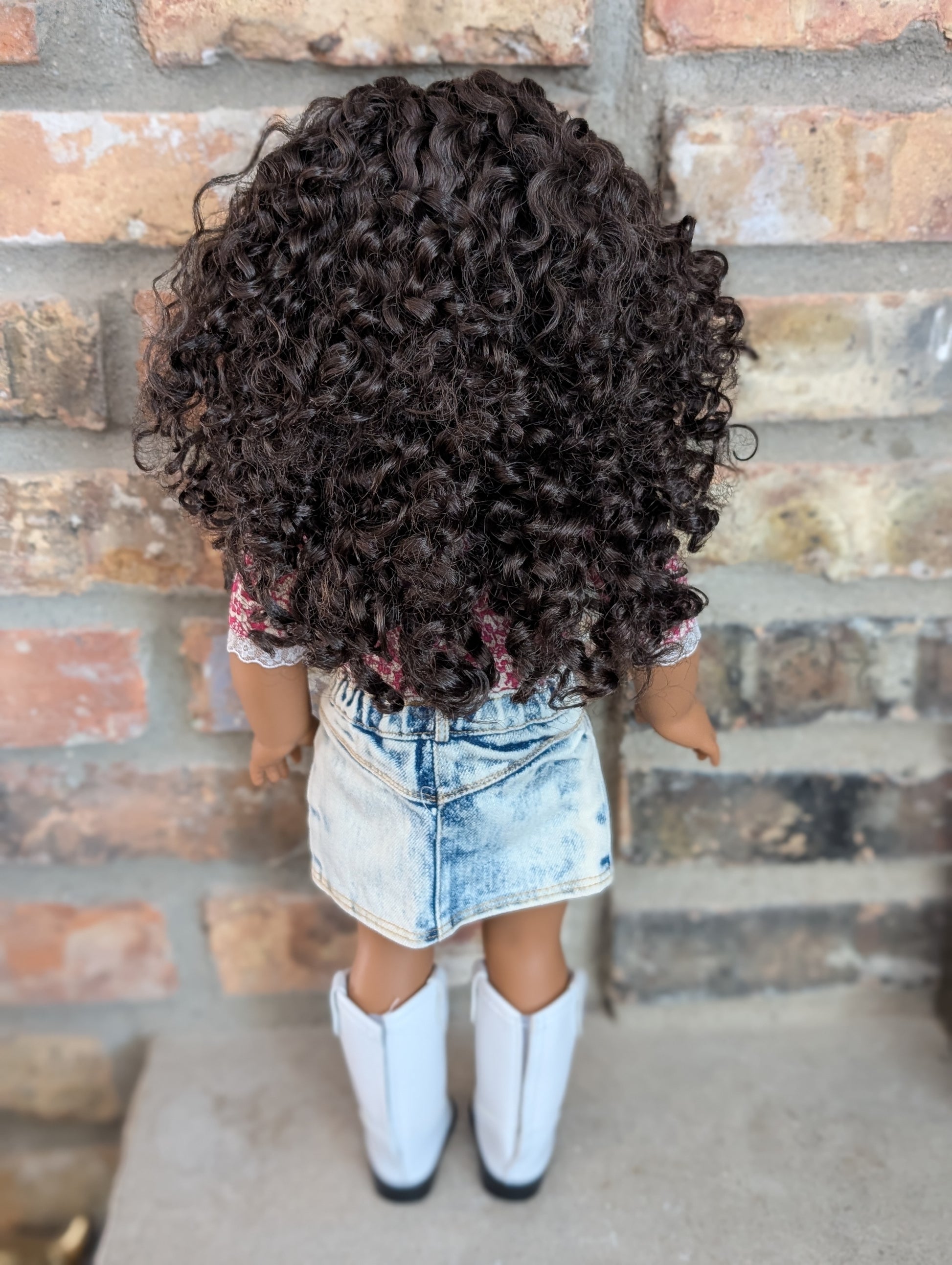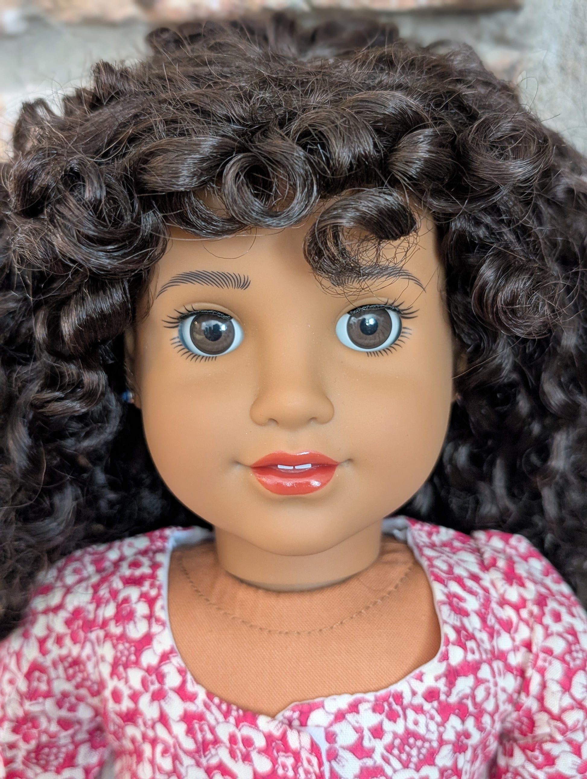 This one of a kind OOAK custom American Girl doll was created with a brand new Jasmine doll, a dark brown wig, and brown eyes. She has lip gloss that was hand painted and sealed. She may have some minor shine marks from handling. She comes with the outfit pictured. Her ears are pierced with American Girl doll sized earrings.