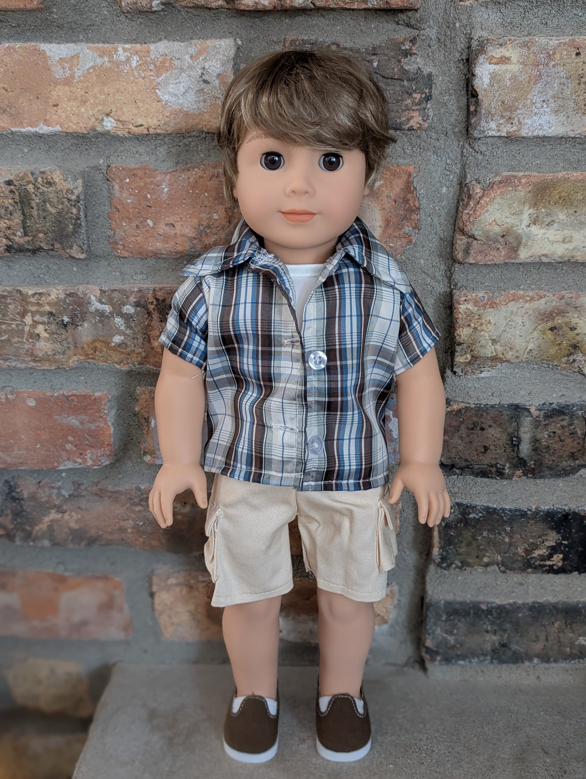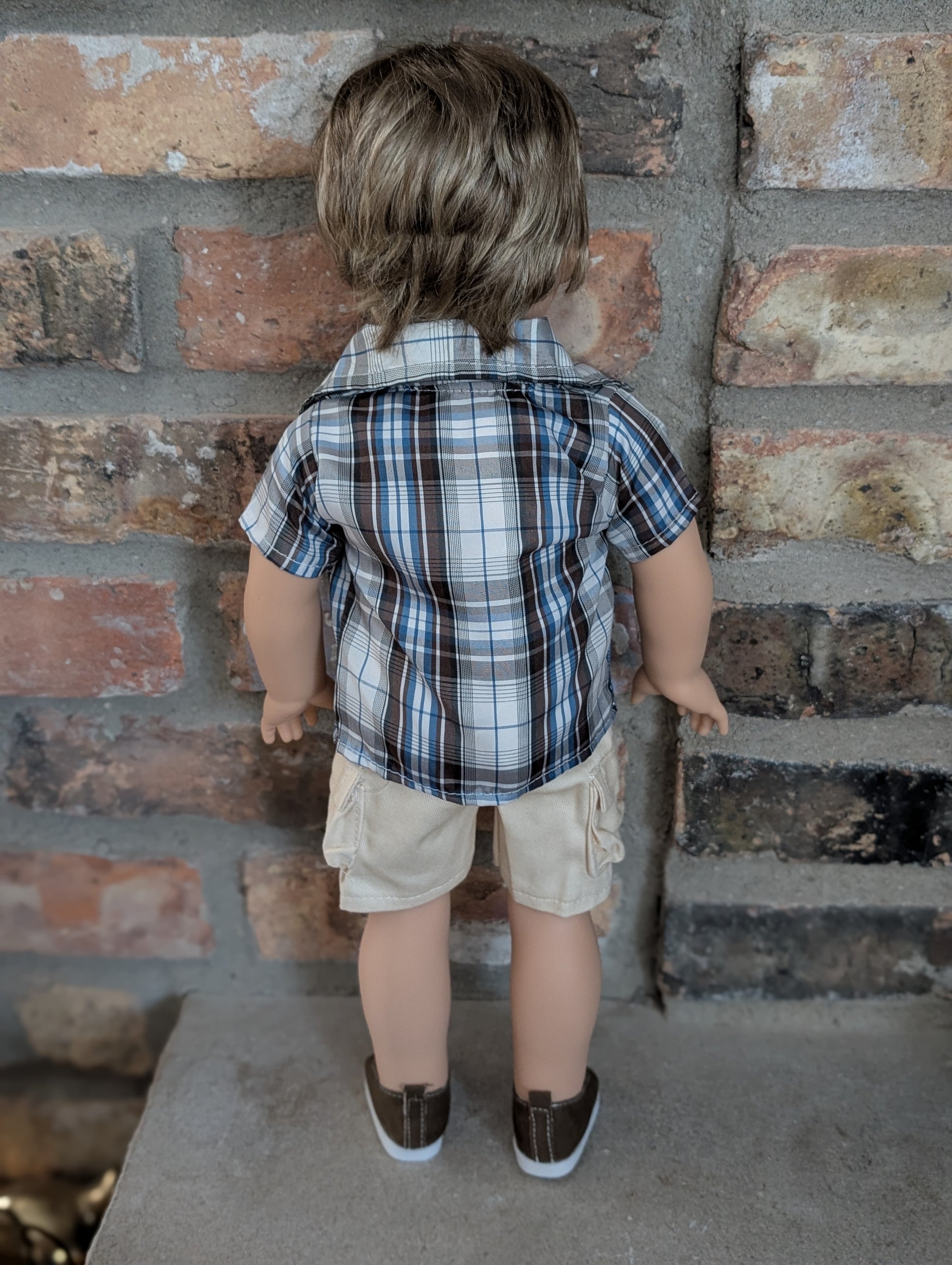 This one of a kind OOAK custom boy American Girl doll was created with a brand new doll, a brown with highlights, and brown eyes. He may have some minor shine marks from handling. He comes with the outfit pictured.