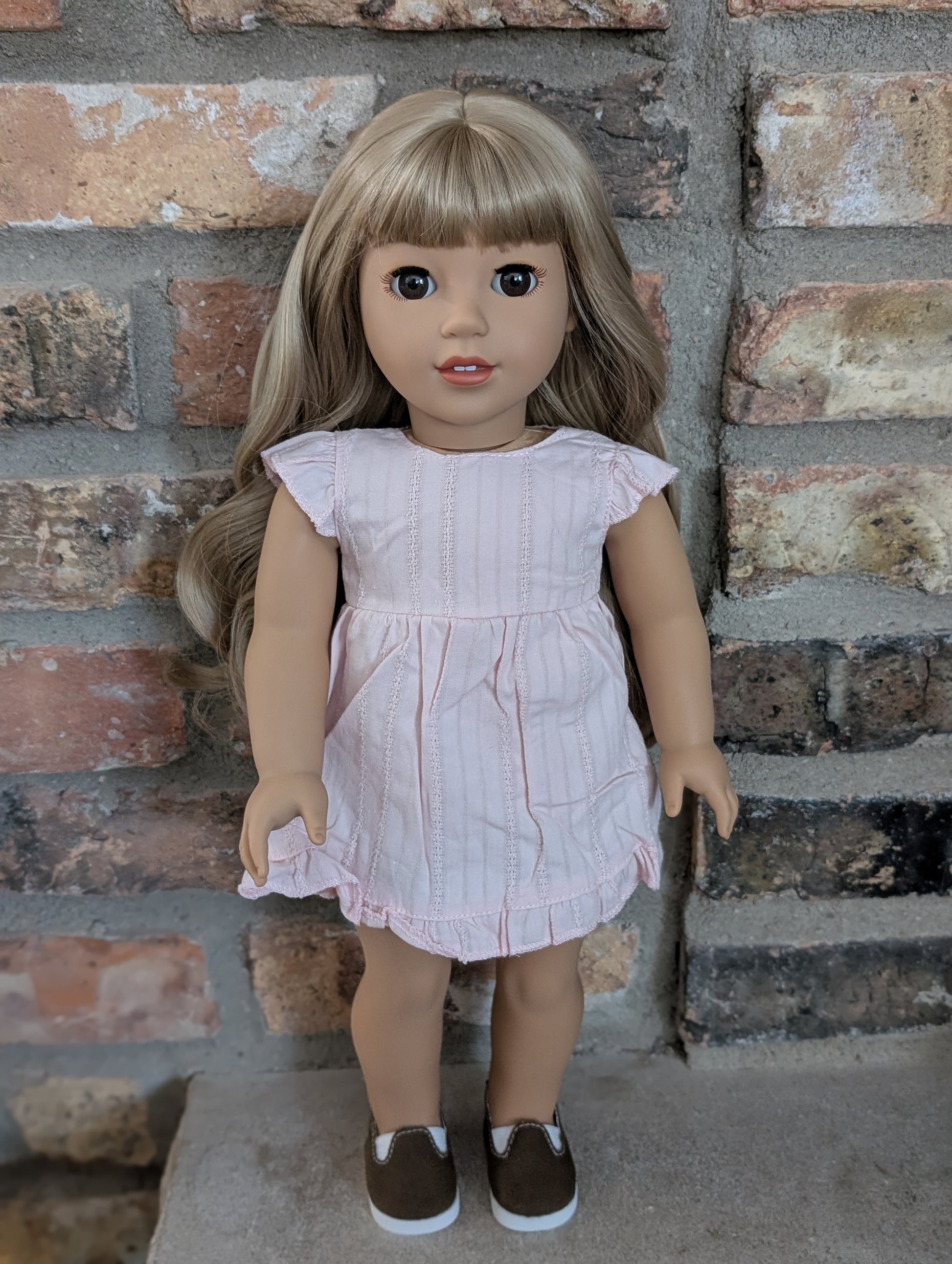 This one of a kind OOAK custom American Girl doll was created with a brand new doll, a blonde wig, and brown eyes. She may have some minor shine marks from handling. She comes with the outfit pictured.