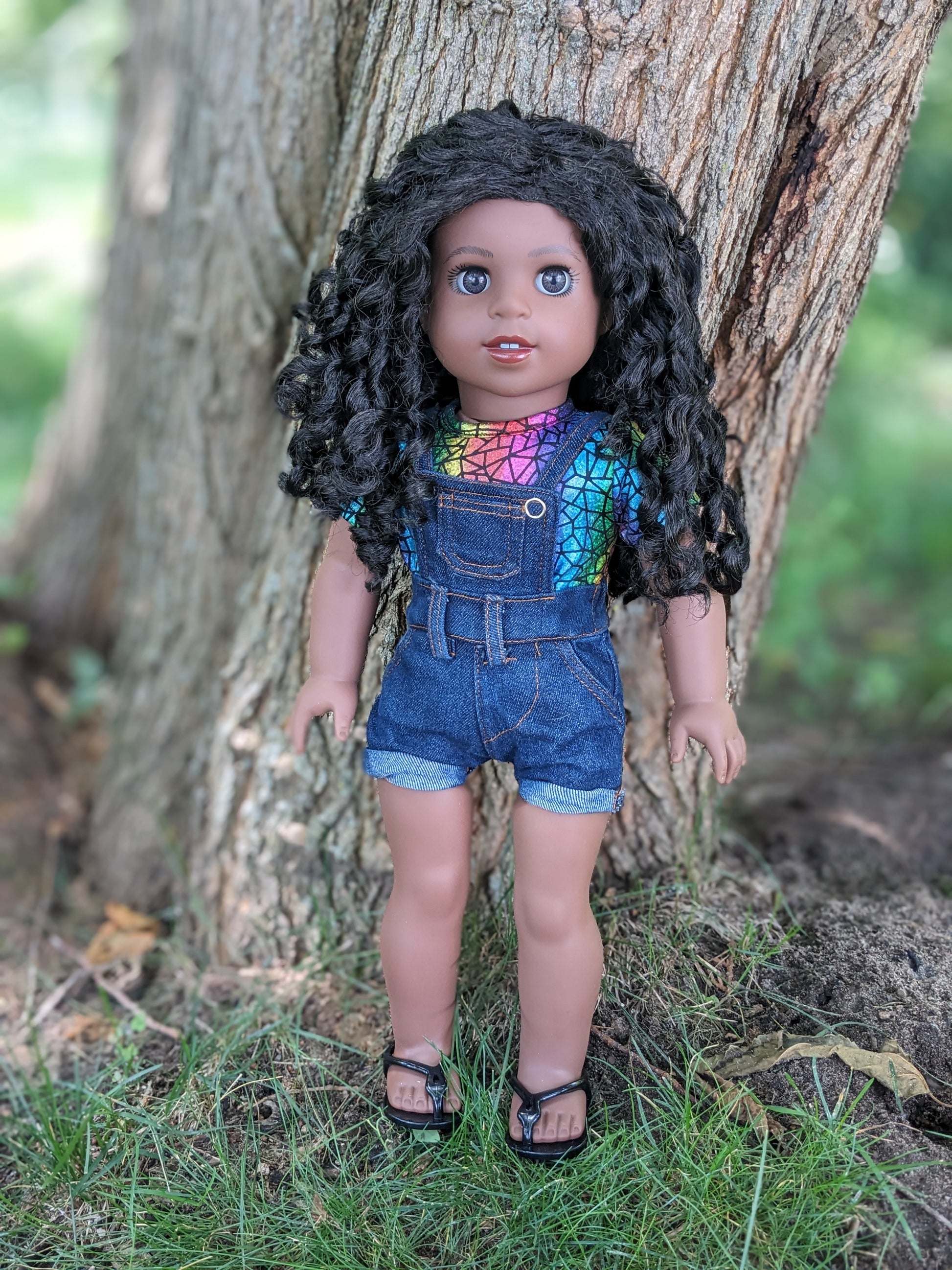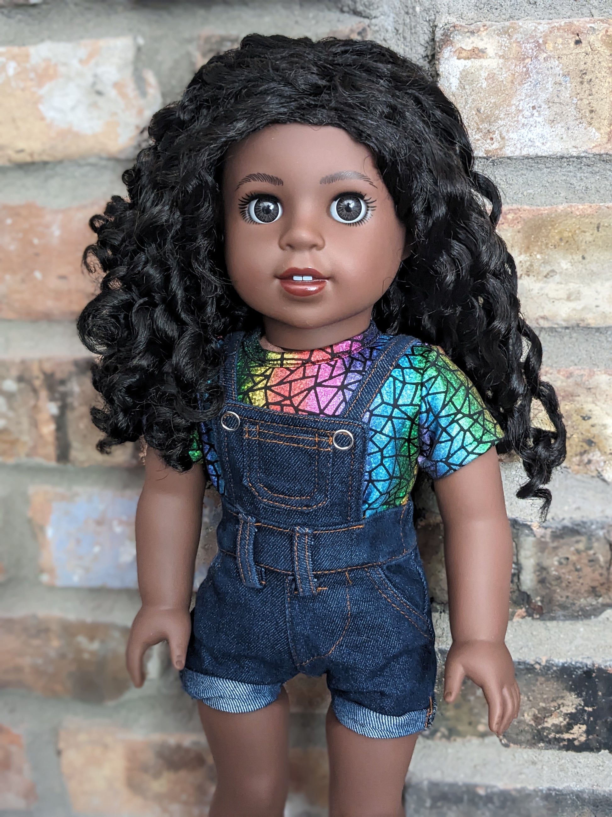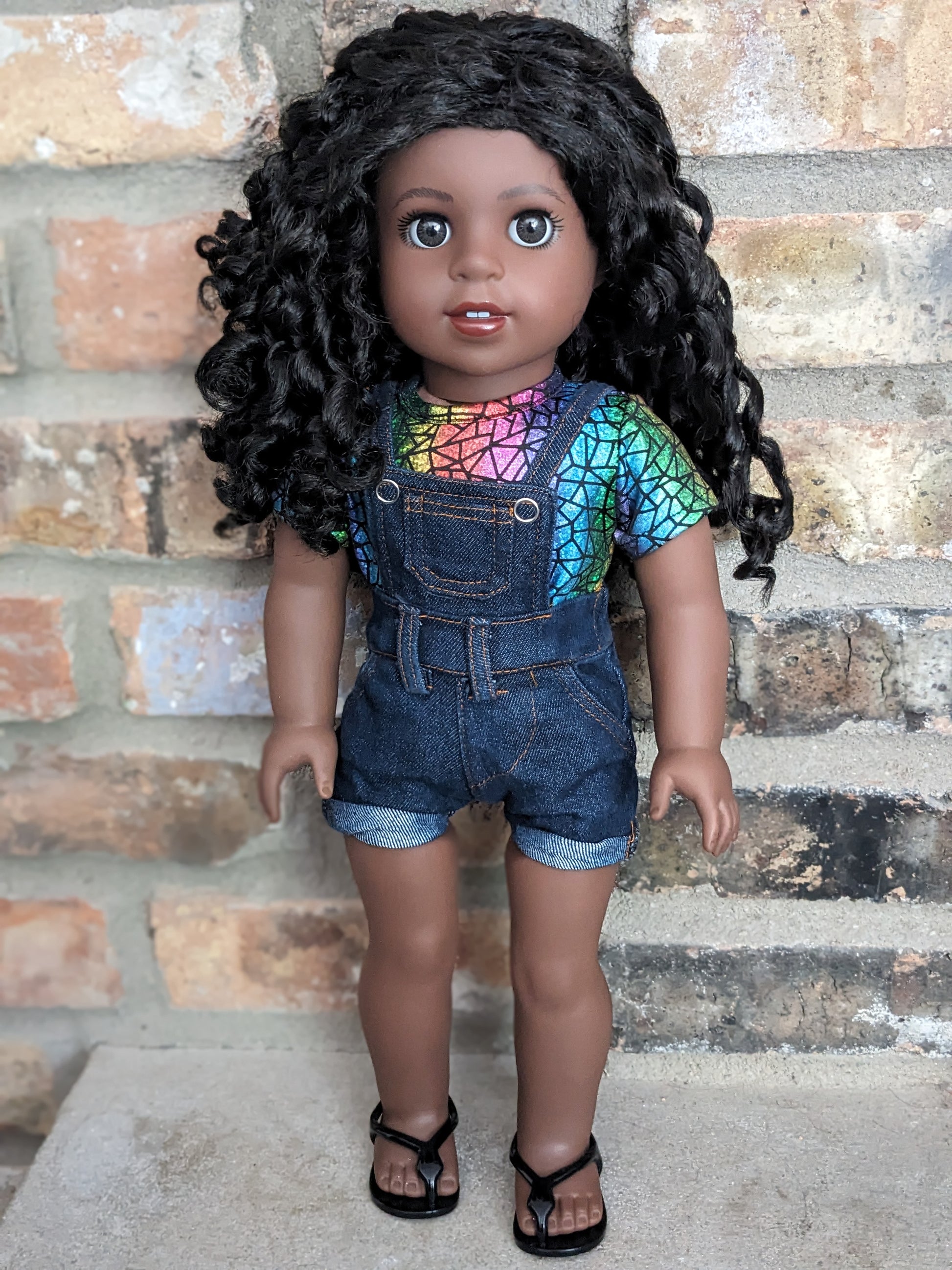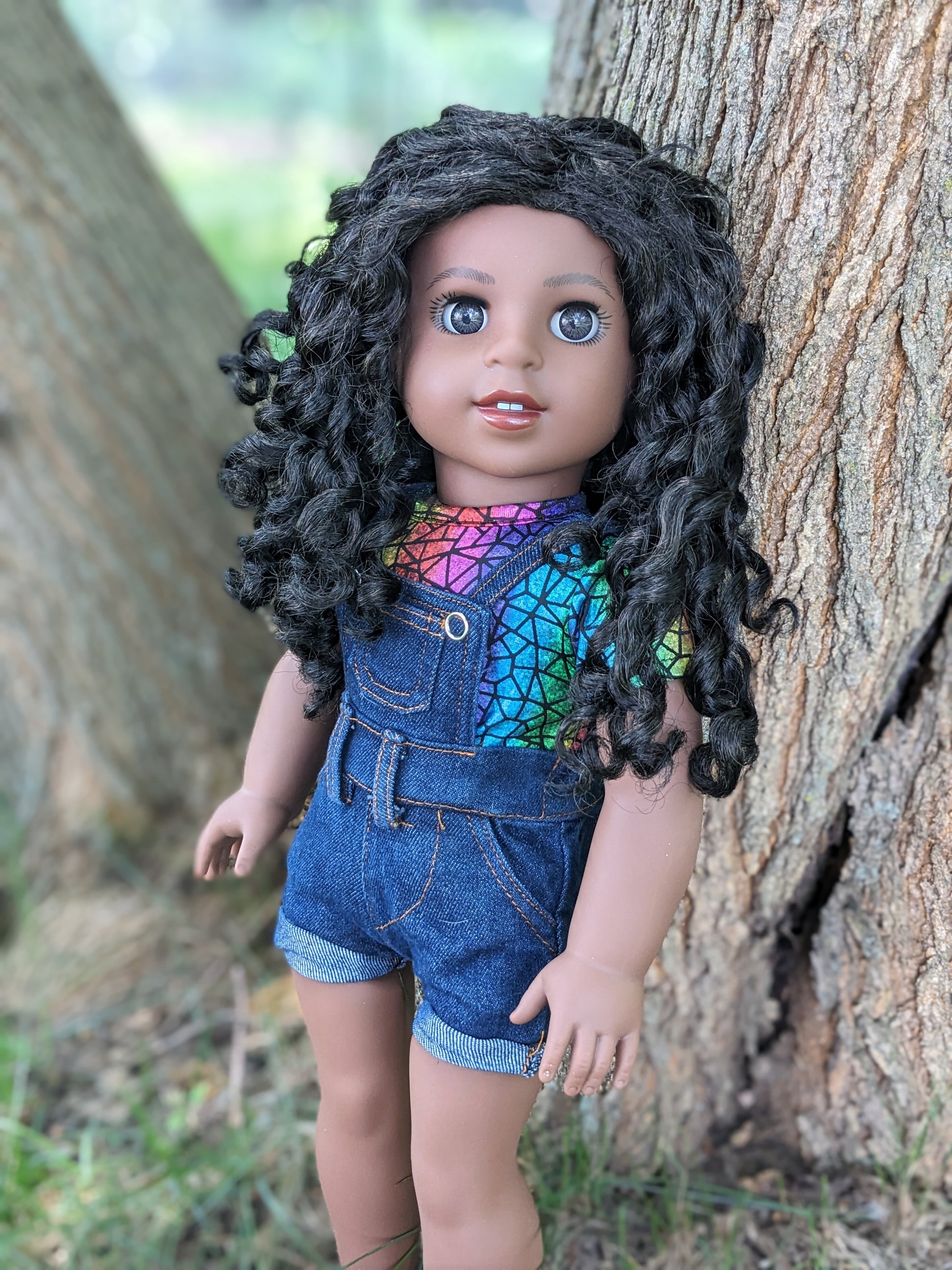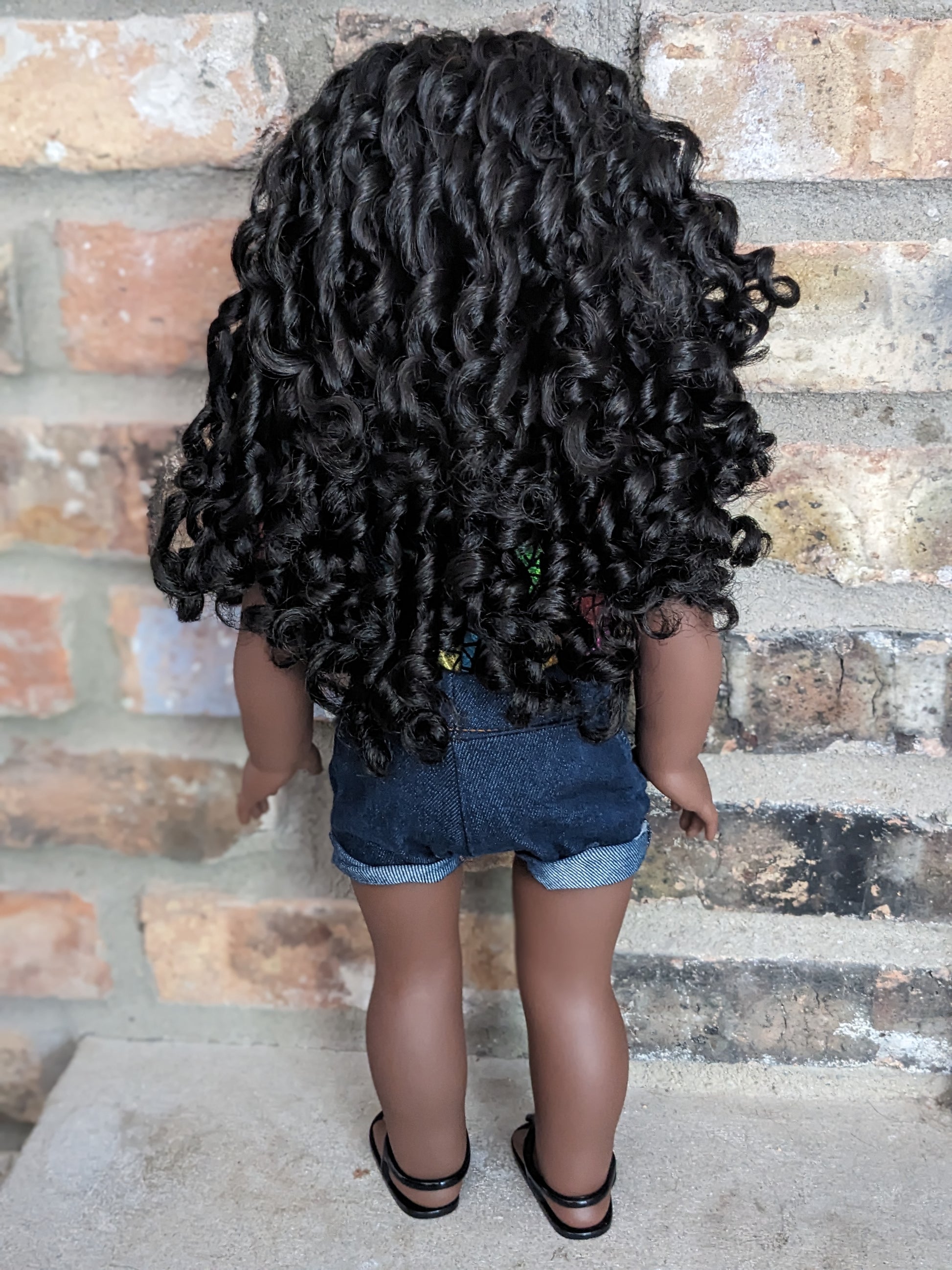 This one of a kind OOAK custom American Girl doll was created with a new doll, a black wig, and brown decal eyes. She has lip gloss that was hand painted and sealed. She may have some minor shine marks from handling. She comes with the outfit pictured.
