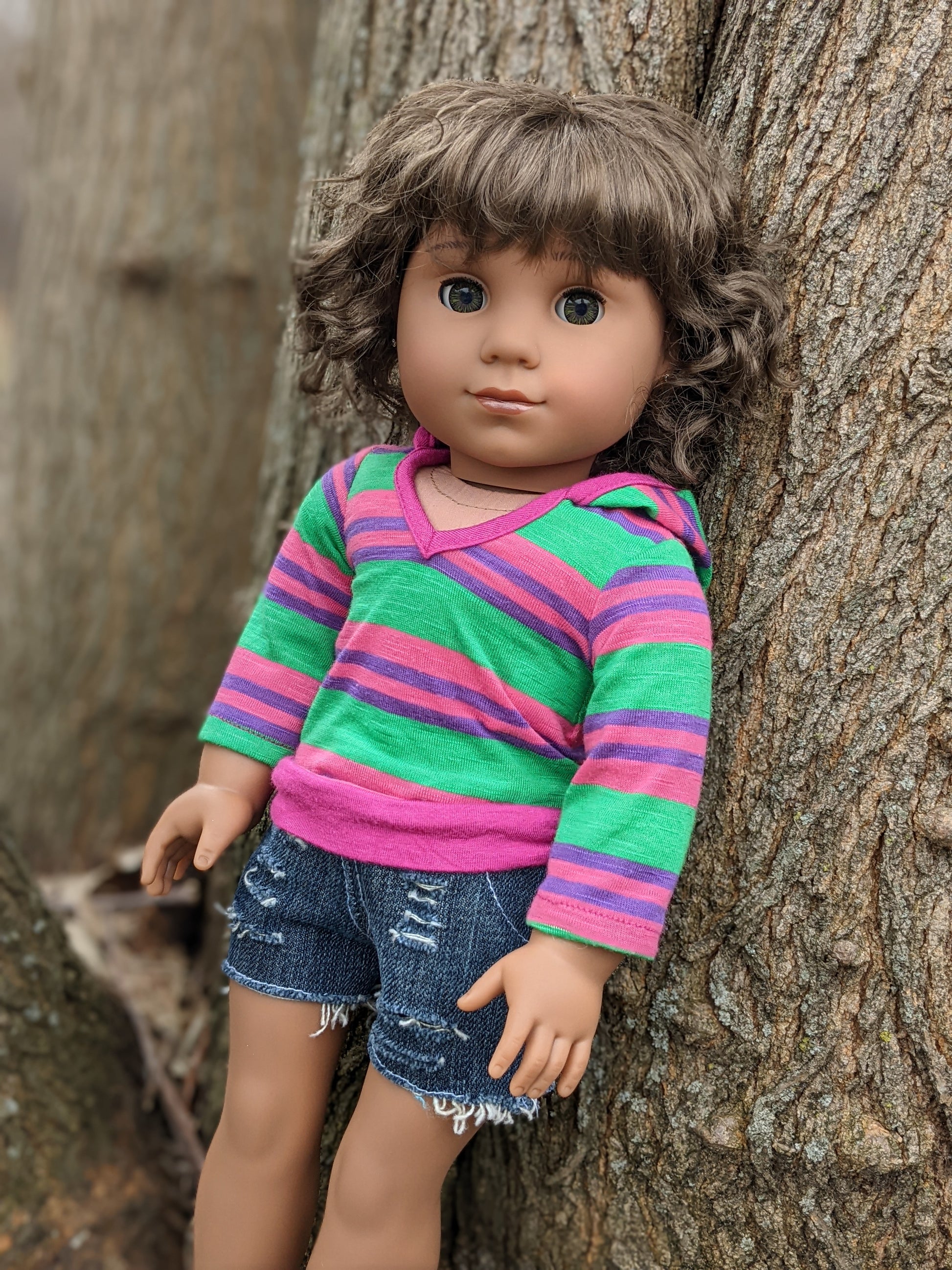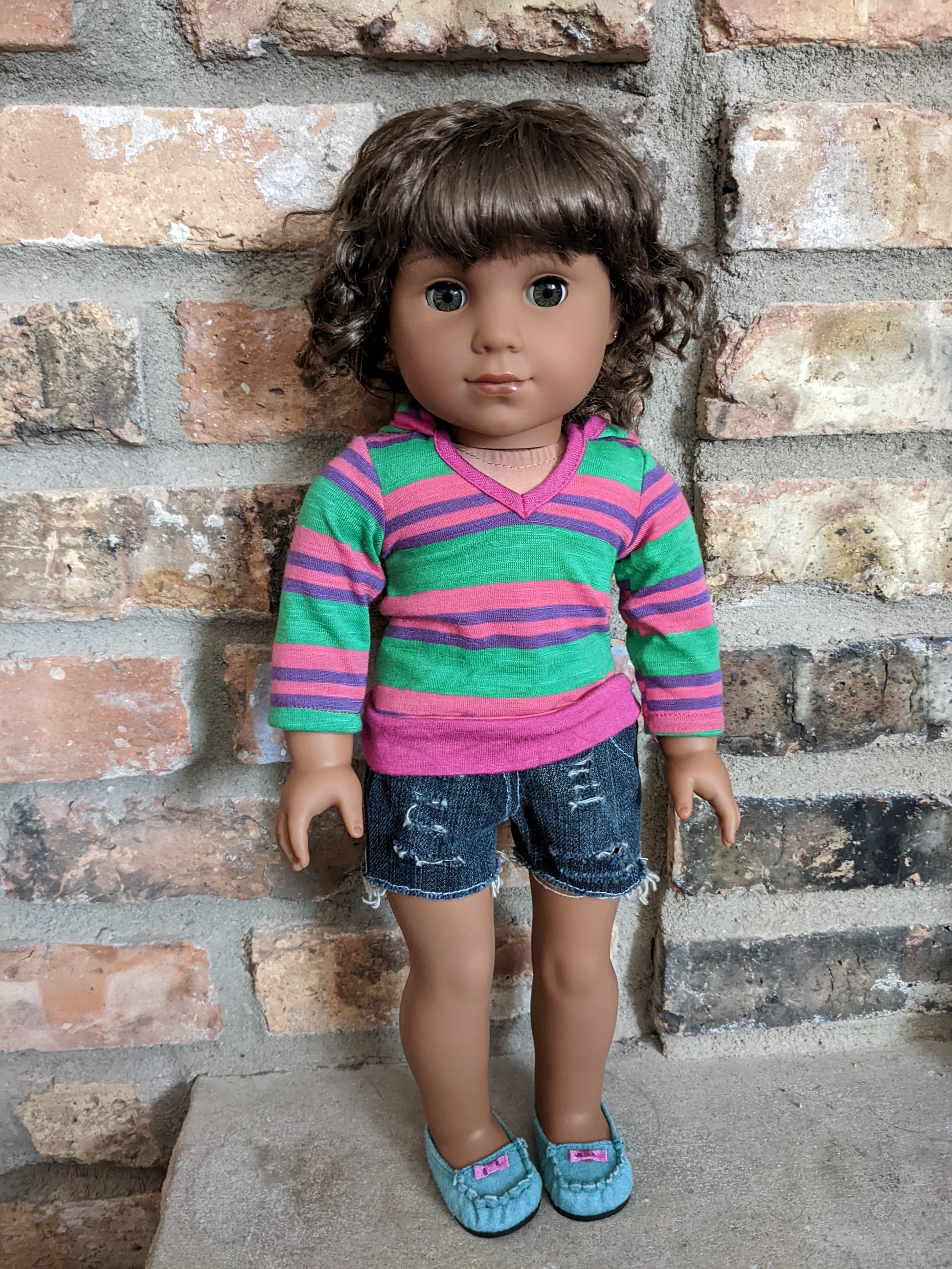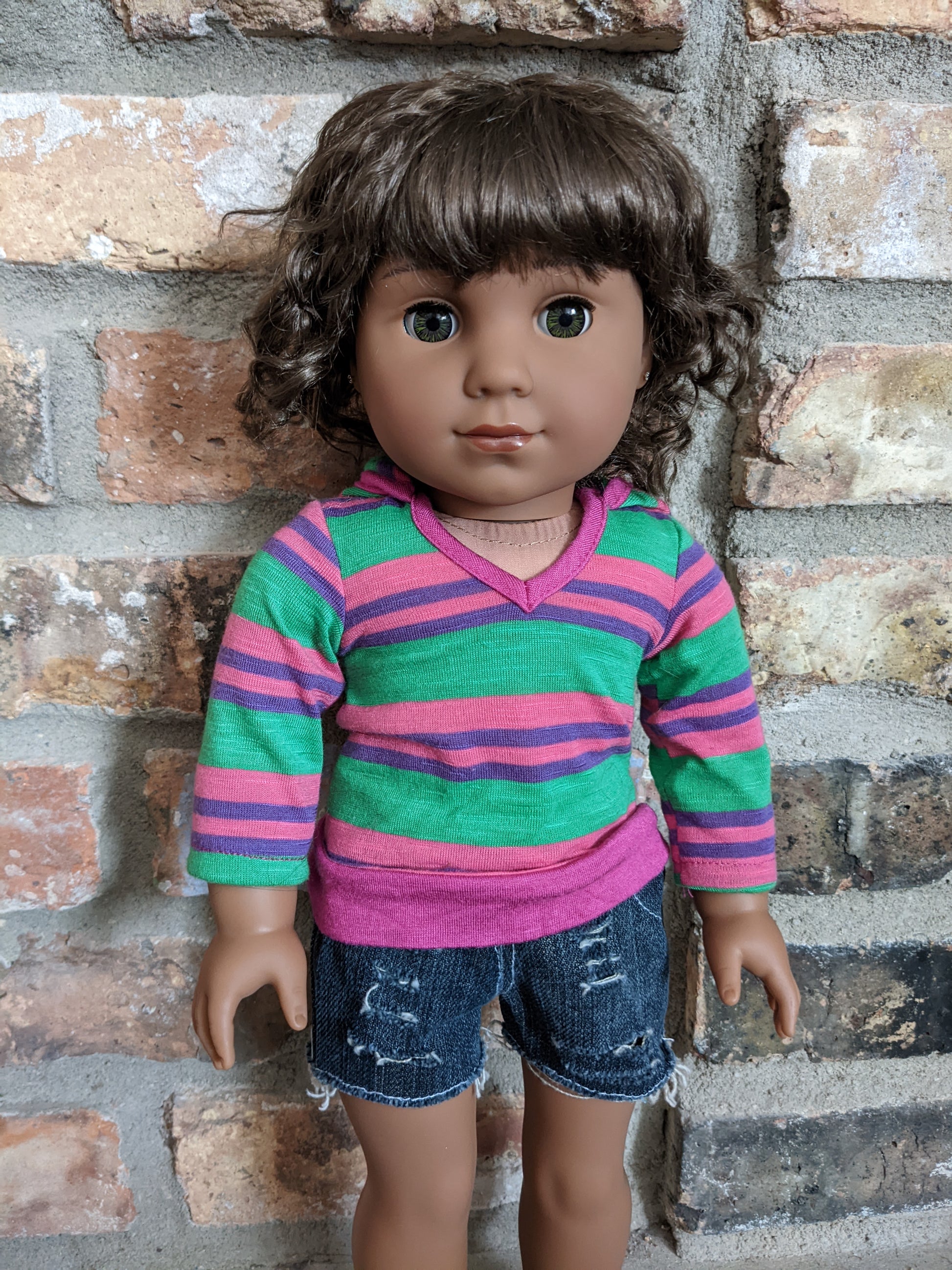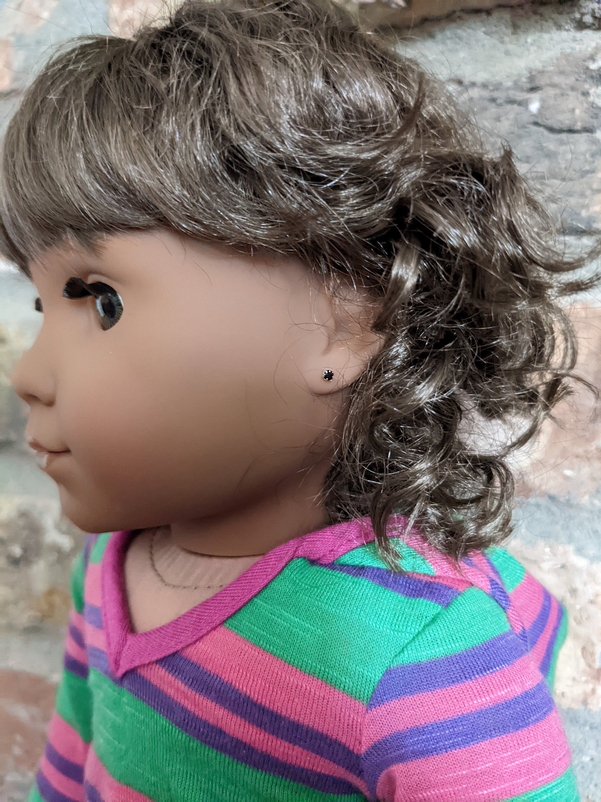 This one of a kind OOAK custom American Girl doll was created with a new Kaya doll, a brown vegan mohair wig, and hazel eyes. She has lip gloss that was hand painted and sealed. She may have some minor shine marks from handling. She has a tiny x on her bum. She comes with the outfit pictured. Her ears are pierced with normal earrings and the tiny diamond look studs are included. If you would like the wig left unattached, please leave a note in the "Order Special Instructions" box upon checkout. Otherwise I will attach the wig using a heavy duty permanent adhesive for a strong hold.