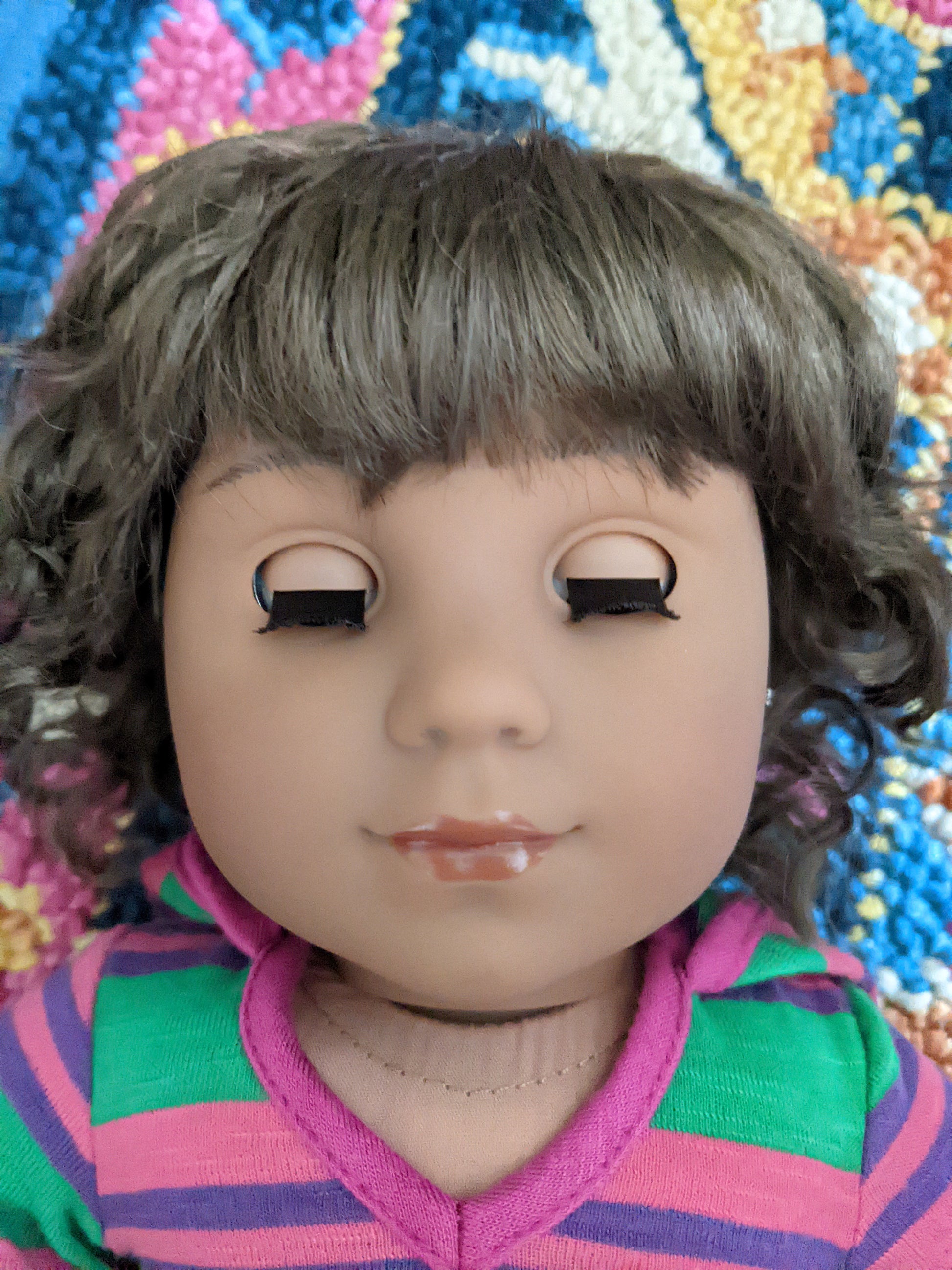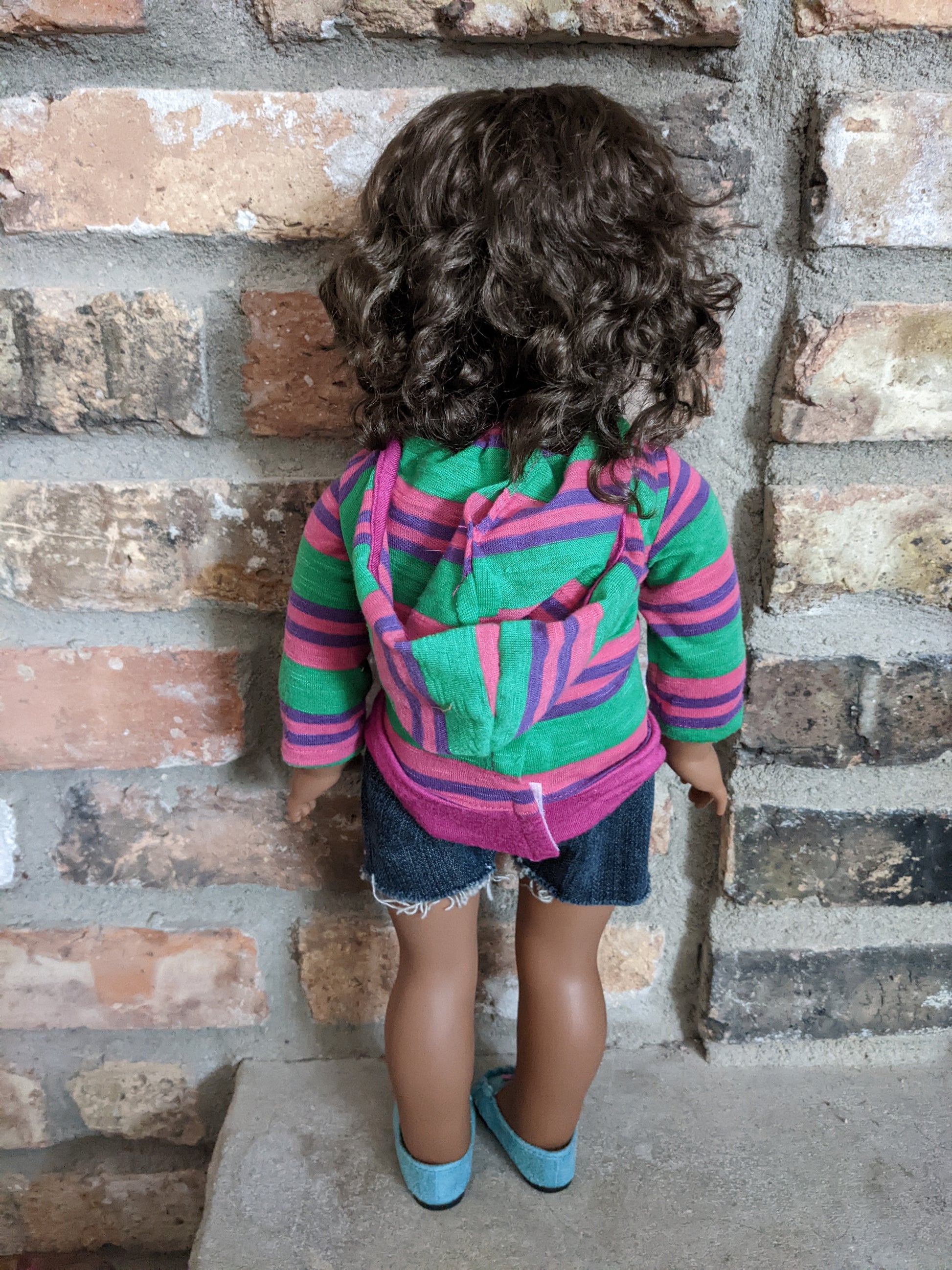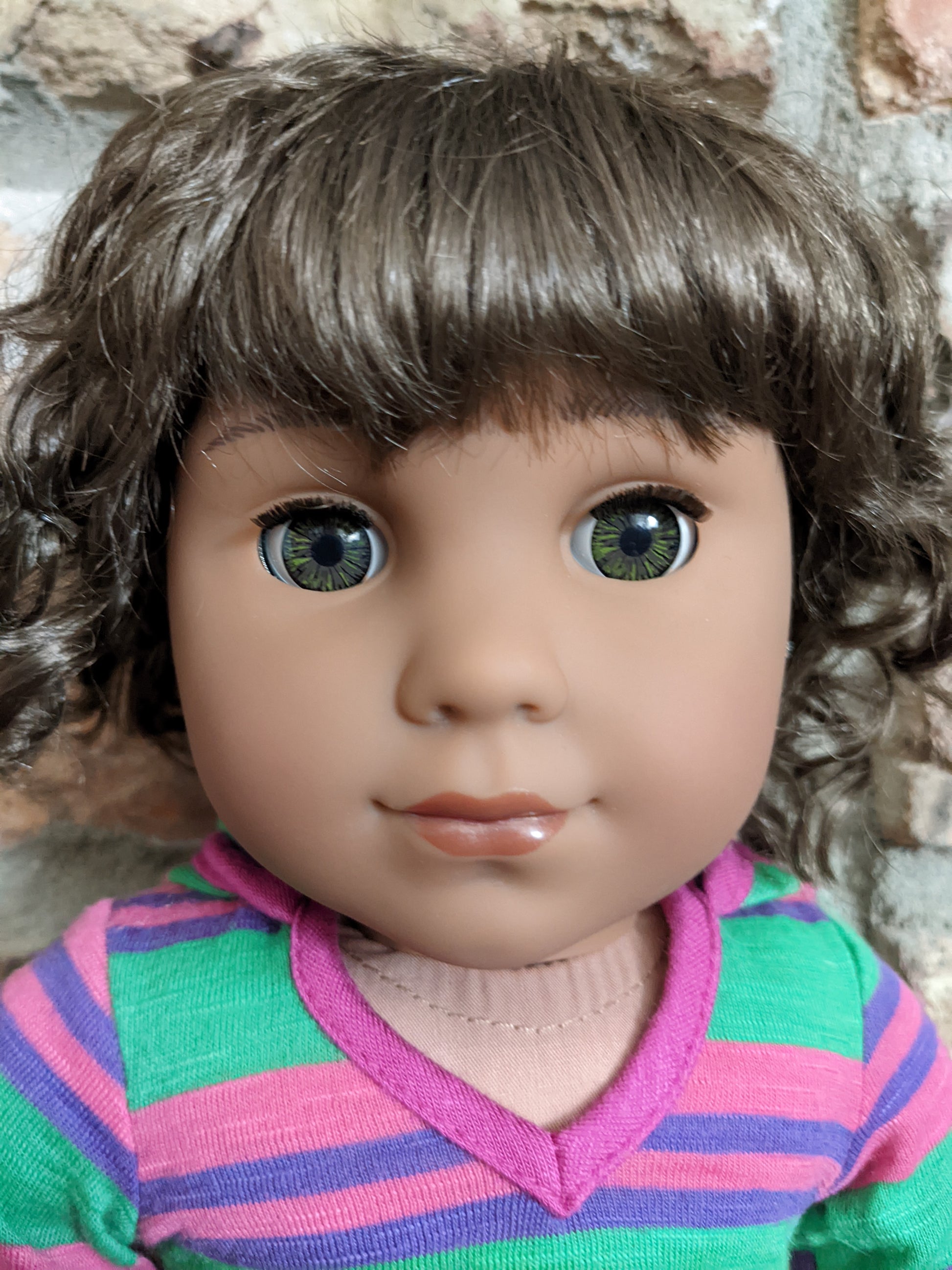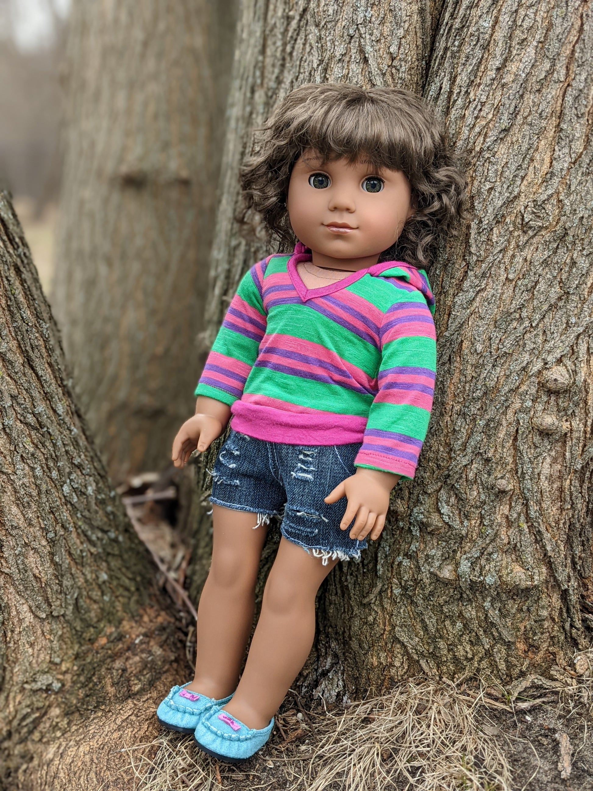 This one of a kind OOAK custom American Girl doll was created with a new Kaya doll, a brown vegan mohair wig, and hazel eyes. She has lip gloss that was hand painted and sealed. She may have some minor shine marks from handling. She has a tiny x on her bum. She comes with the outfit pictured. Her ears are pierced with normal earrings and the tiny diamond look studs are included. If you would like the wig left unattached, please leave a note in the "Order Special Instructions" box upon checkout. Otherwise I will attach the wig using a heavy duty permanent adhesive for a strong hold.
