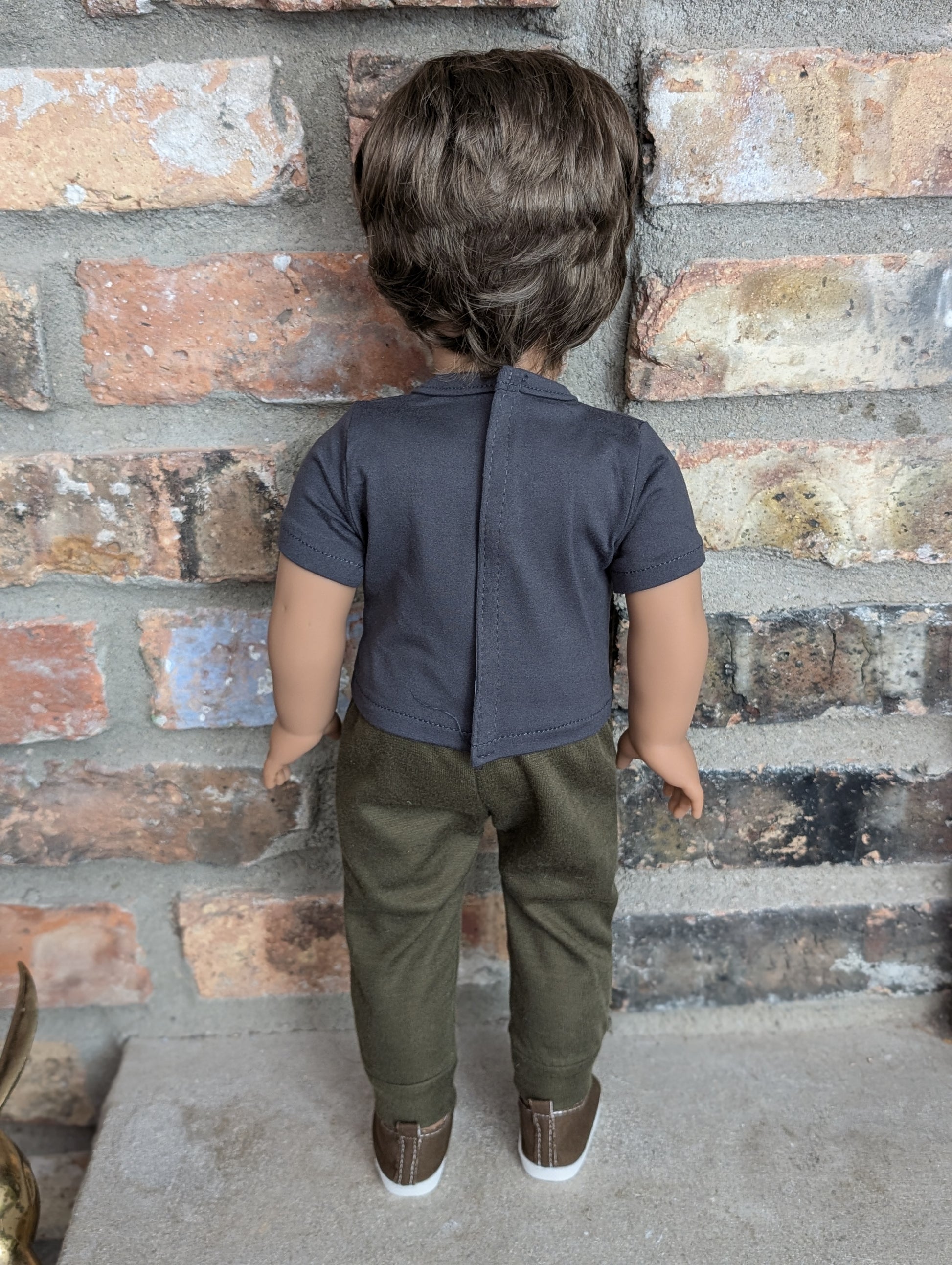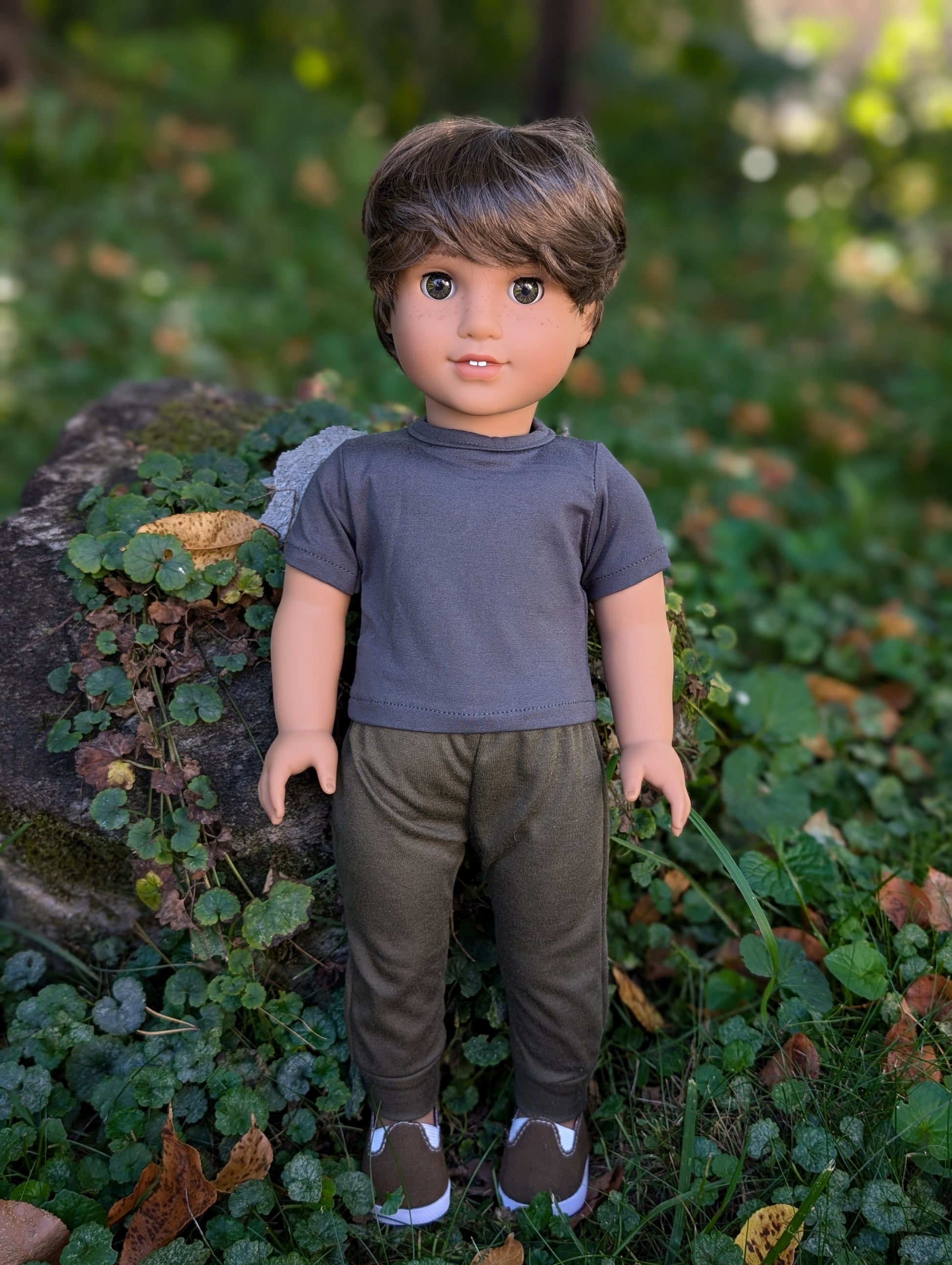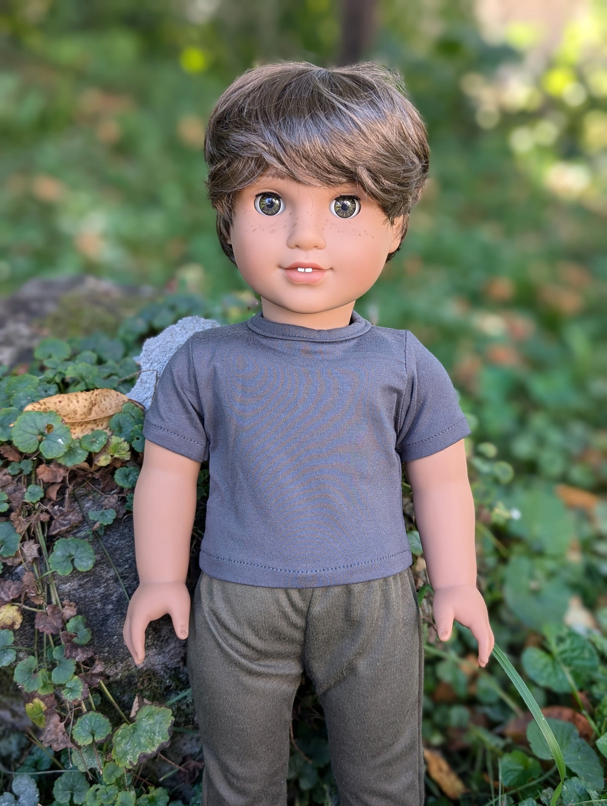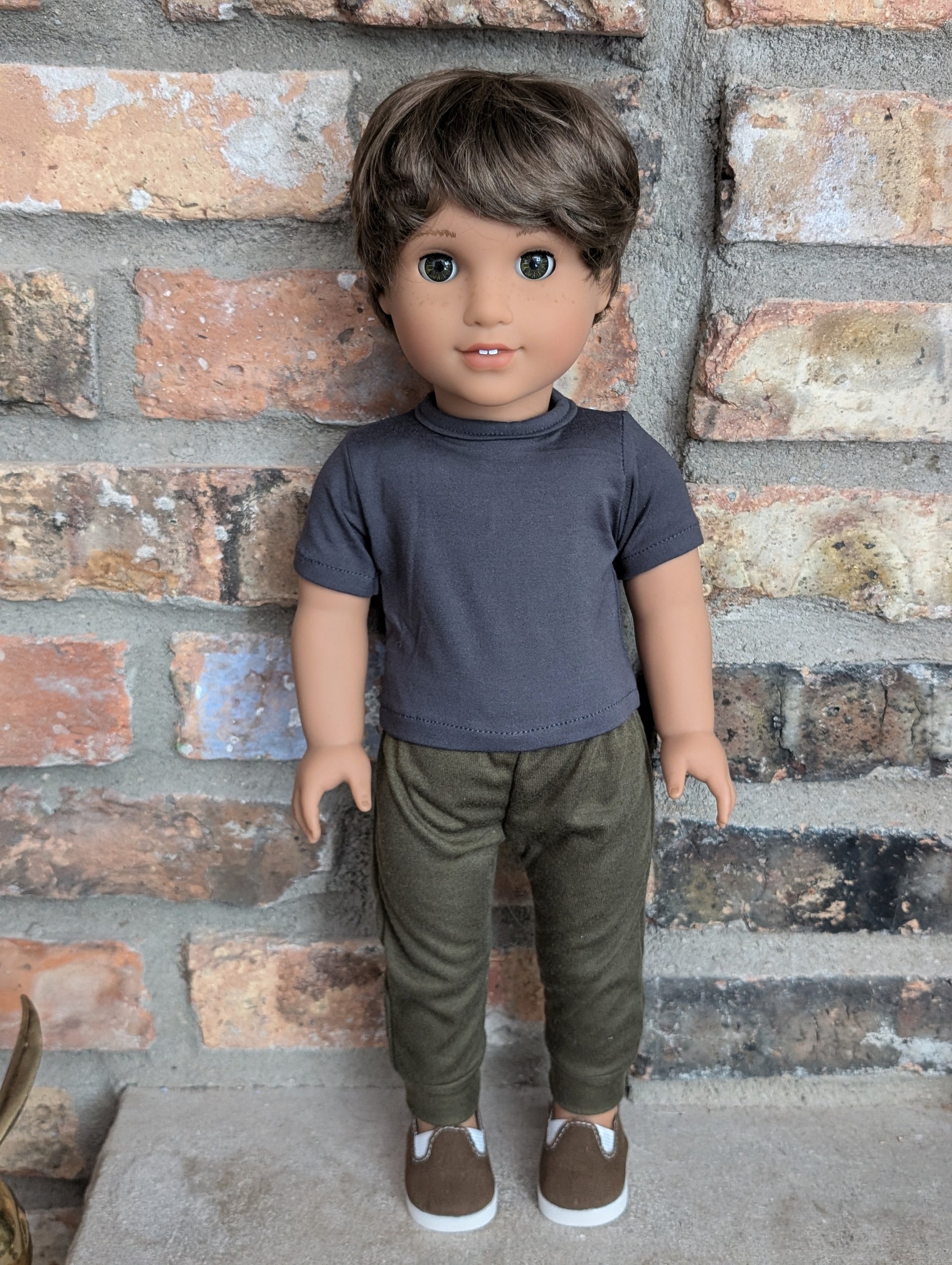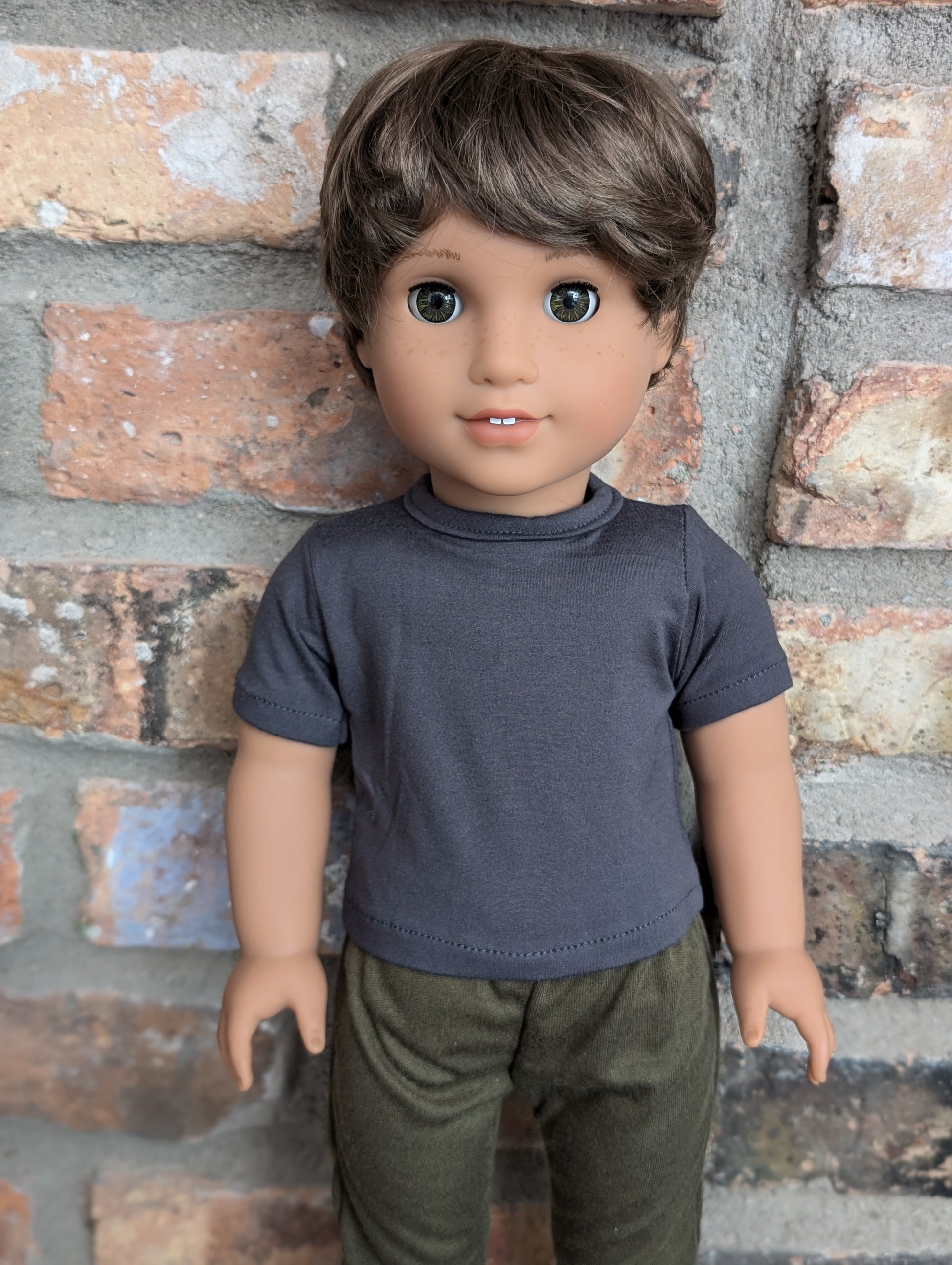 This one of a kind OOAK custom American Girl doll was created with a new doll, a brown wig, and hazel eyes. He has freckles that were hand painted and sealed. He may have some minor shine marks from handling. He comes with the outfit pictured.