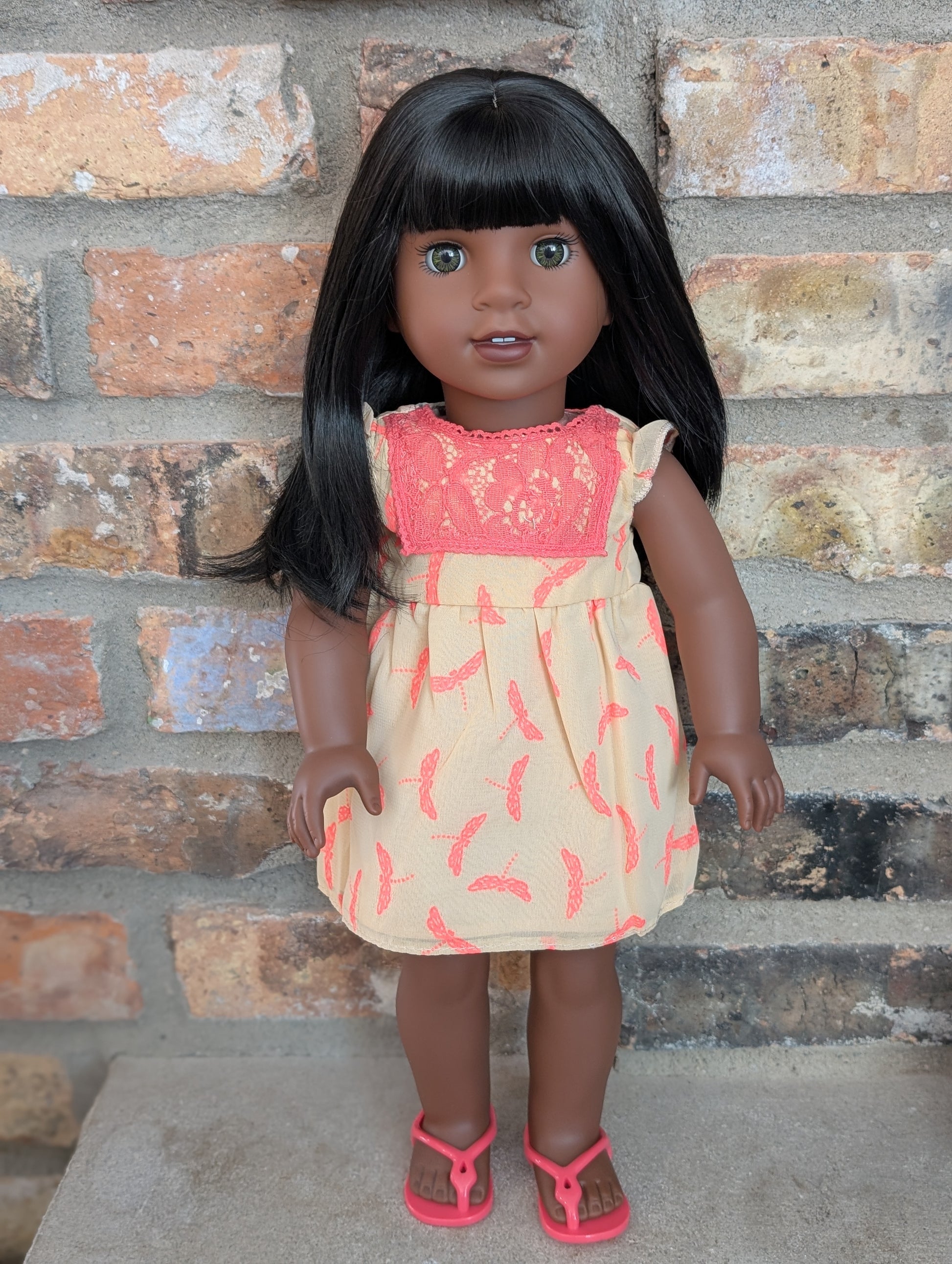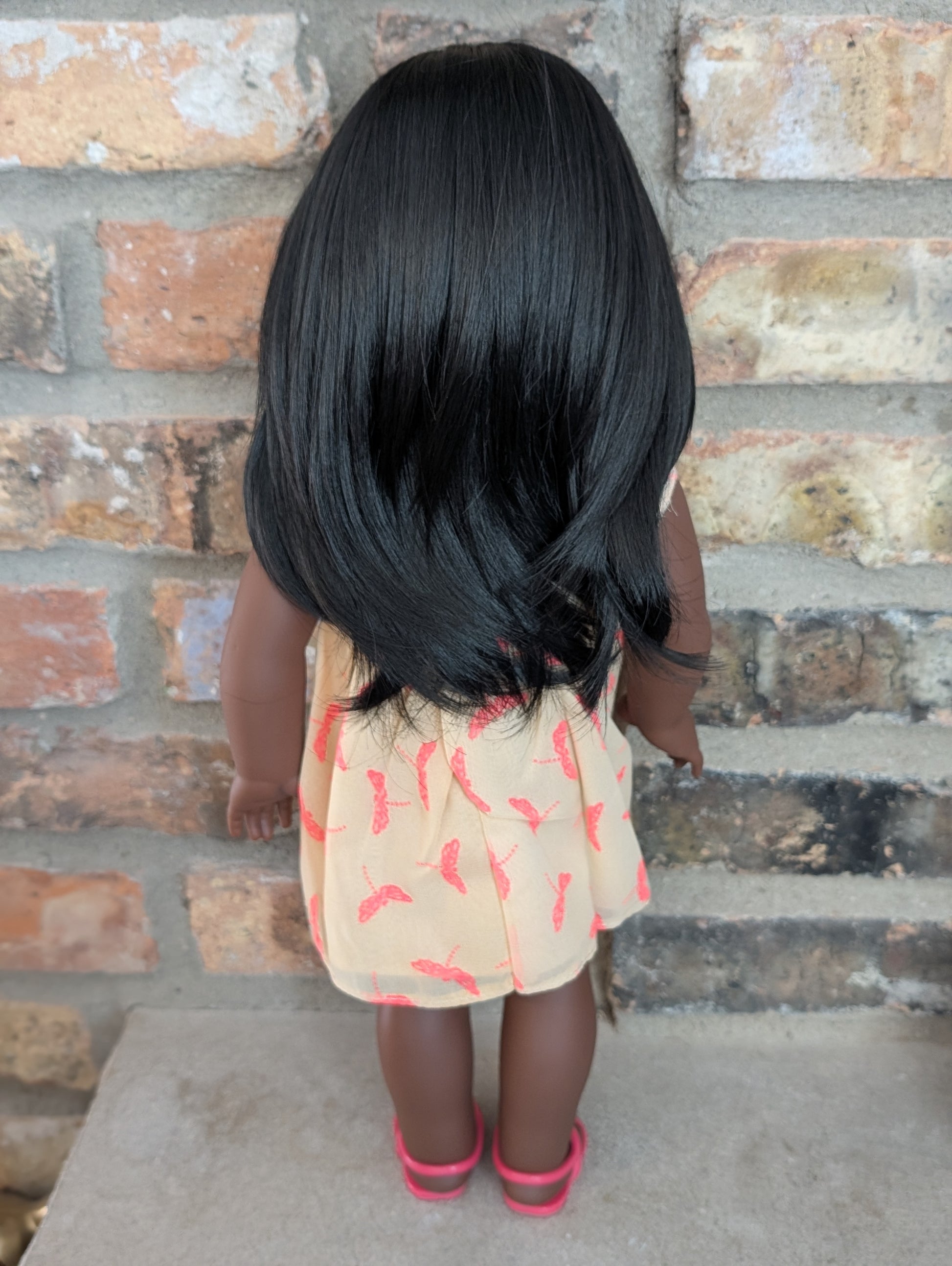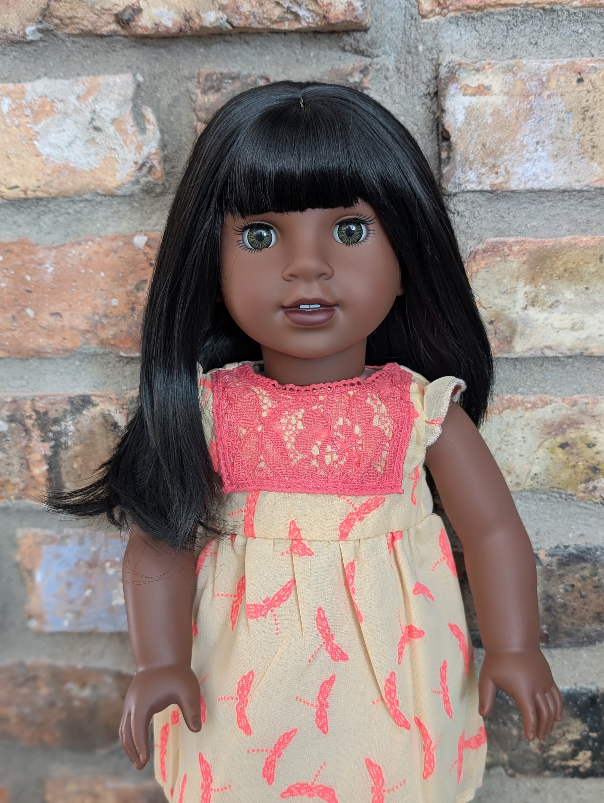 This one of a kind OOAK custom American Girl doll was created with a brand new doll, a black wig, and hazel eyes. She may have some minor shine marks from handling. She comes with the outfit pictured.