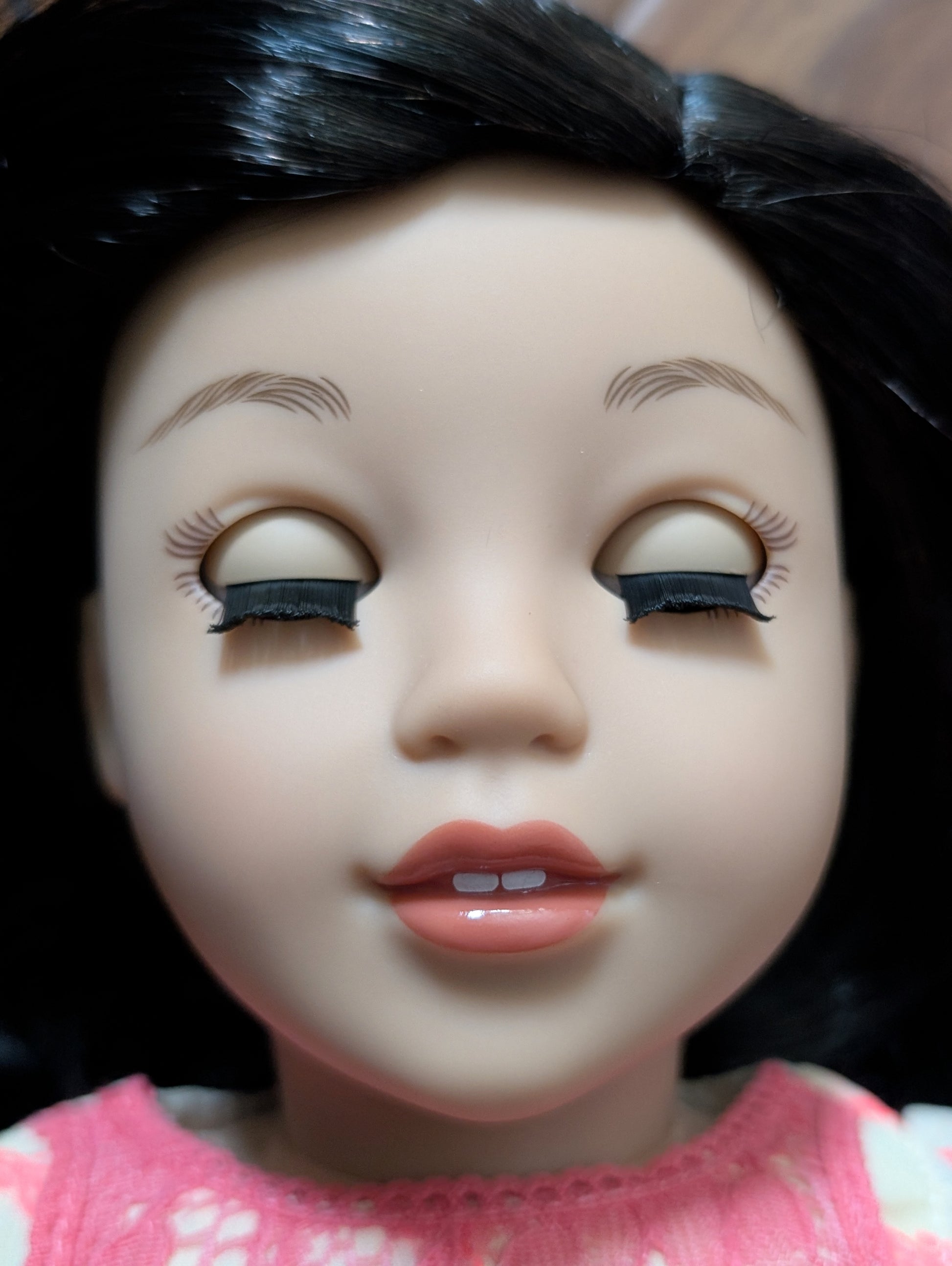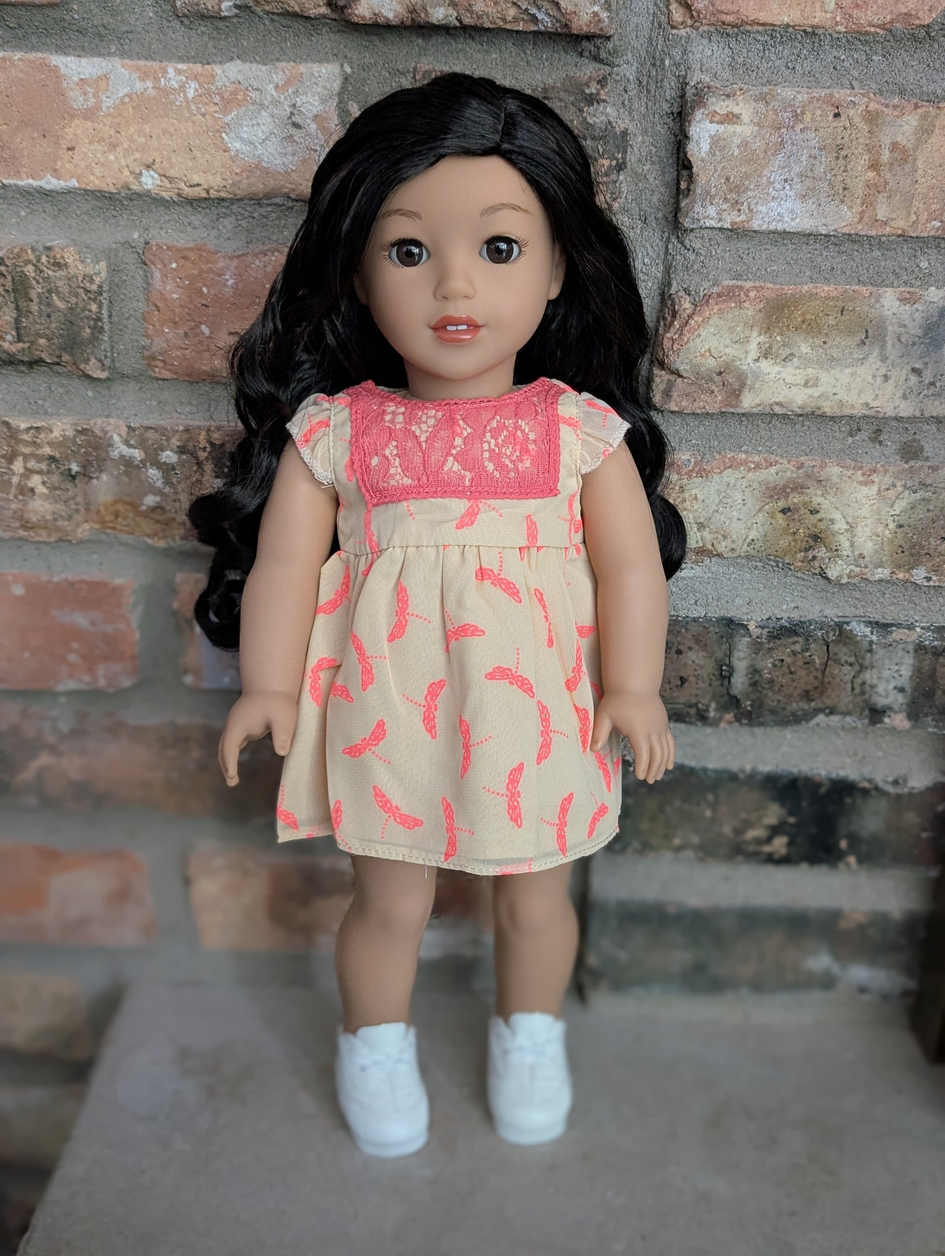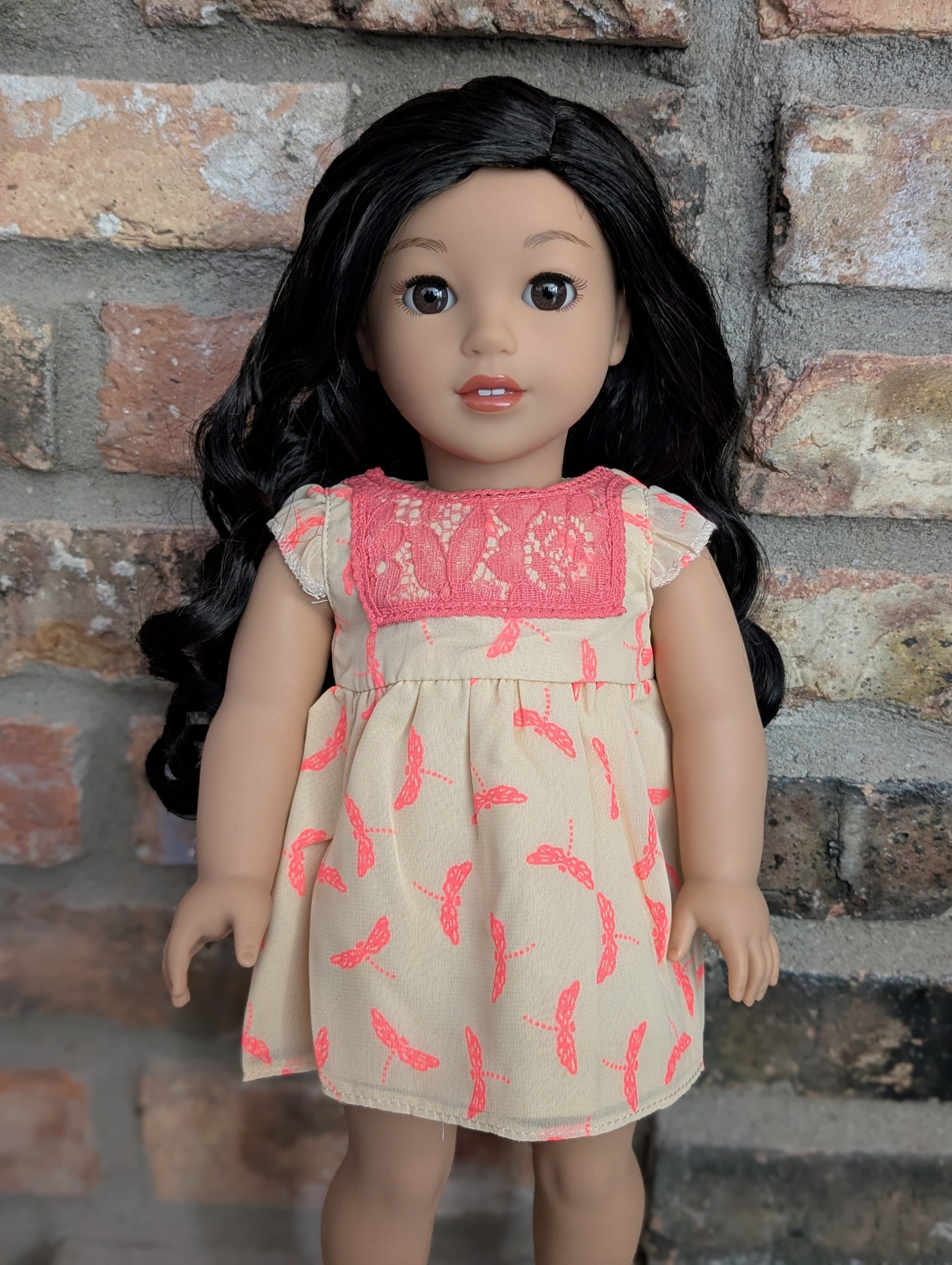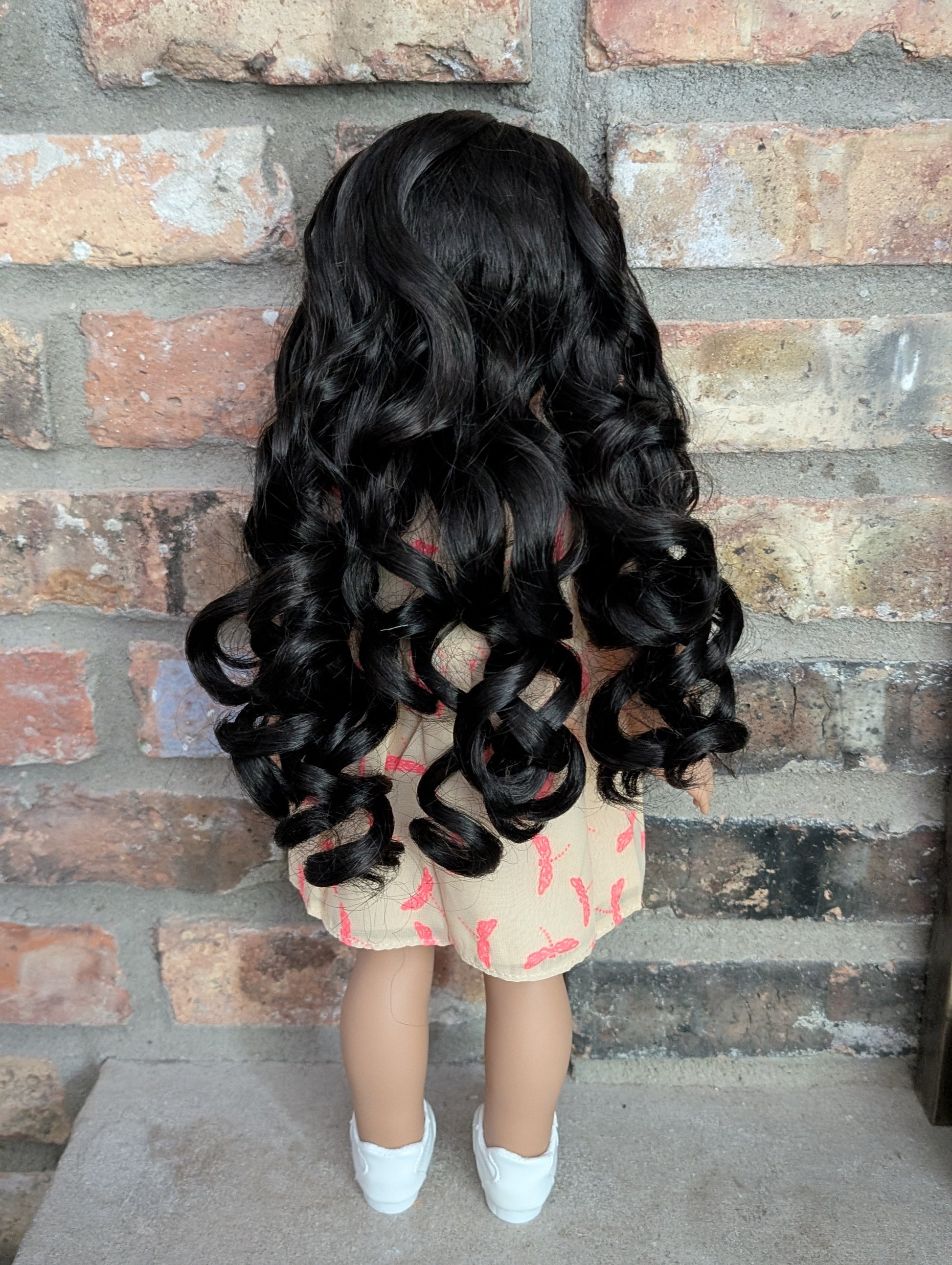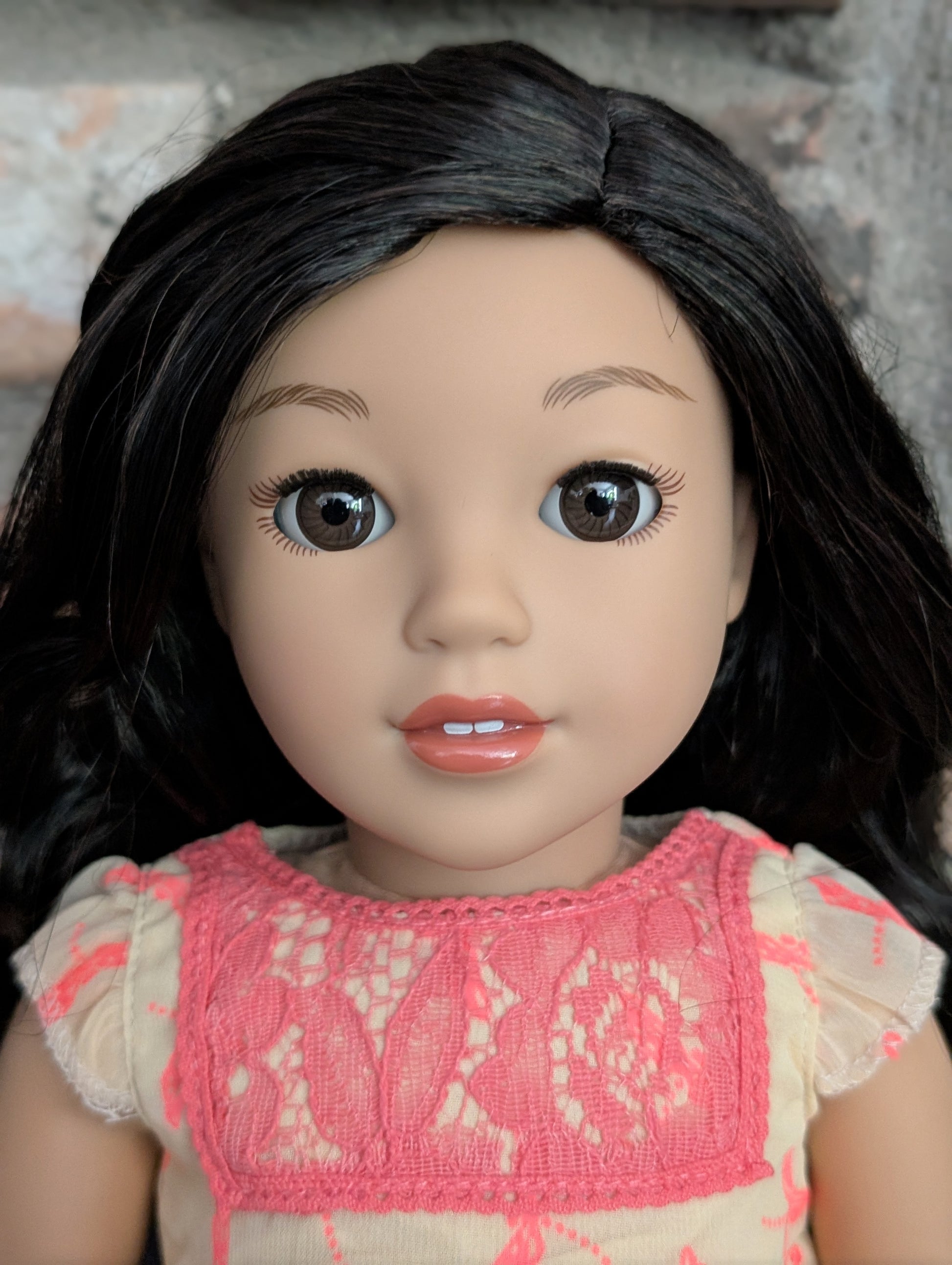 This one of a kind OOAK custom American Girl doll was created with a brand new doll, a black wig, and brown eyes. She has lip gloss that was hand painted and sealed. She may have some minor shine marks from handling. She comes with the outfit pictured.