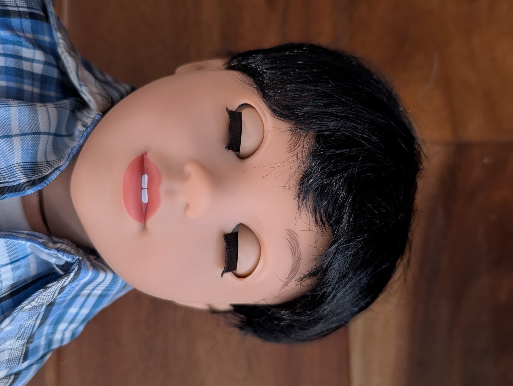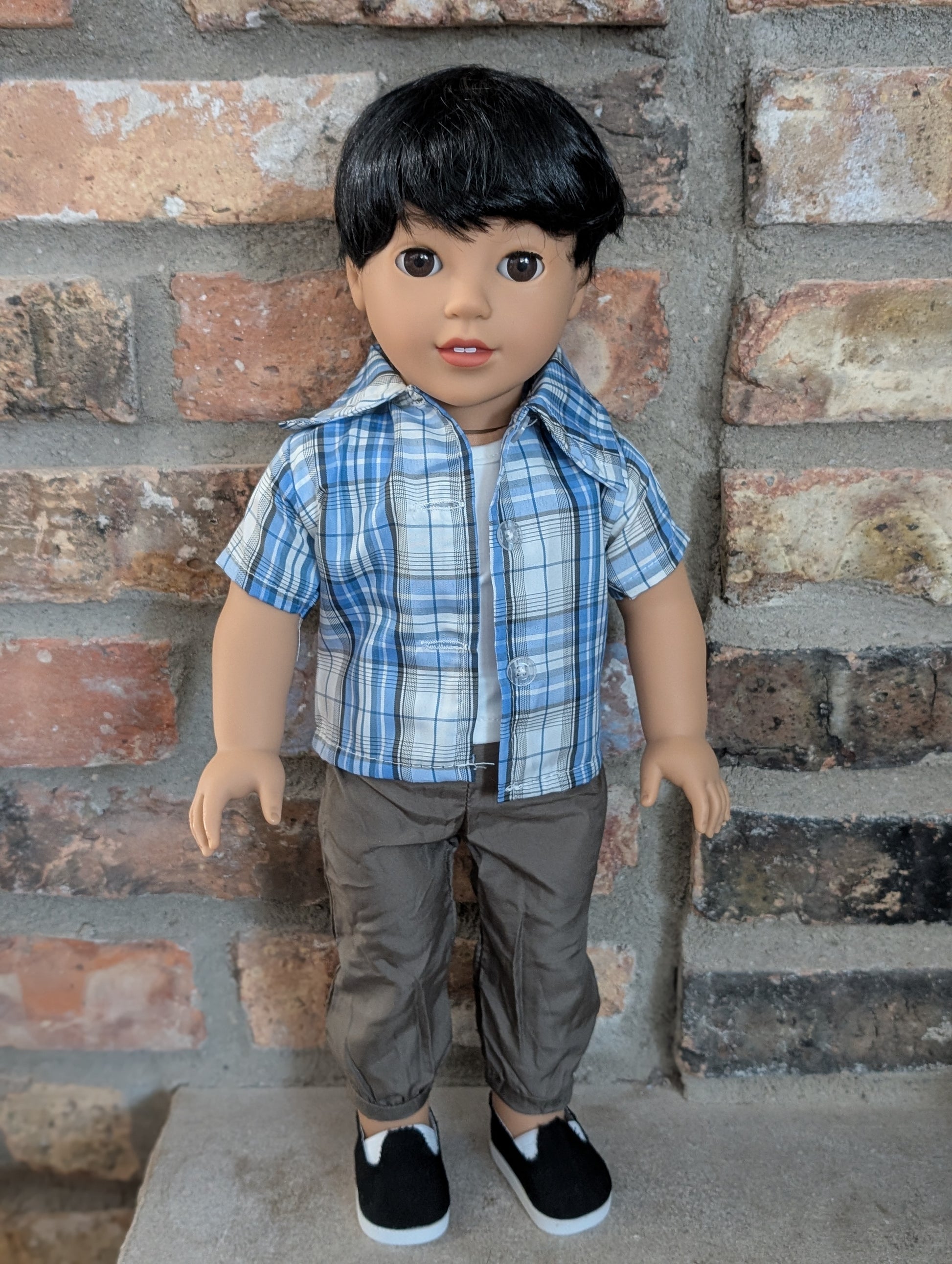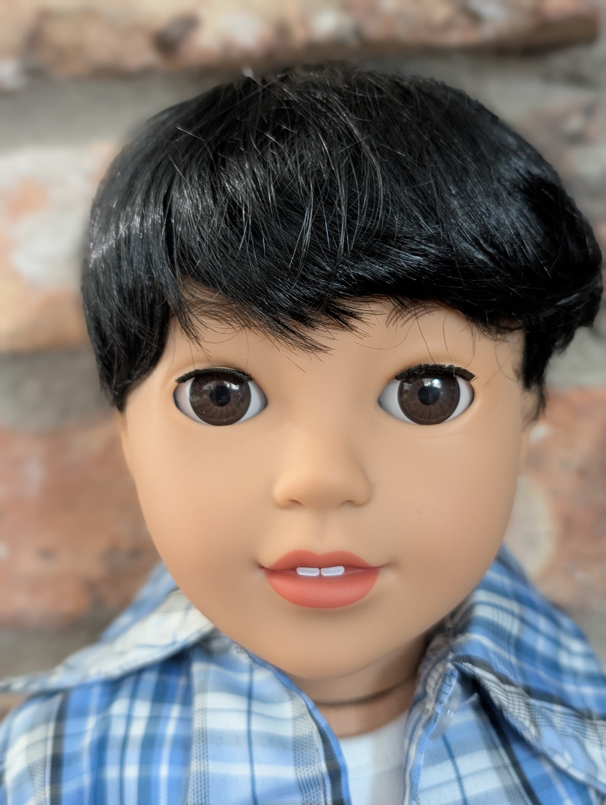 This one of a kind OOAK custom boy American Girl doll was created with a brand new doll, a black wig, and brown eyes. He may have some minor shine marks from handling. He comes with the outfit pictured.